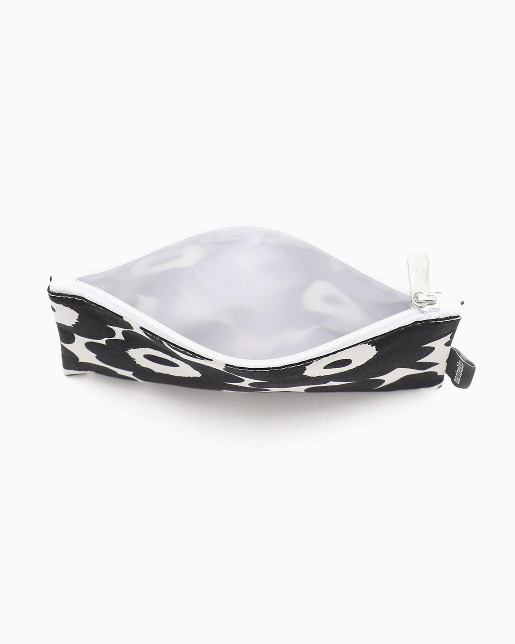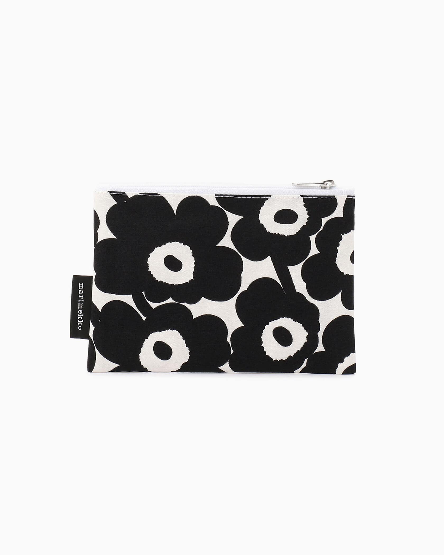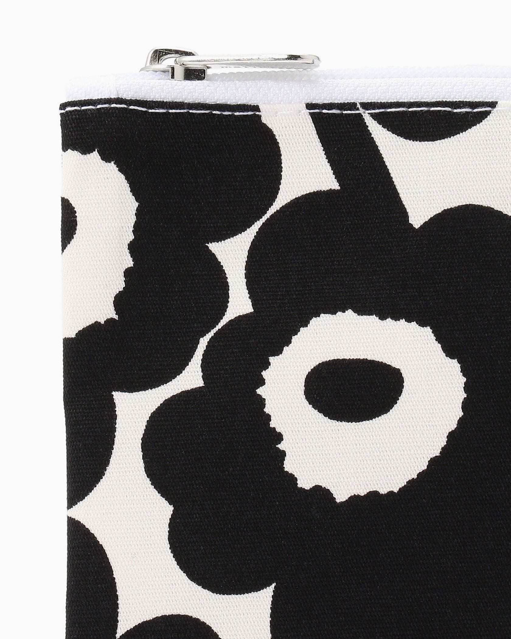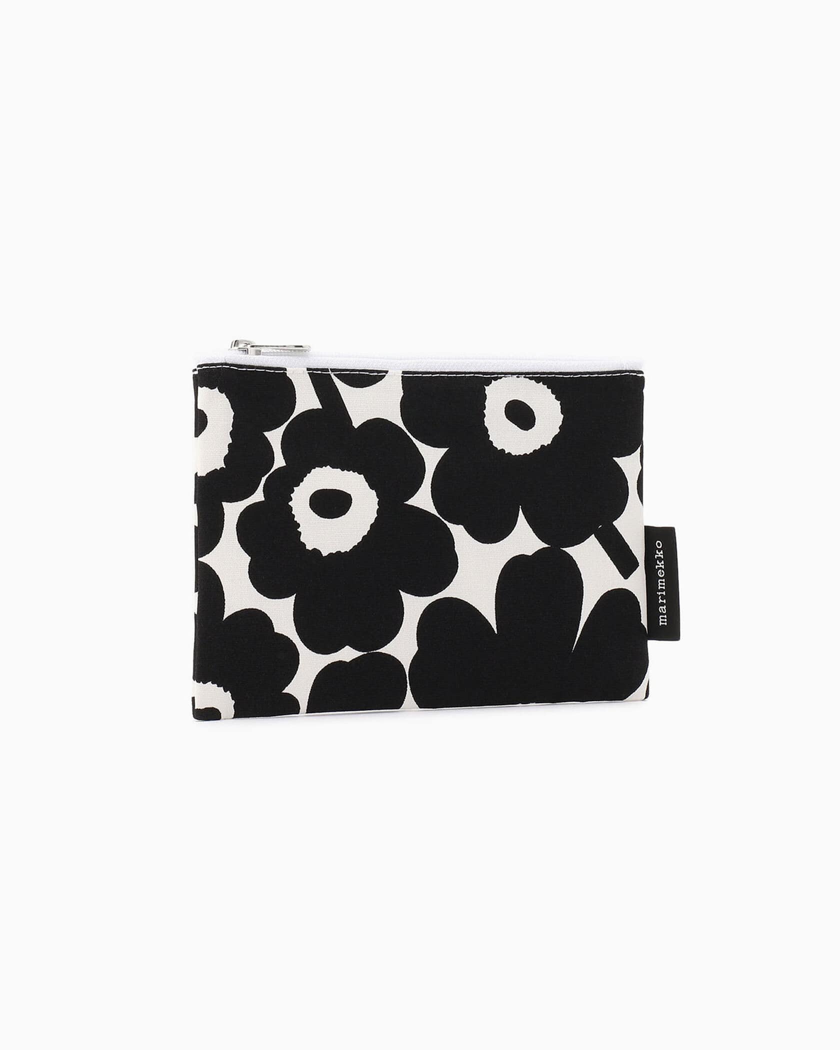 花をモチーフにしたUnikko(ウニッコ)柄をブラック×ホワイトでシックな表情に仕上げたポーチ。フラットなフォルムはバッグの中でも嵩張らず、持ち運びするにも便利です。間口はジップクロージャー。端にはブランドロゴ入りタグを添えてワンポイントに。