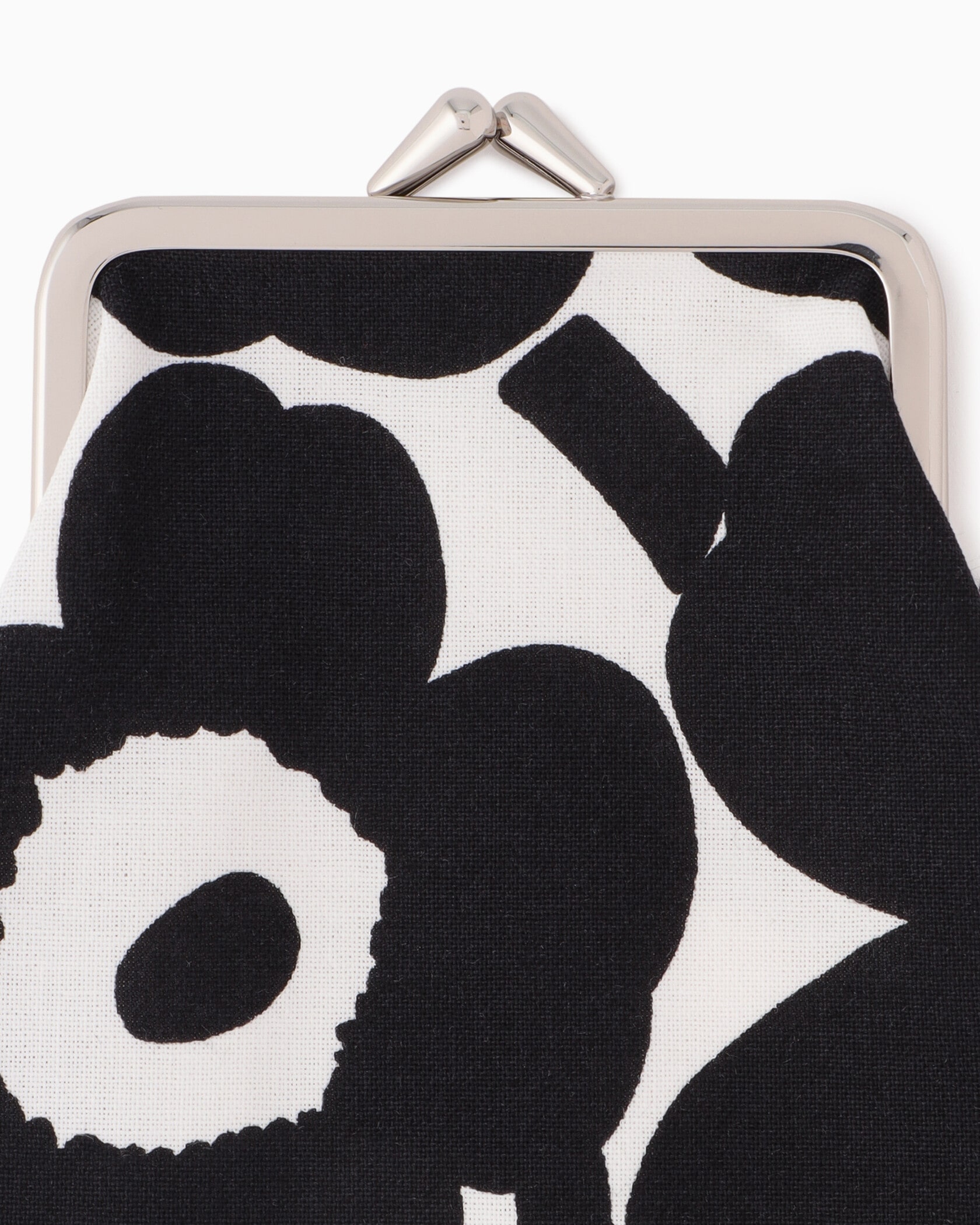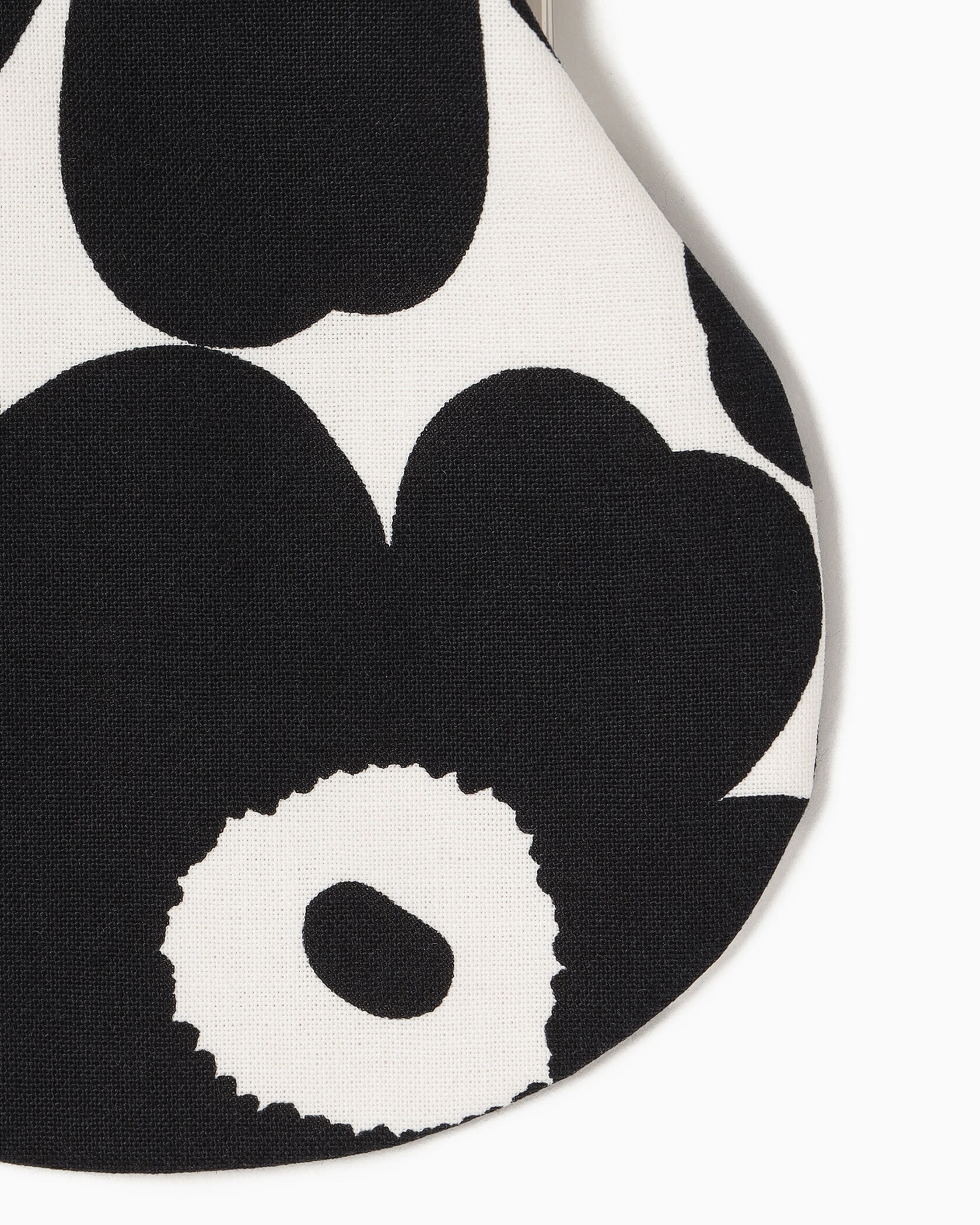 ひょうたんのようなフォルムが愛らしいがま口ポーチ。花をモチーフにしたUnikko(ウニッコ)パターンをシックなモノトーンで展開しています。間口が大きく開くため、中身の出し入れがしやすいのもポイント。