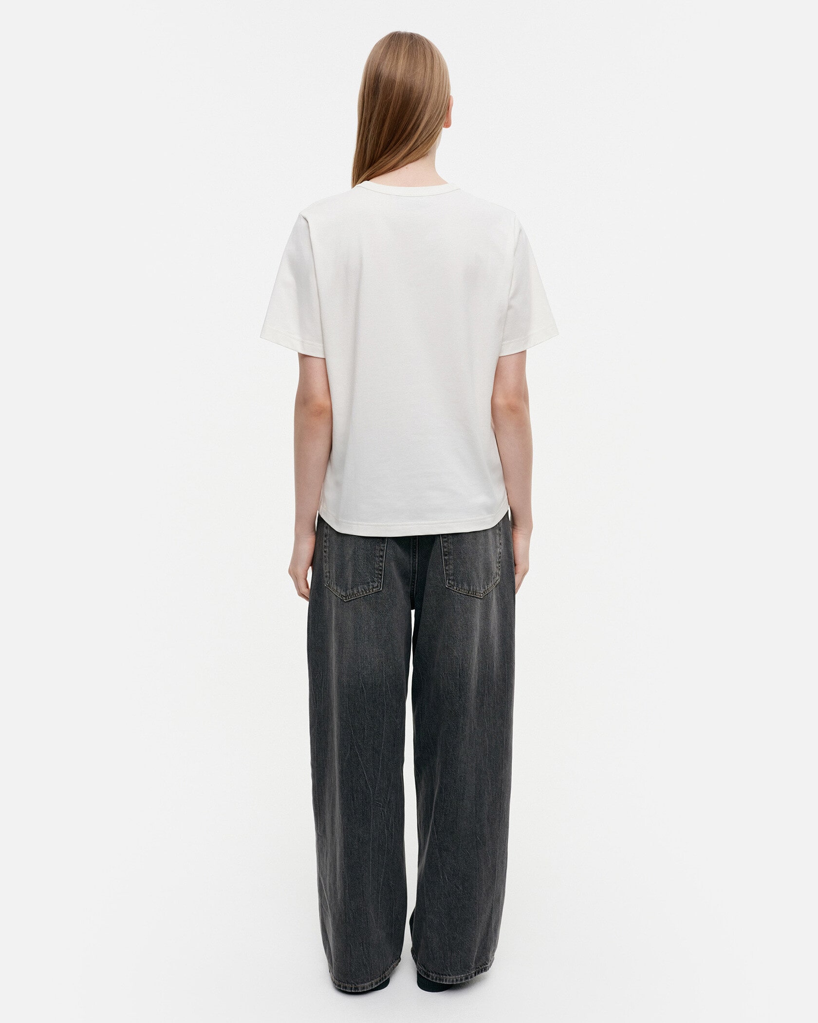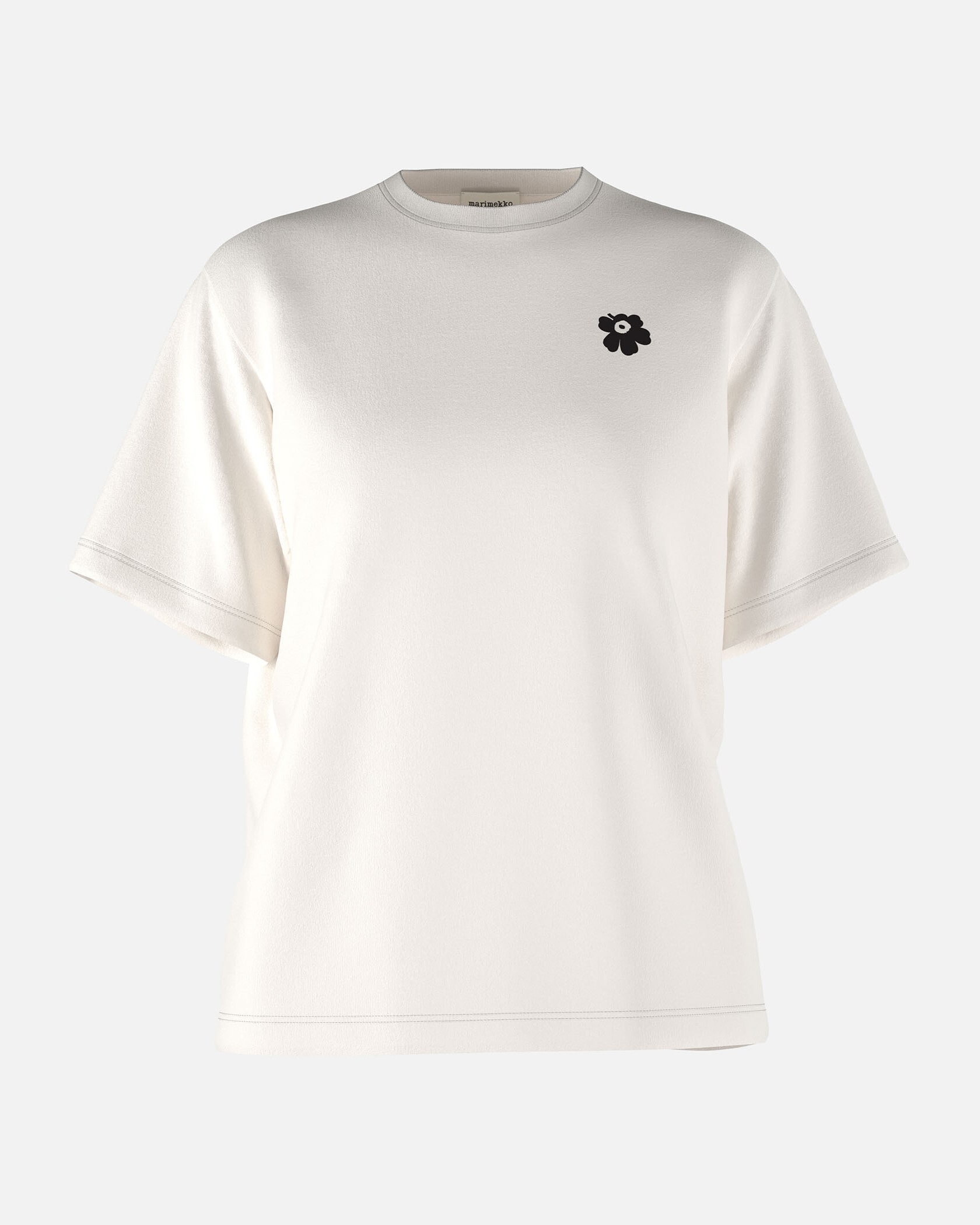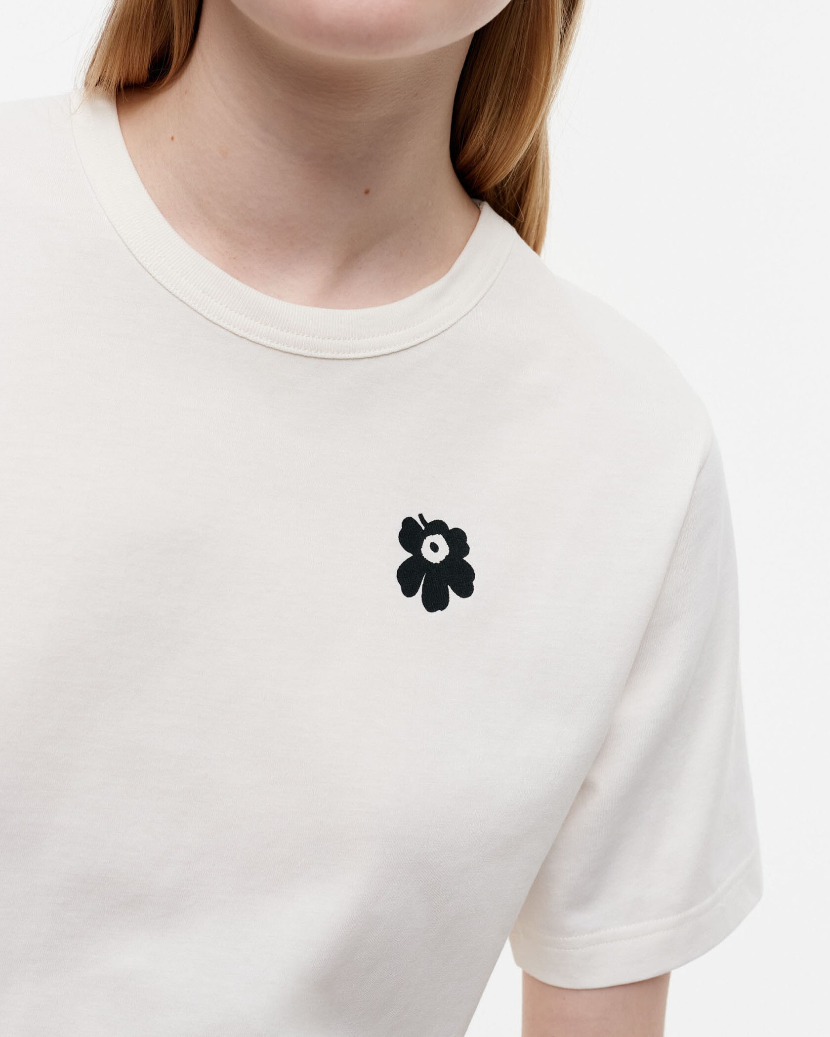 胸もとに花をモチーフにした小さなUnikko柄のプリントをあしらったTシャツ。肌触りの良いオーガニックコットンジャージー素材を採用。程よいゆとりのあるリラックスフィットシルエットで仕上げています。シンプルなデザインはコーディネートに合わせやすくおすすめです。