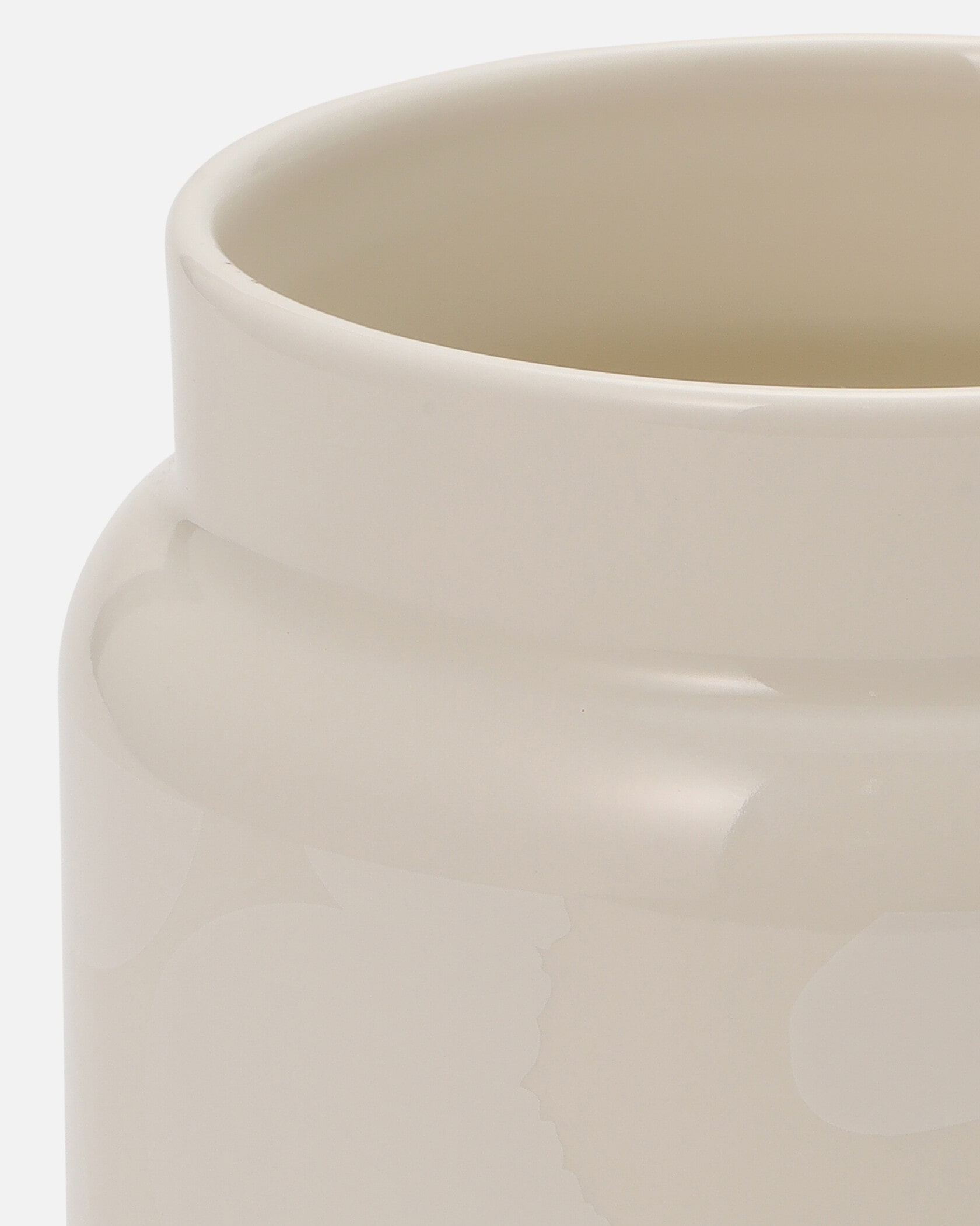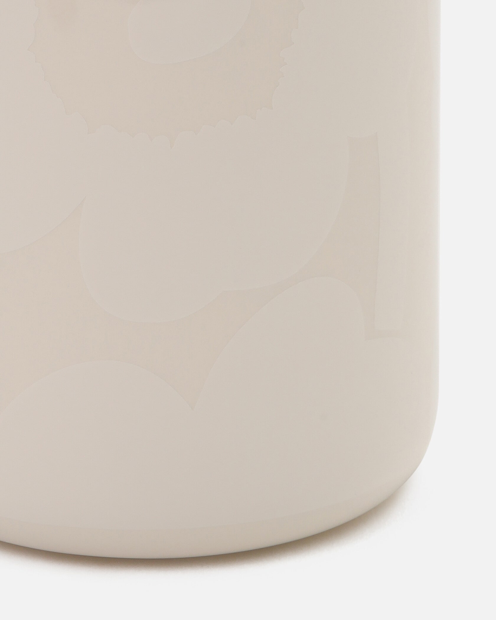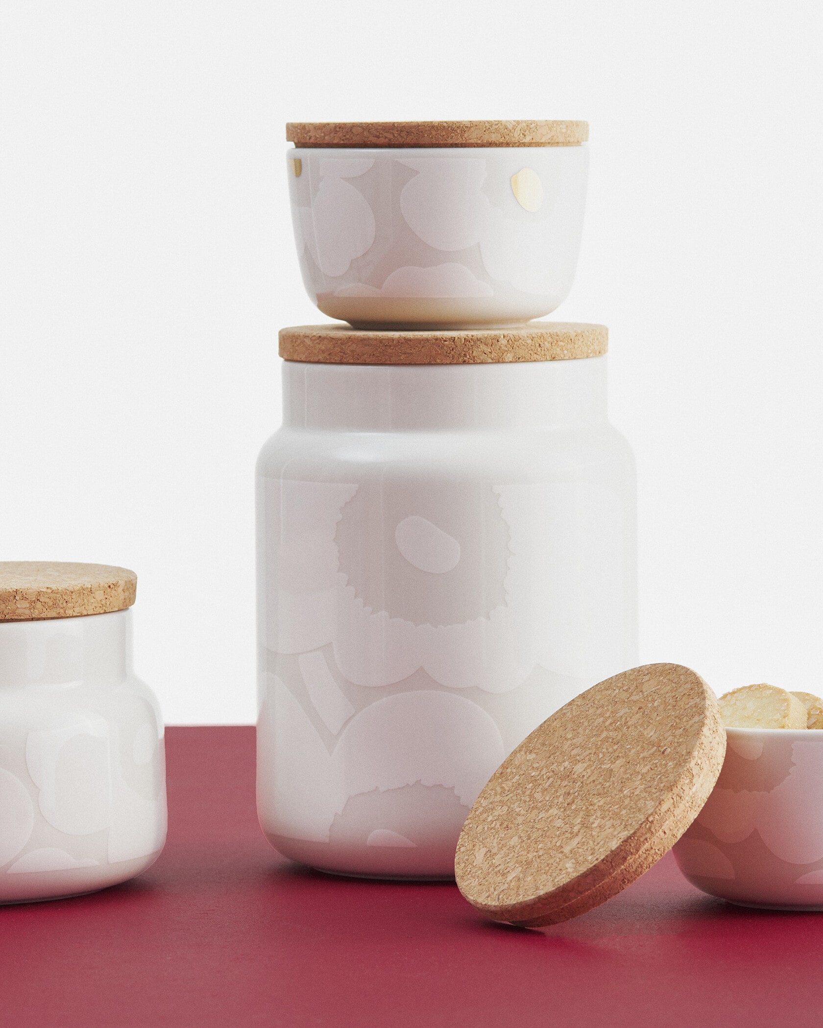 Marimekkoのテキスタイル、Unikko(ウニッコ)柄のコルク蓋つきジャーです。花がほんのり浮かぶ上品で洗練されたデザインはキッチンに置いておくだけで映える事間違いなし。ショートパスタや乾物などの保存容器としてはもちろん、ちょっとした小物を入れてもオシャレです。引越しのお祝いなどギフトにも最適です。