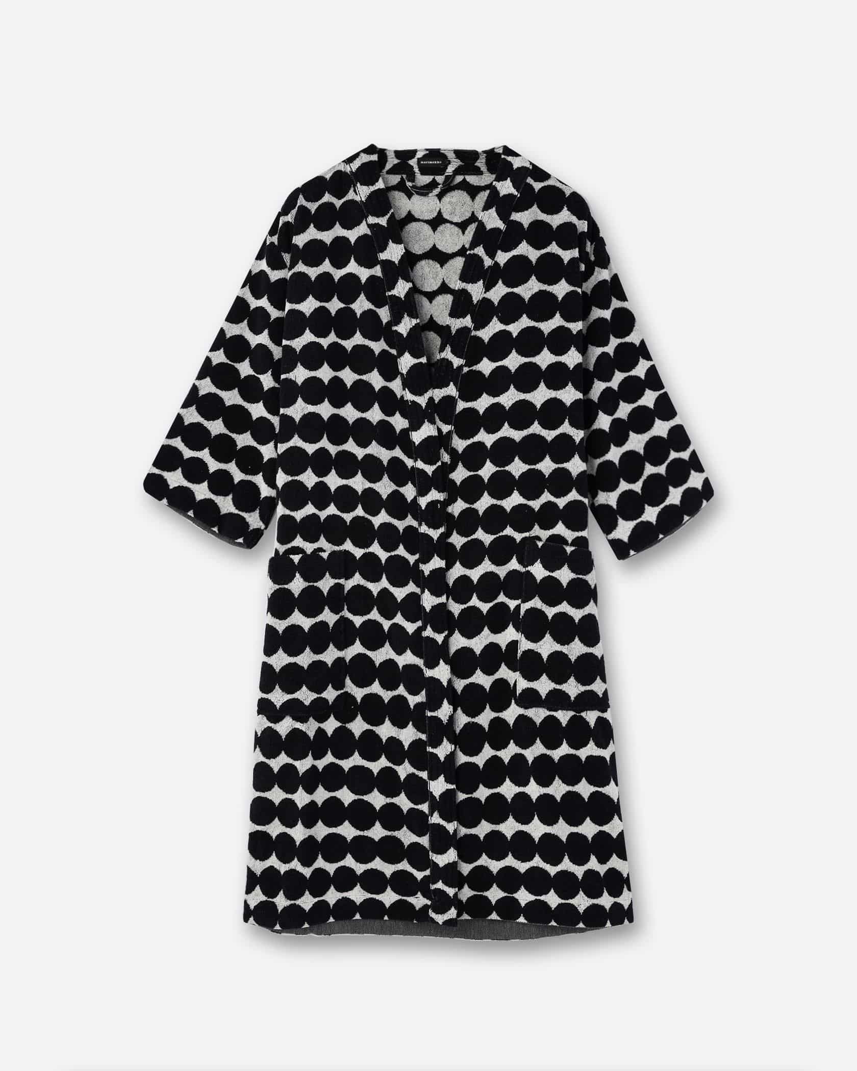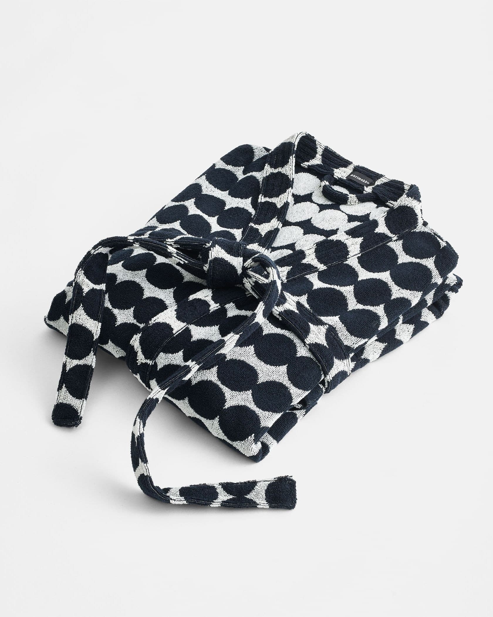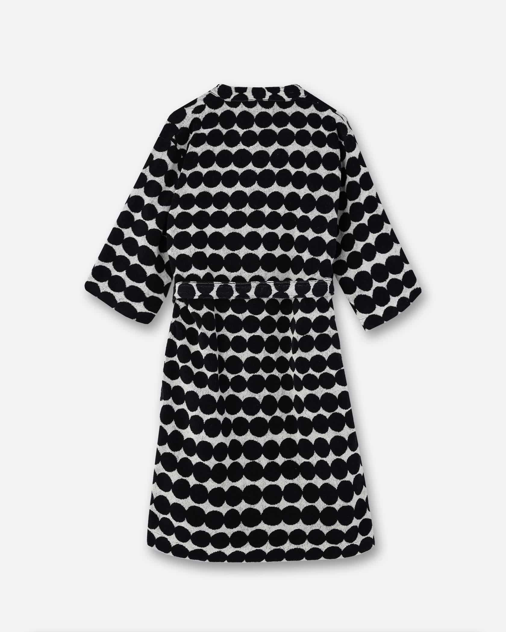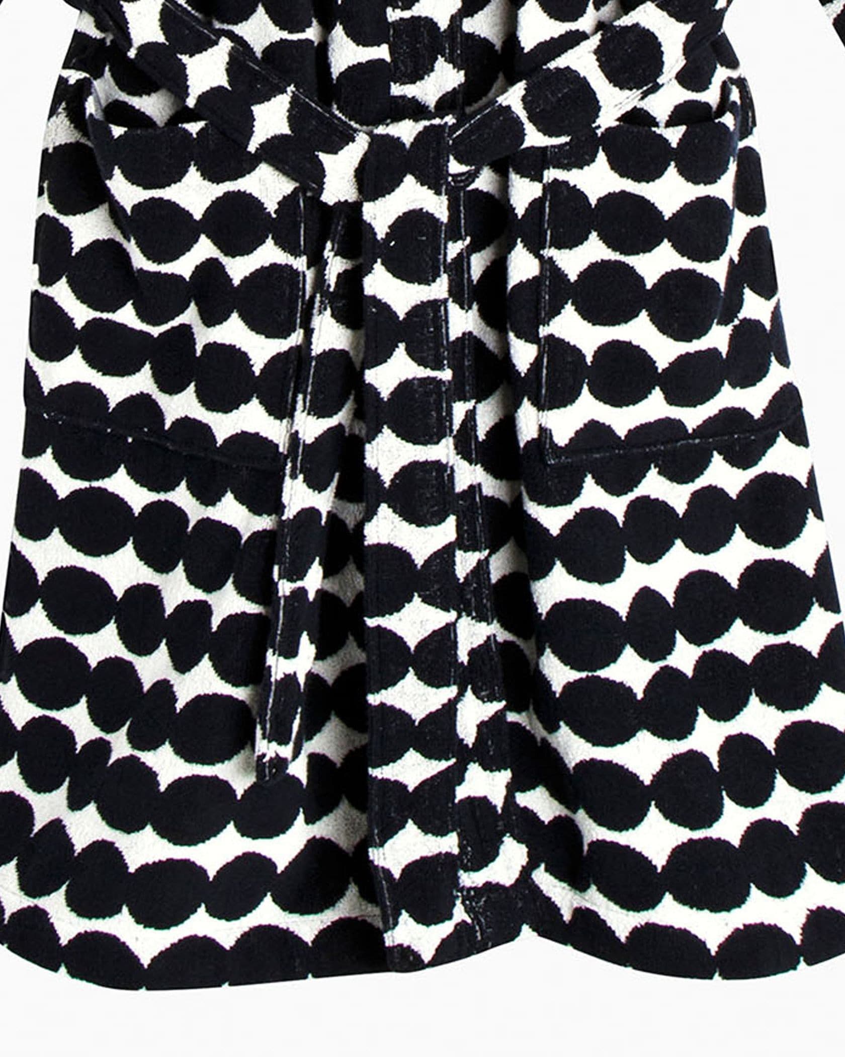 グラフィカルなRasymattoモチーフを全面にプリントしたバスローブ。リズミカルに並んだ不均一な形のドットがモダンなデザイン。共布のベルト紐、便利なポケット付き。さっと羽織れるしっかりとしたタオル地はリラックスタイムにぴったりな肌触りの良いコットン生地。バスルームが華やぐアイテムです。