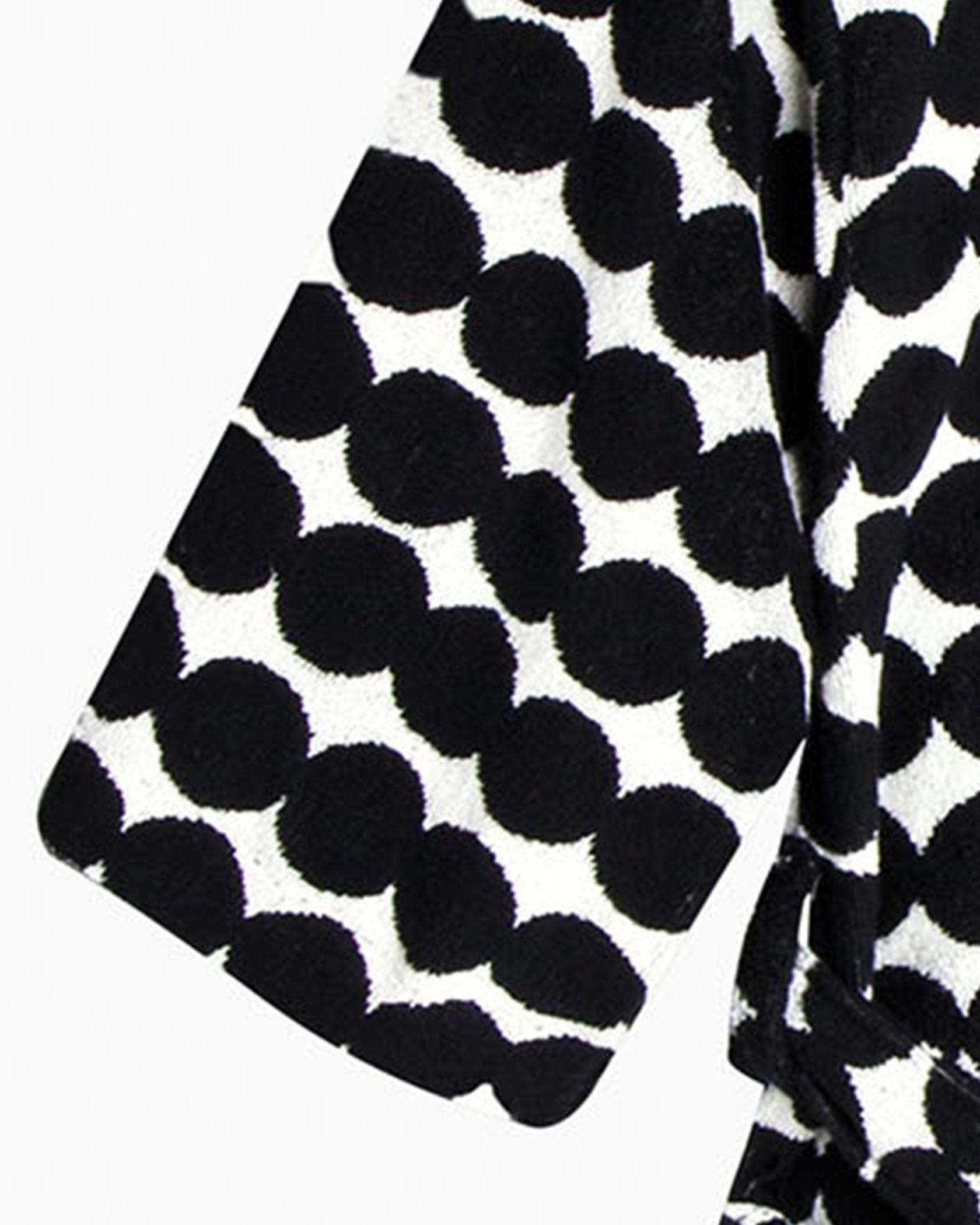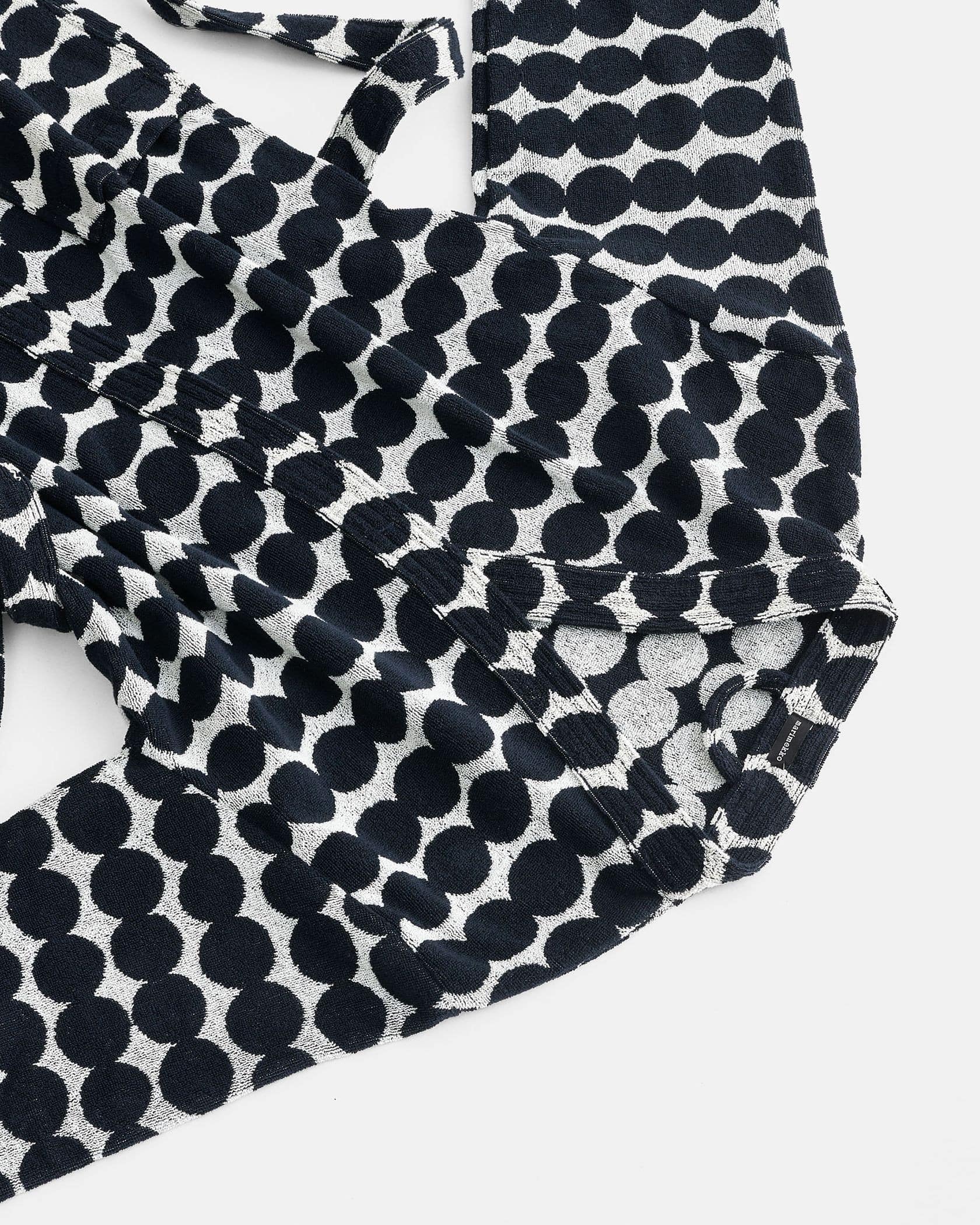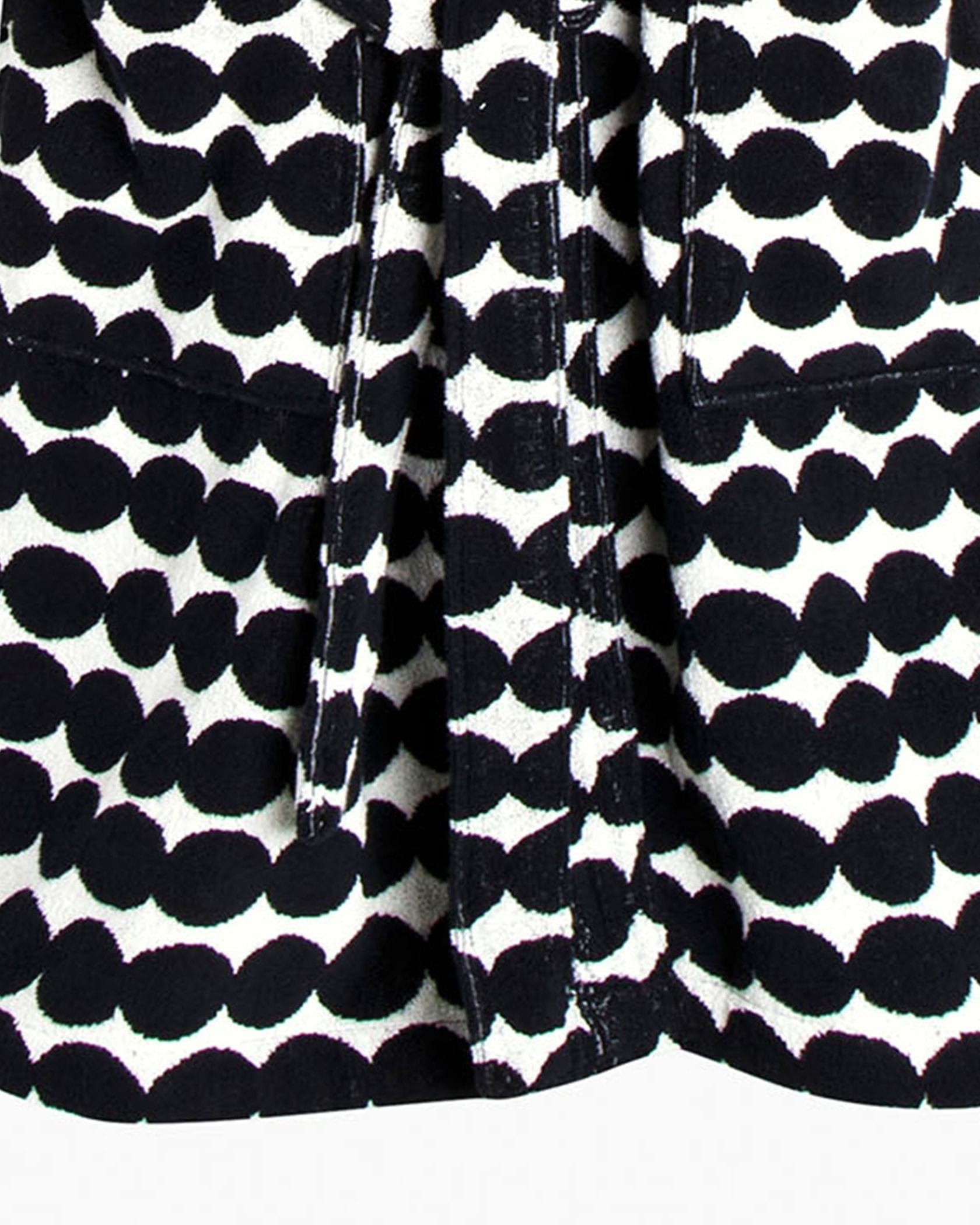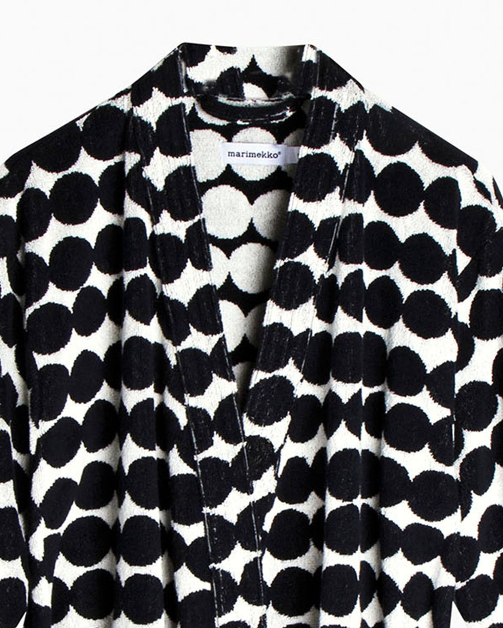 グラフィカルなRasymattoモチーフを全面にプリントしたバスローブ。リズミカルに並んだ不均一な形のドットがモダンなデザイン。共布のベルト紐、便利なポケット付き。さっと羽織れるしっかりとしたタオル地はリラックスタイムにぴったりな肌触りの良いコットン生地。バスルームが華やぐアイテムです。
