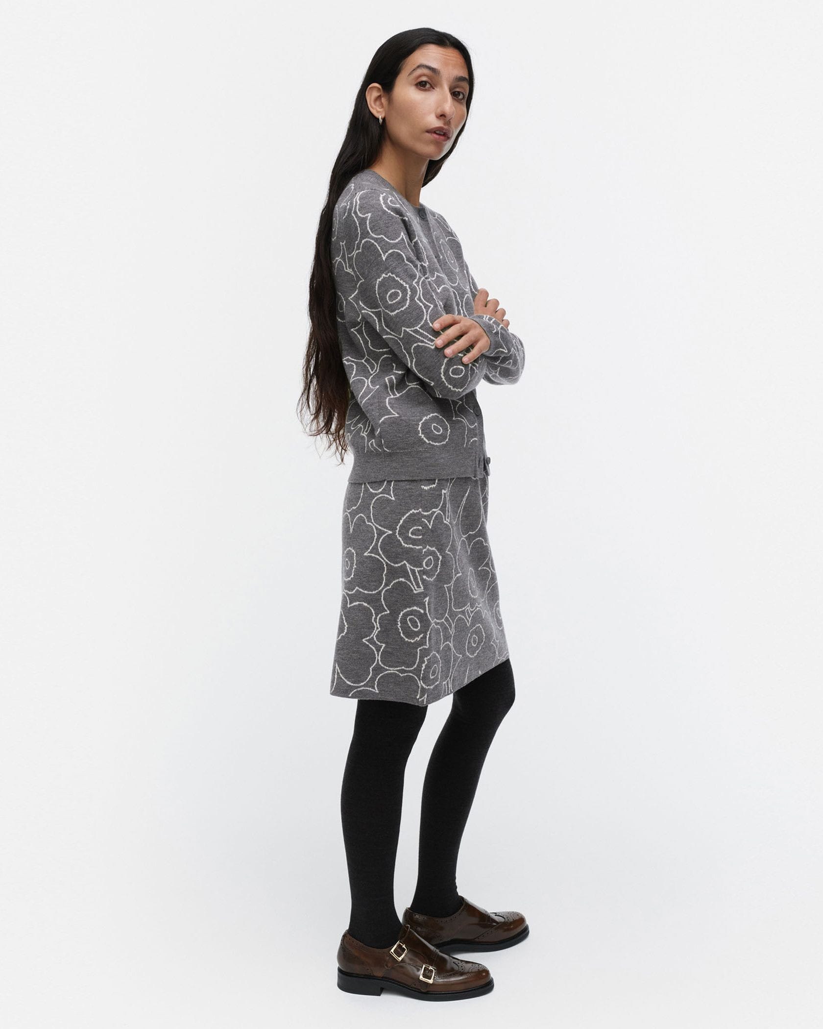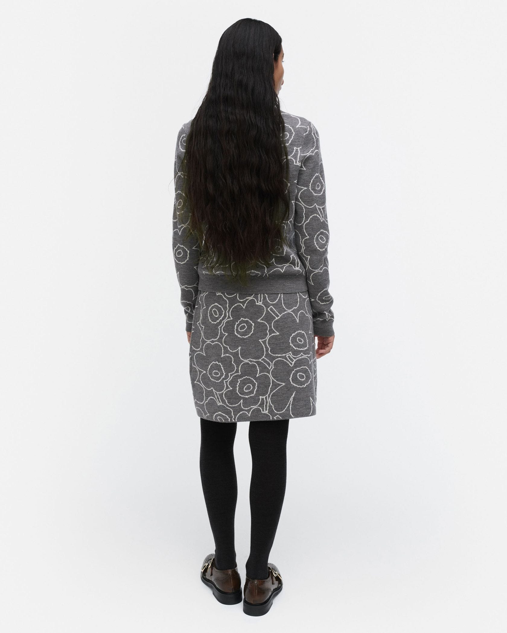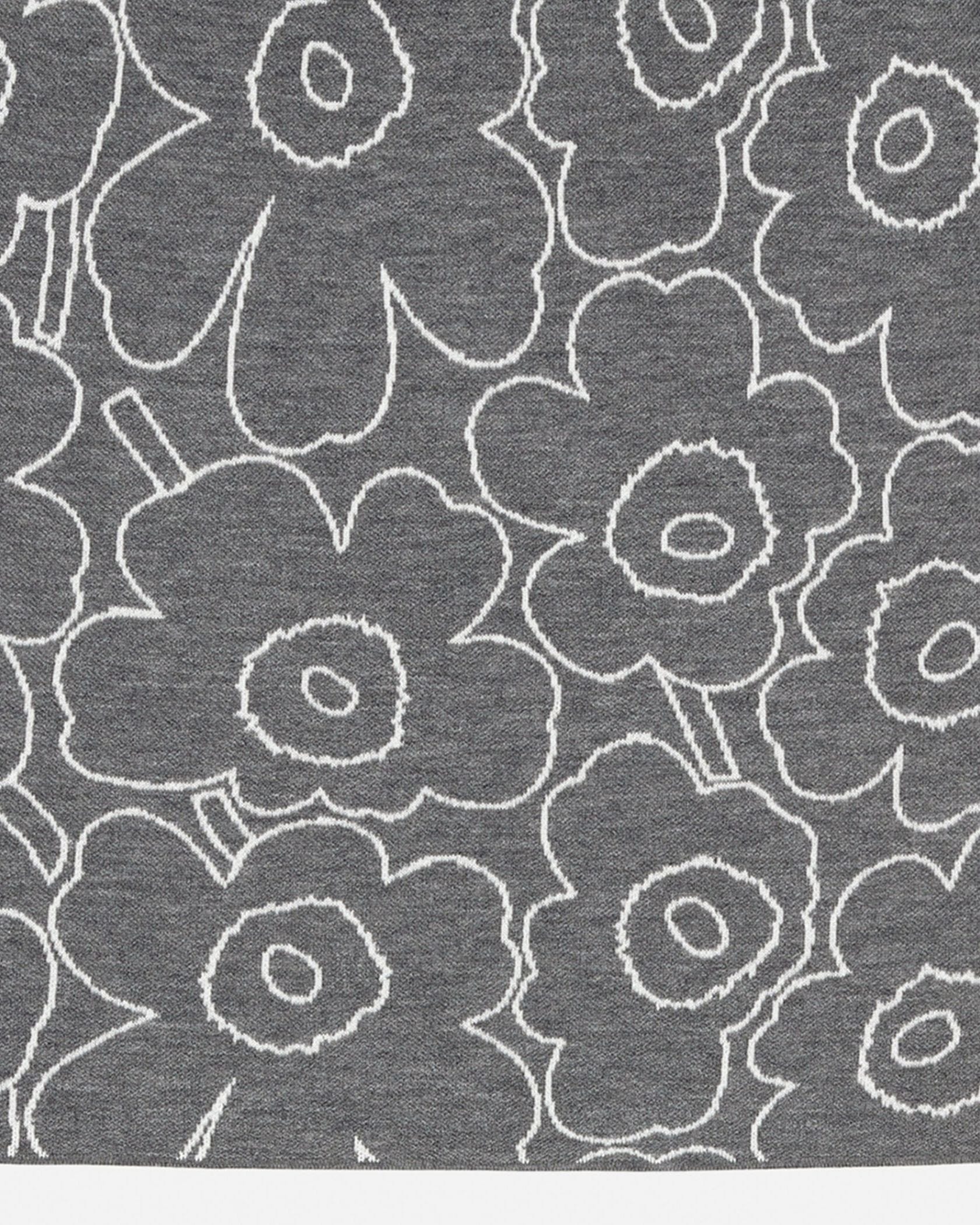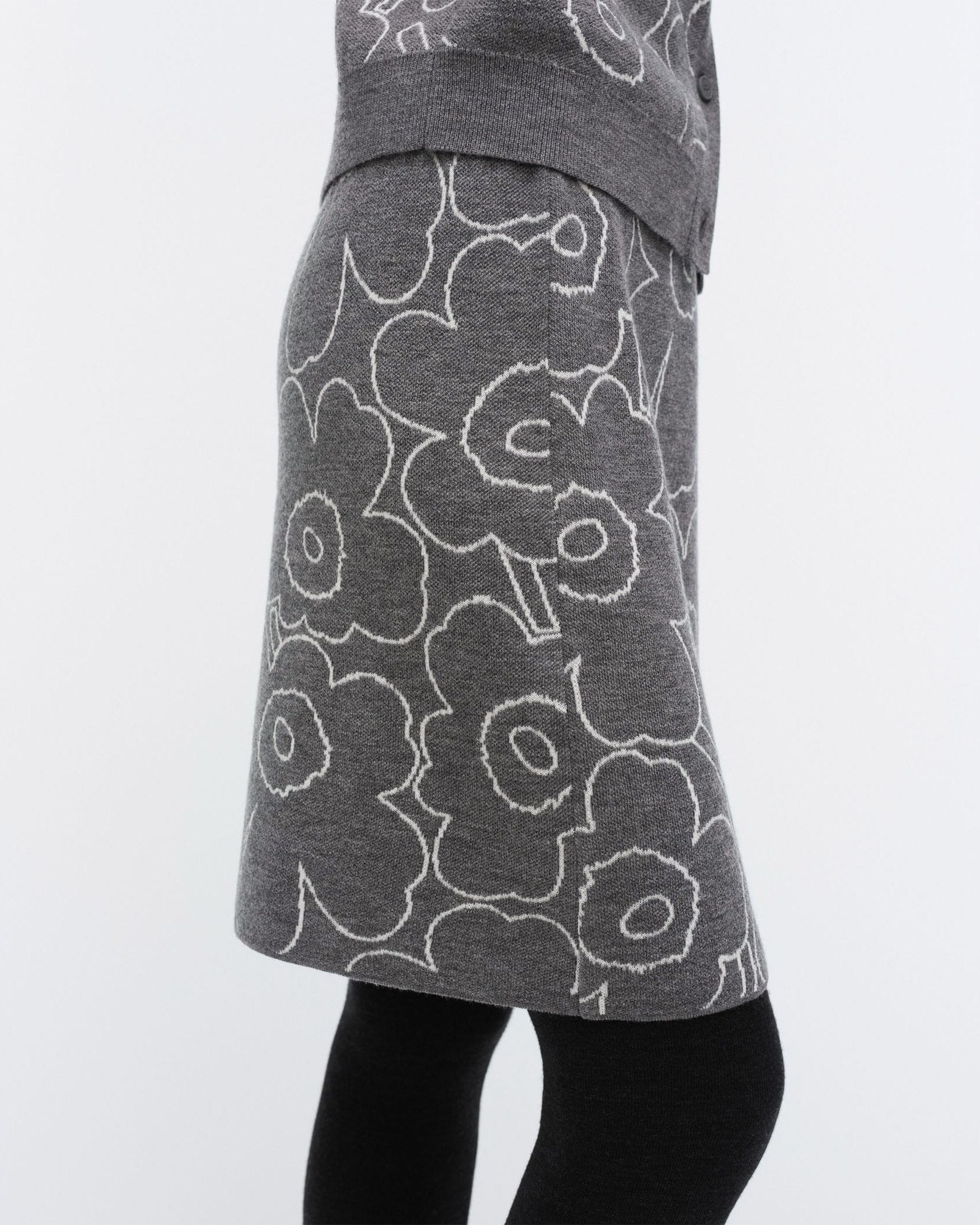 Marimekkoを代表するUnikko柄をラインで表現したスタイリッシュなデザインのミニスカート。あたたかな毛混合ニット素材で秋冬らしいスタイリングにぴったり。すっきりと着こなせるスリムストレートなシルエット。リブ編みのウエストがアクセント。お出かけコーディネートが完成する一枚です。
