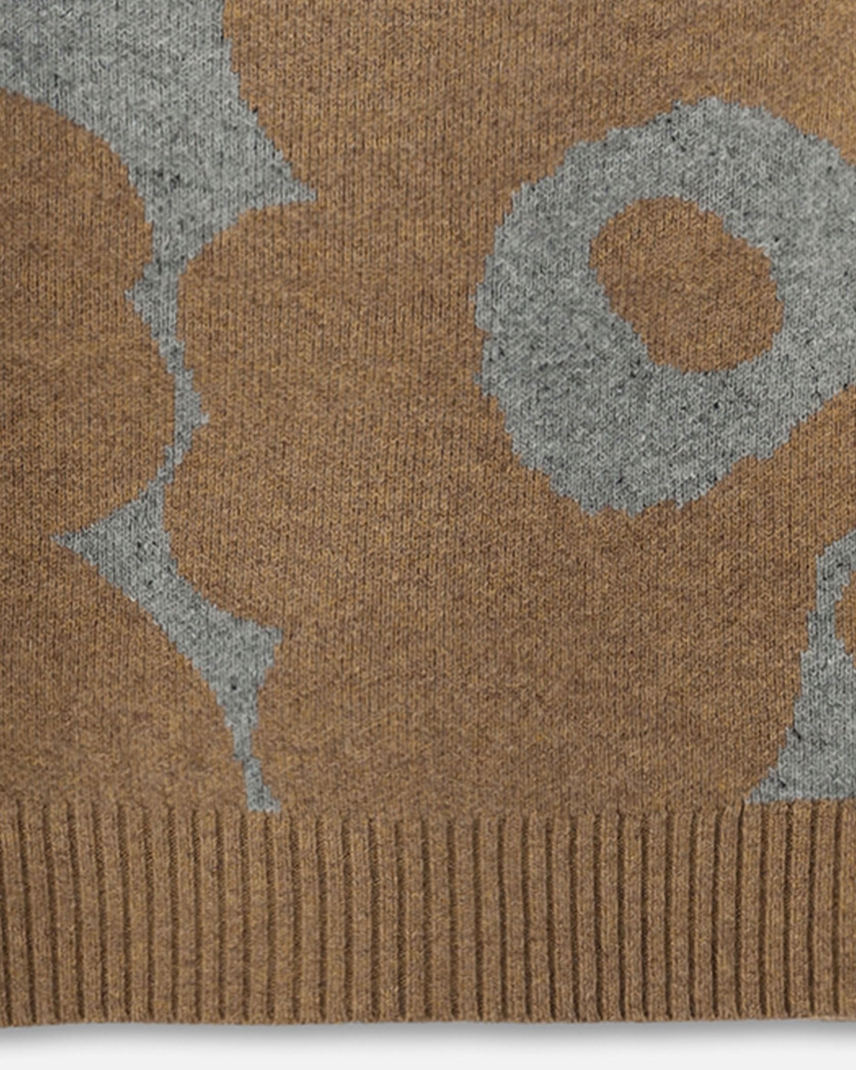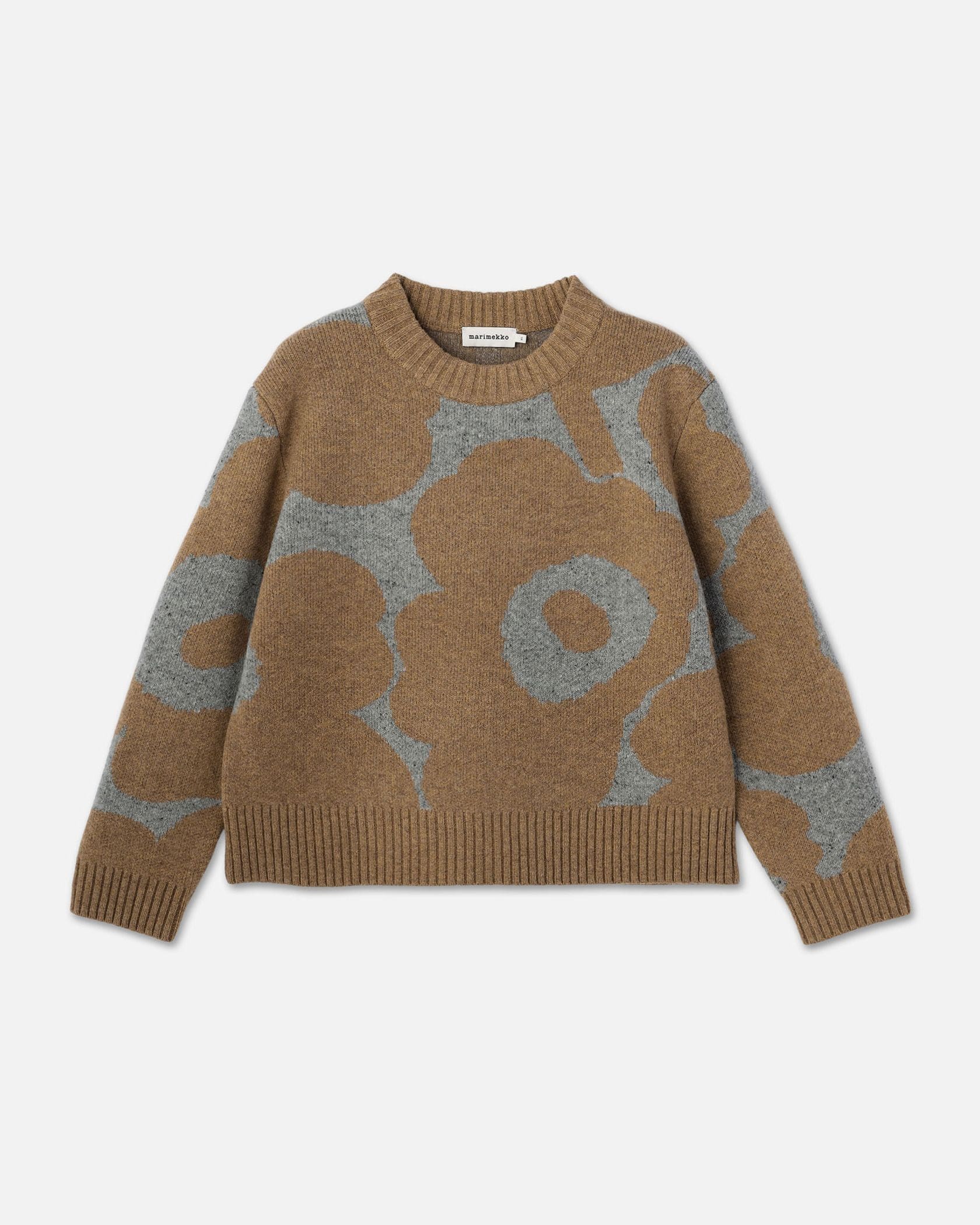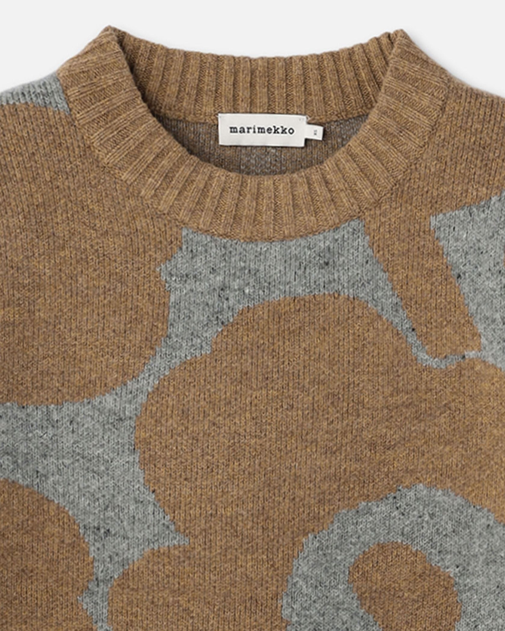 大ぶりなUnikko柄をあしらったクルーネックニットプルオーバー。ライトブラウン×グレーの配色が、落ち着いた雰囲気の中にもさりげなく個性を主張します。シルエットはややリラックス感のある仕上がりで、首元、袖口、裾部分はリブ仕様に。素材は上質で暖かな毛100%を使用しています。