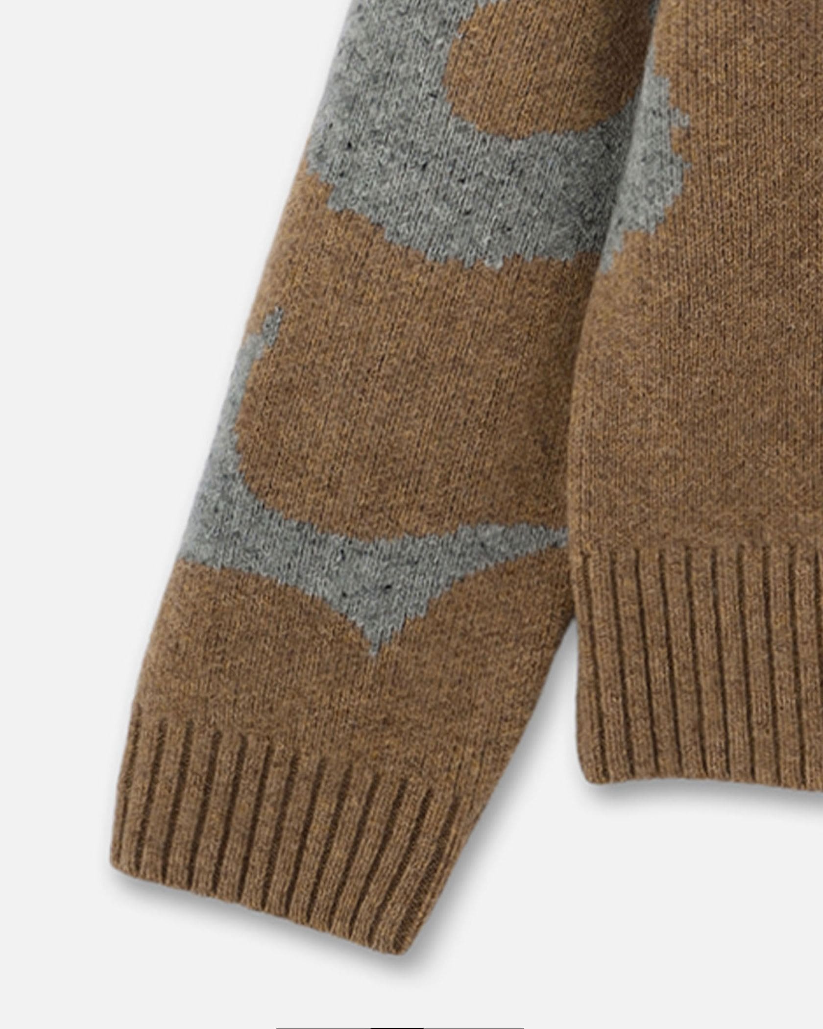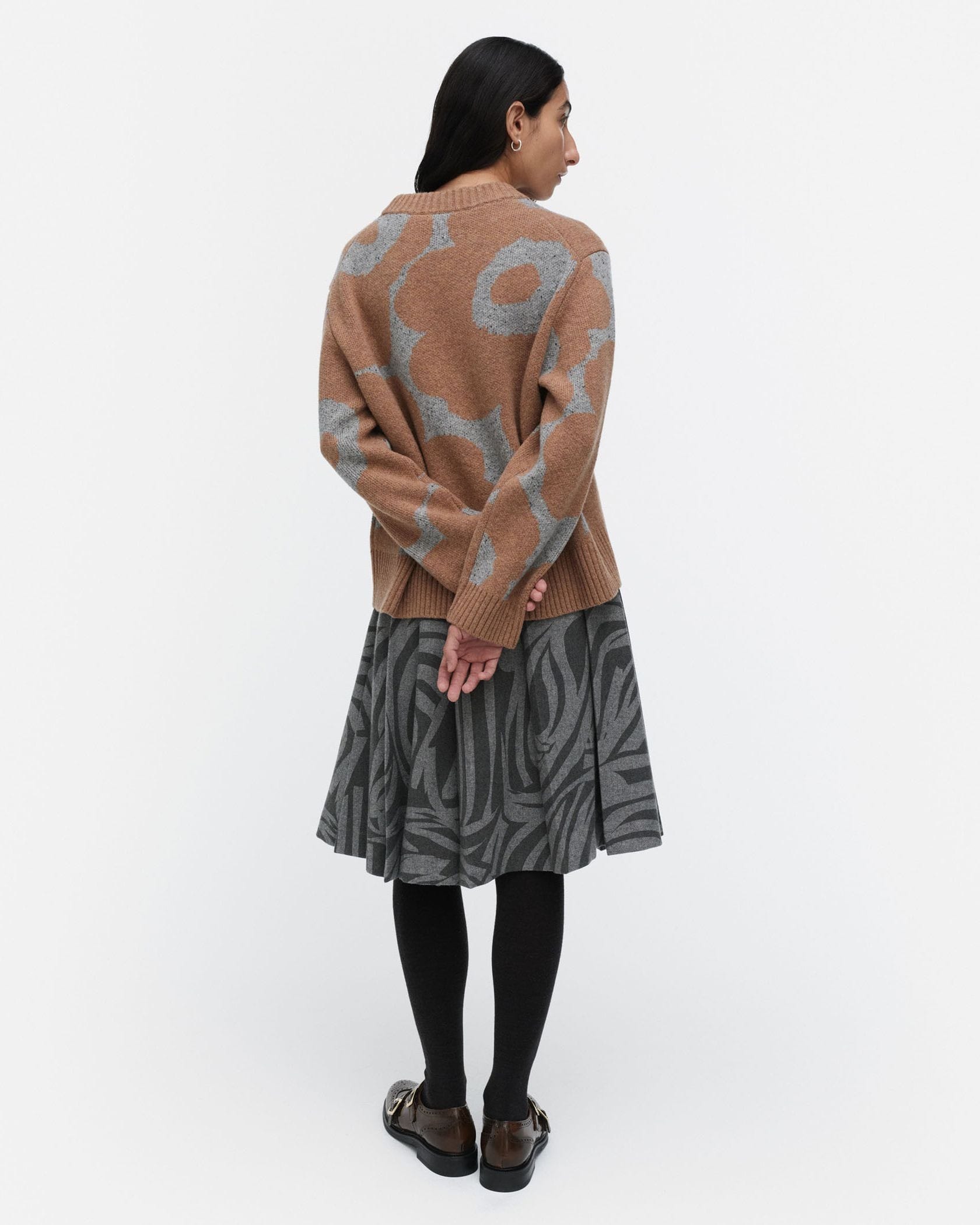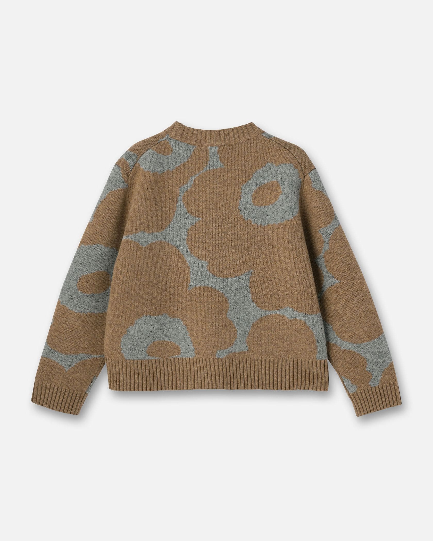 大ぶりなUnikko柄をあしらったクルーネックニットプルオーバー。ライトブラウン×グレーの配色が、落ち着いた雰囲気の中にもさりげなく個性を主張します。シルエットはややリラックス感のある仕上がりで、首元、袖口、裾部分はリブ仕様に。素材は上質で暖かな毛100%を使用しています。