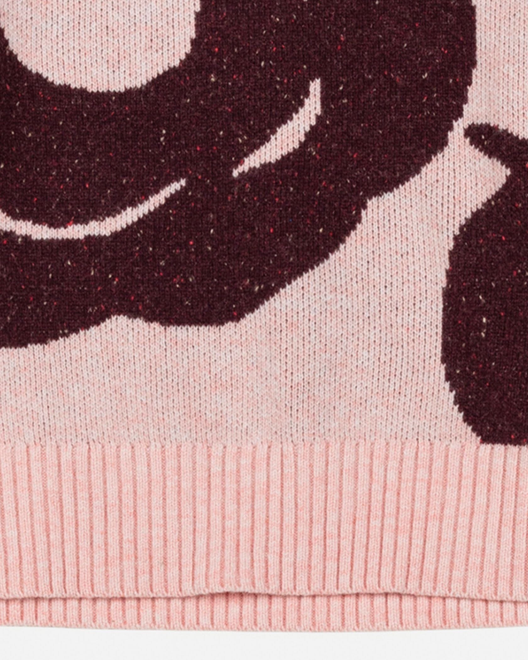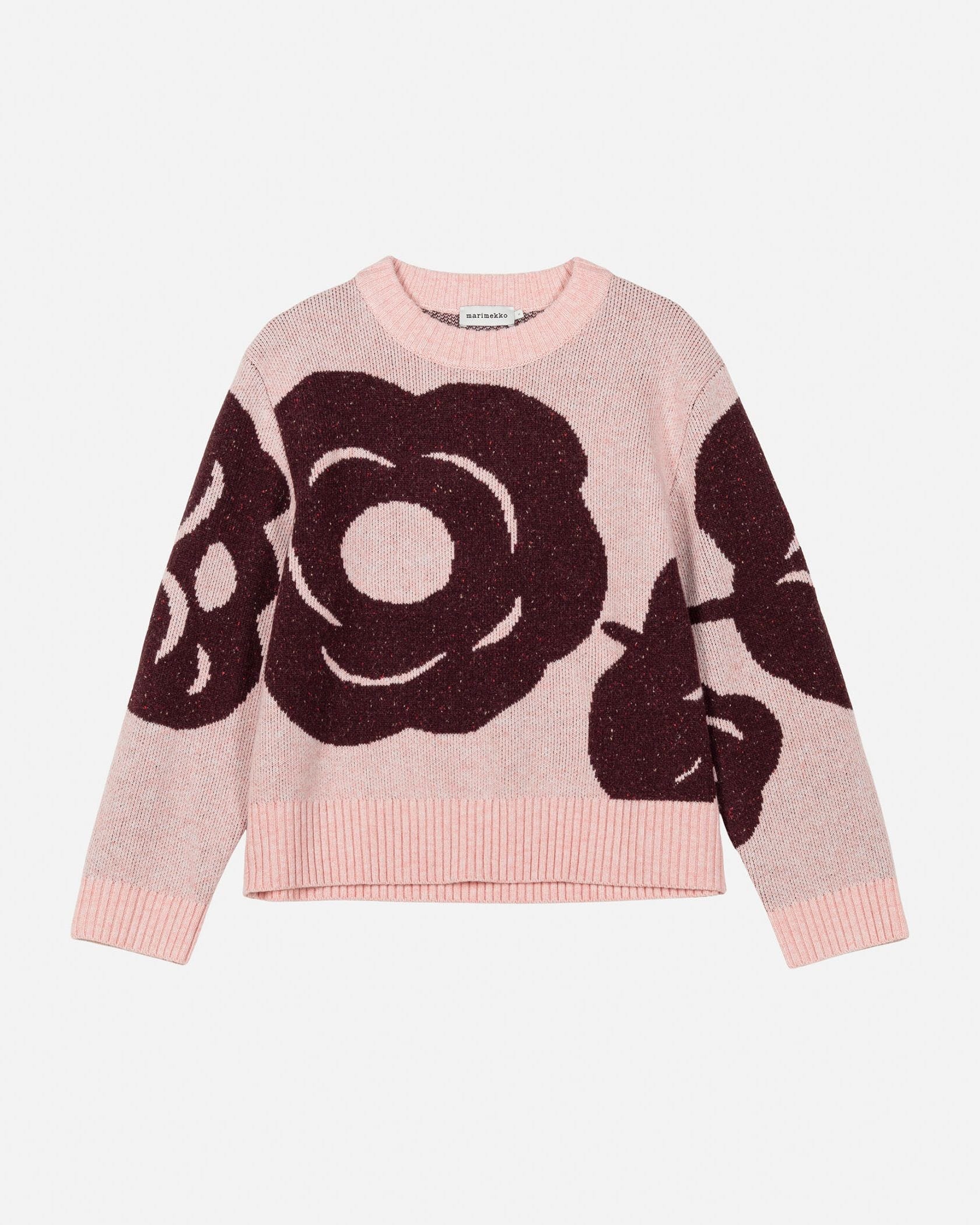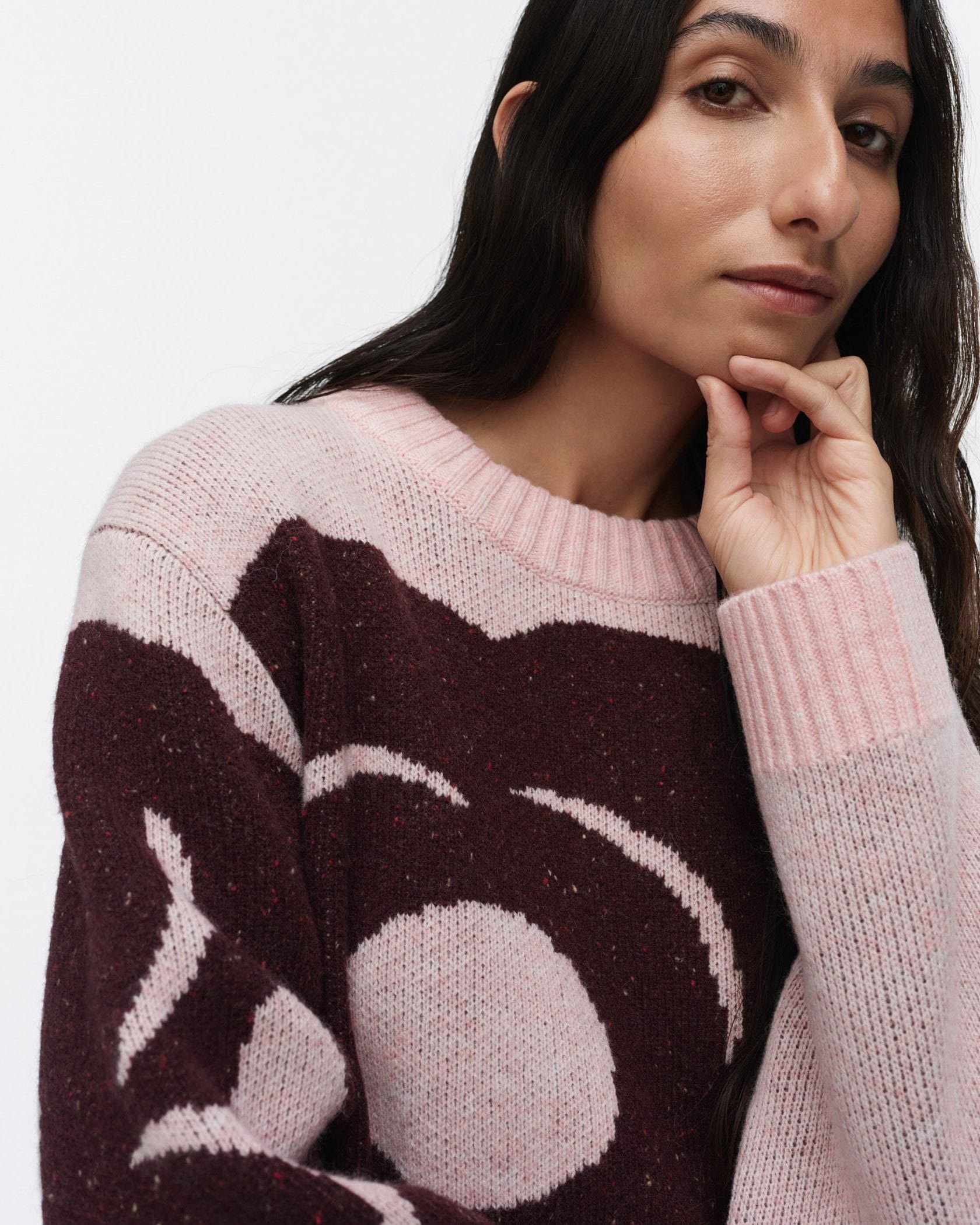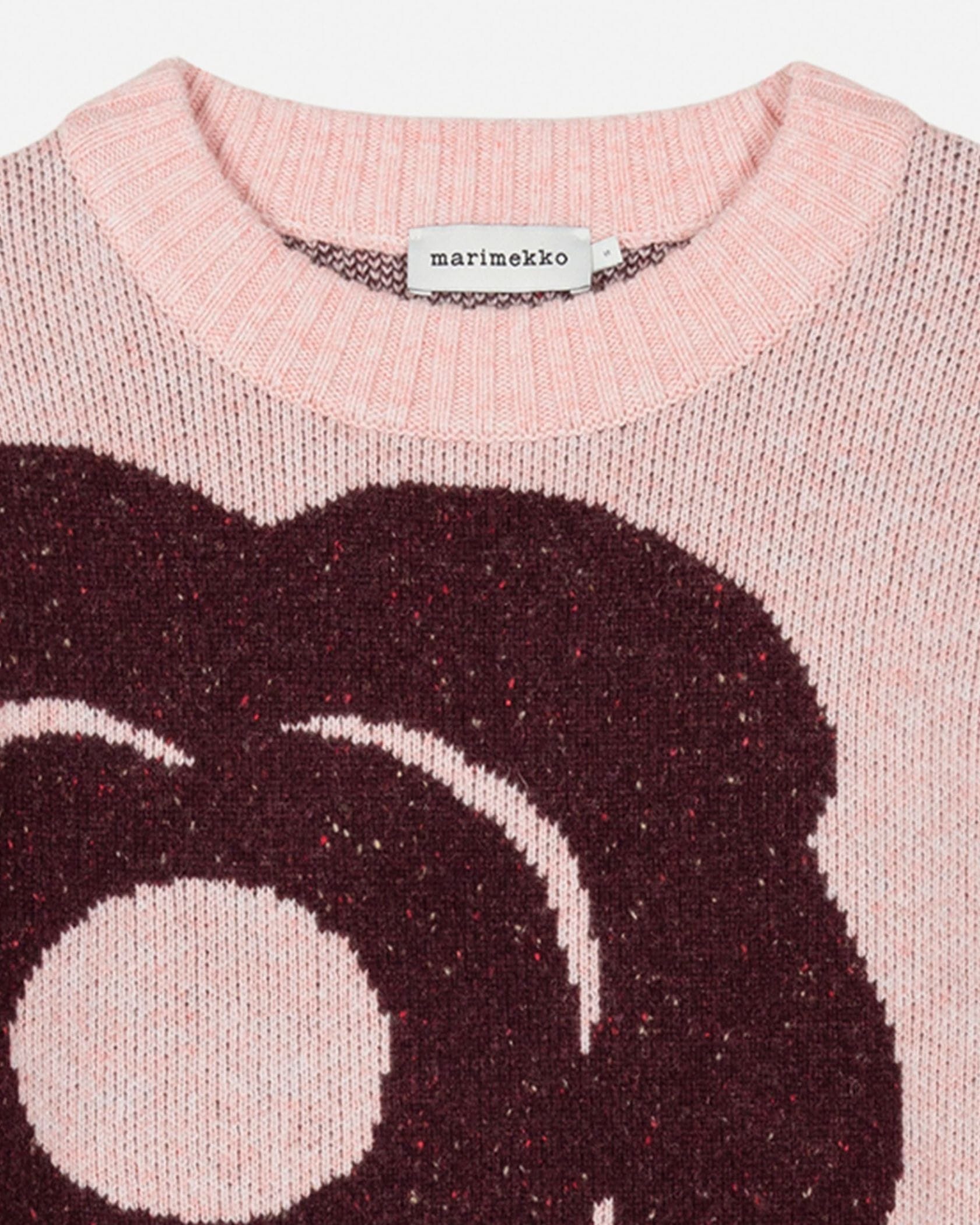 ダークを意味するTumma柄をあしらったクルーネックニットプルオーバー。ライトピンク×ワインレッドの配色が上品で女性らしい印象です。シルエットはほどよくリラックス感があり、首元、袖口、裾部分はリブ仕様。毛100%素材で暖かさも抜群。日常からお出かけまで様々なシーンにおすすめの一着です。