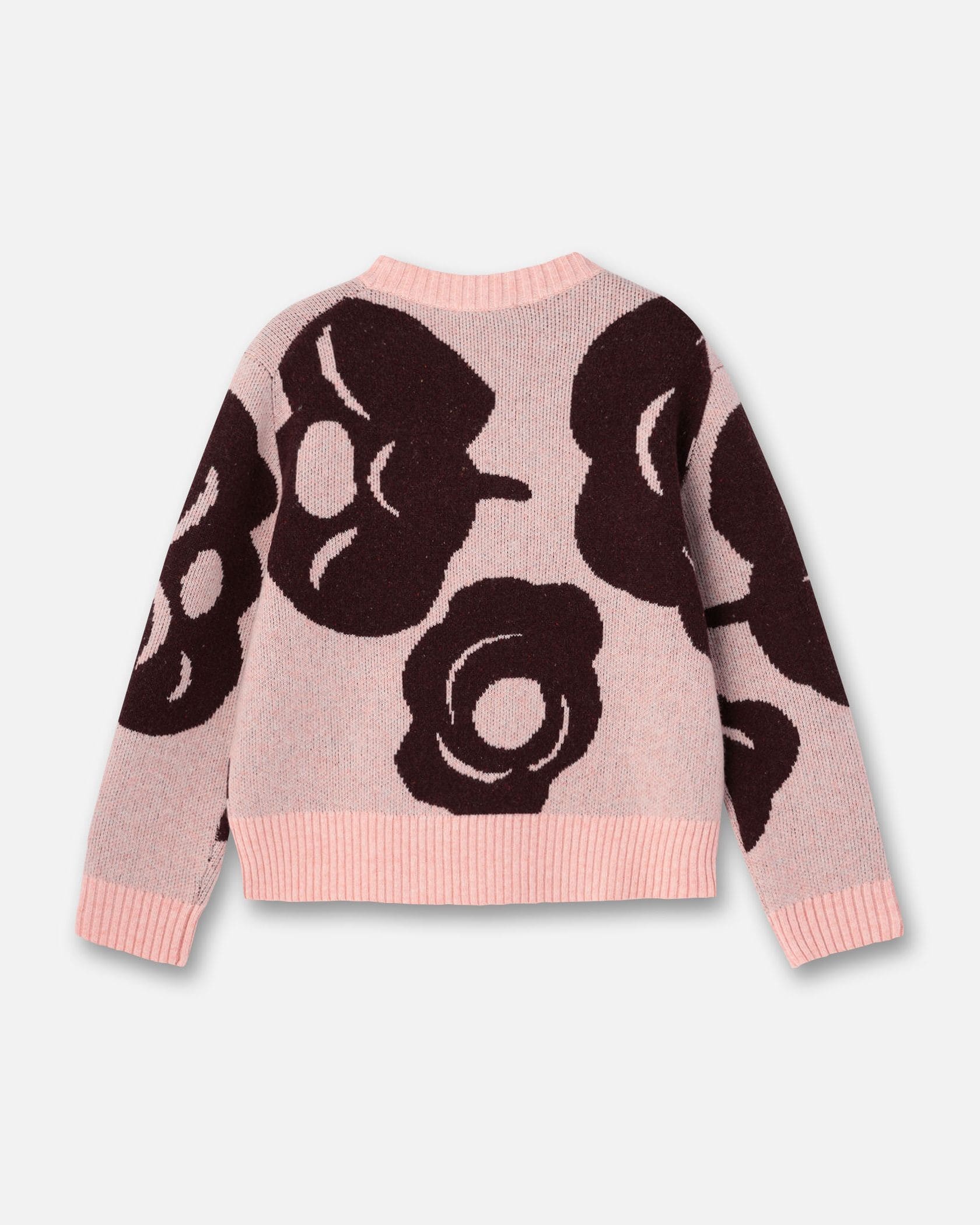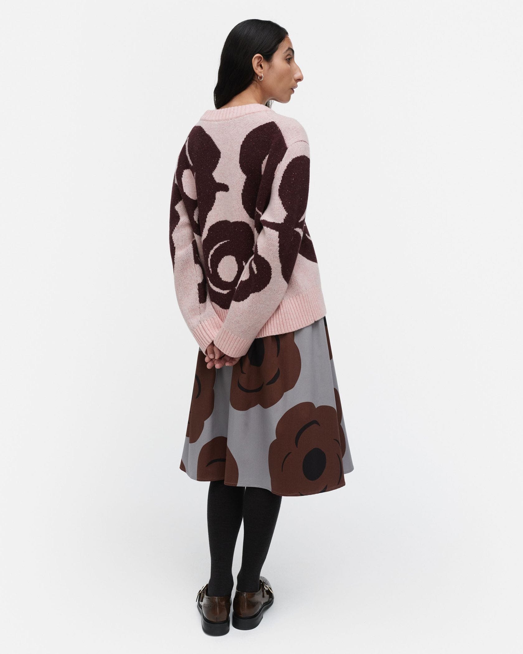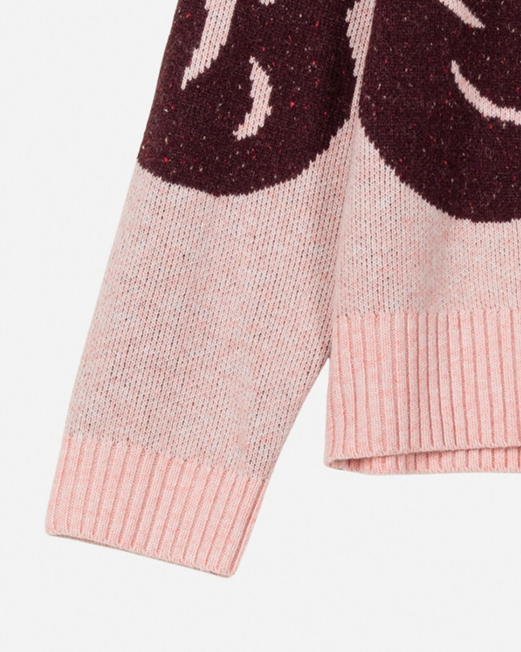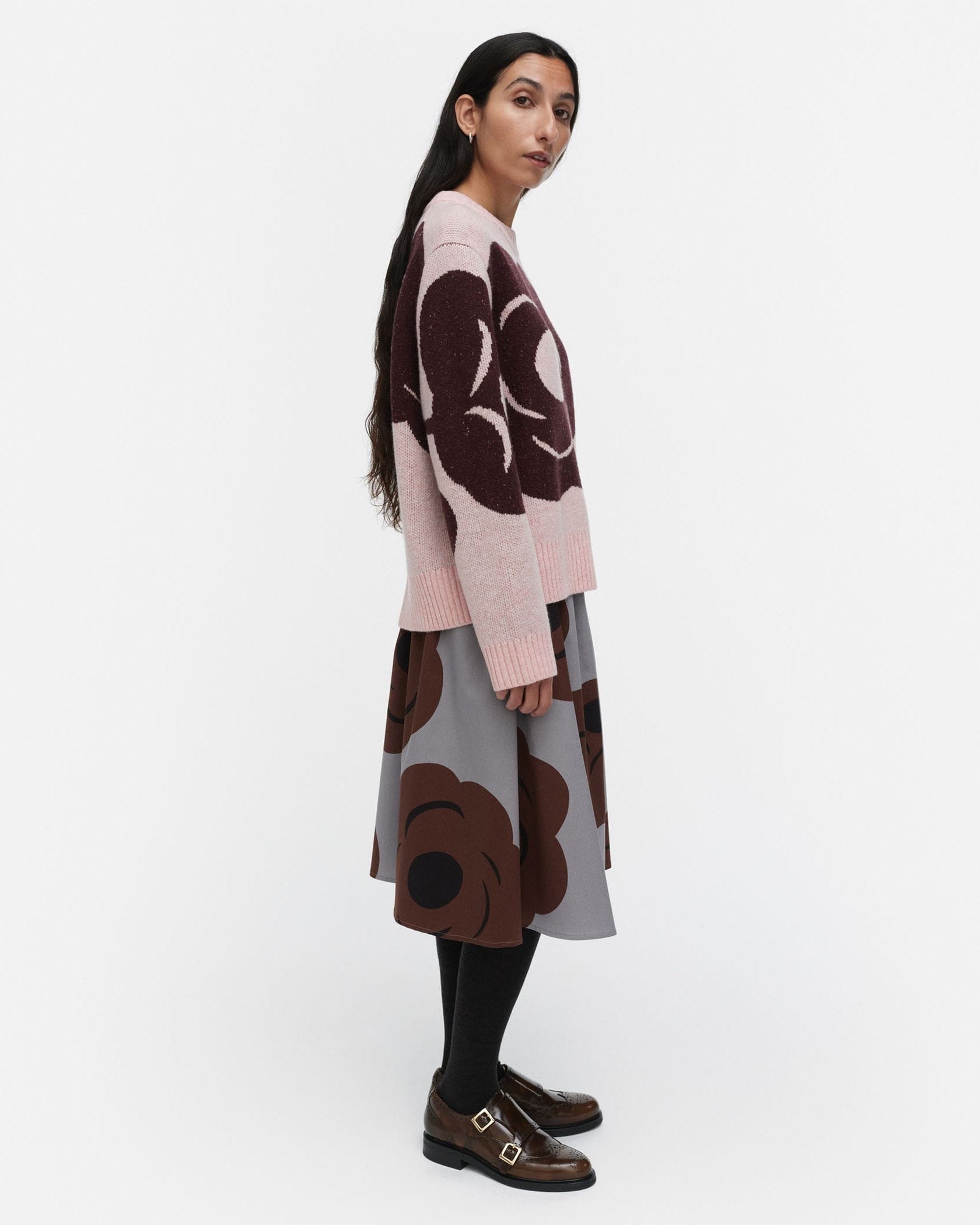 ダークを意味するTumma柄をあしらったクルーネックニットプルオーバー。ライトピンク×ワインレッドの配色が上品で女性らしい印象です。シルエットはほどよくリラックス感があり、首元、袖口、裾部分はリブ仕様。毛100%素材で暖かさも抜群。日常からお出かけまで様々なシーンにおすすめの一着です。