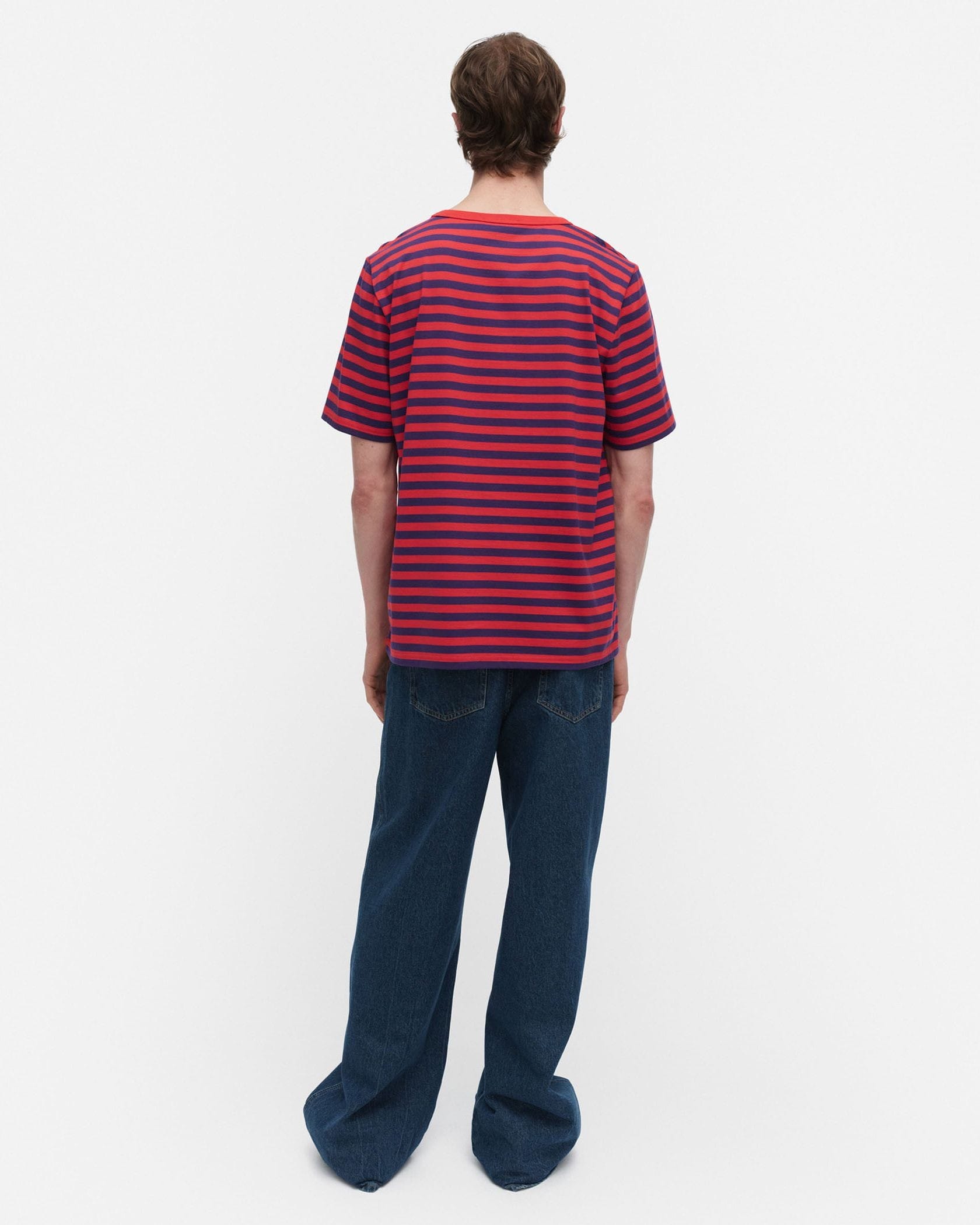 2色のボーダー柄が着こなしのアクセントになるOネックTシャツ。平等性を表現しているMarimekkoのボーダー柄。左胸にあしらわれたUnikko柄の小さなフラワーモチーフがスタイリッシュなポイント。ユニセックスなサイズ感もモダンなポイント。いつものボトムに合わせて明るいムードの着こなしが完成します。