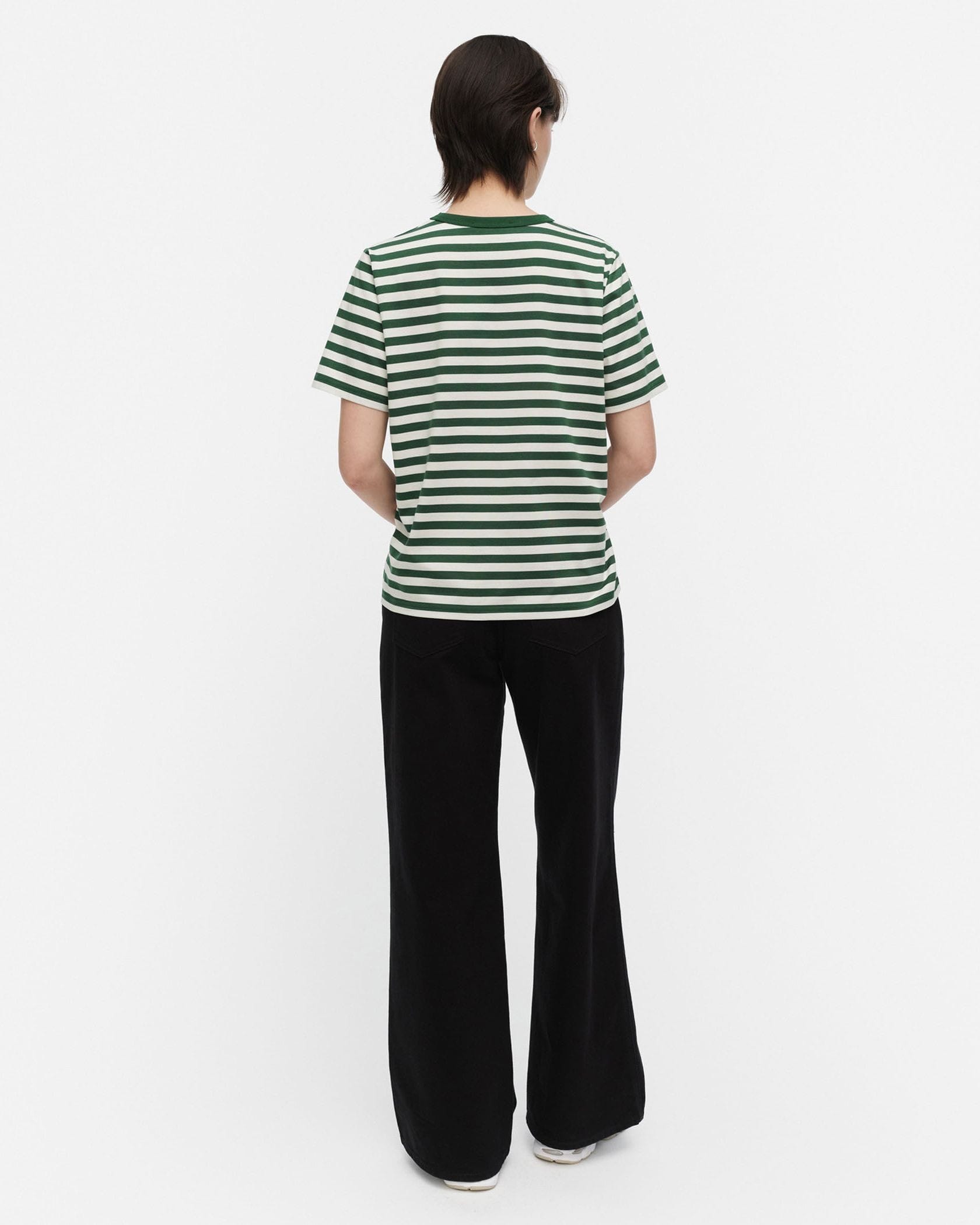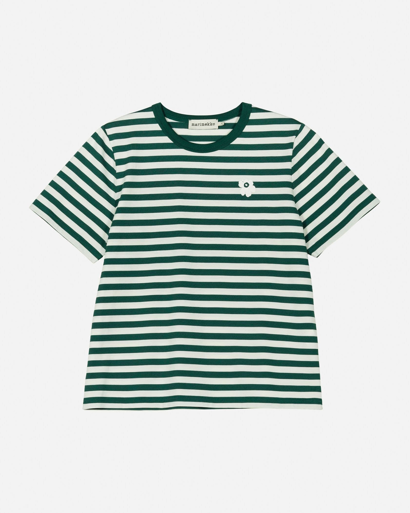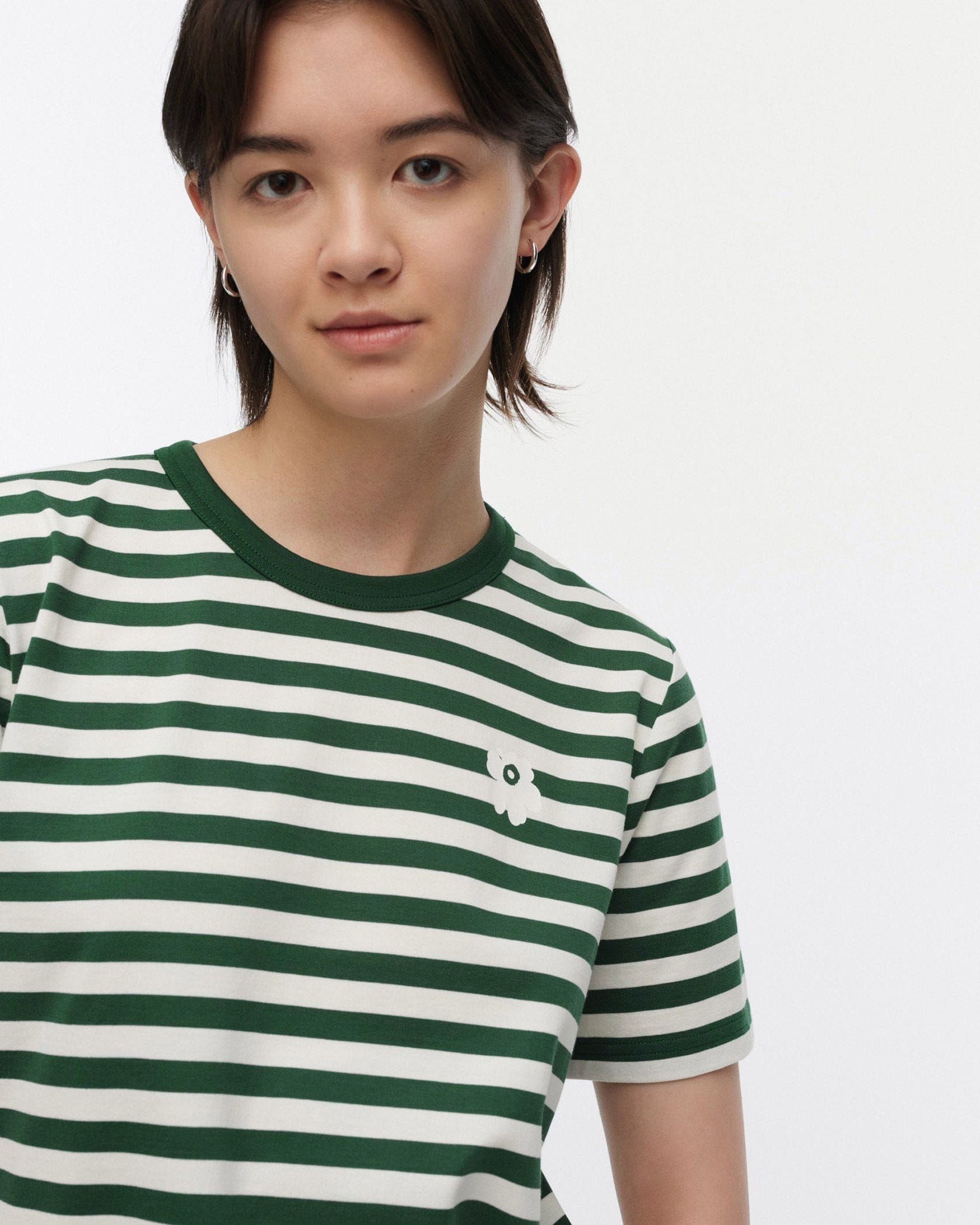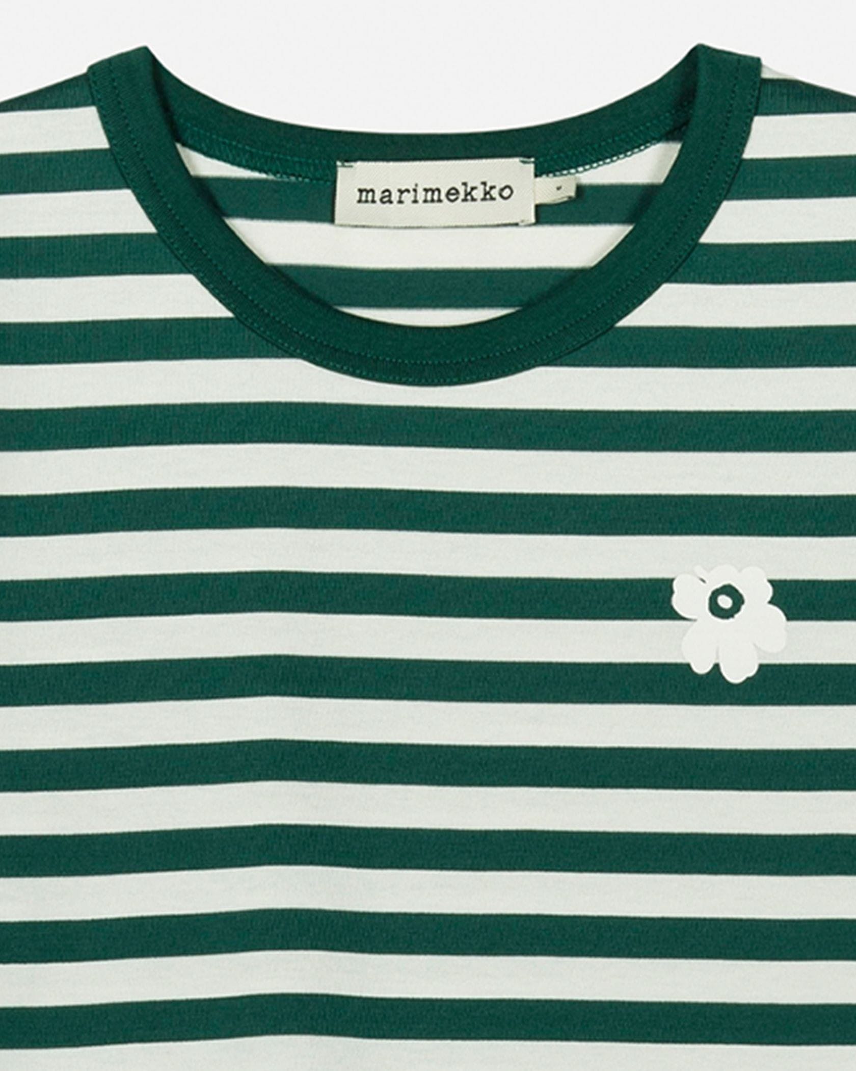 深みのあるグリーンベースのボーダー柄が着こなしの華やかなアクセントになるOネック半袖Tシャツ。均一なラインで平等性を表現しているMarimekkoのボーダー柄。左胸のUnikko柄の小さなフラワーモチーフがスタイリッシュなワンポイント。ユニセックスなサイズ感もモダンなポイントです。