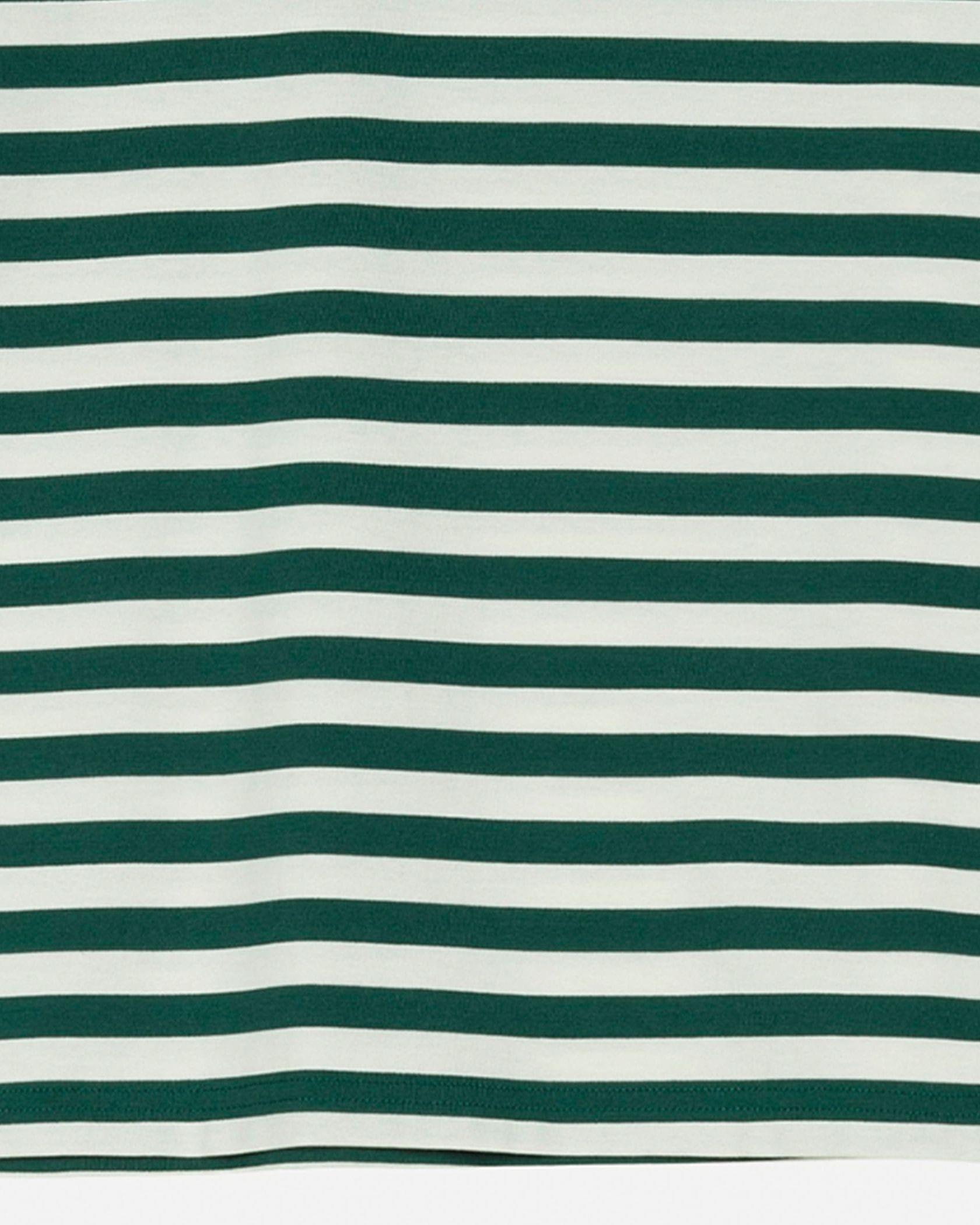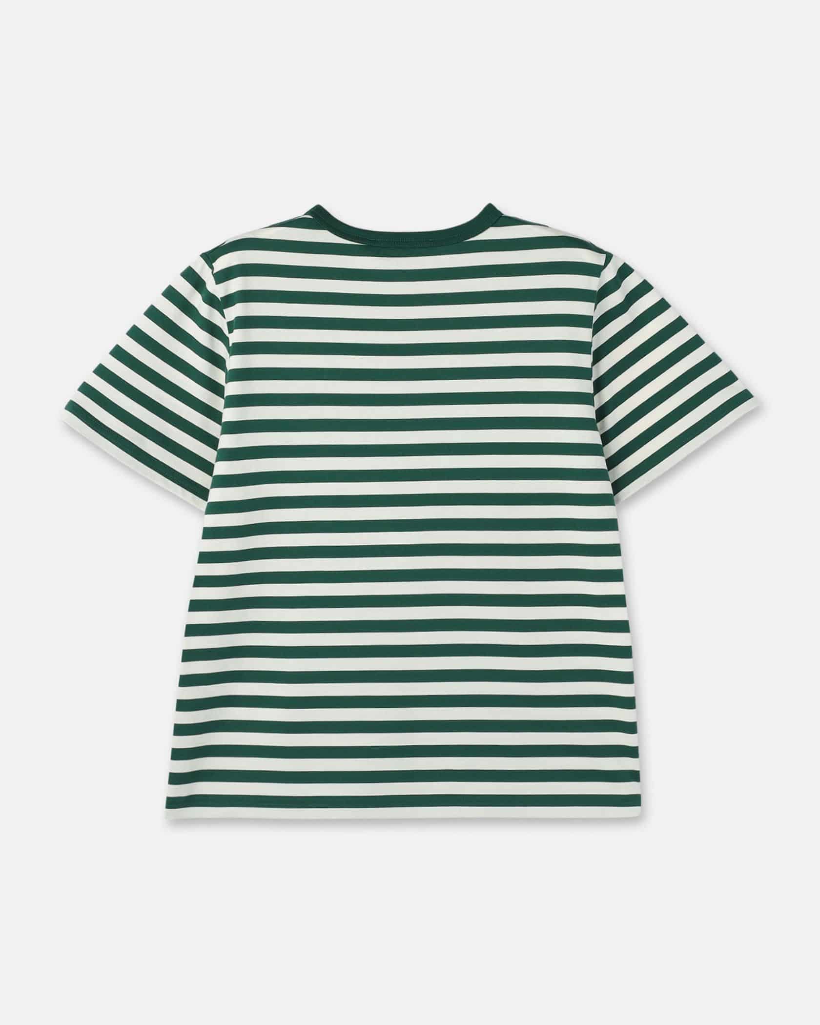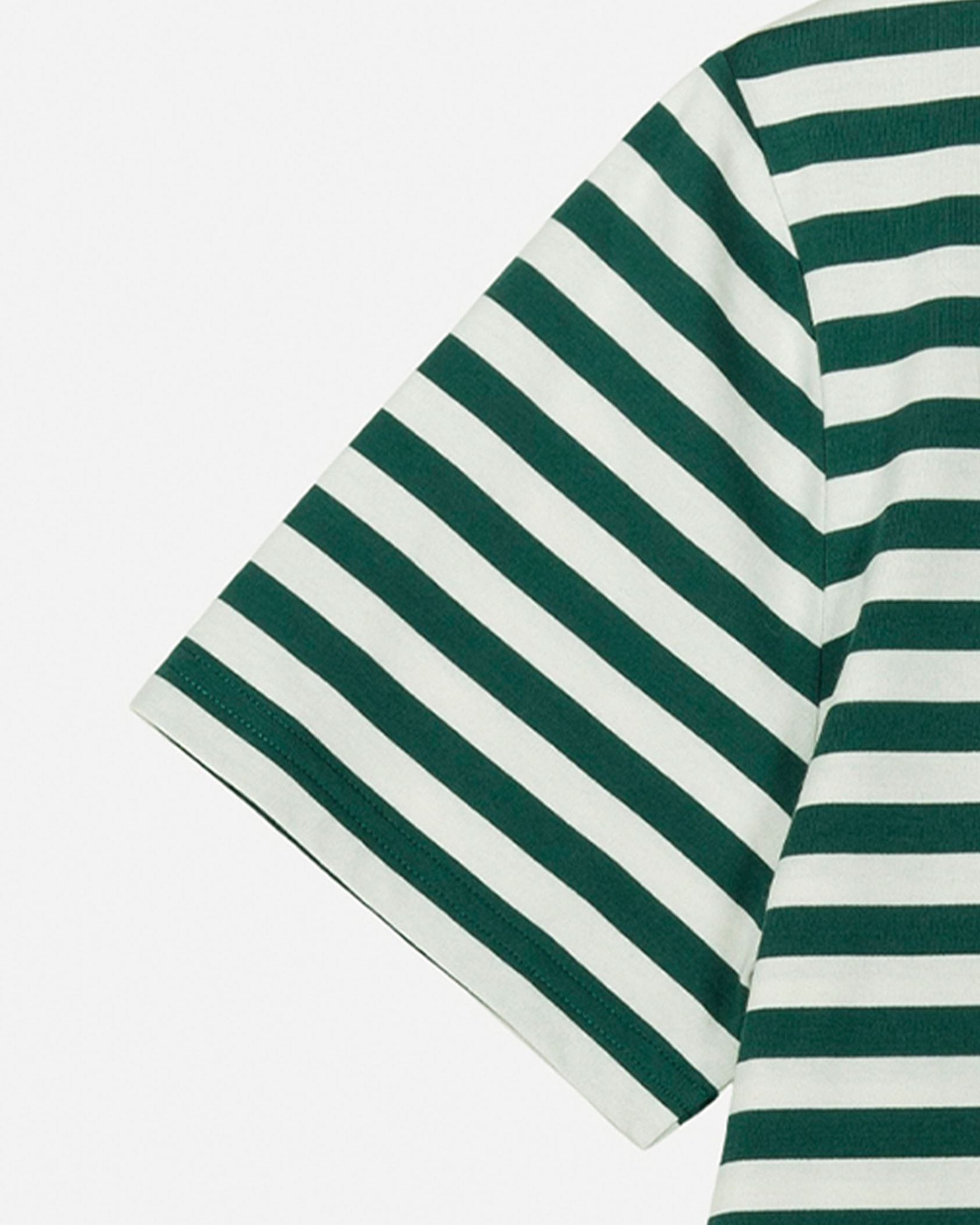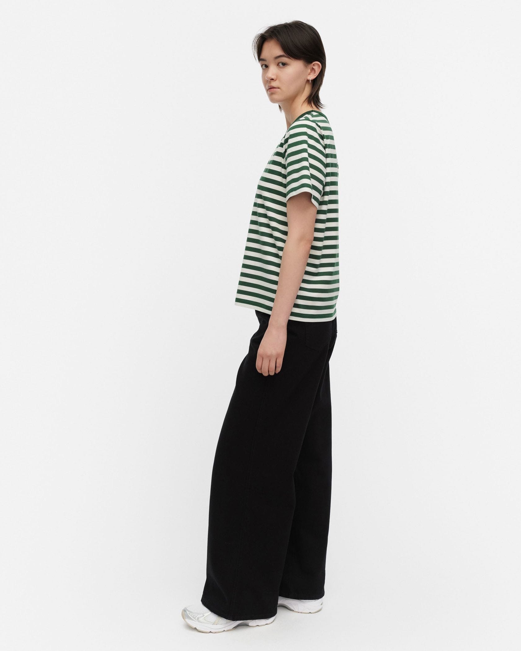 深みのあるグリーンベースのボーダー柄が着こなしの華やかなアクセントになるOネック半袖Tシャツ。均一なラインで平等性を表現しているMarimekkoのボーダー柄。左胸のUnikko柄の小さなフラワーモチーフがスタイリッシュなワンポイント。ユニセックスなサイズ感もモダンなポイントです。