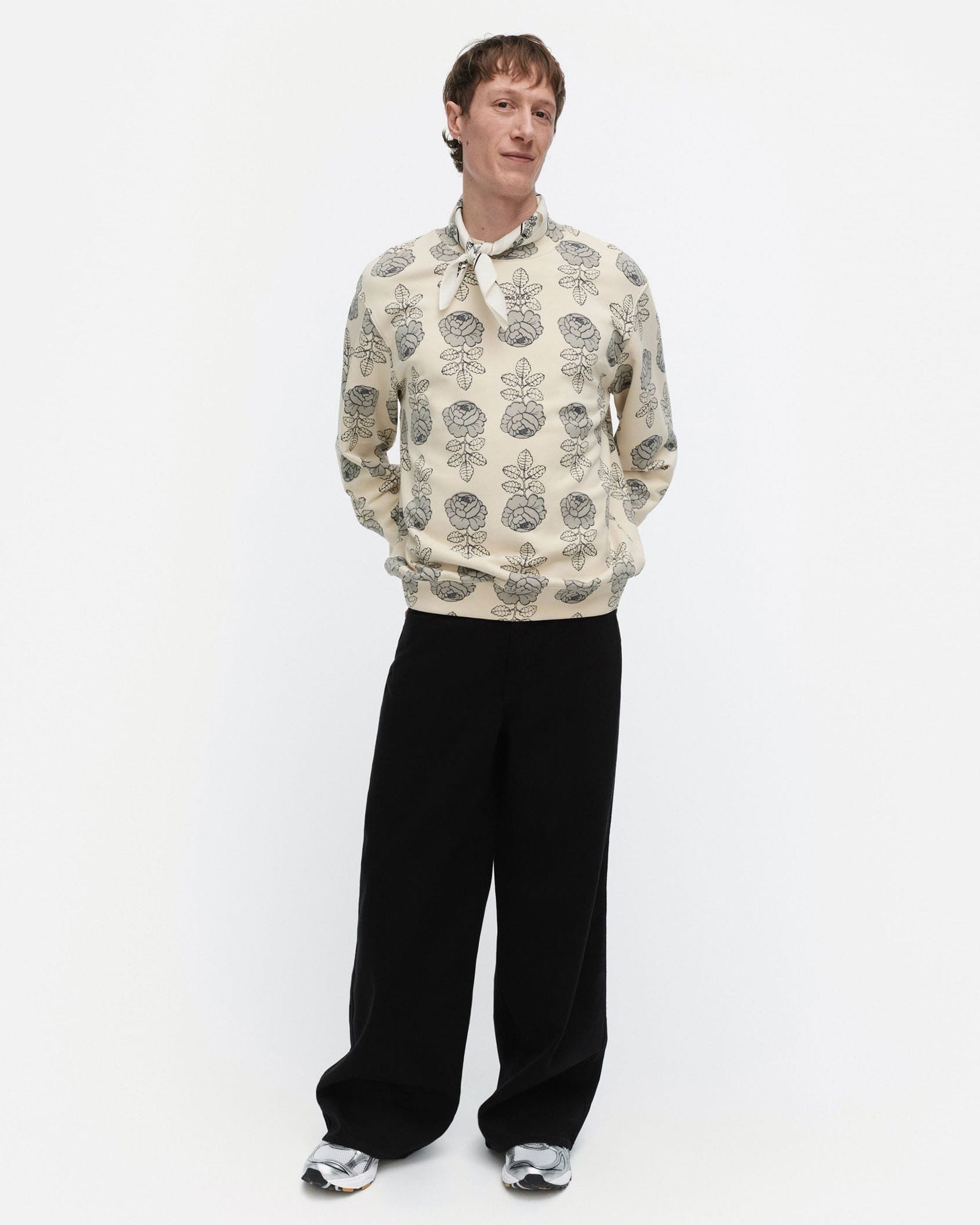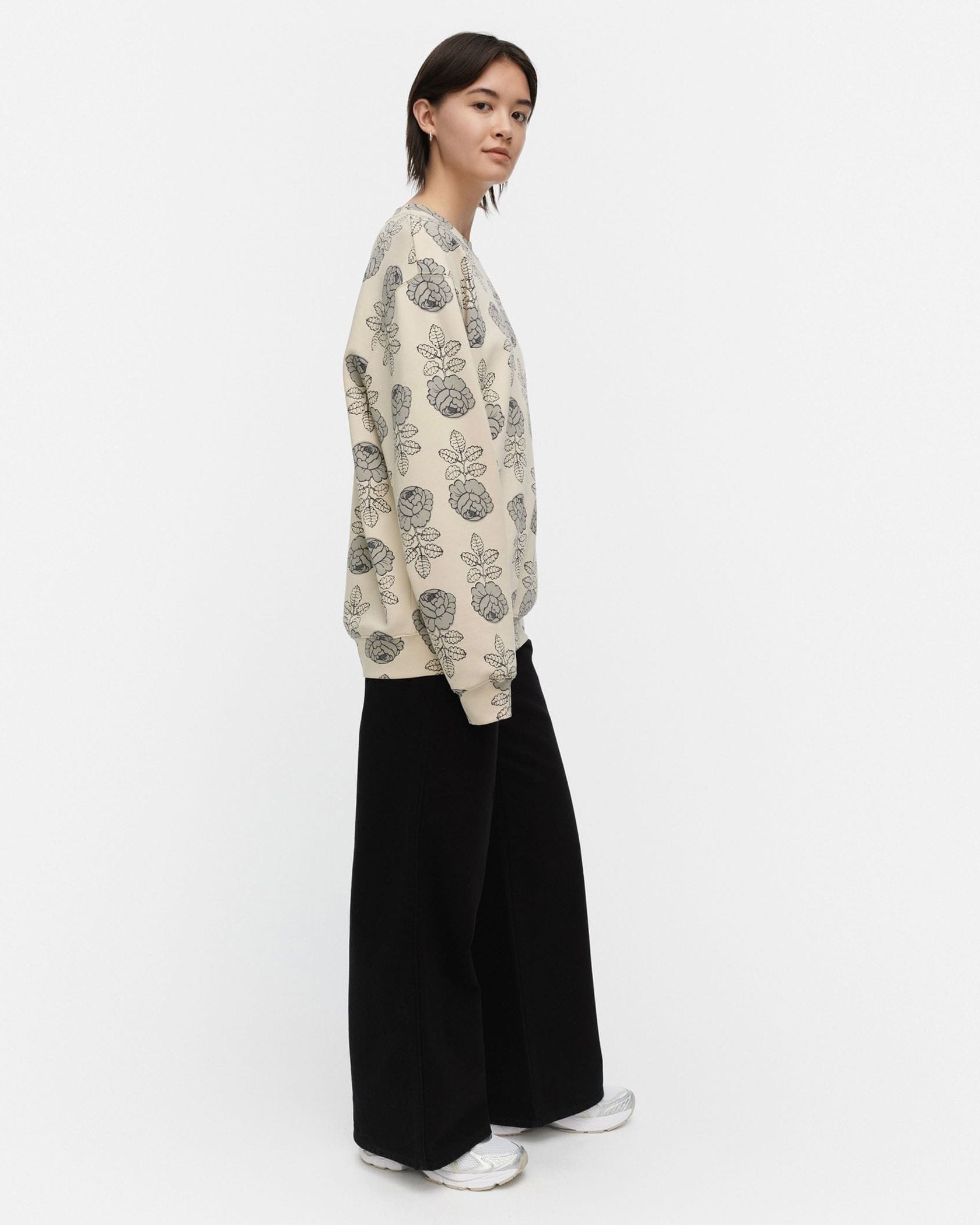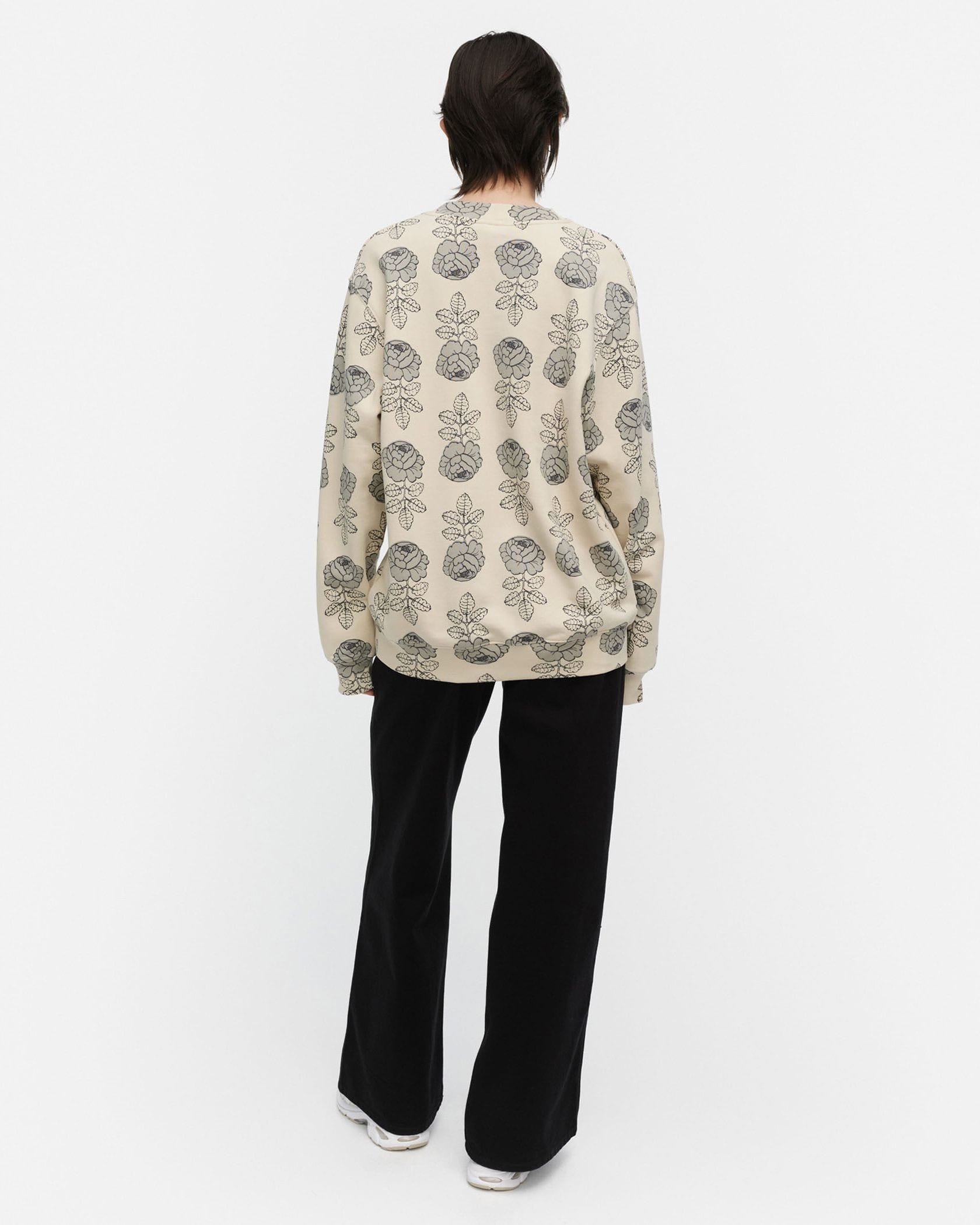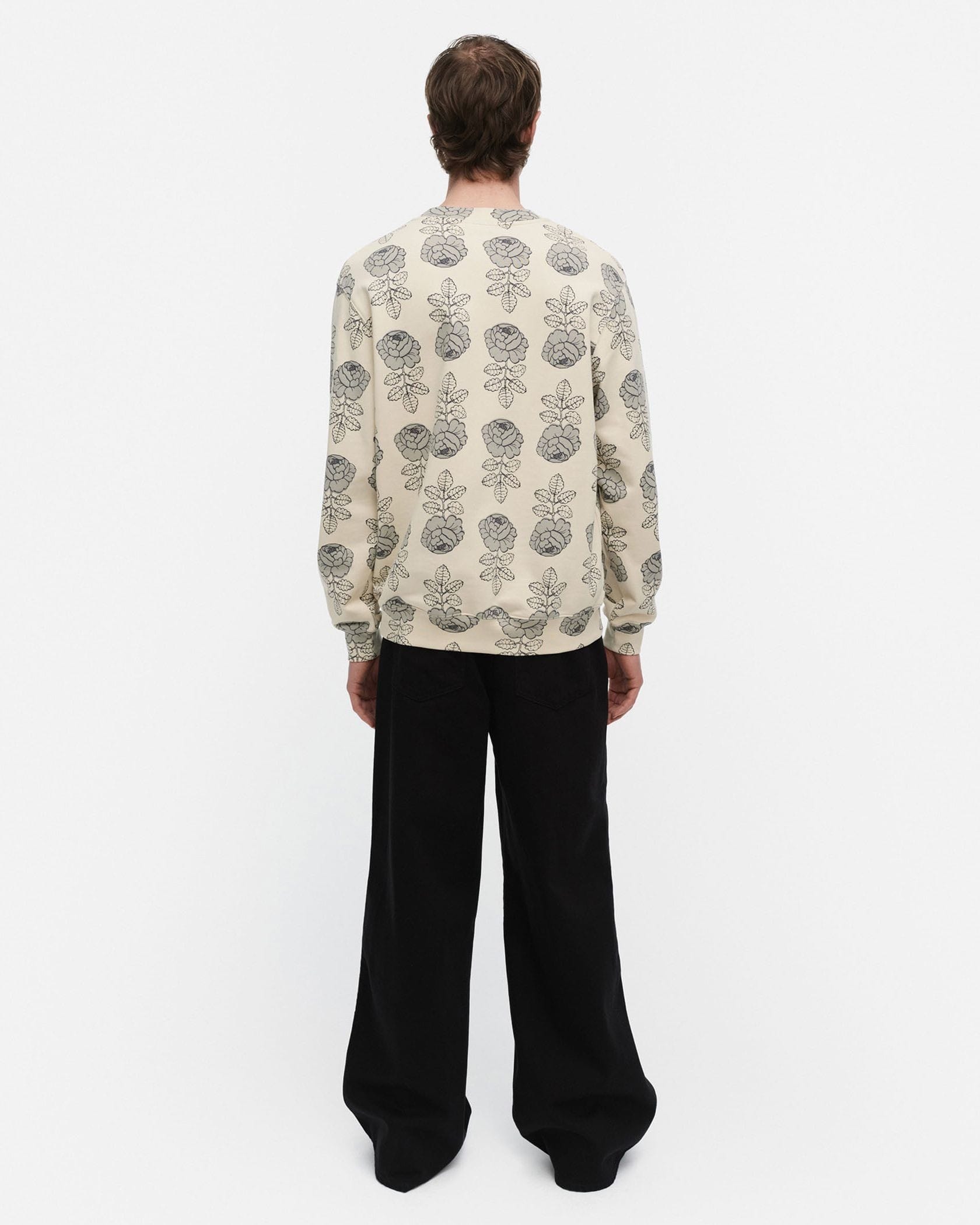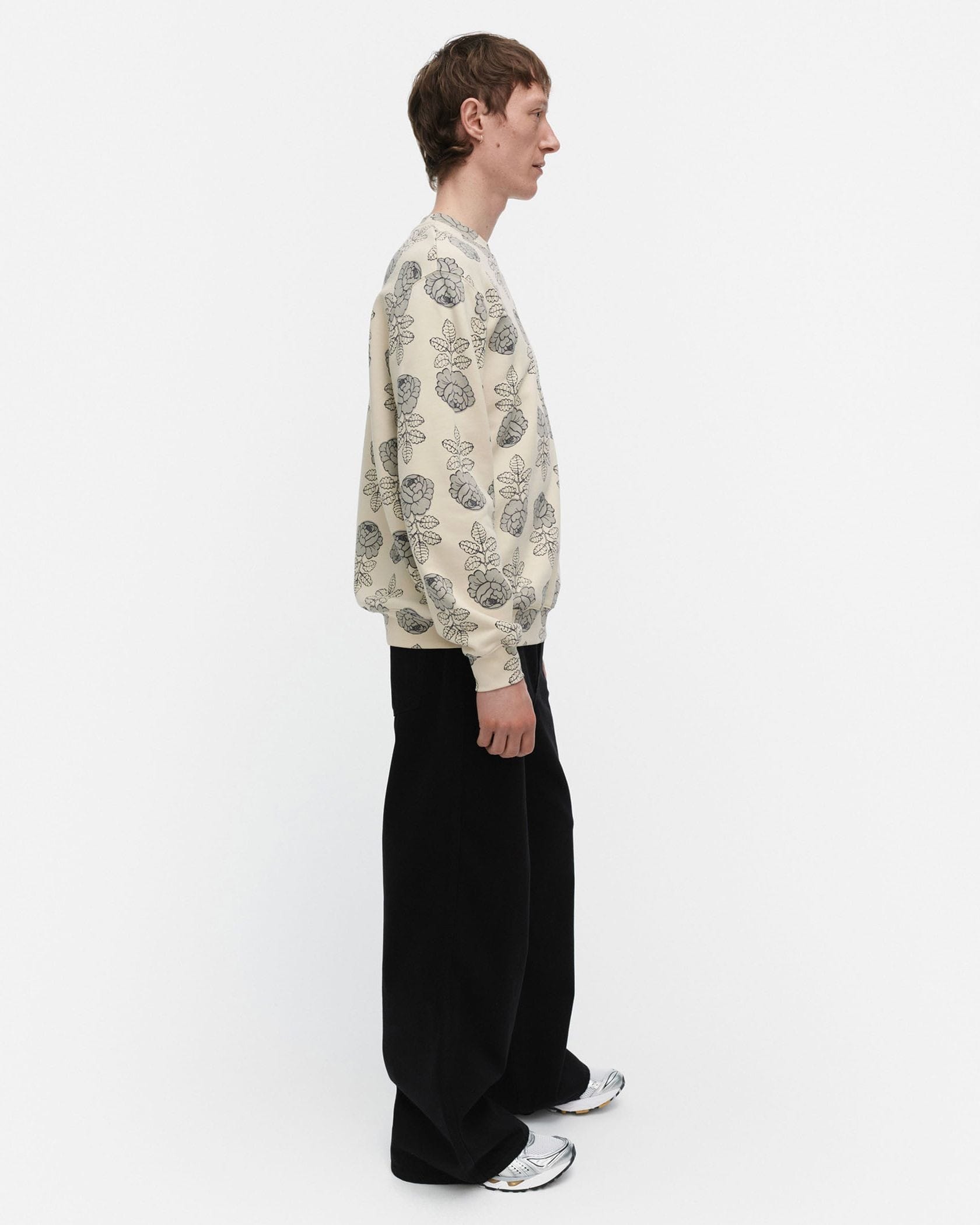 瞬時に着こなしがサマになる花柄スウェットトップス。適度にゆるりとしたシルエットで、リラックスしたスタイリングが可能に。気負わずにモード感を演出したい日にもおすすめの一枚です。