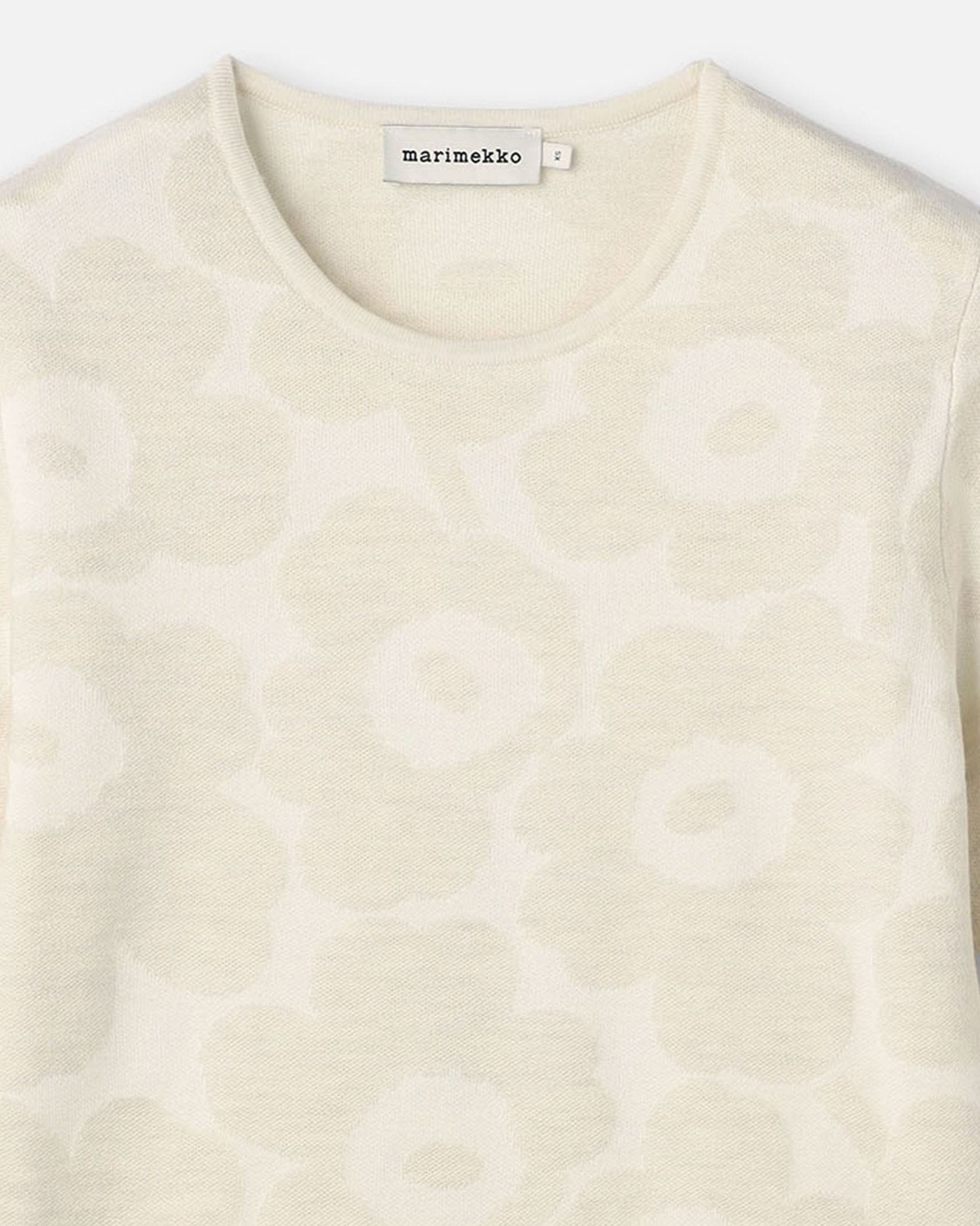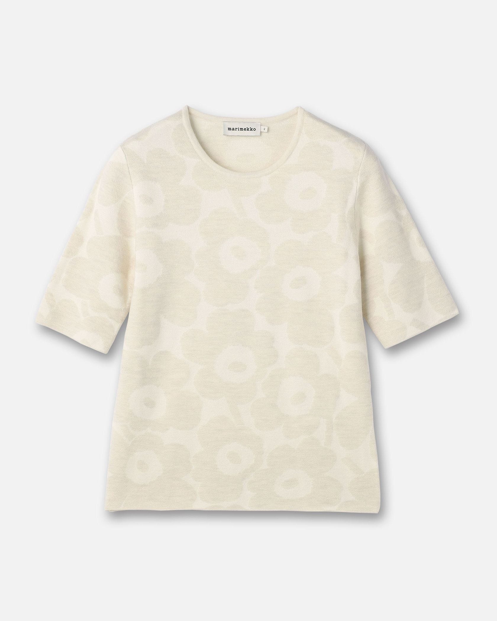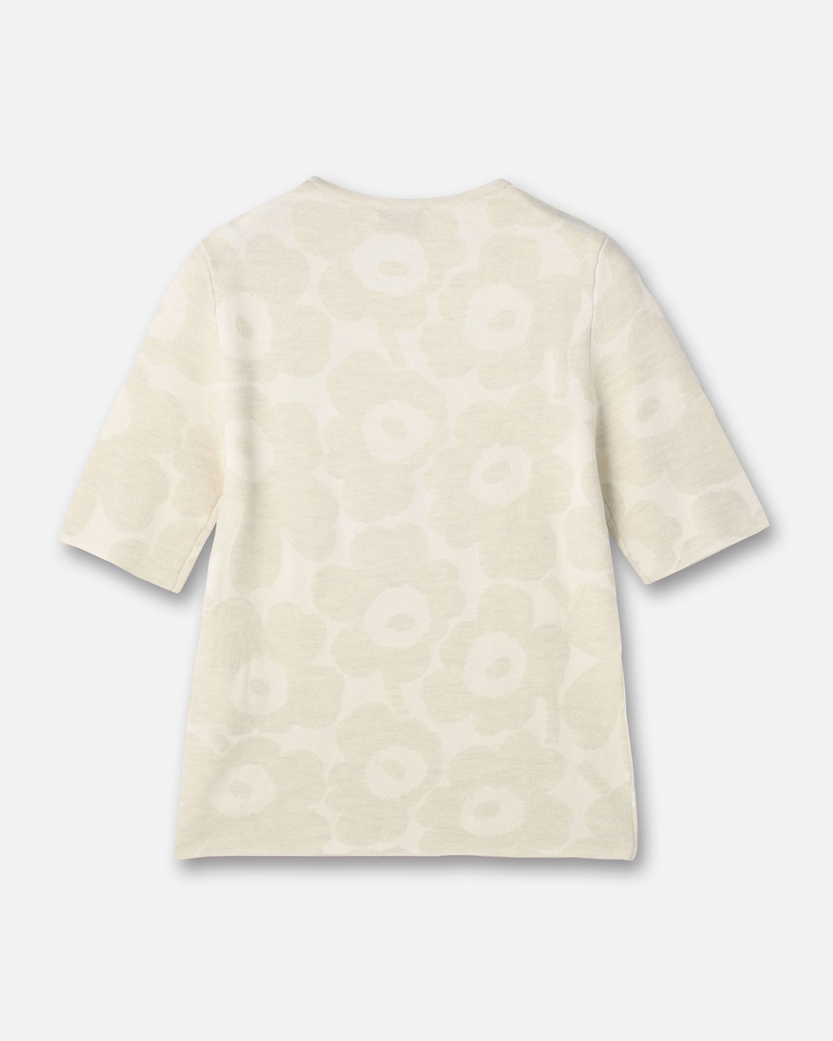 ジャカードで表現した「Unikko」柄が目を惹くクルーネックニットです。暖房の効いた室内で重宝する半袖タイプ。羽織物をプラスして体温調整ができ、ジャケットのインナーなどにも活躍します。カジュアルなジーンズはもちろん、きれいめなスラックス合わせも雰囲気が変わっておすすめです。