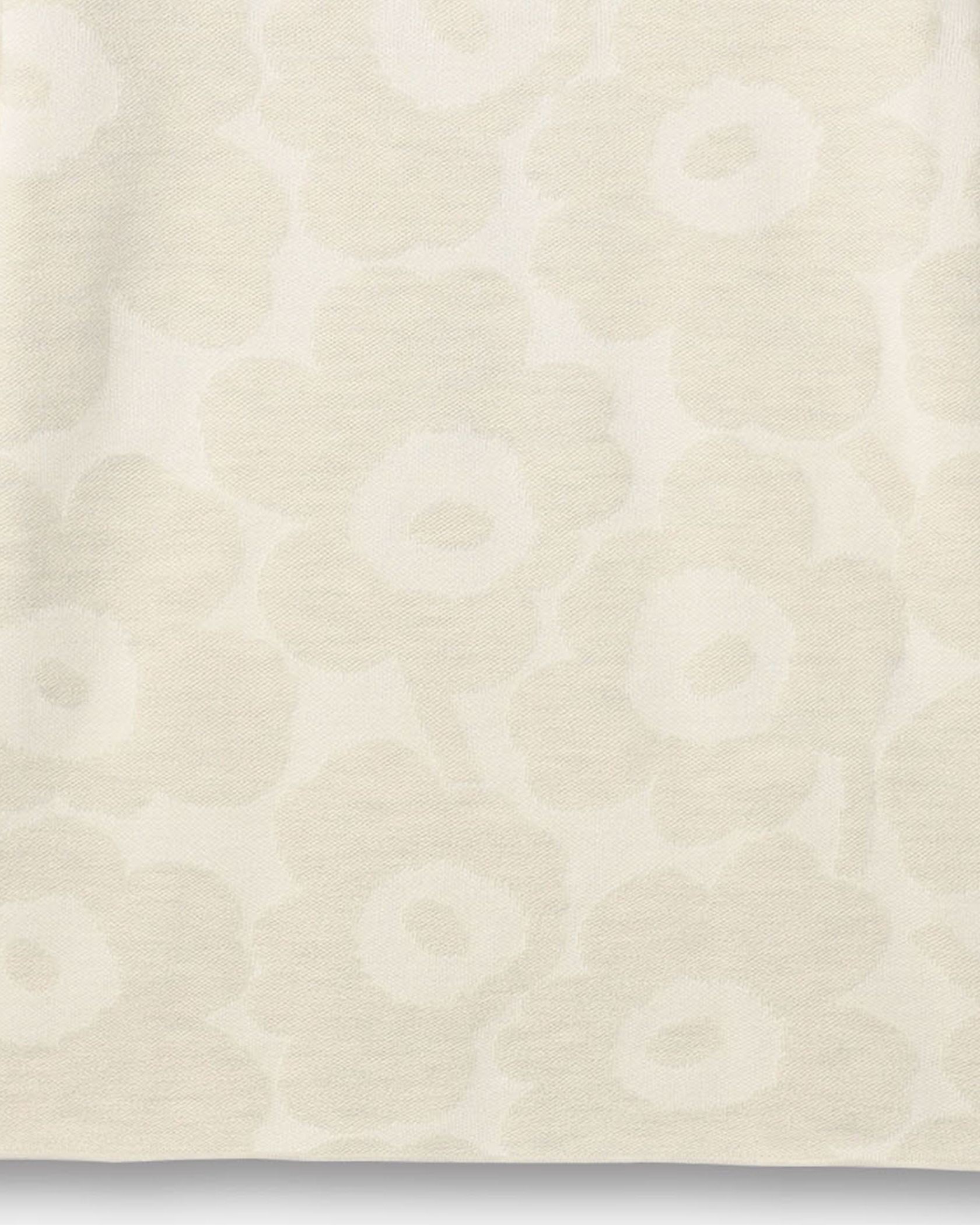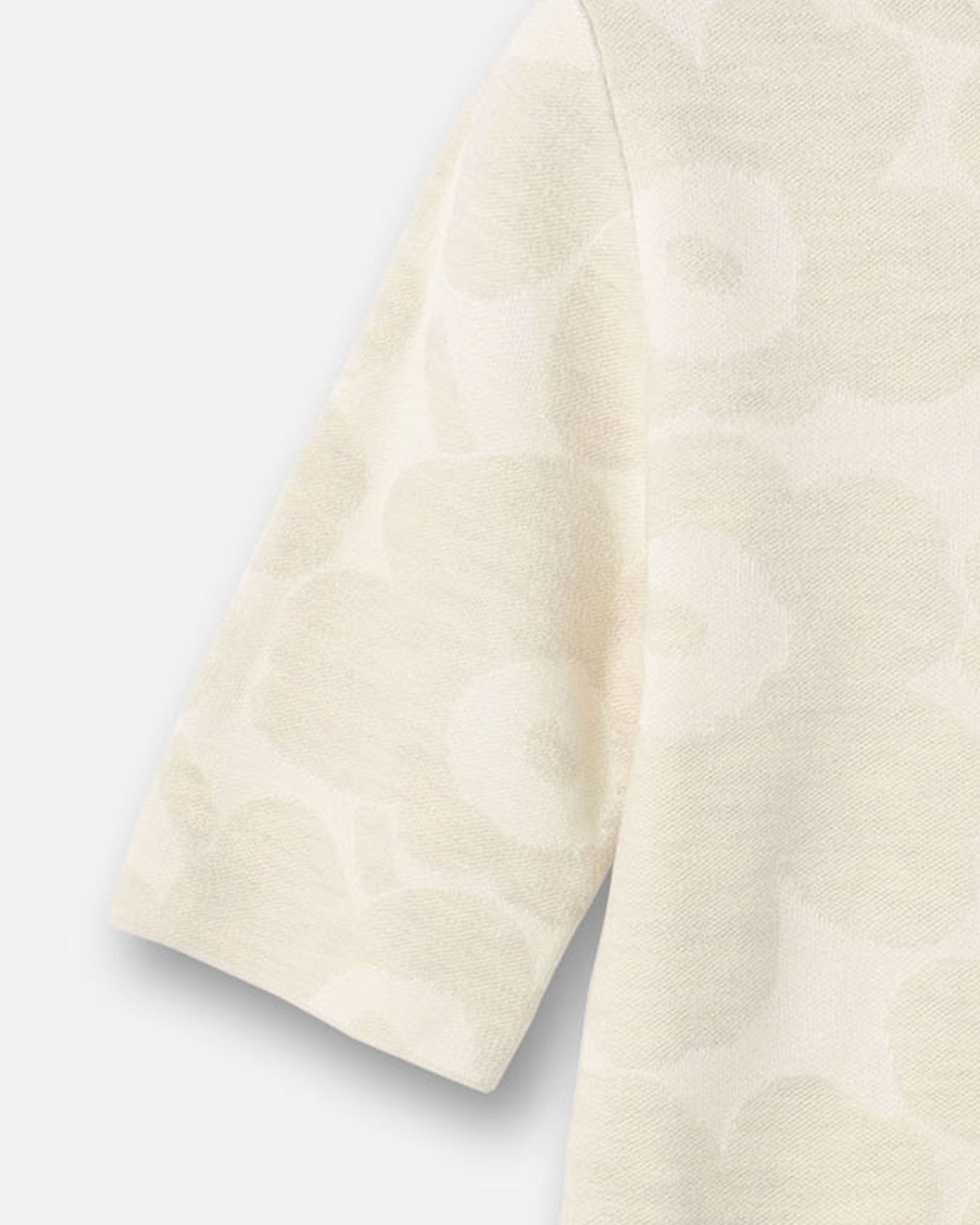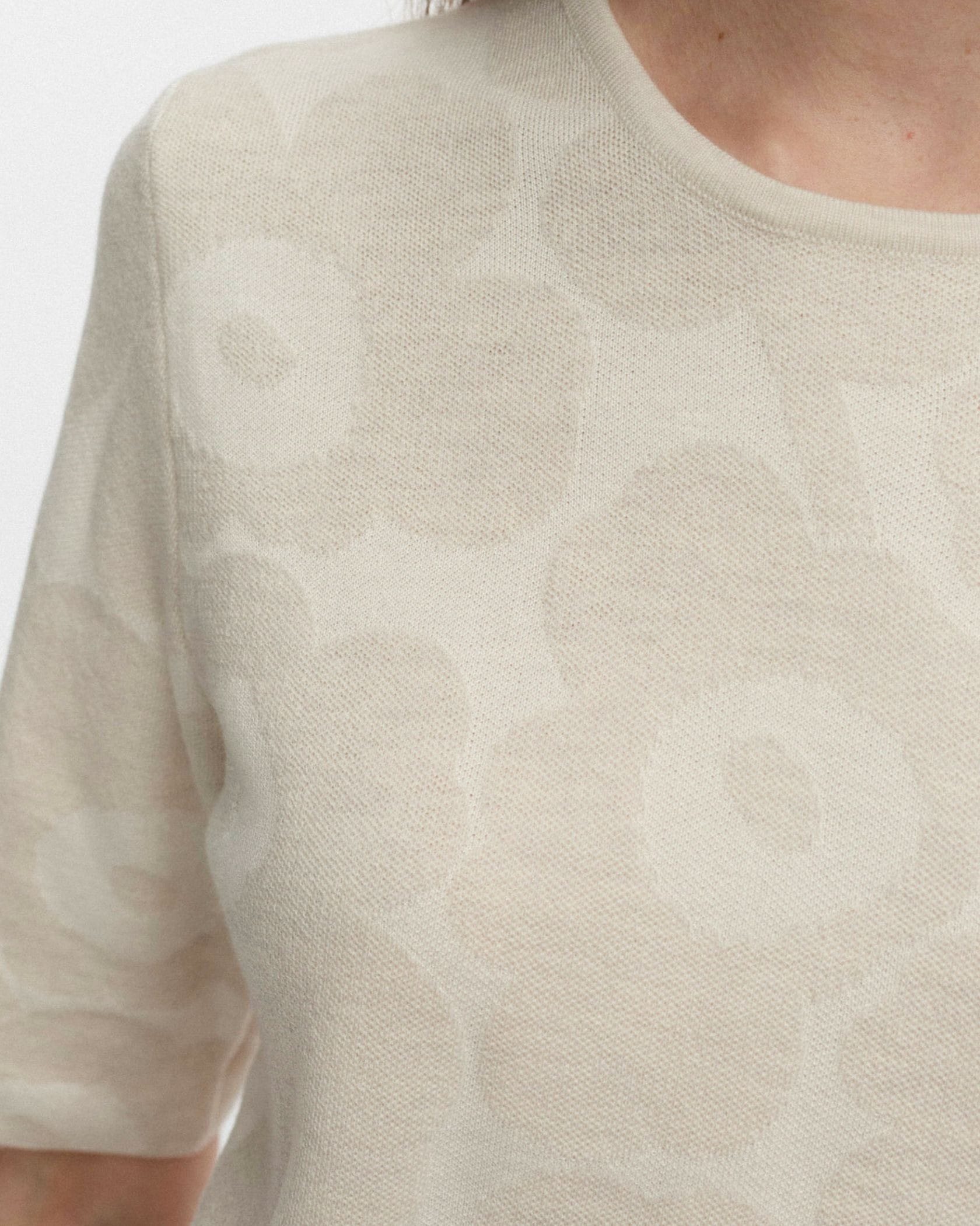 ジャカードで表現した「Unikko」柄が目を惹くクルーネックニットです。暖房の効いた室内で重宝する半袖タイプ。羽織物をプラスして体温調整ができ、ジャケットのインナーなどにも活躍します。カジュアルなジーンズはもちろん、きれいめなスラックス合わせも雰囲気が変わっておすすめです。
