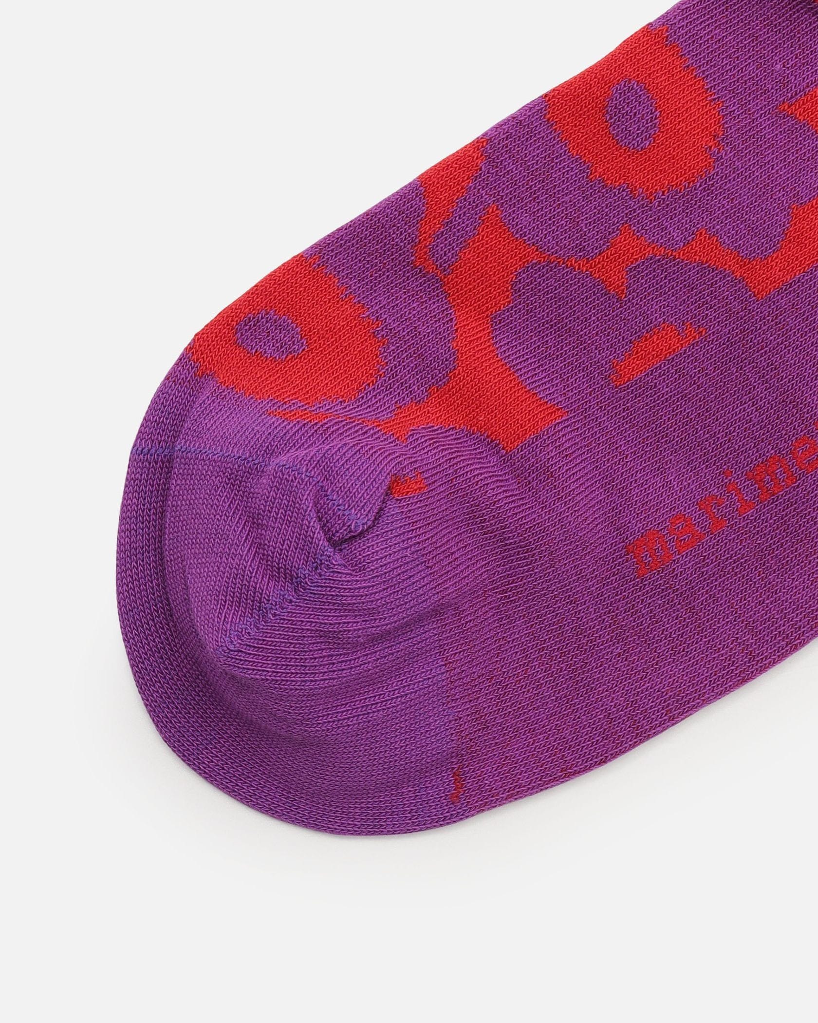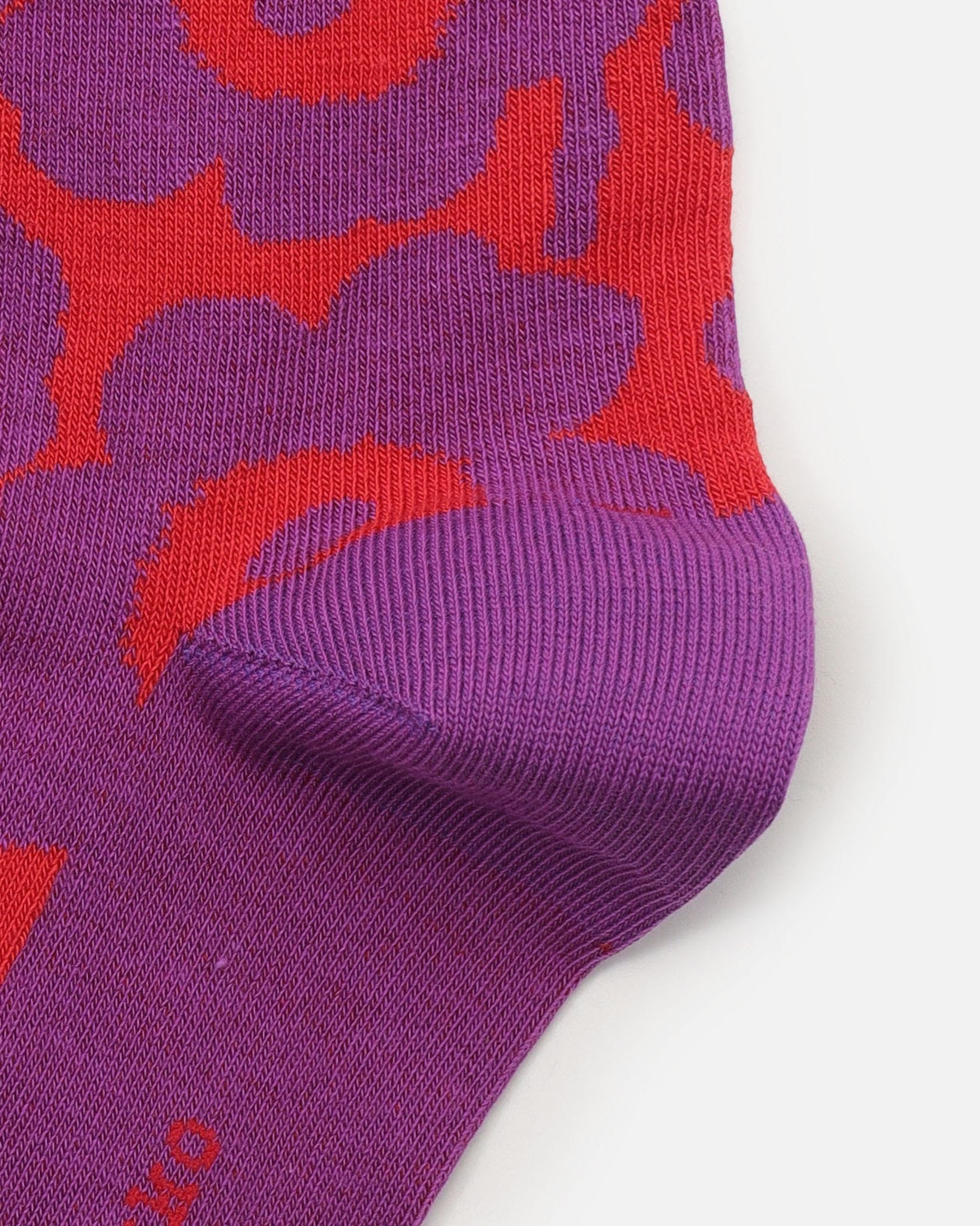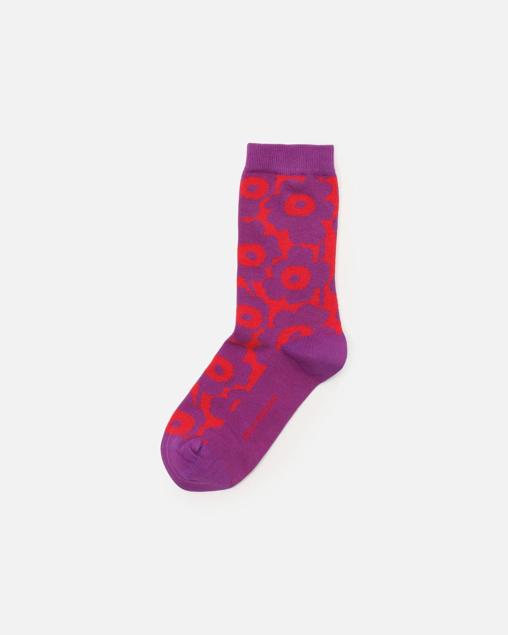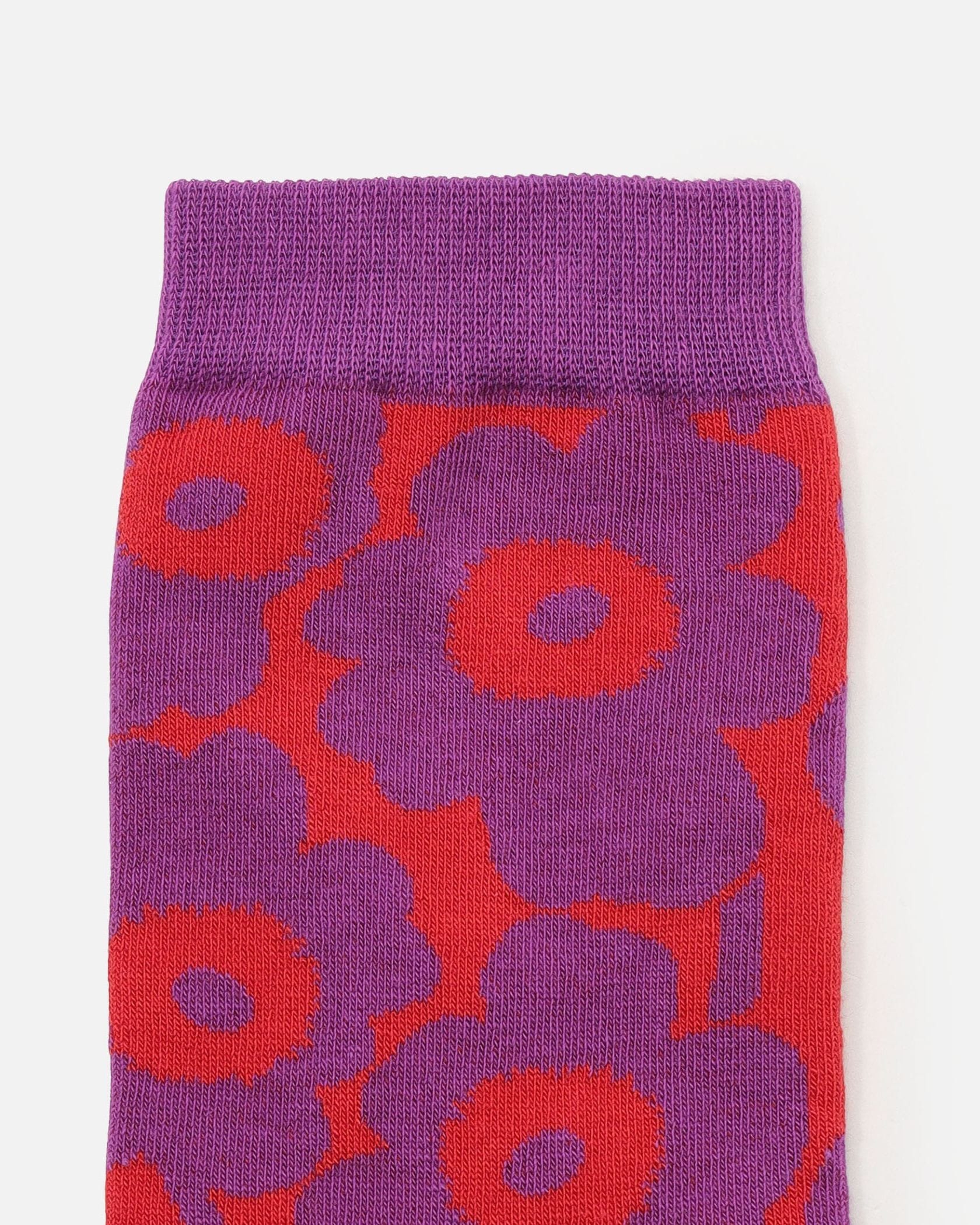 足もとも抜かりなくお洒落に仕上げる、「Unikko」柄のソックス。Marimekkoらしい新鮮なカラーコンビネーションで、さりげなくパンツの裾から覗かせるとポイントになります。スカートスタイルで、スニーカーやローファーに合わせるのもおすすめ。ソックスは日常に気軽に取り入れられ、ちょっとしたギフトにも喜ばれます。