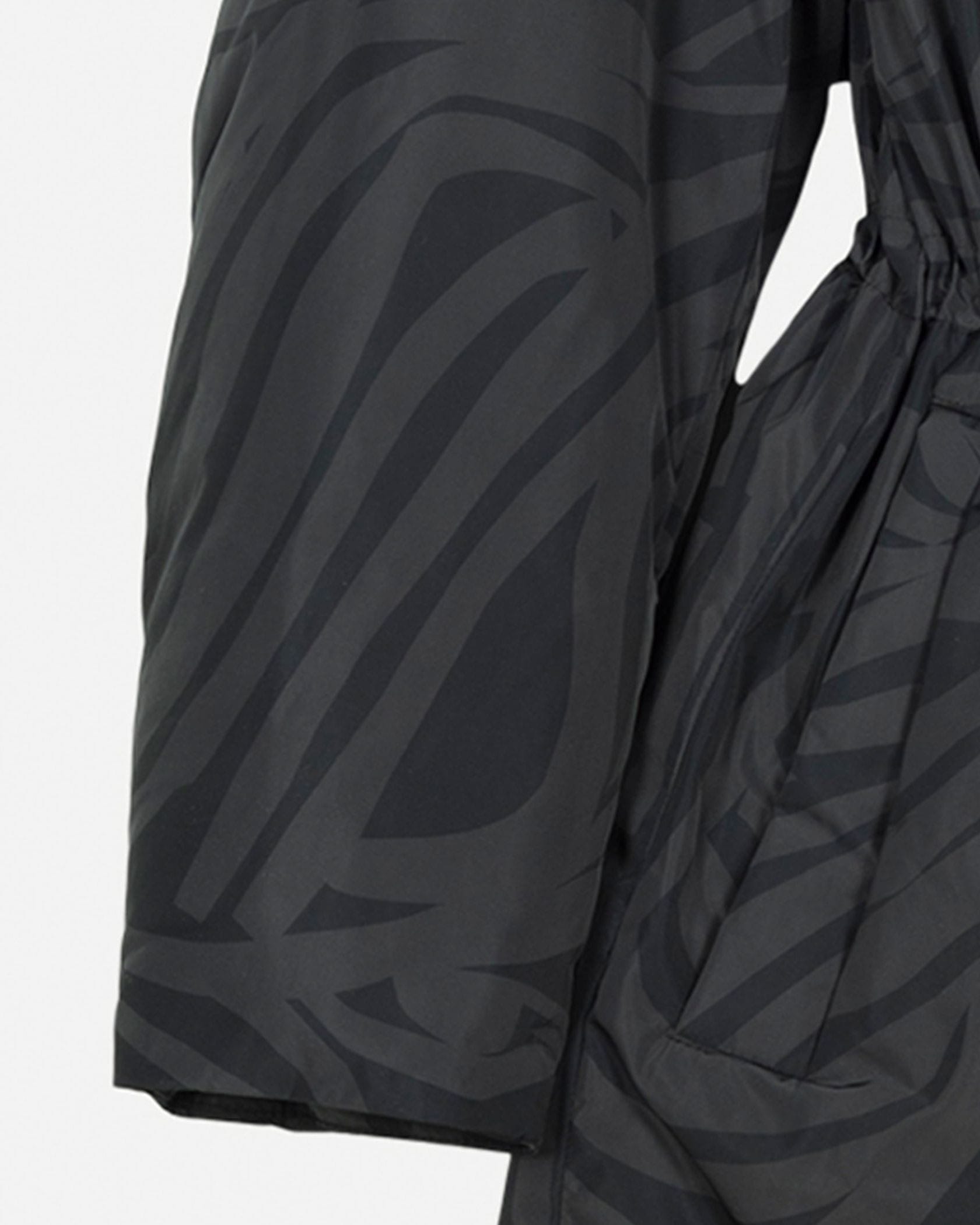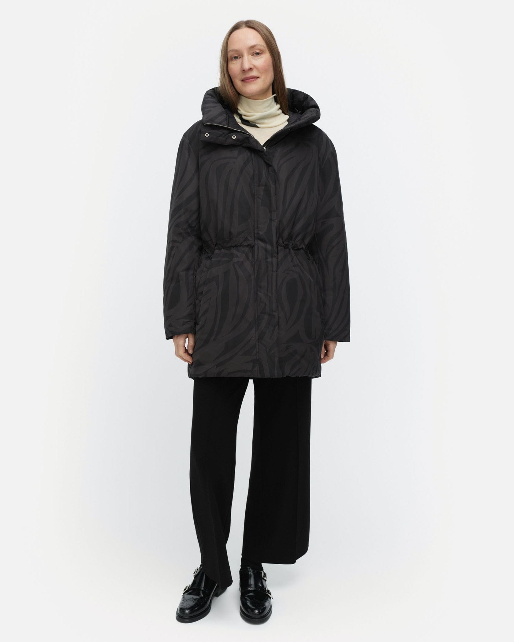 モダンな縞模様が印象的なJokuraita柄のダウンコート。表面にダウンステッチのない洗練されたデザインで、カジュアルからキレイめまで幅広い着こなしと相性のよいアイテムです。大きく立体的なフードはお顔まわりを華やかに演出。ウエスト内側にドローストリングが通っているためシルエットのアレンジも楽しめます。