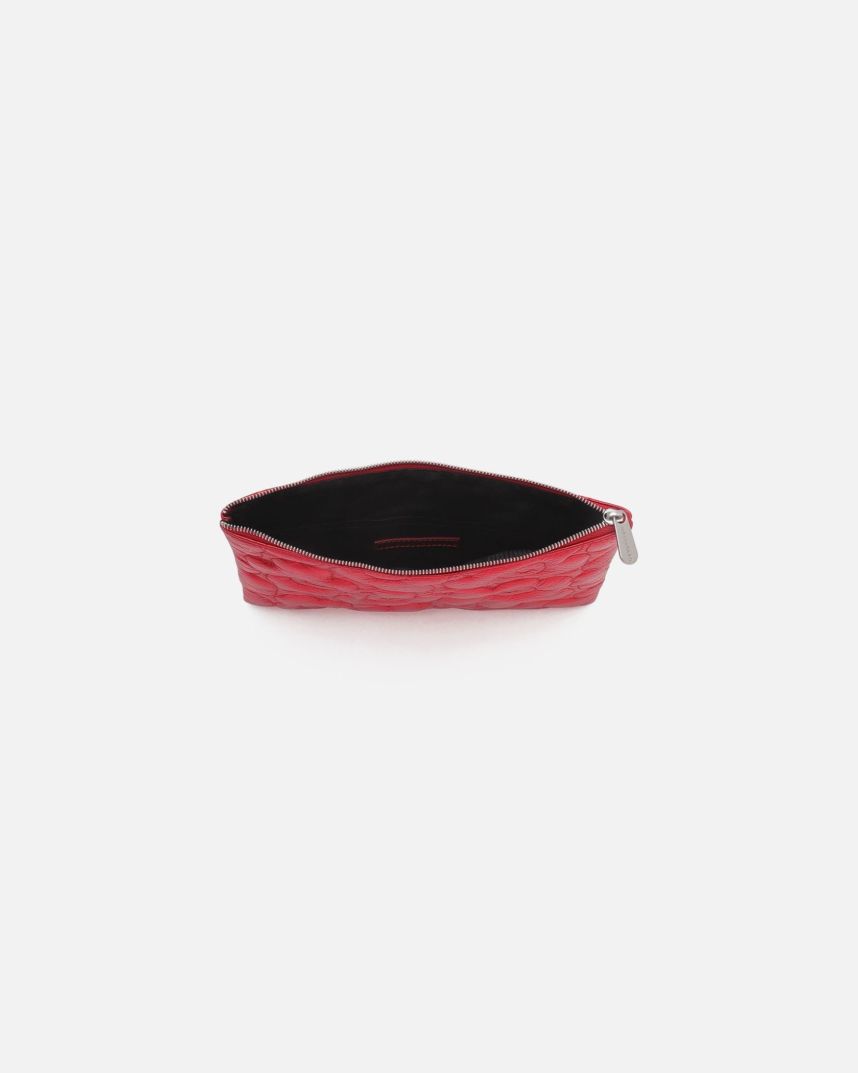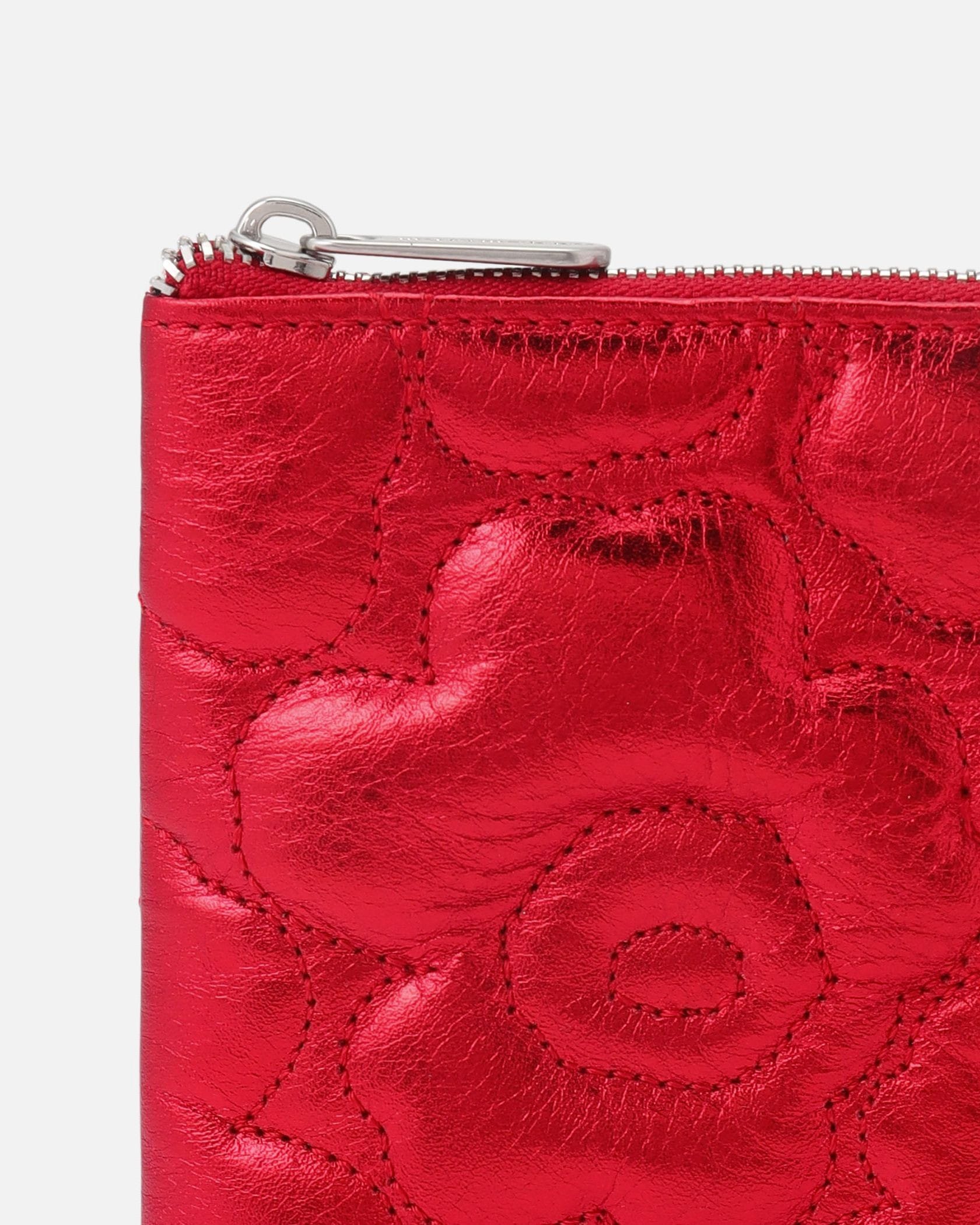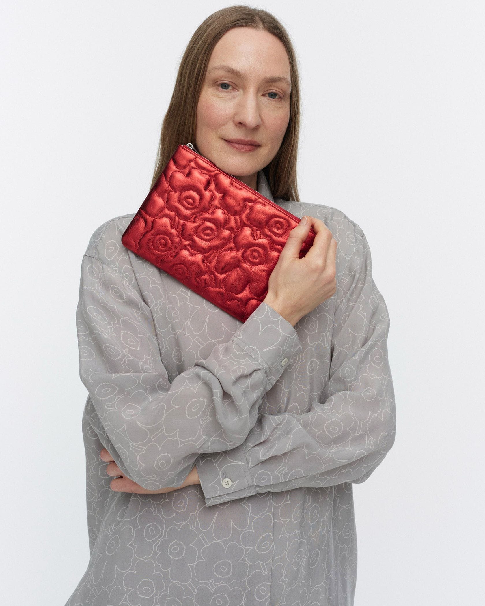 光沢感と凹凸のあるUnikko柄のレザーがエレガントなクラッチバッグ。すっきりしたスクエア型で、使い勝手の良い一品です。華やぎのあるデザインは、ギフトにもおすすめです。