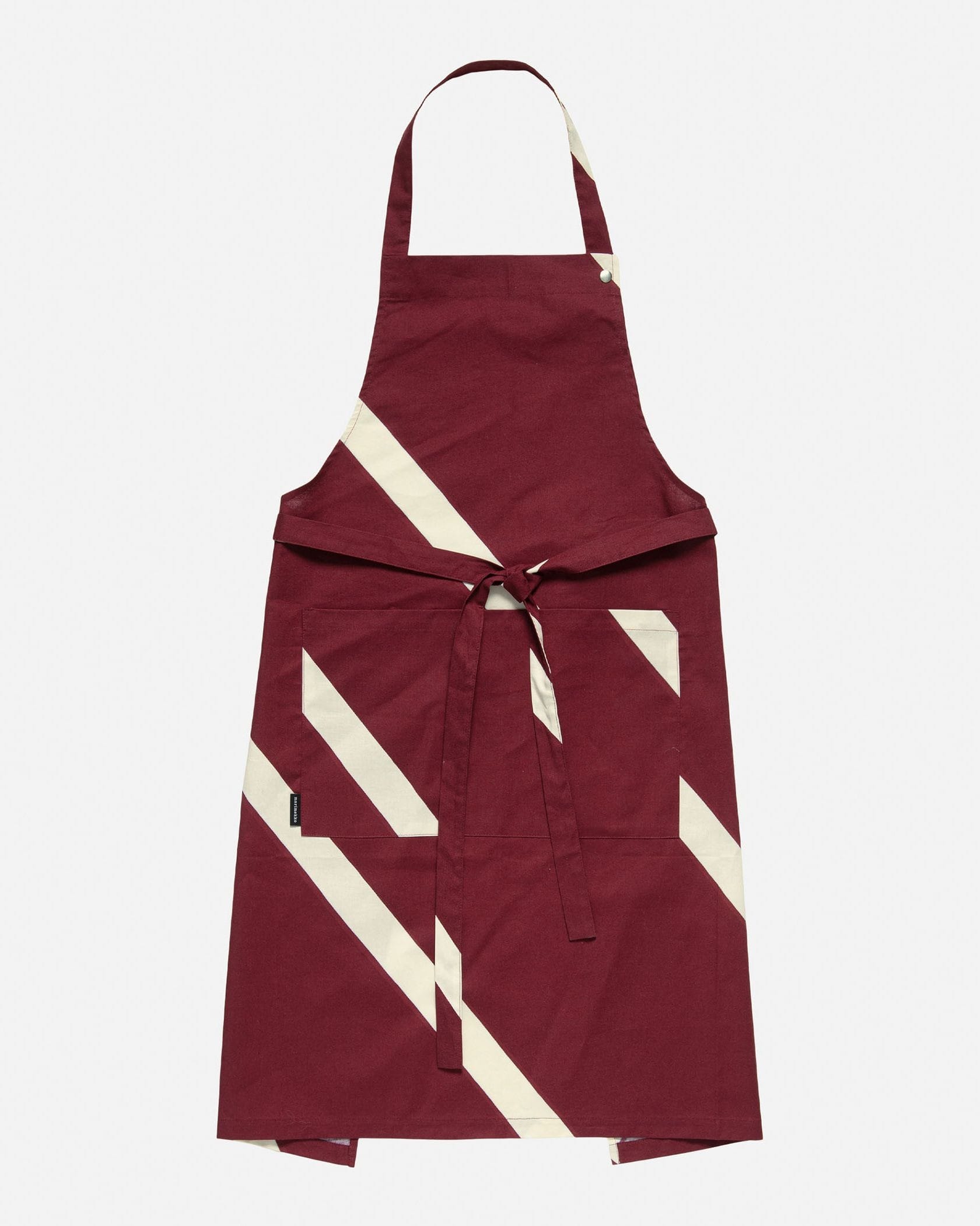 インパクトのある斜めストライプ柄がスタイリッシュなデザインのエプロン。フロントの大きなポケットの端にはブランドロゴタグがさりげないアクセント。長さ調整可能なスナップボタン、ウエスト紐付き、ゆとりのあるシルエットで簡単に着こなせます。スタイリングしやすい落ち着いたカラーでデイリーに活躍します。