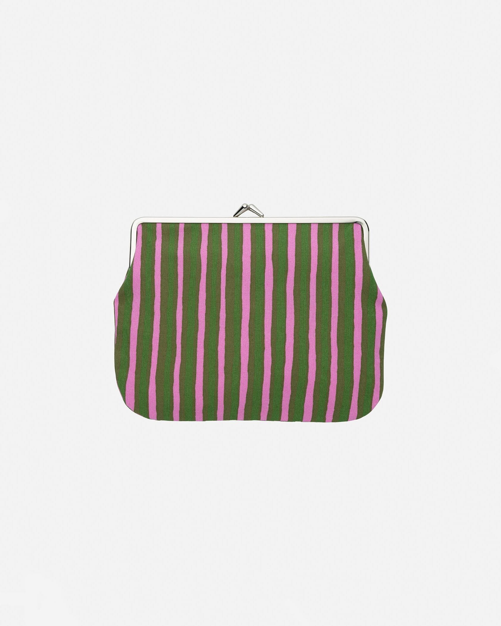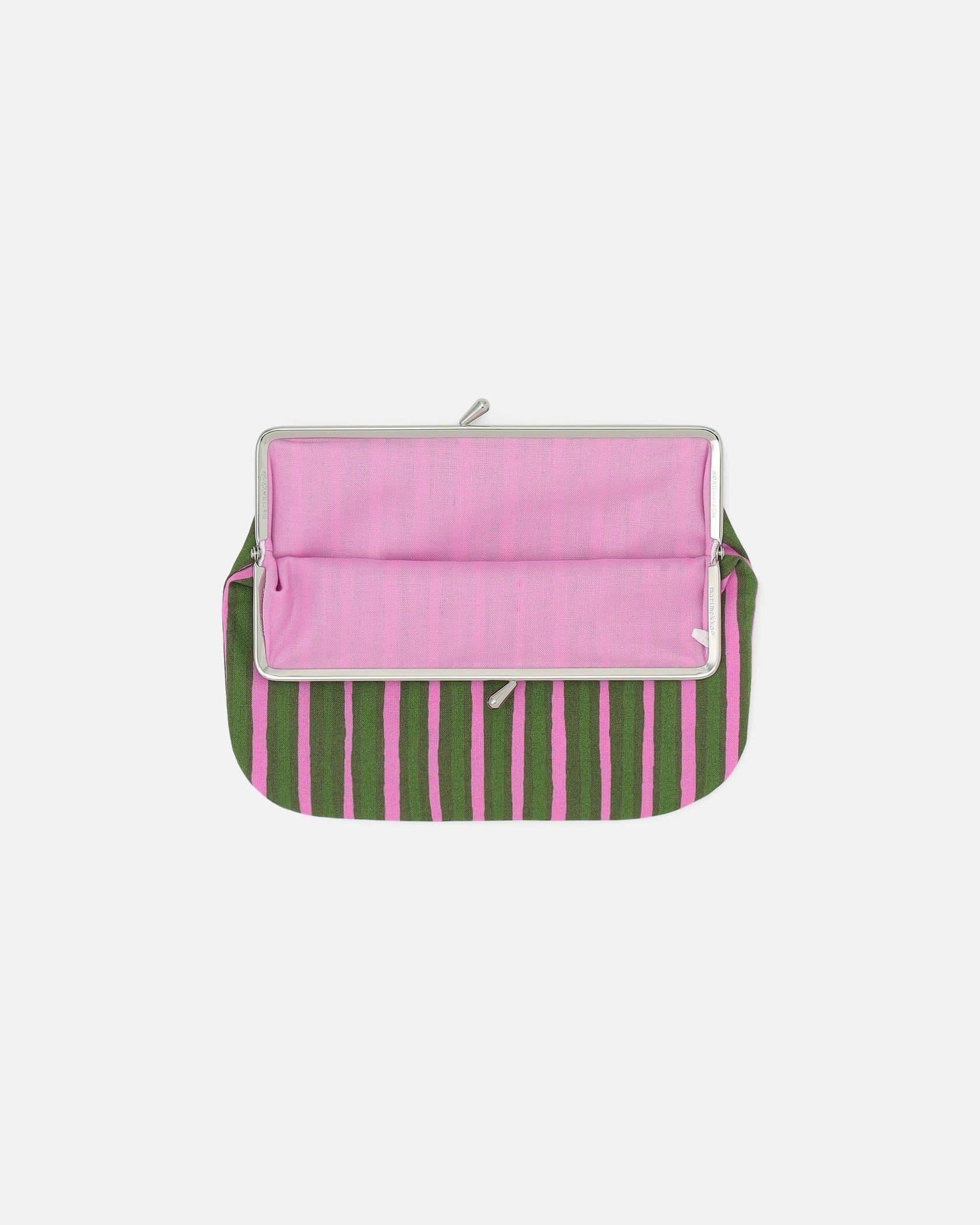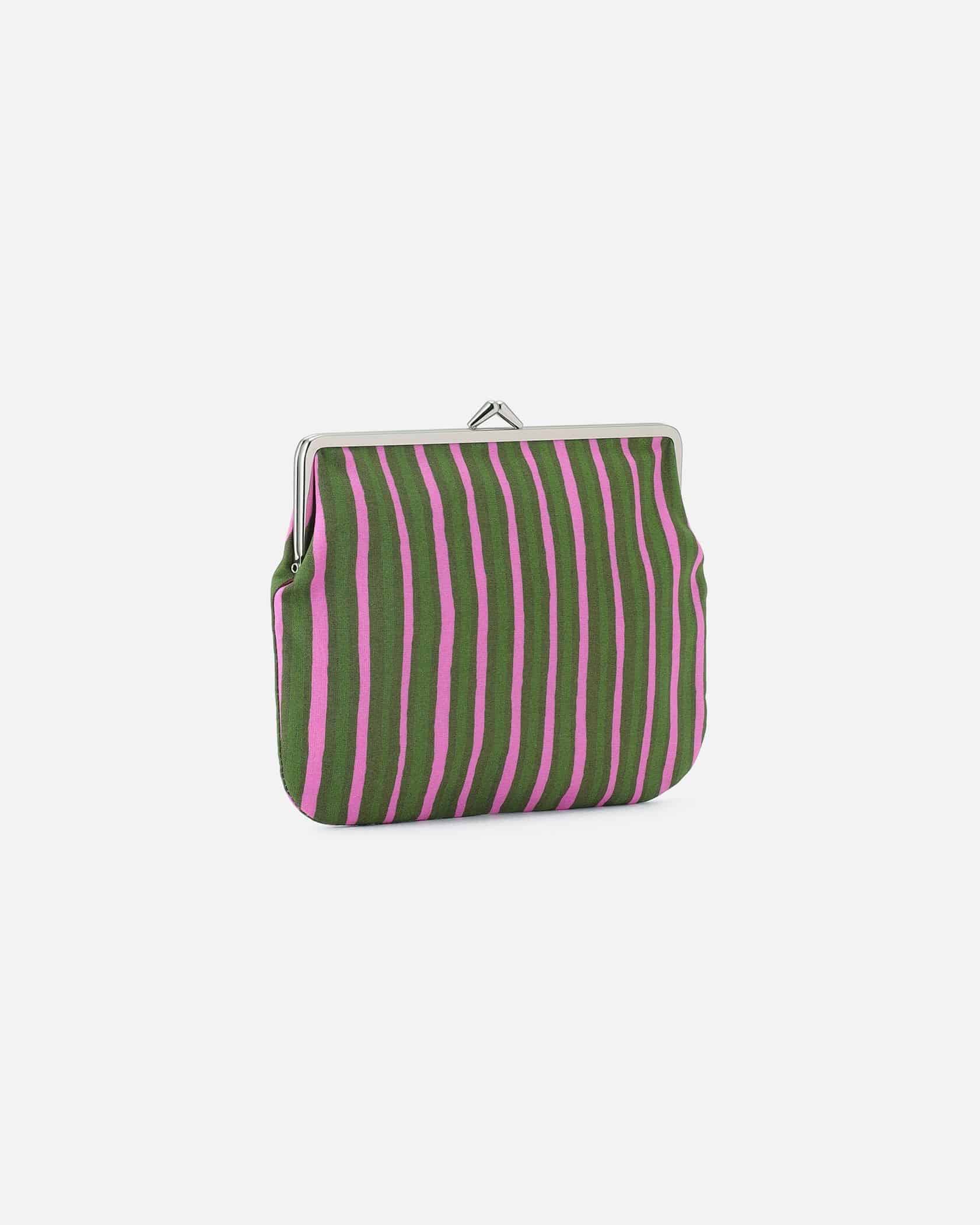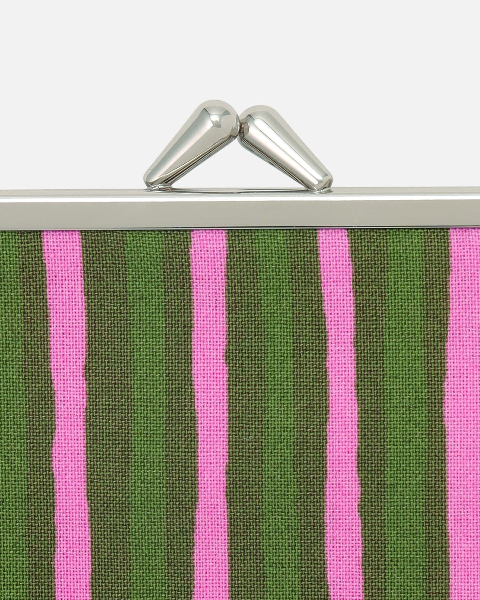 ビビッドカラーのストライプ柄がスタイリッシュなポーチ。メイクポーチとしてはもちろん、バッグの中の仕分けにも活躍しそう。気負わないのにどこかラグジュアリーなデザインで、長く愛用したくなる一品です。