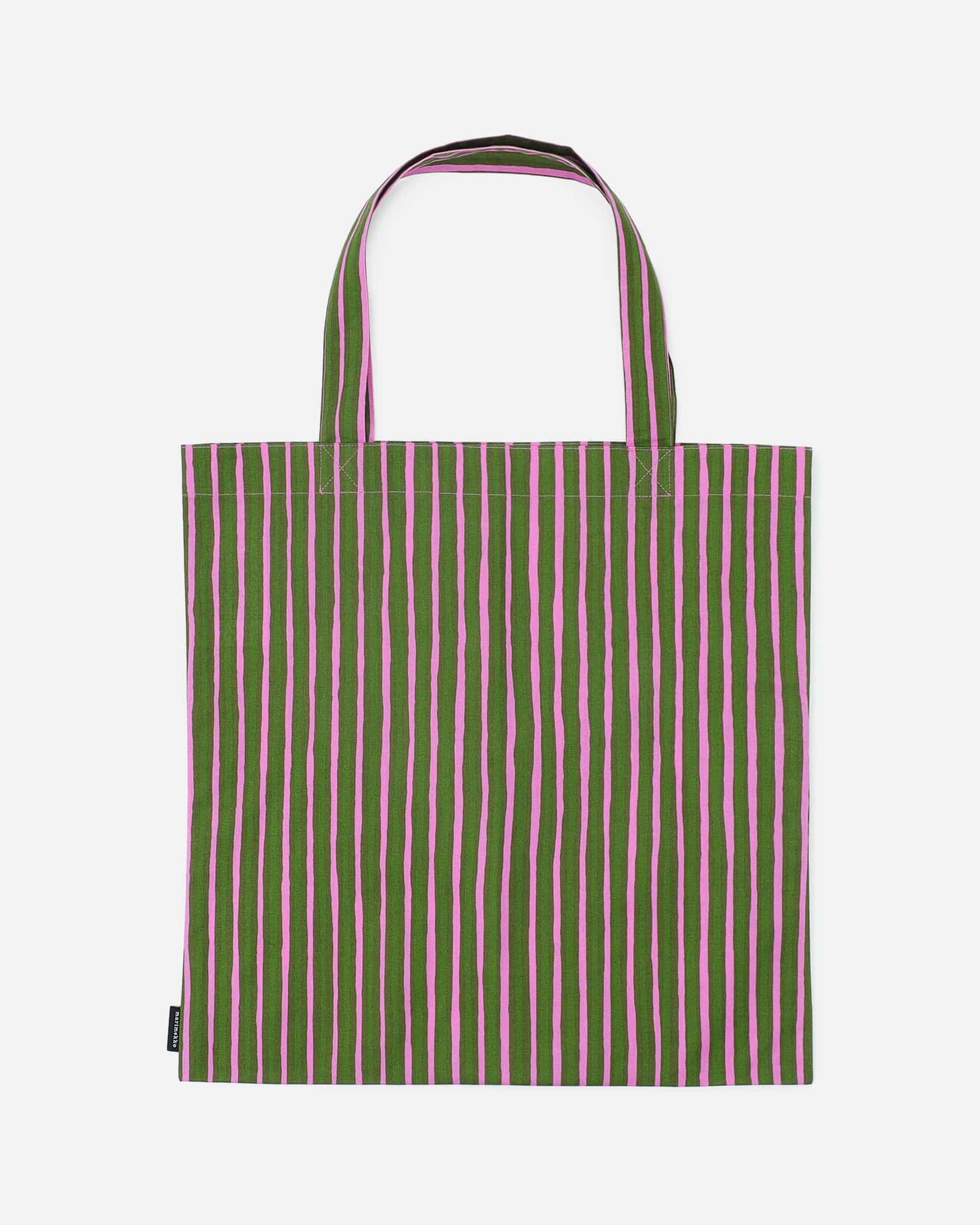 ビビッドなストライプ柄が着こなしのアクセントになるトートバッグ。シンプルなスクエアフォルムは、エコバッグとしてはもちろん書類を入れるのにも便利。ナチュラルなキャンバス素材で耐久性にも優れています。