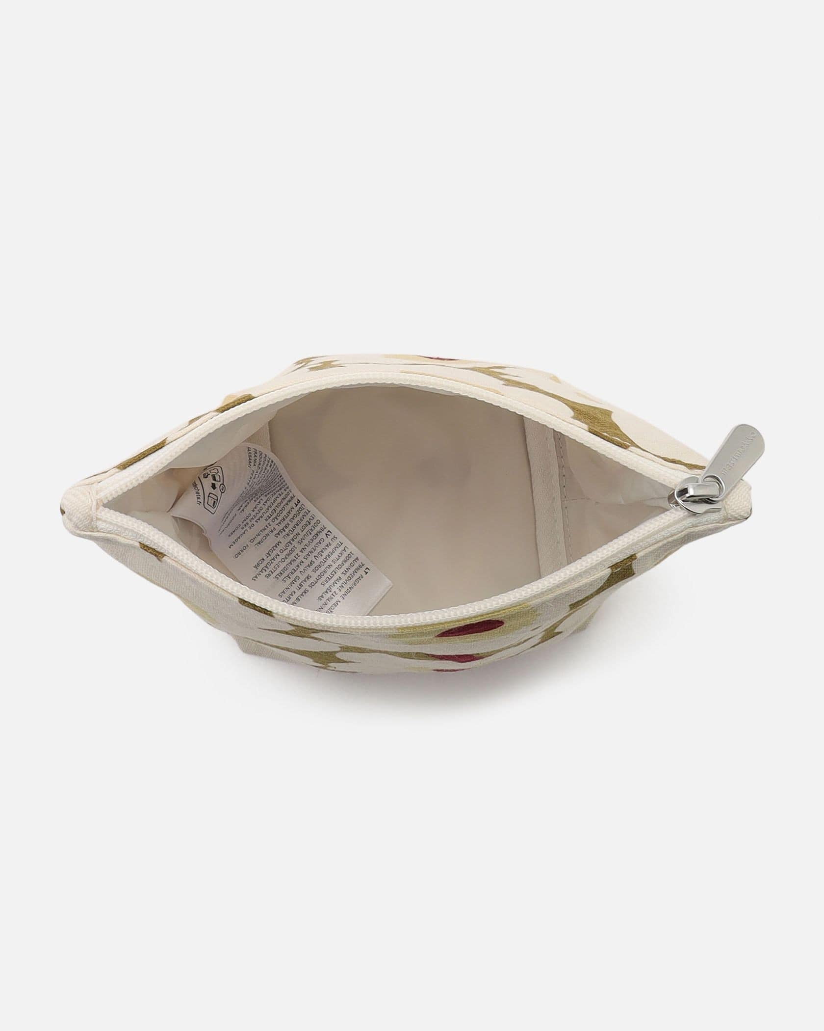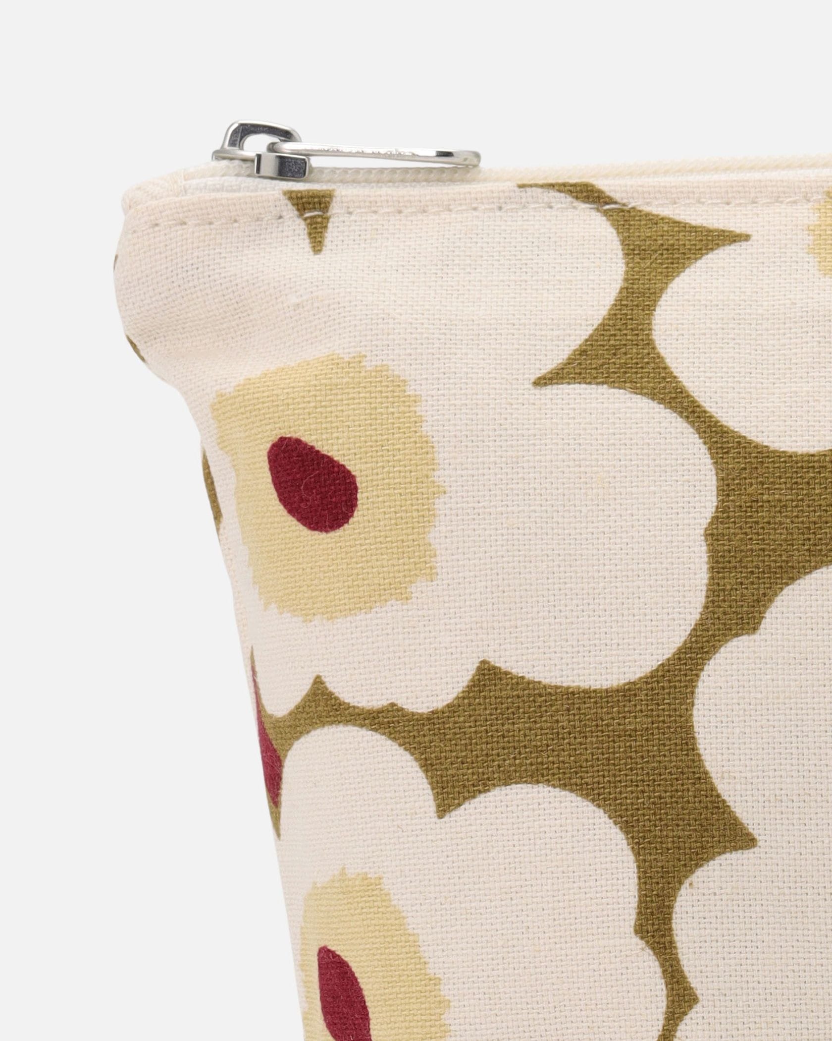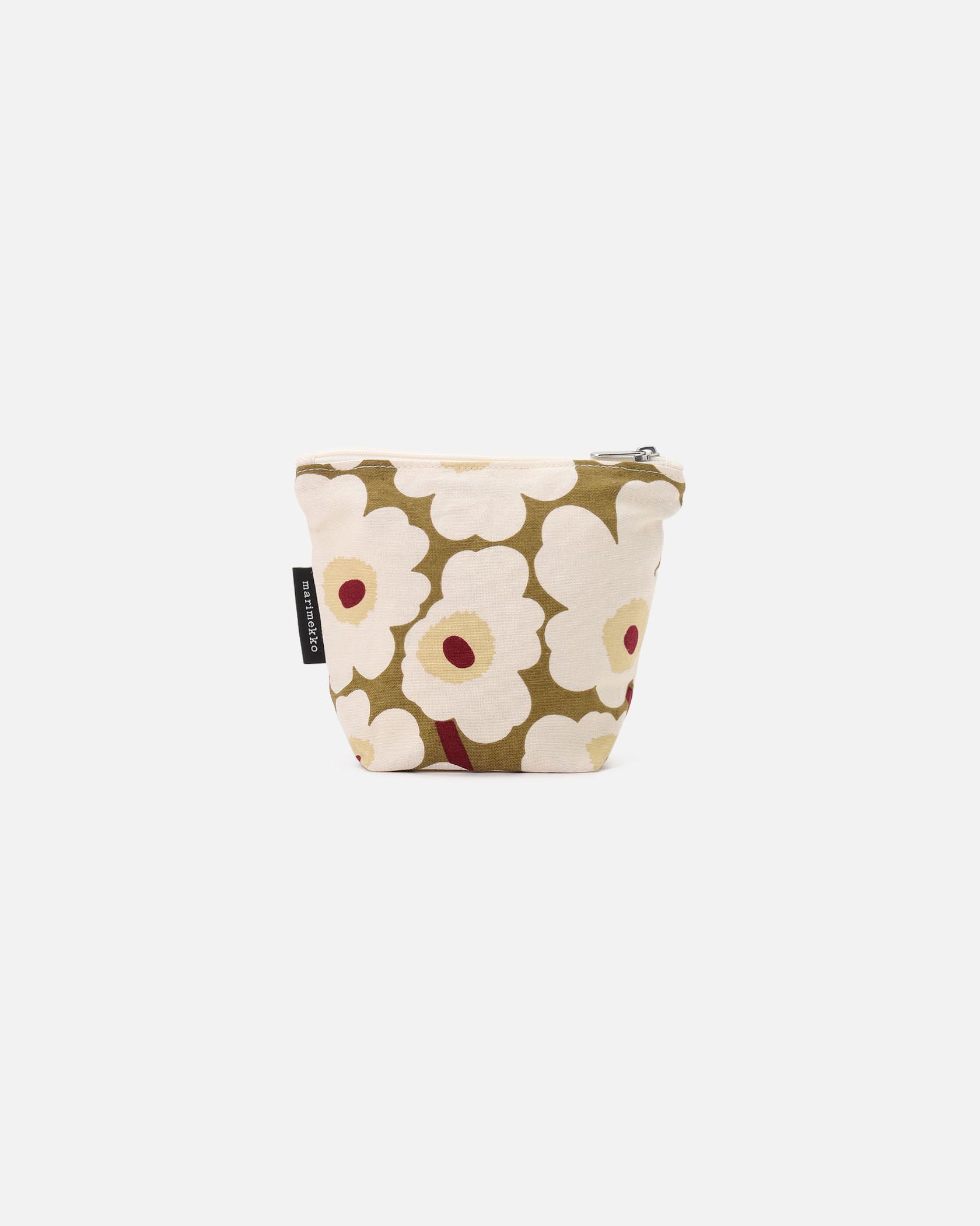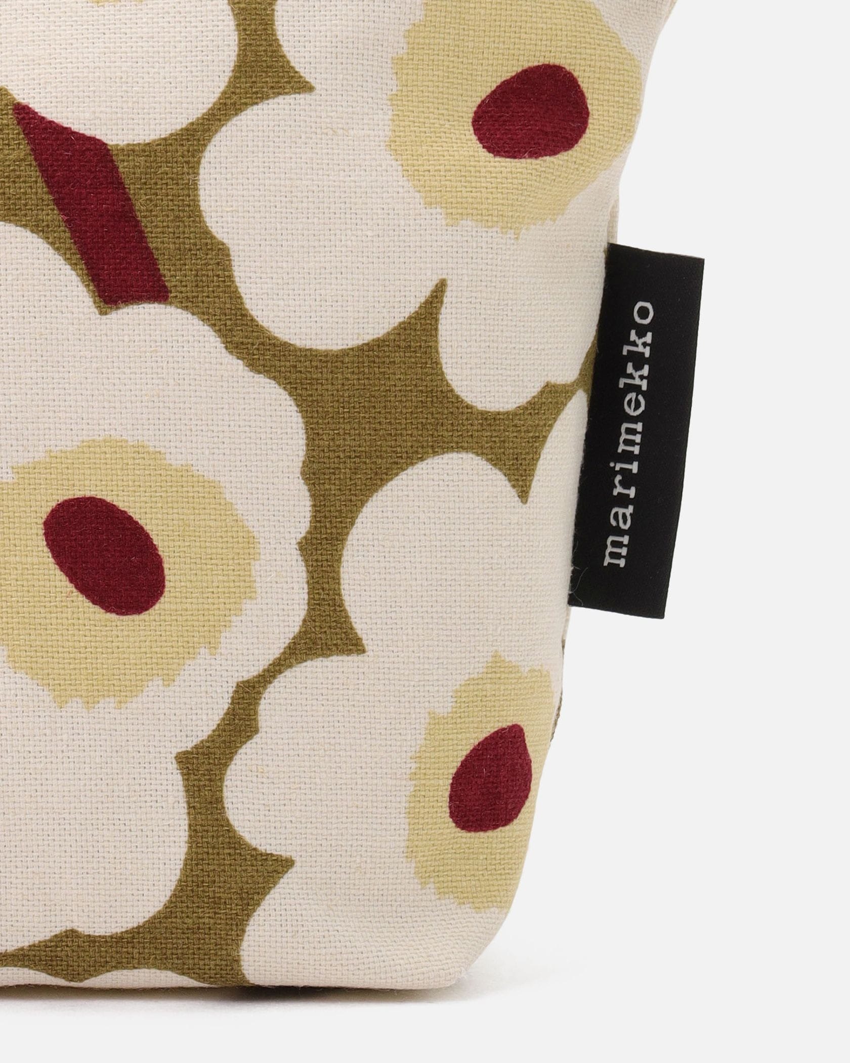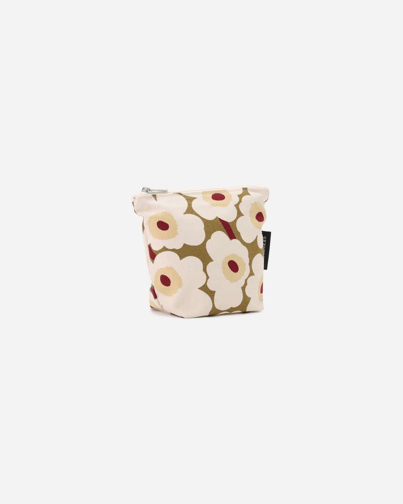 ミニUnikko柄のコスメティックバッグ。フラワーモチーフの総柄が華やかなデザイン。開閉しやすいジッパー仕様、見た目以上の収納力のマチ付き。サイドにはブランドロゴタグがスタイリッシュなアクセント。デイリーに活躍するアイテムです。