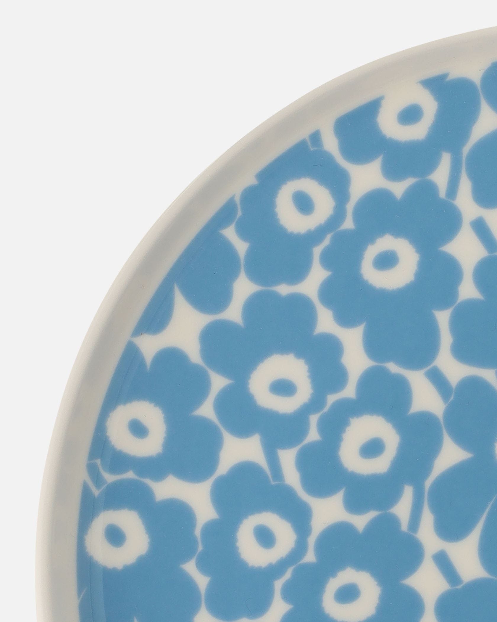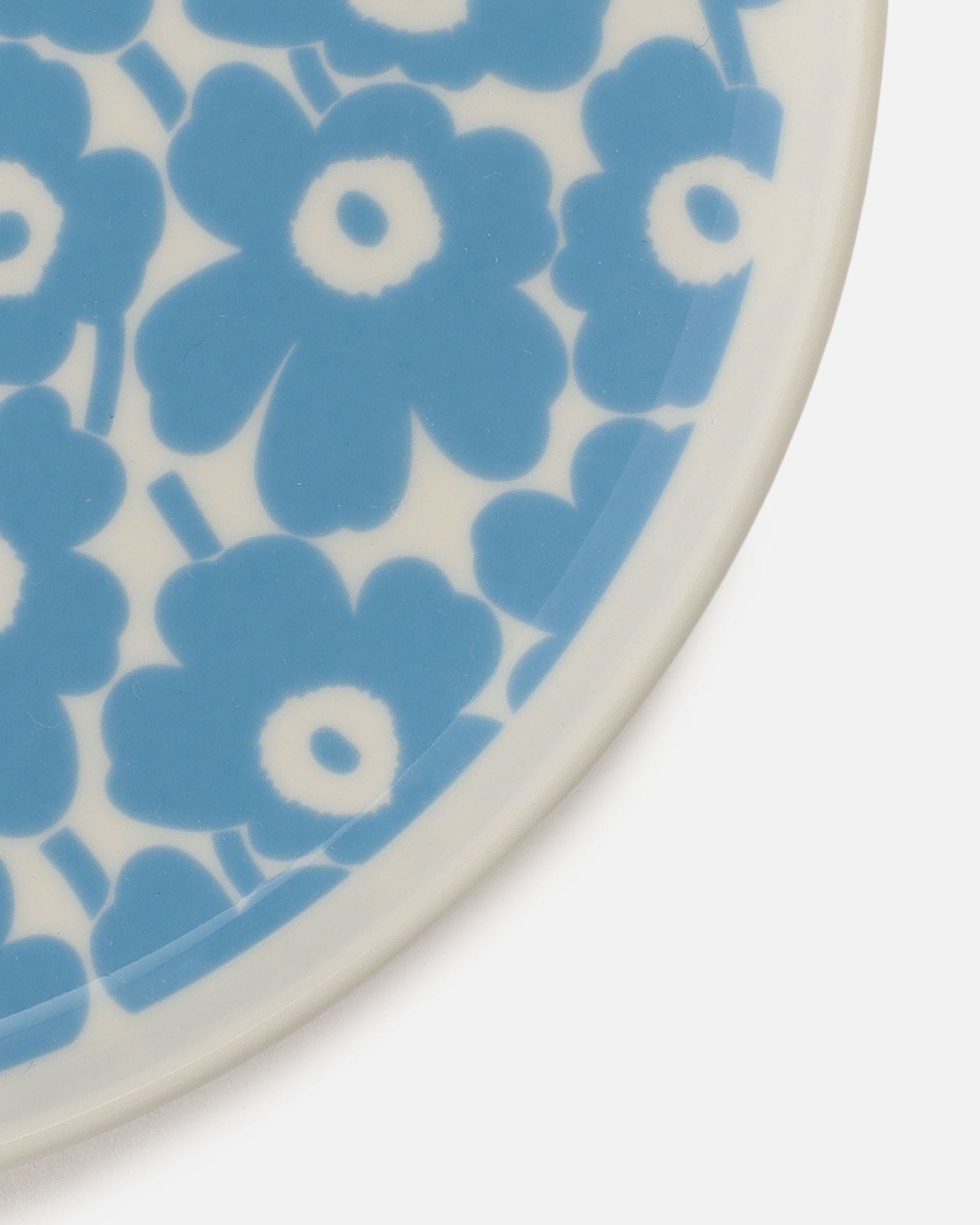 爽やかなライトブルーカラーのUnikko柄をあしらったプレート(20cm)。北欧テイストの花モチーフが食卓を華やかに彩ります。ふちに高さのある使いやすいフォルムは、様々なお料理を盛りつけたり取り皿としても活躍。食洗機や電子レンジなどにも対応し、機能性も抜群。おもてなしやホームパーティにもおすすめです。