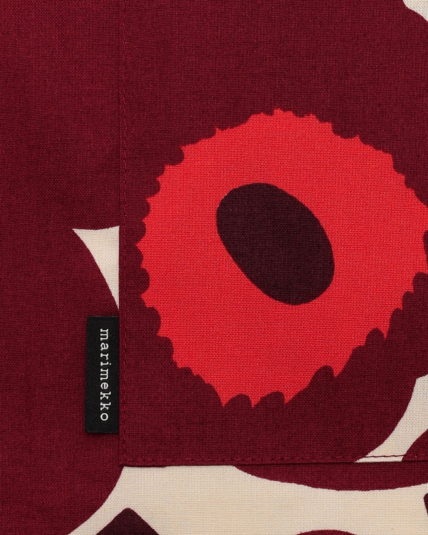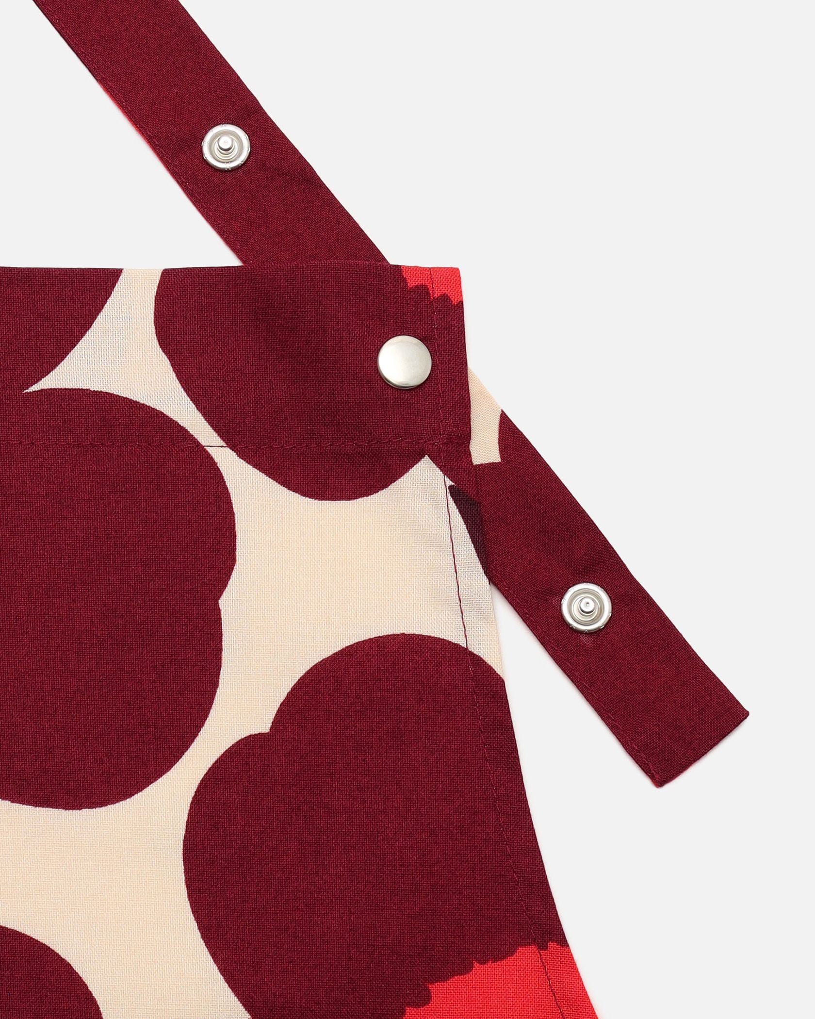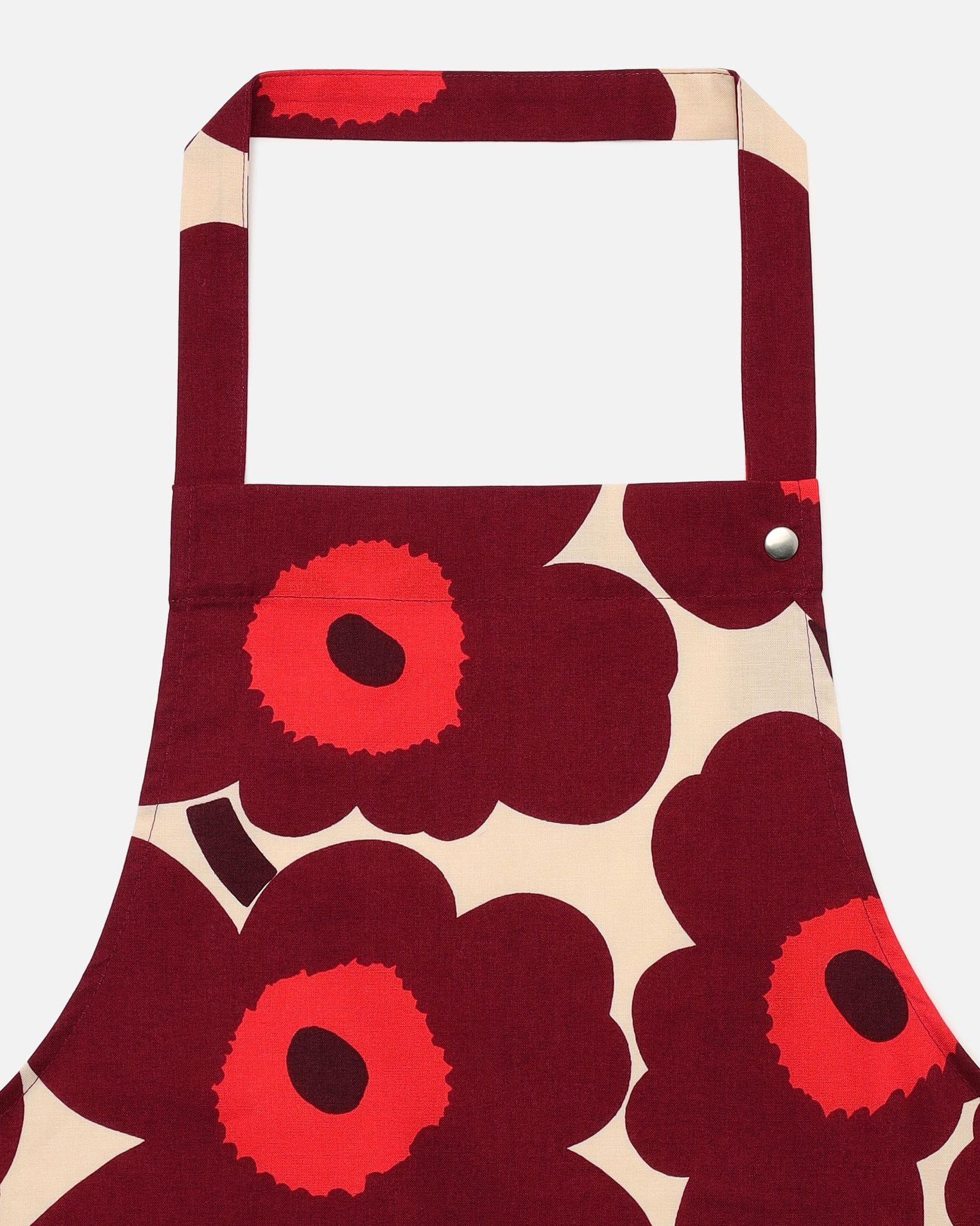 華やかなデザインが楽しい気分にしてくれそうなUnikko柄のエプロン。着脱が簡単な首かけタイプで、ホルターネックは3段階の長さ調節が可能です。大きなフロントポケットがついて実用性も抜群。ご自宅での家事はもちろん、お庭仕事やお料理教室、贈り物などにもおすすめのアイテムです。