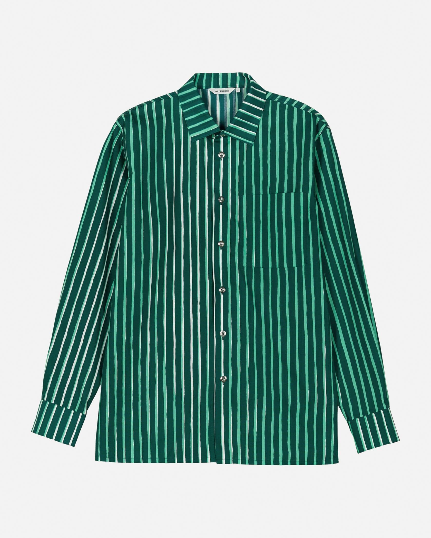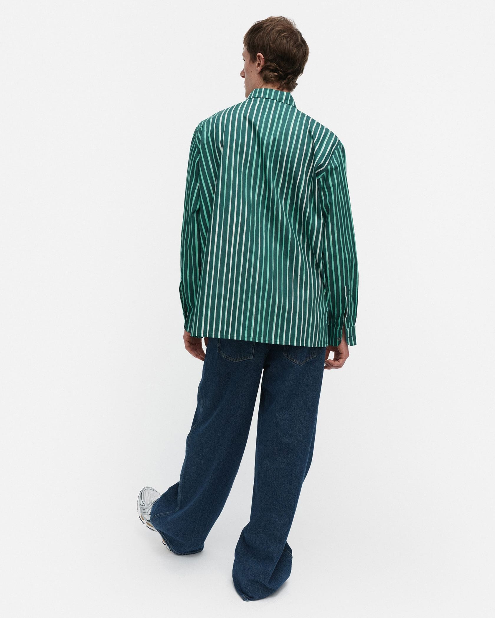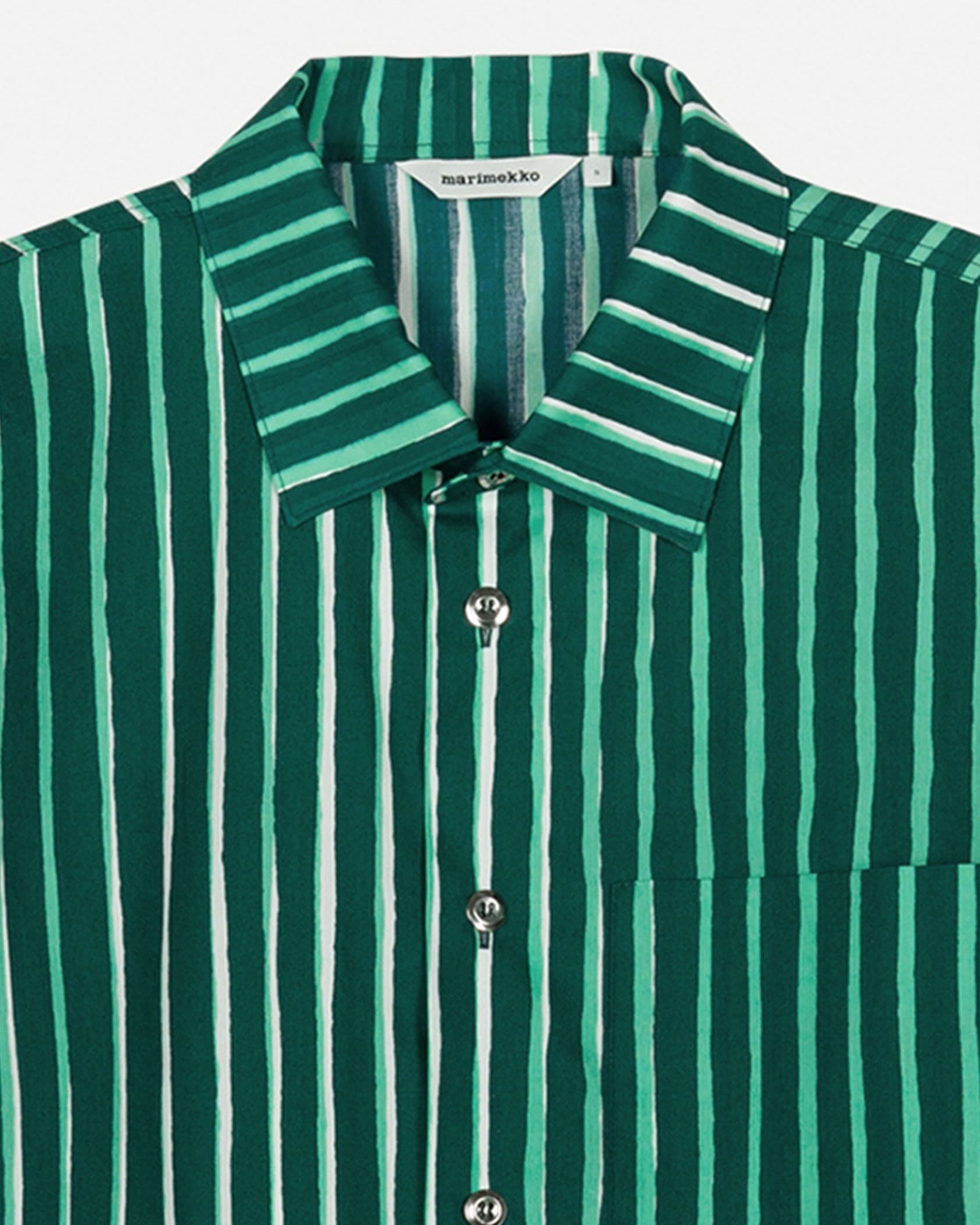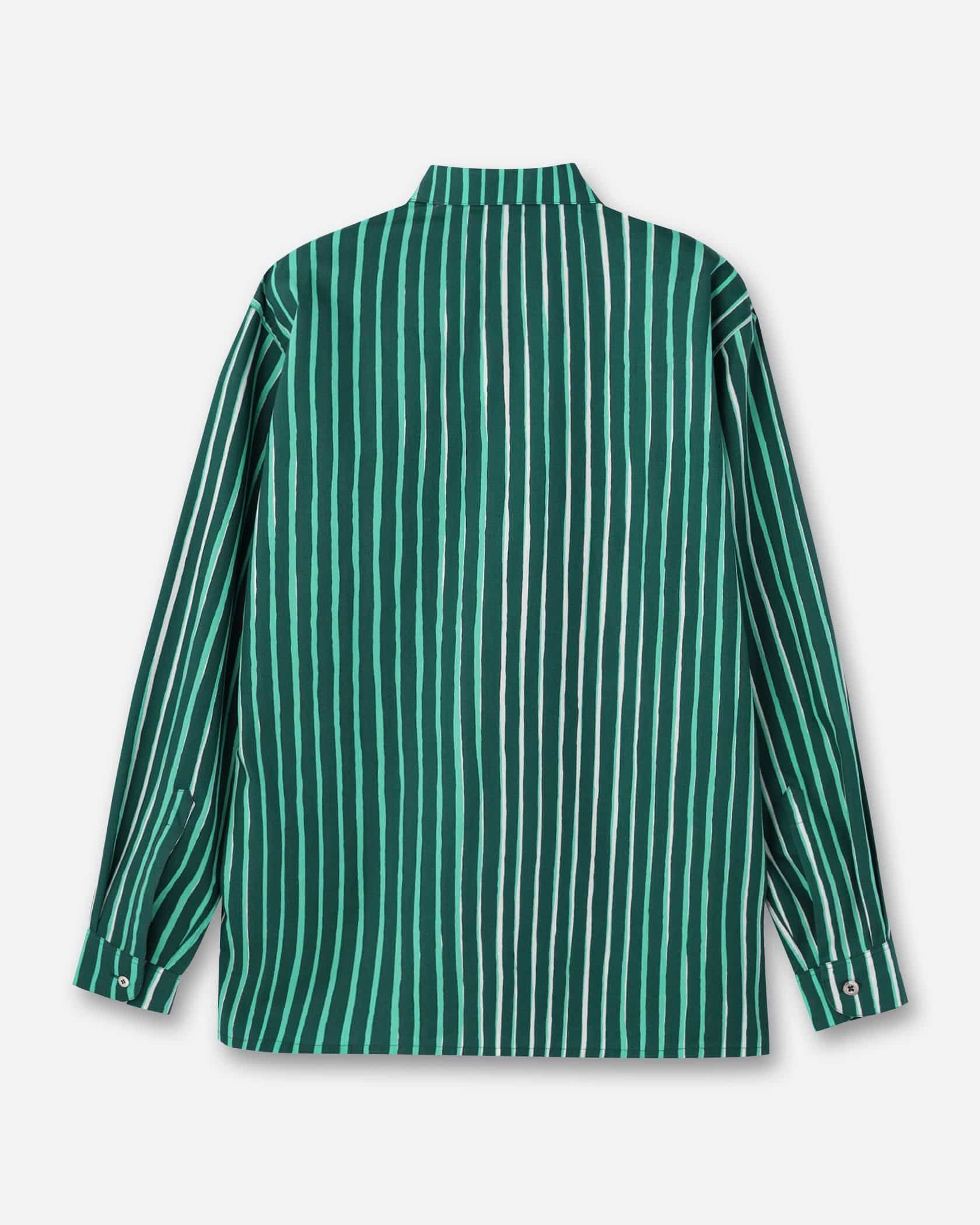 ランダムストライプのPiccolo柄がスタイリングに映えるJokapoikaシャツ。印象的な配色に加え、シルバーのメタルボタンでスタイリッシュなアクセントをつけています。左胸にポケットを備え、ストレートカットの裾はサイドスリットをプラス。ユニセックスで着られるシルエットで、羽織りとしても重宝します。