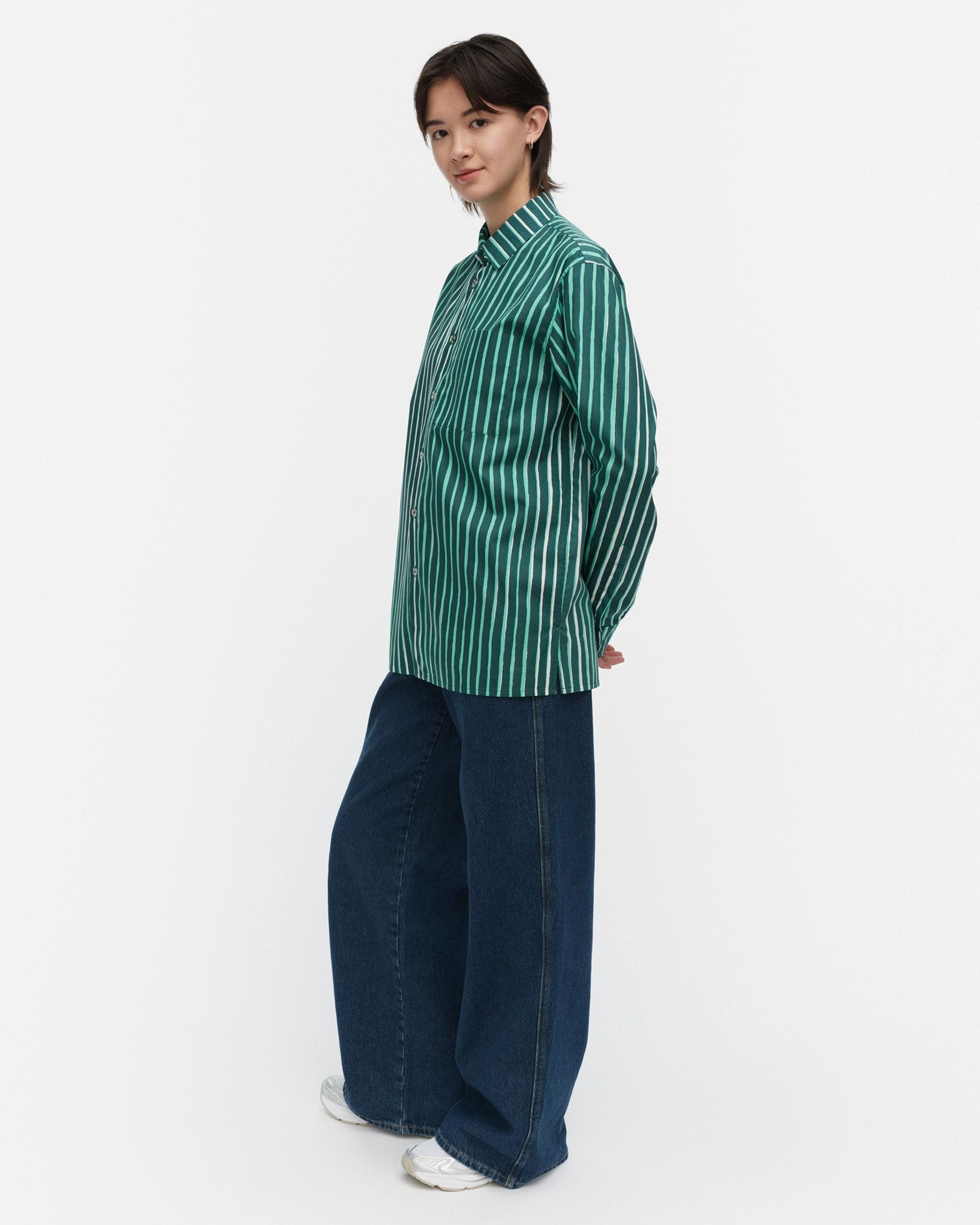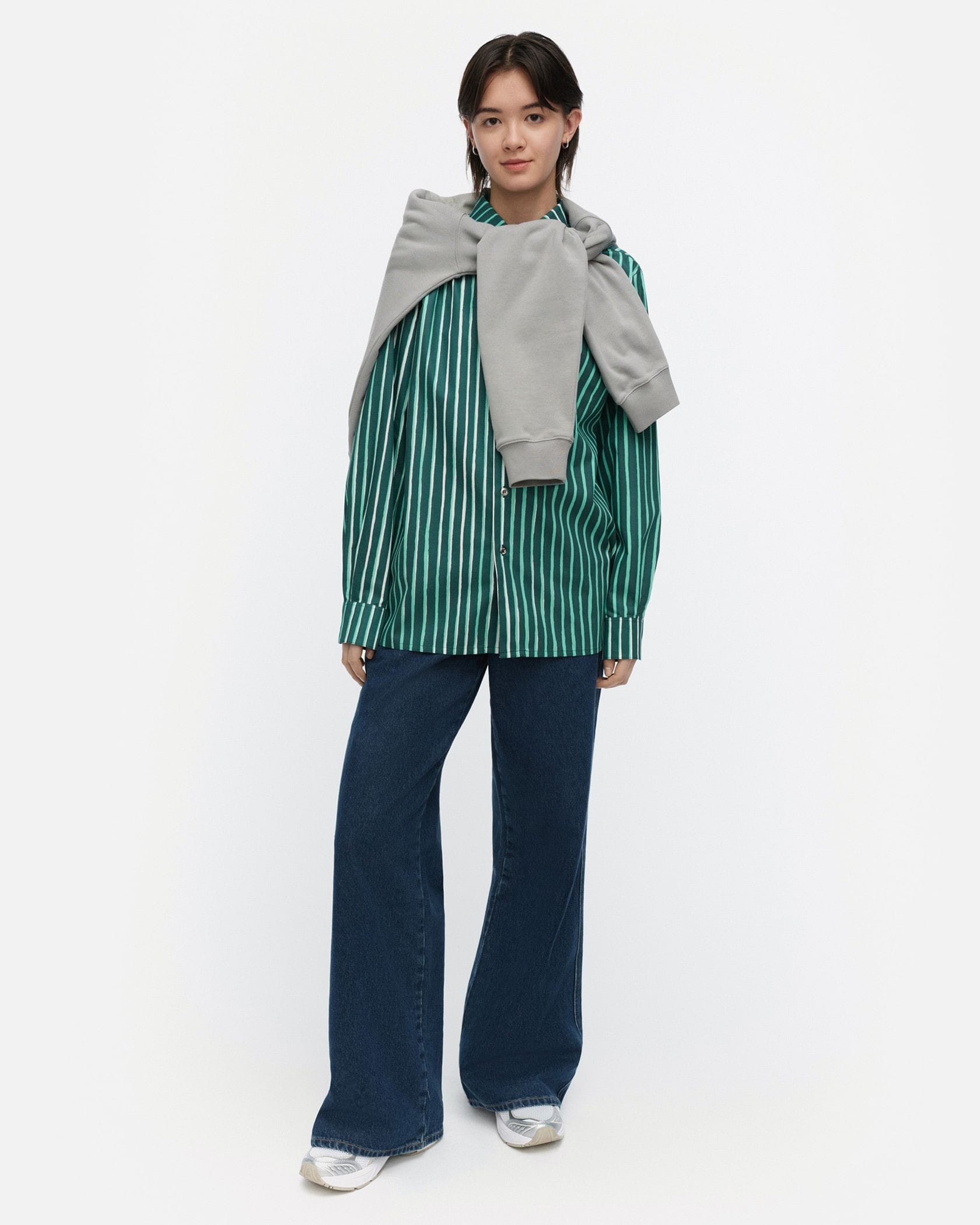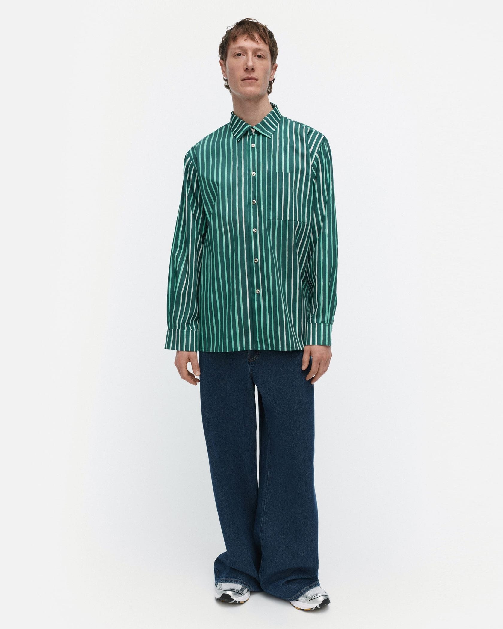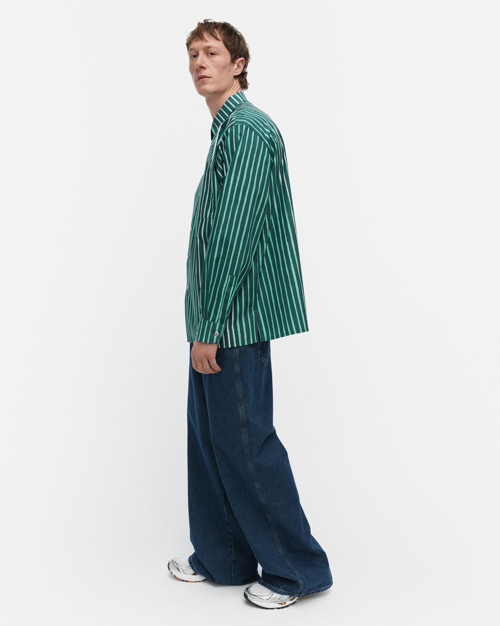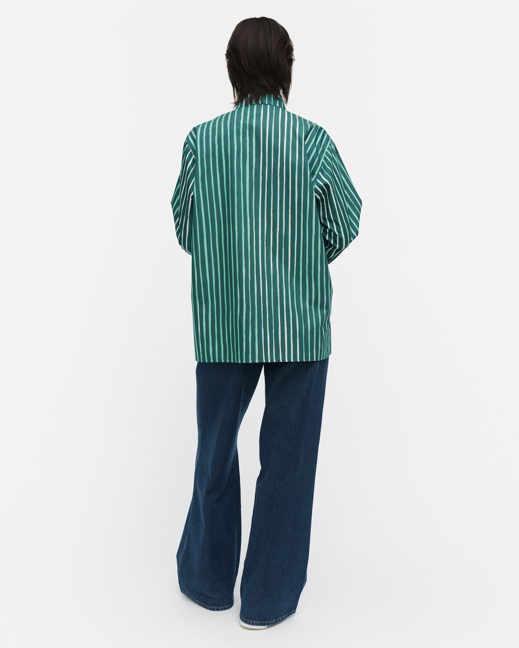 ランダムストライプのPiccolo柄がスタイリングに映えるJokapoikaシャツ。印象的な配色に加え、シルバーのメタルボタンでスタイリッシュなアクセントをつけています。左胸にポケットを備え、ストレートカットの裾はサイドスリットをプラス。ユニセックスで着られるシルエットで、羽織りとしても重宝します。
