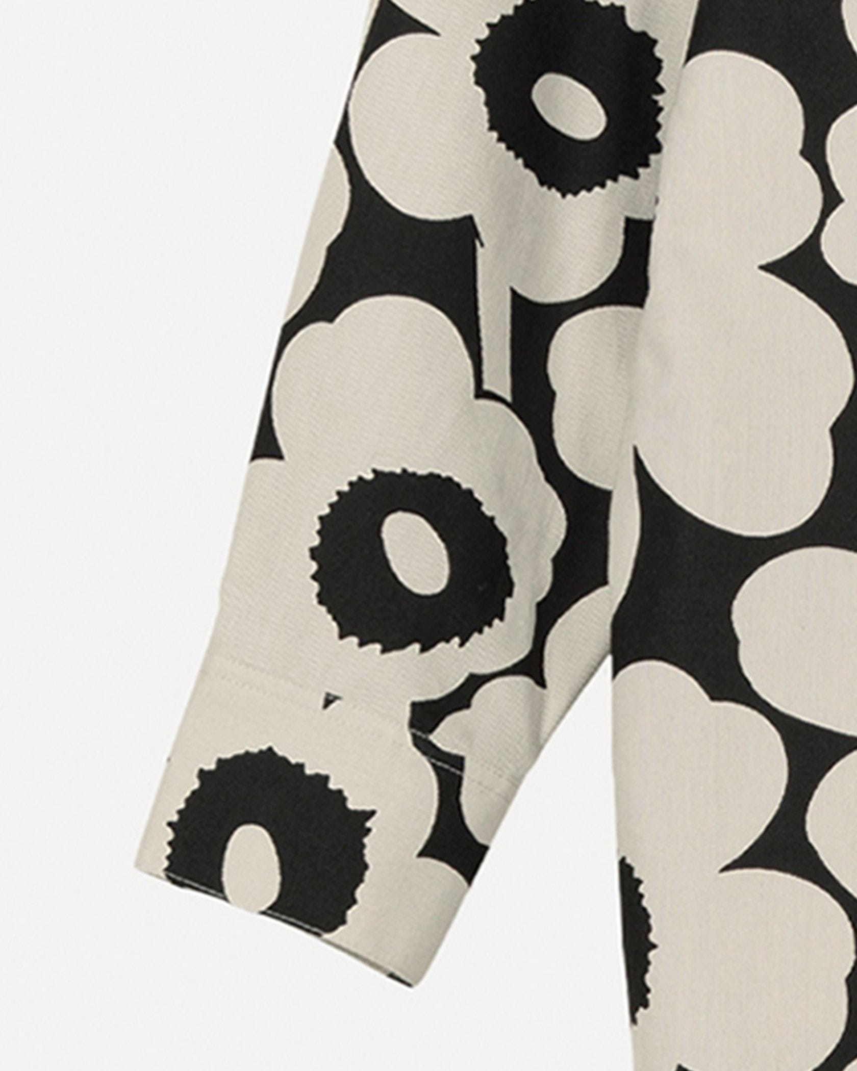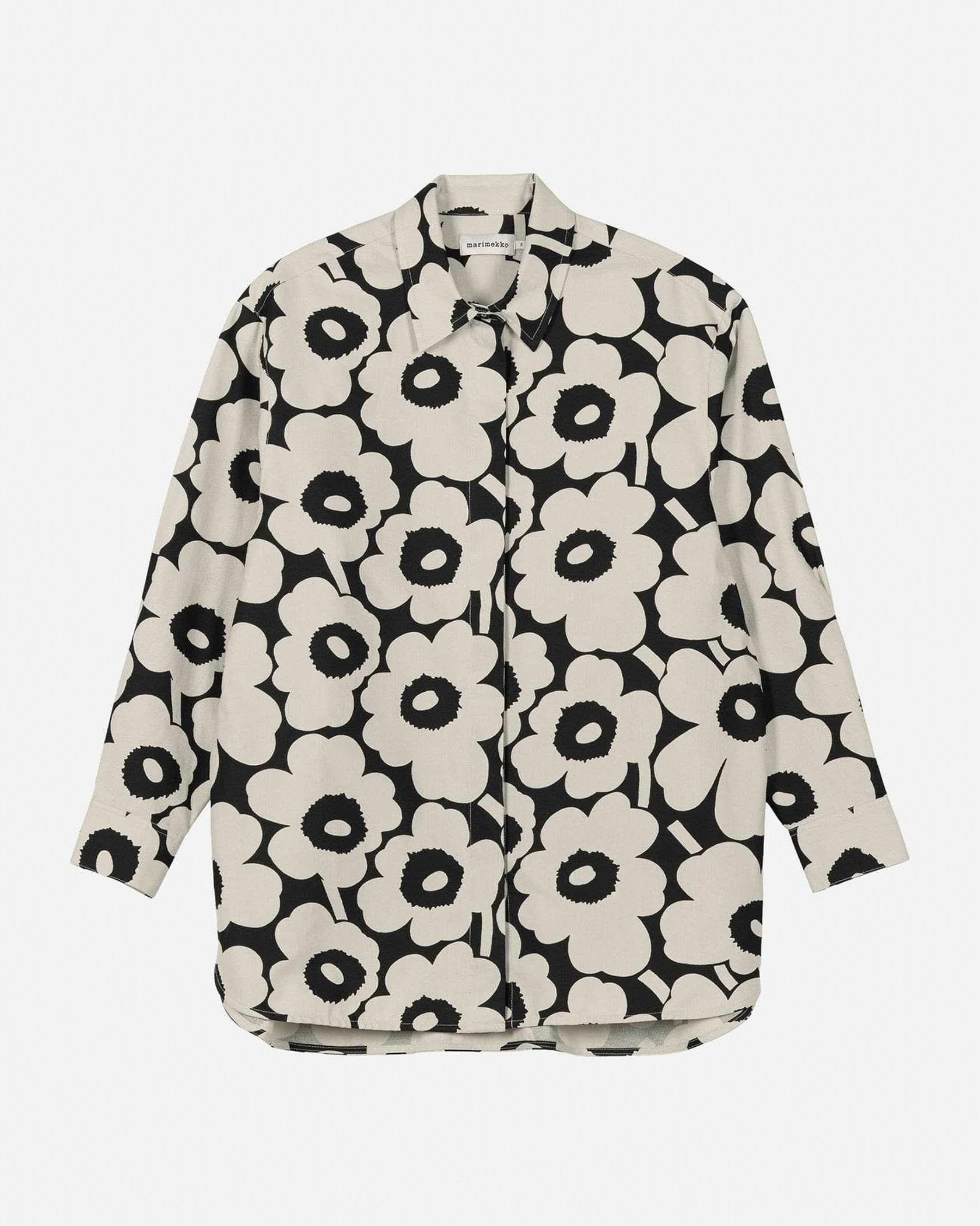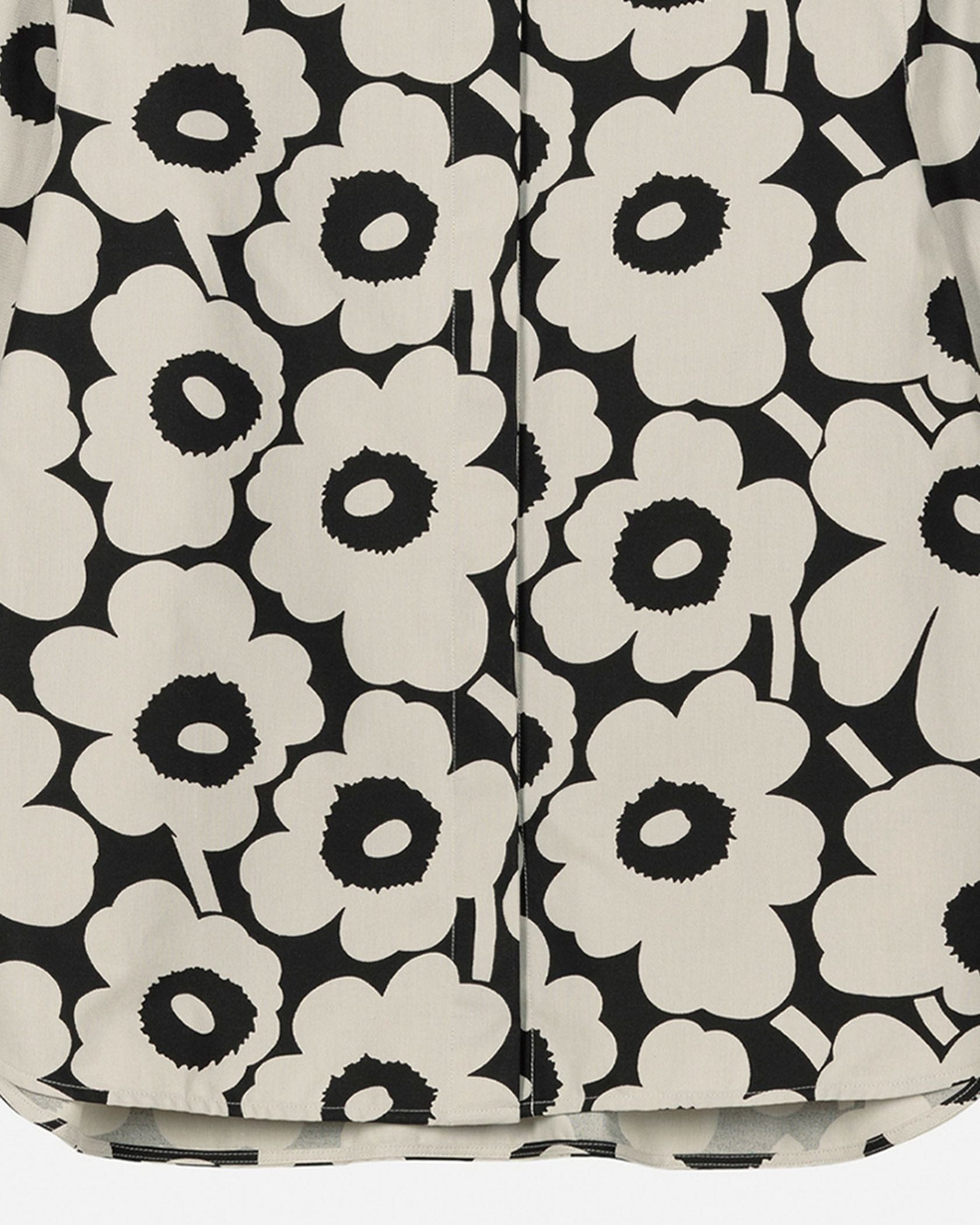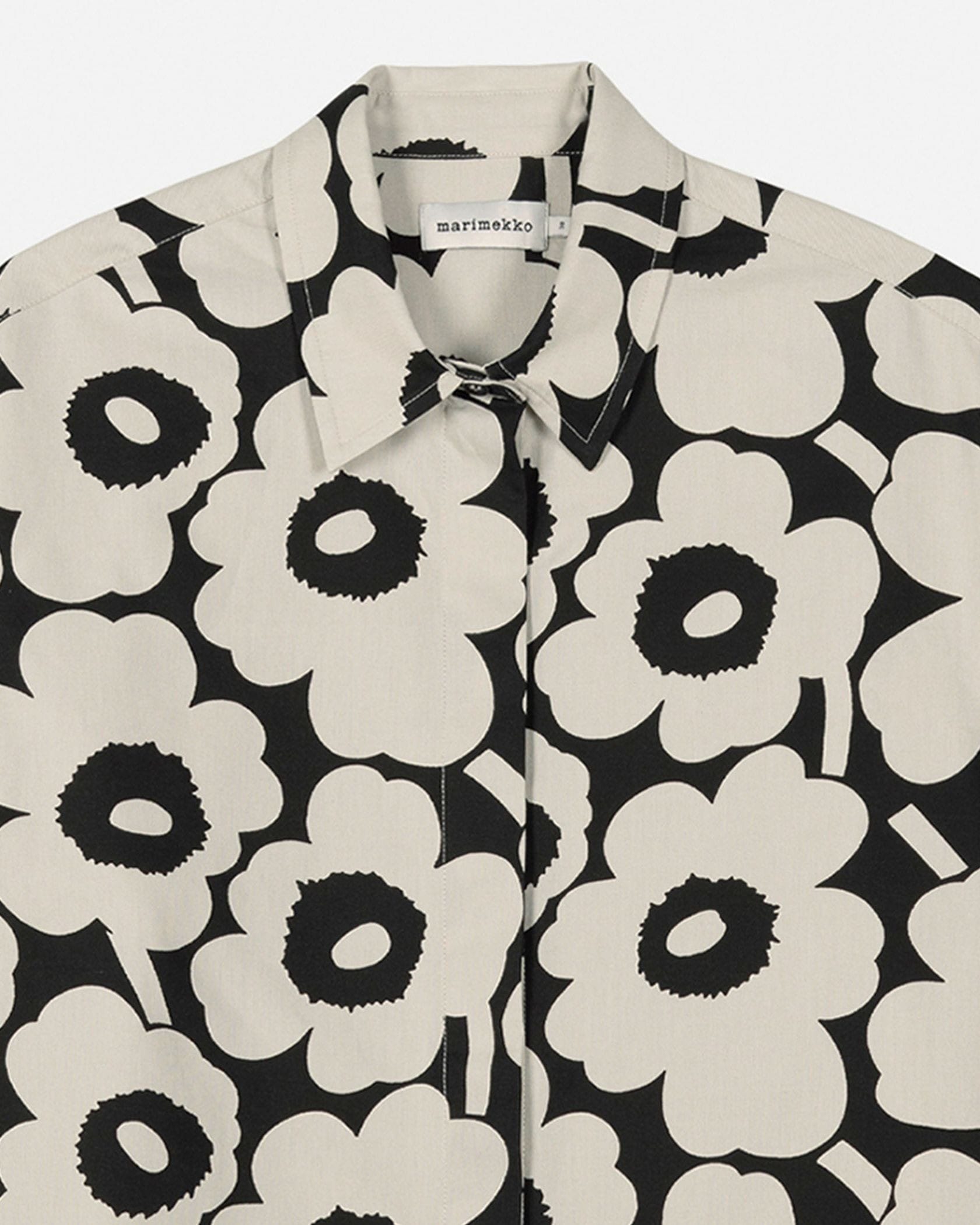 Marimekkoを代表するUnikko柄の長袖シャツ。コントラスのあるフラワーモチーフの総柄が華やかなデザイン。ゆったりとしたストレートフィット、サイドスリットがモダンなシルエット。ボタンの見えない比翼仕立てのすっきりとしたフロントも特徴。お手持ちのボトムに合わせてスタイリッシュな着こなしが決まります。