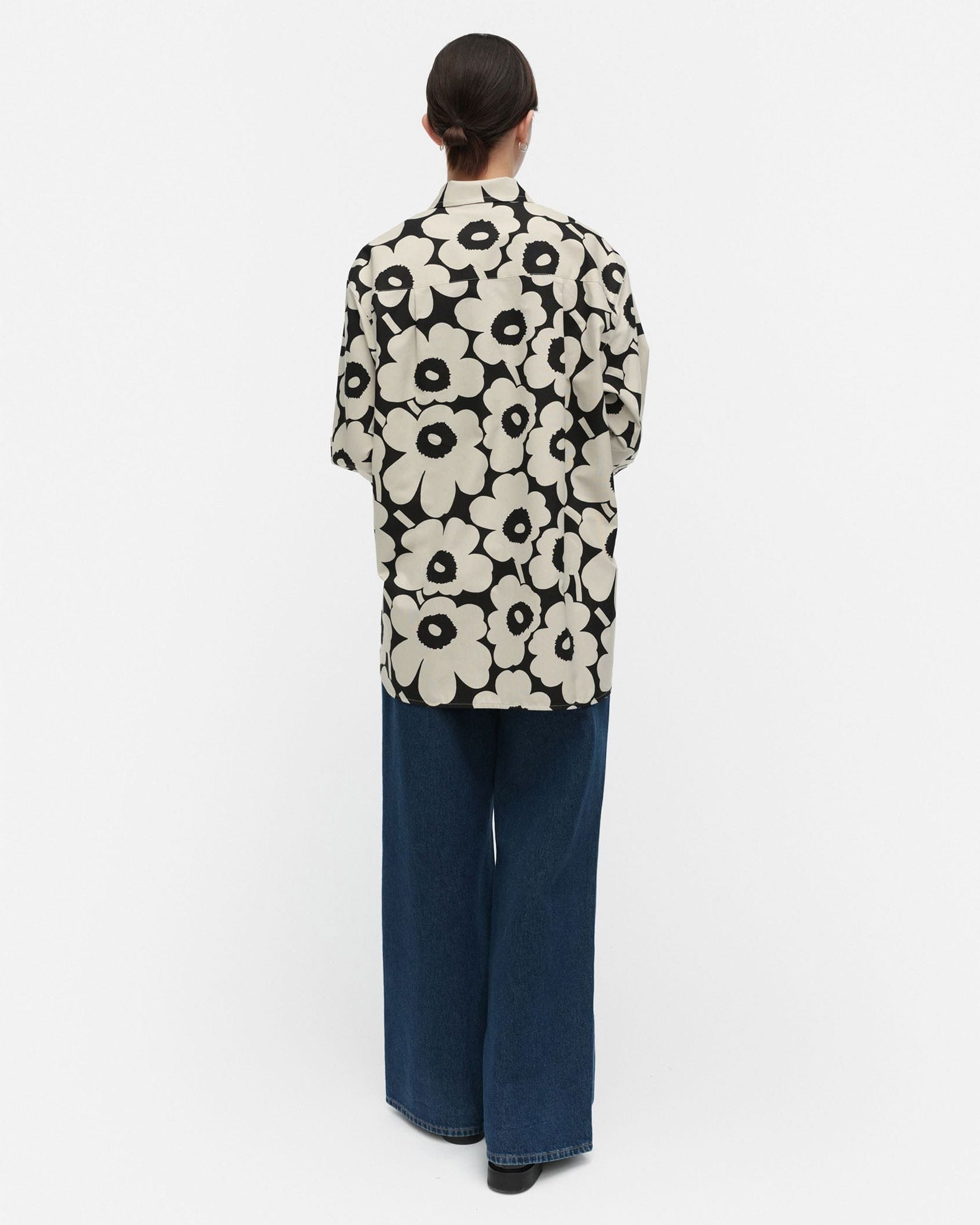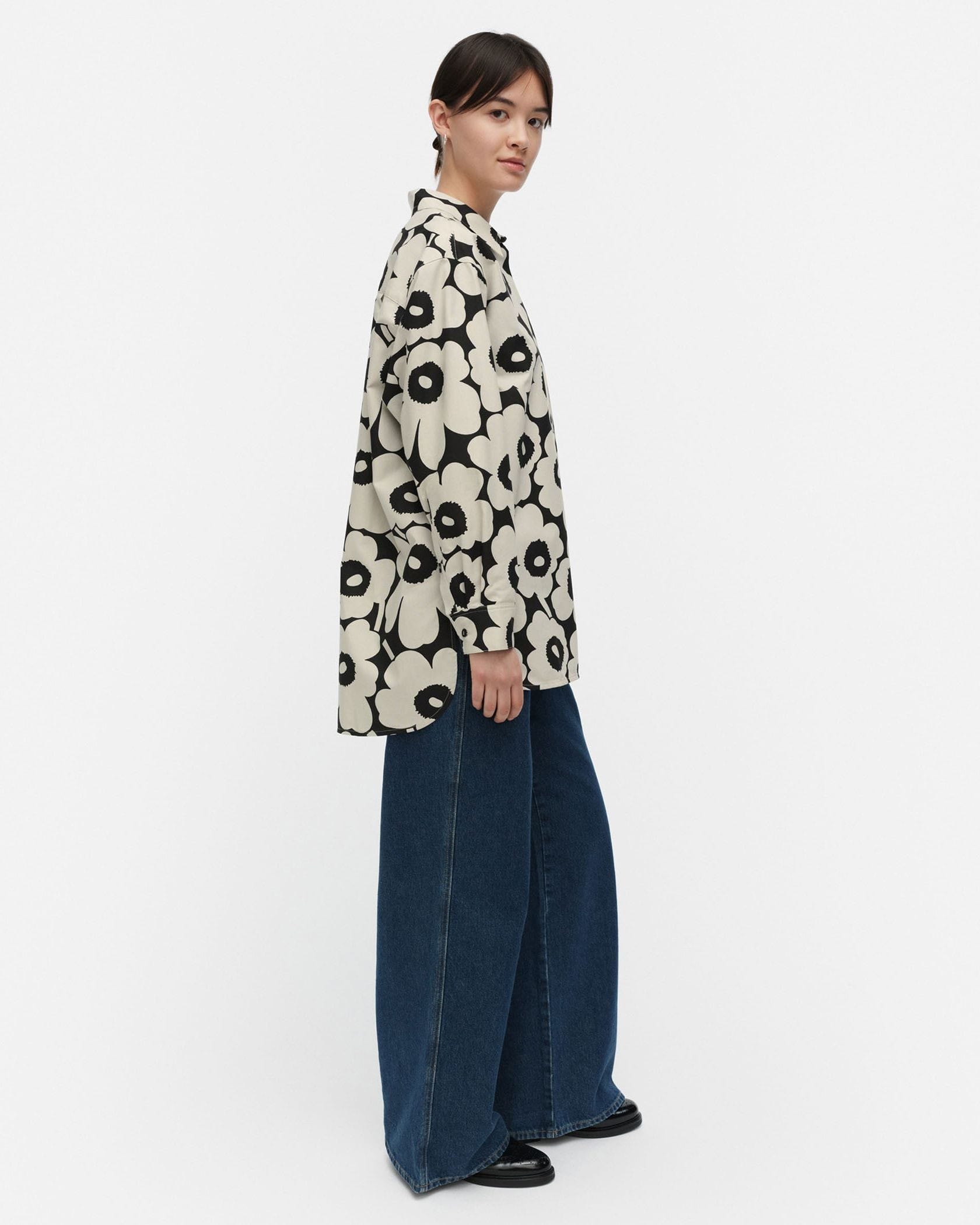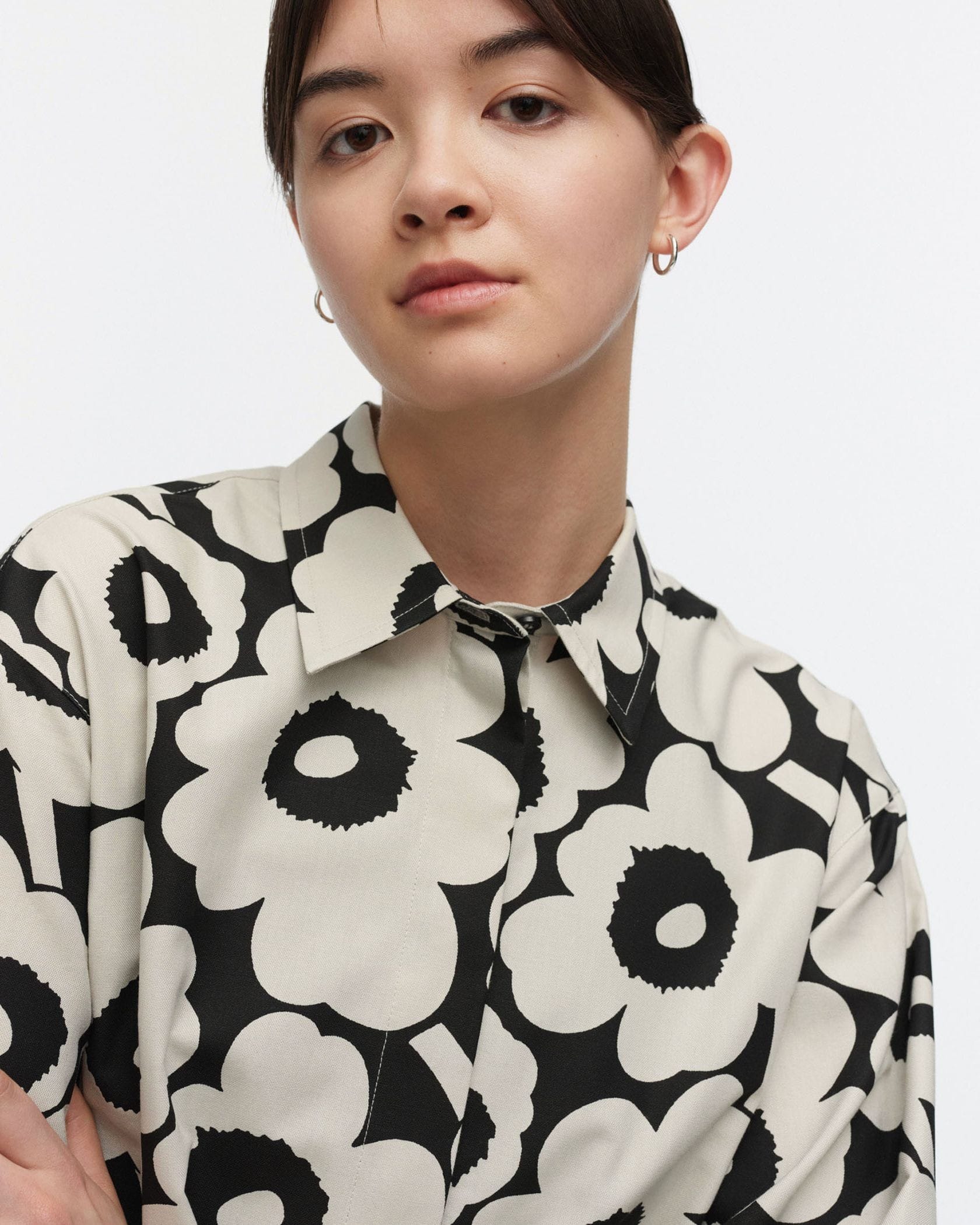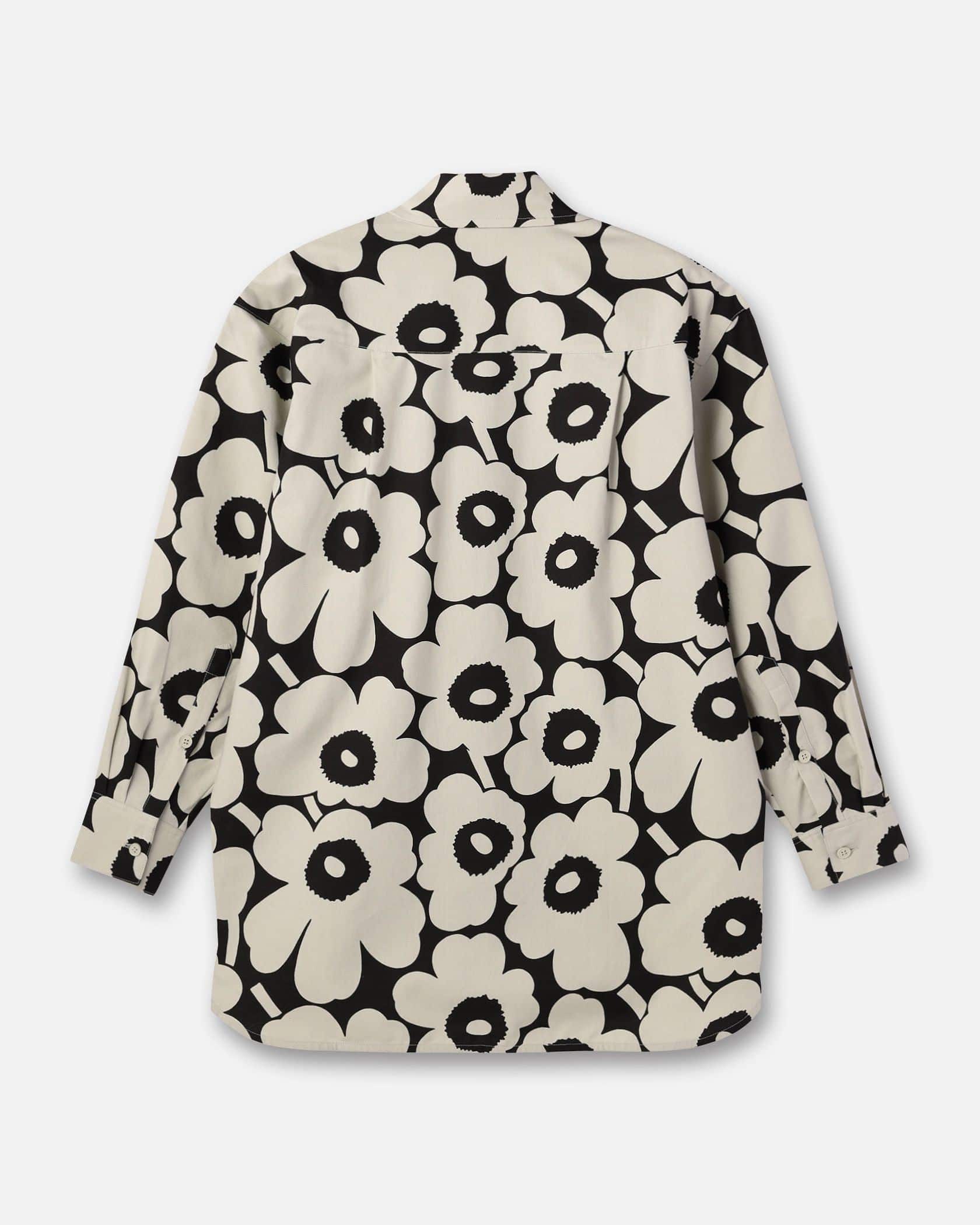 Marimekkoを代表するUnikko柄の長袖シャツ。コントラスのあるフラワーモチーフの総柄が華やかなデザイン。ゆったりとしたストレートフィット、サイドスリットがモダンなシルエット。ボタンの見えない比翼仕立てのすっきりとしたフロントも特徴。お手持ちのボトムに合わせてスタイリッシュな着こなしが決まります。