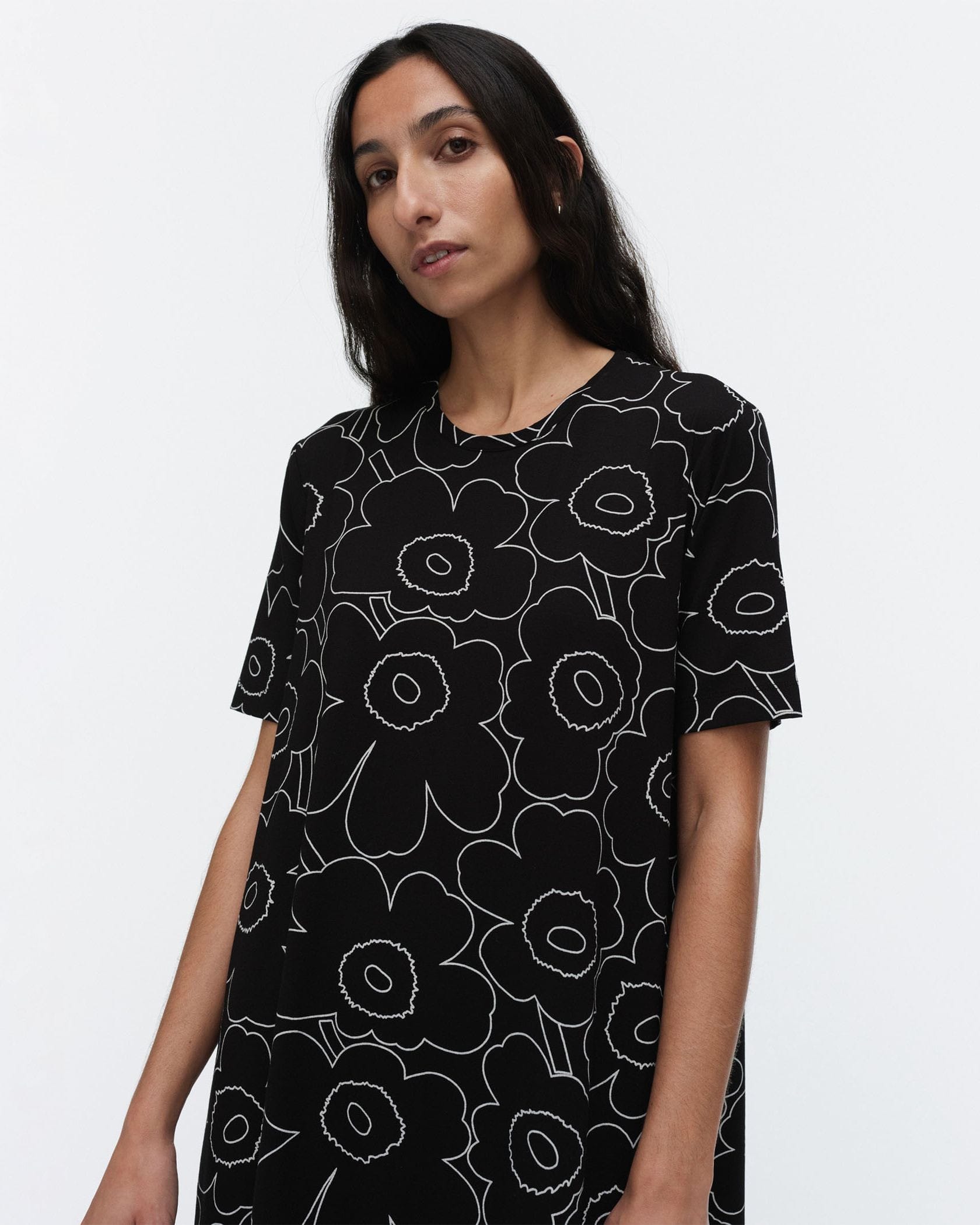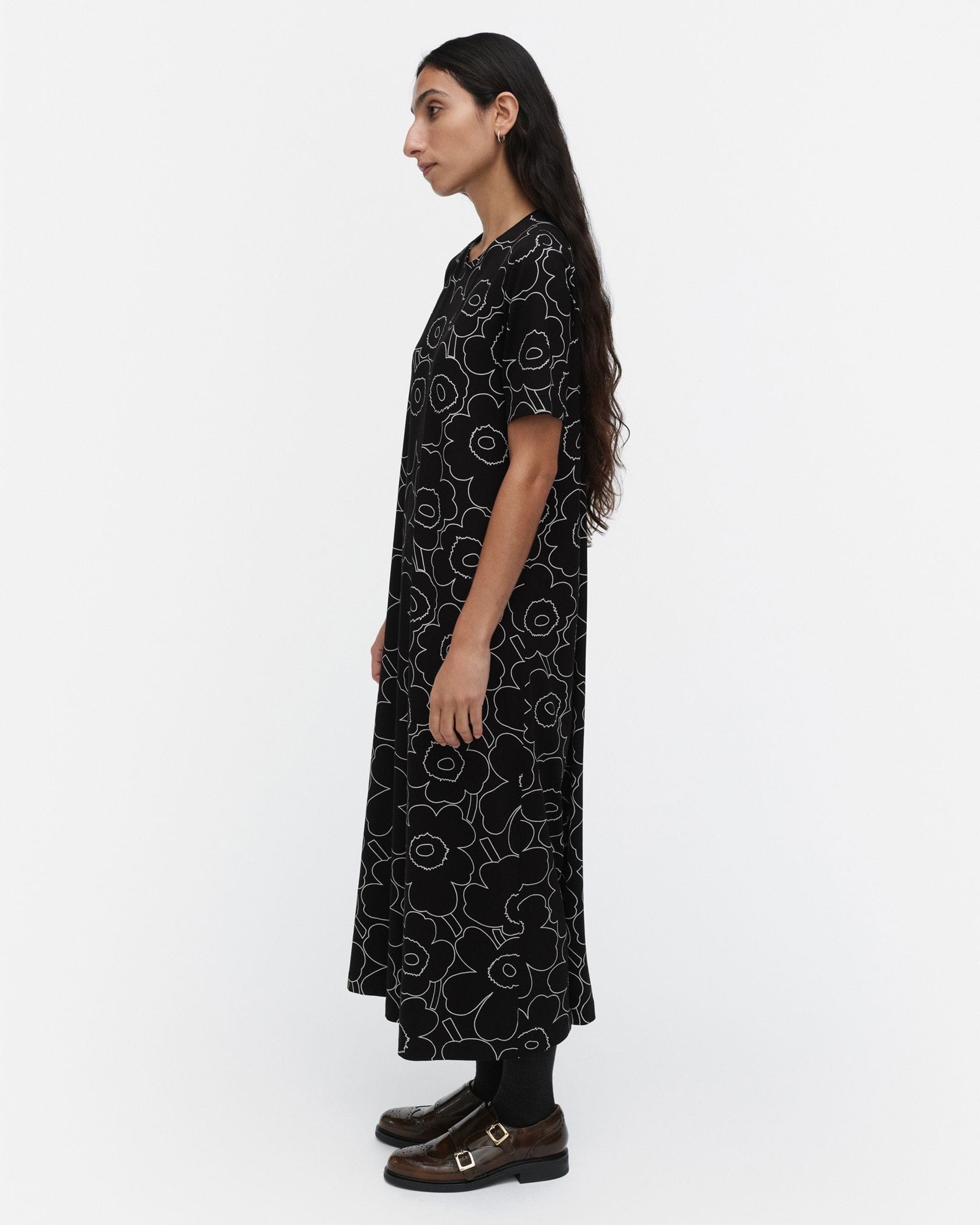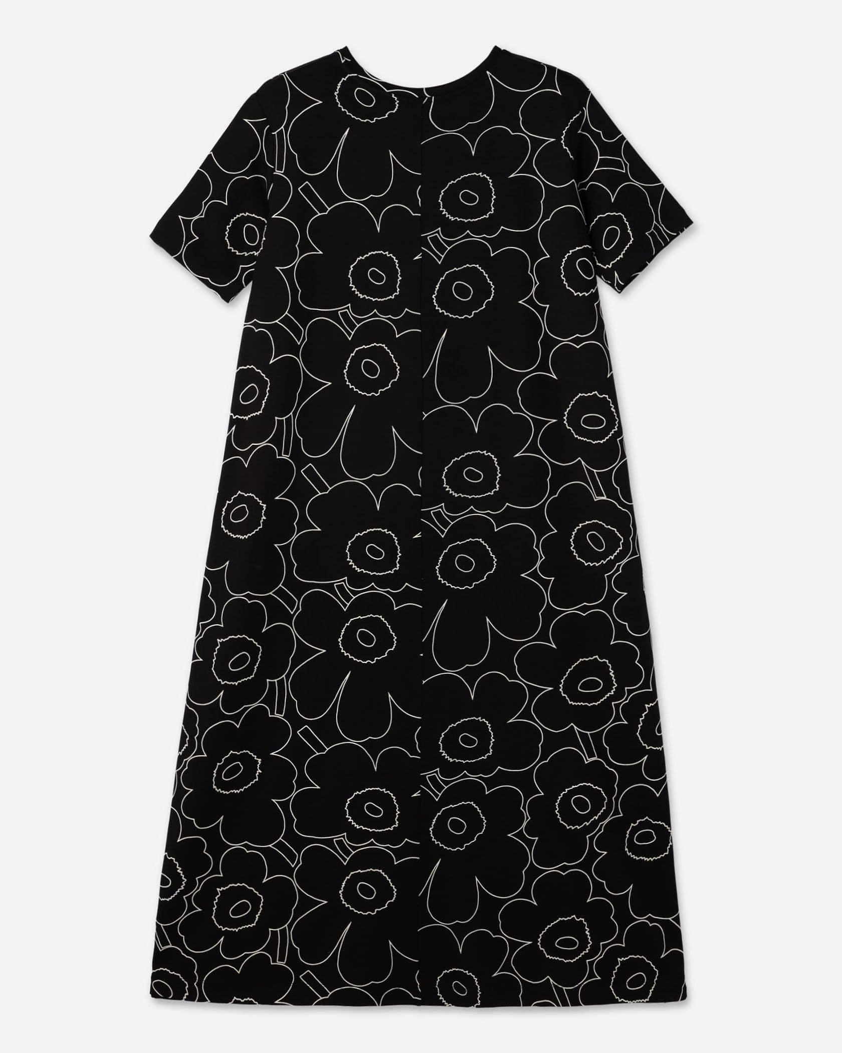 黒ベースのUnikko柄がクールな半袖ワンピース。すとんと落ちるシルエットは、気負わずリラックスして着こなせます。アウターも羽織りやすく、季節の変わり目にも重宝する一枚です。