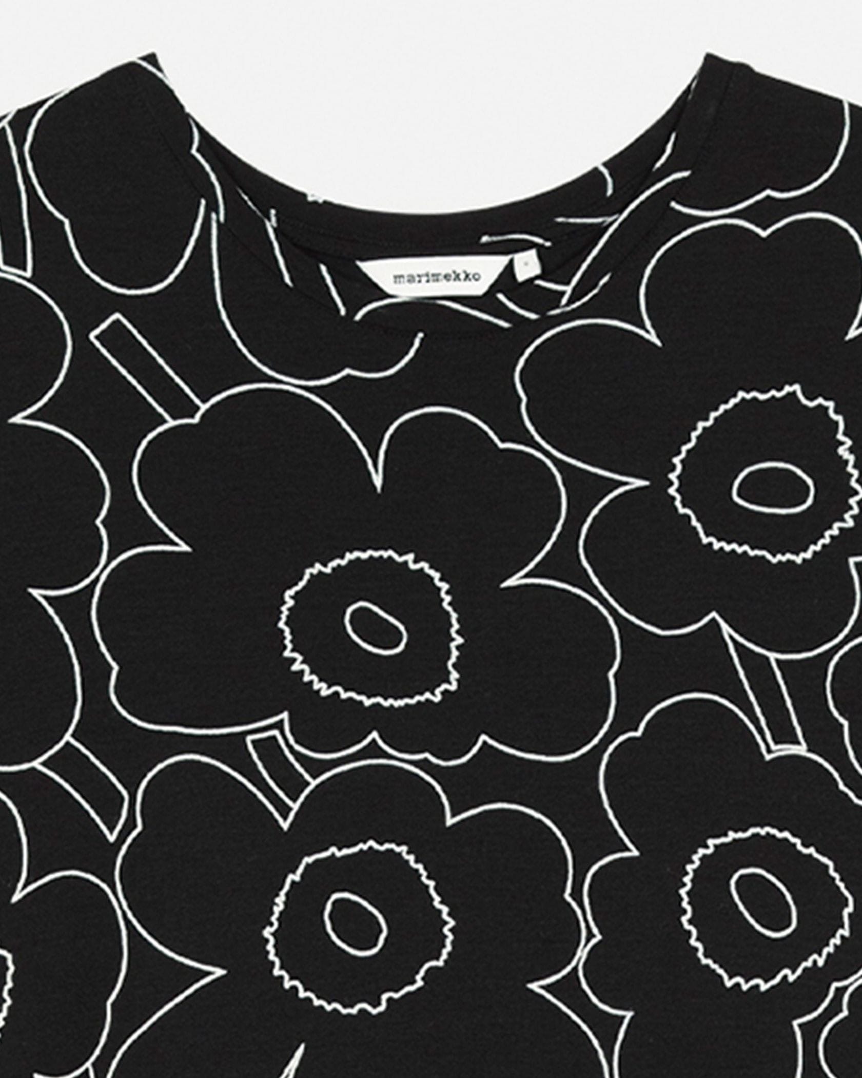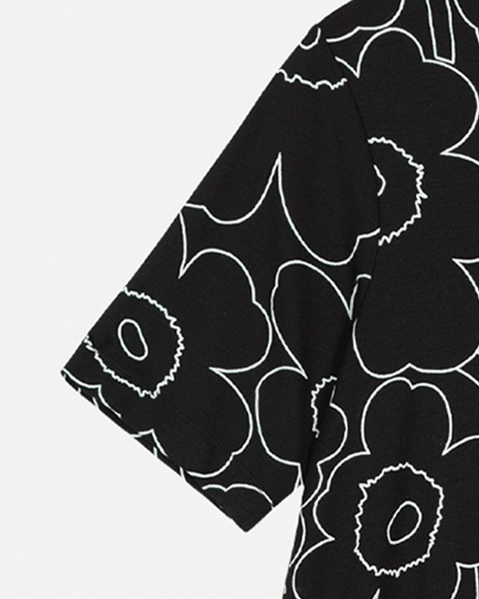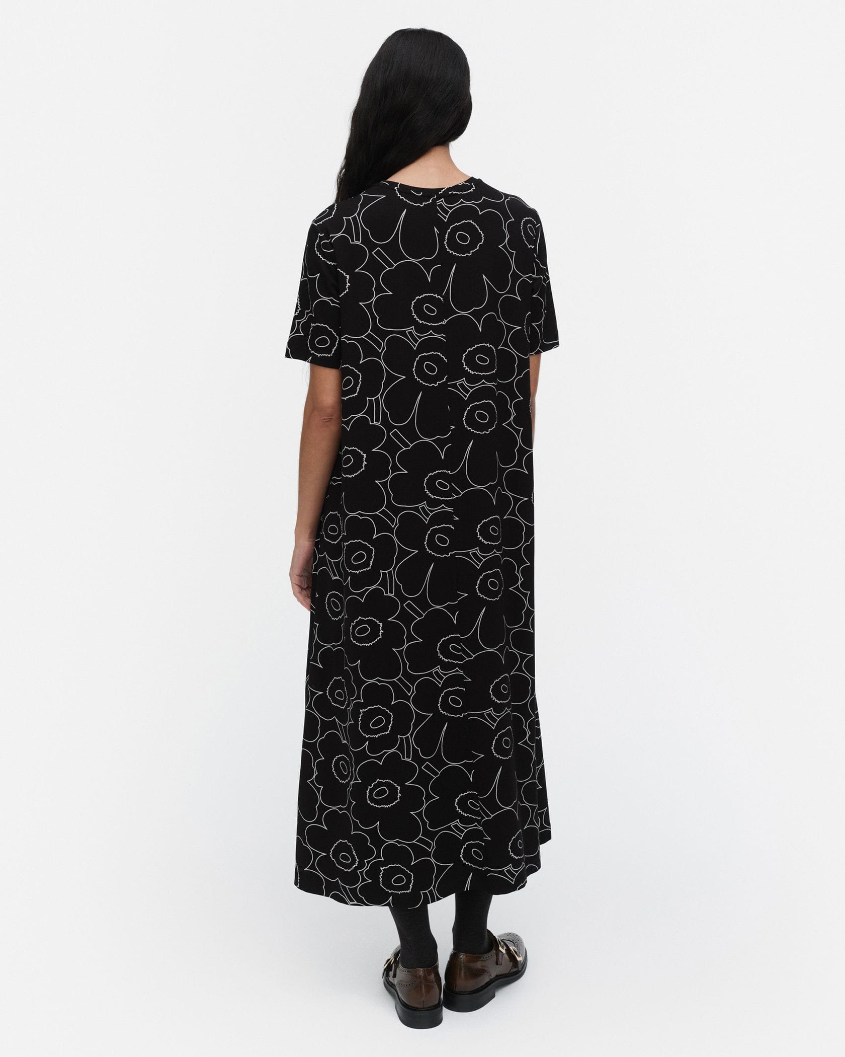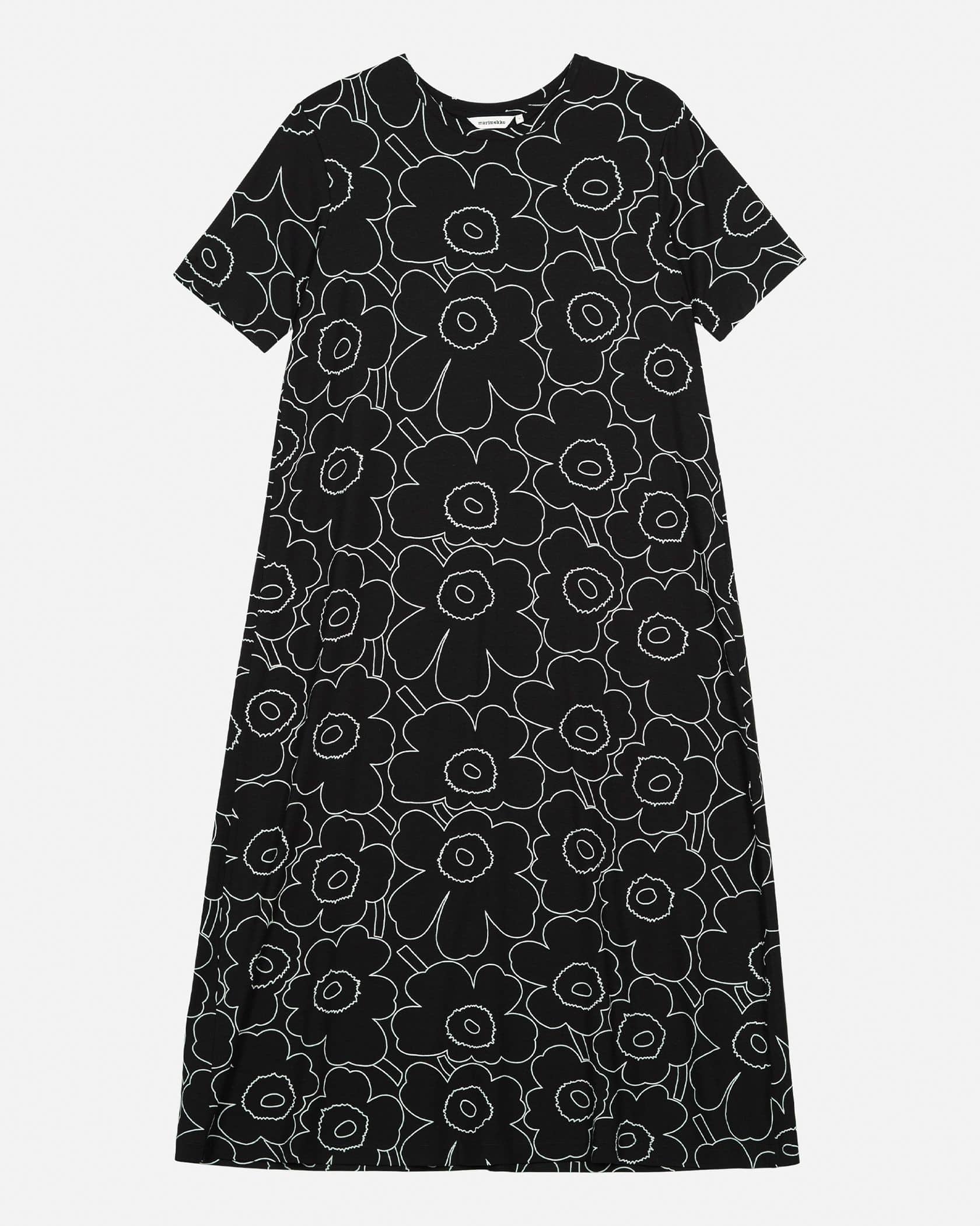 黒ベースのUnikko柄がクールな半袖ワンピース。すとんと落ちるシルエットは、気負わずリラックスして着こなせます。アウターも羽織りやすく、季節の変わり目にも重宝する一枚です。