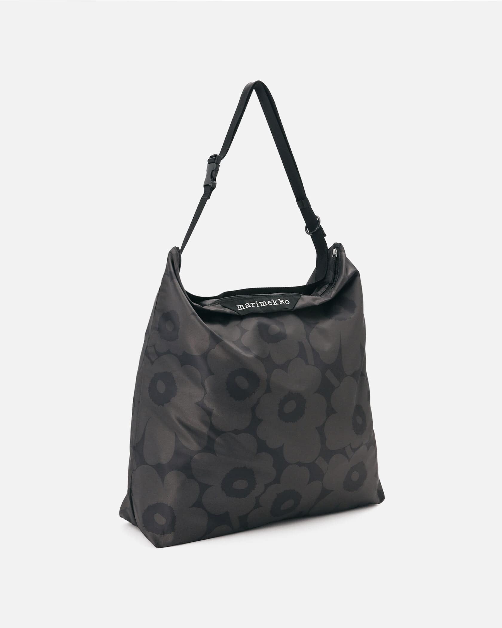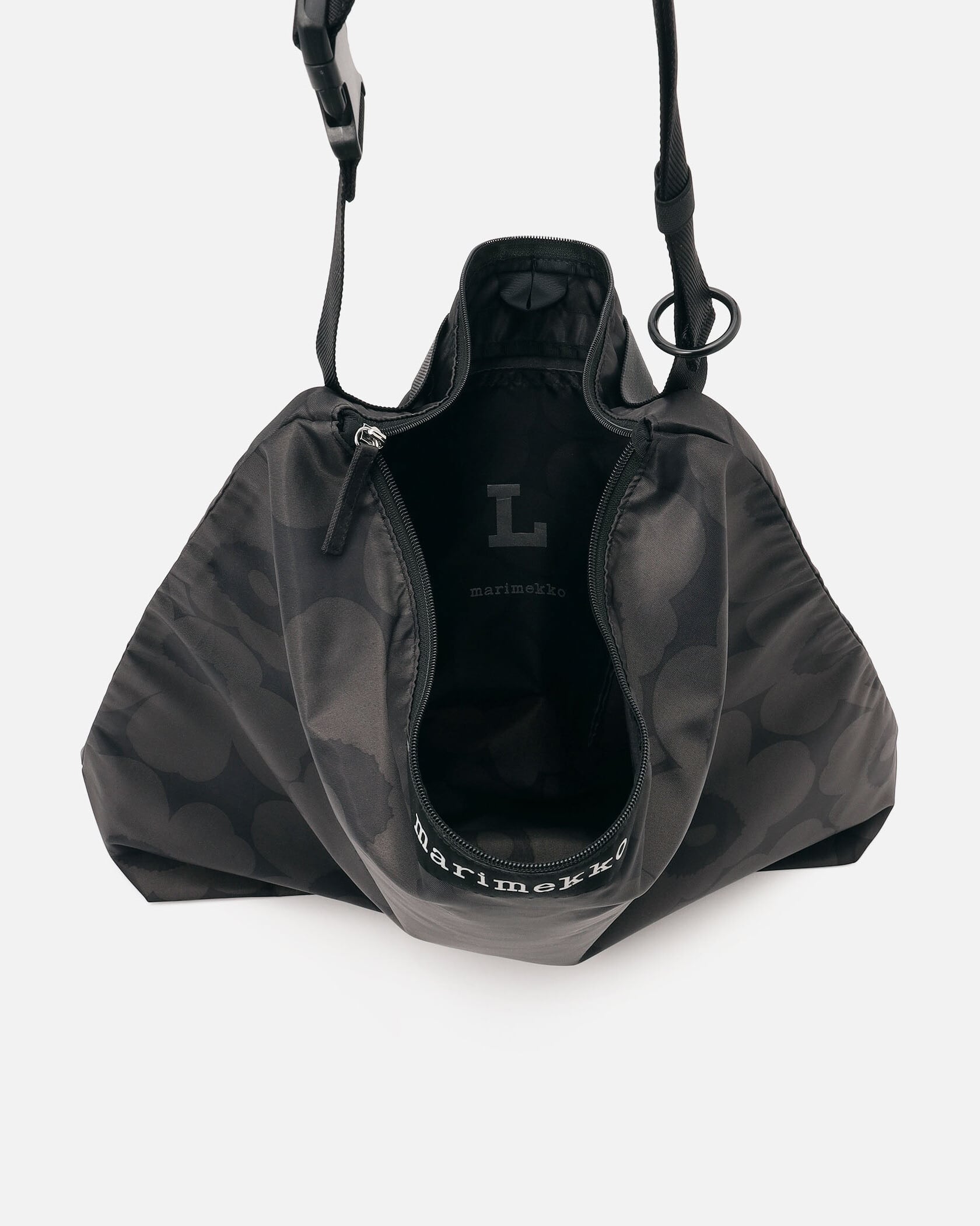 シックな配色のUnikko柄をあしらったショルダーバッグL。収納力抜群の大型サイズで、日常のほか、お荷物の多いシーンや小旅行にもおすすめのアイテムです。素材は軽やかで扱いやすいポリエステル生地。ショルダーストラップは長さ調整でき、間口はしっかり閉じられるファスナー仕様です。