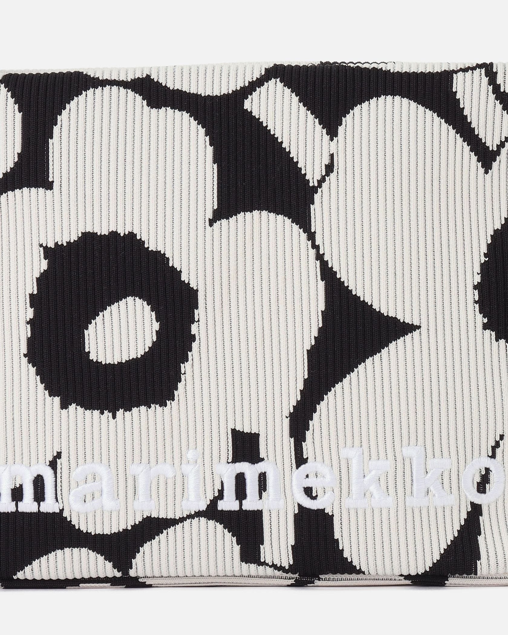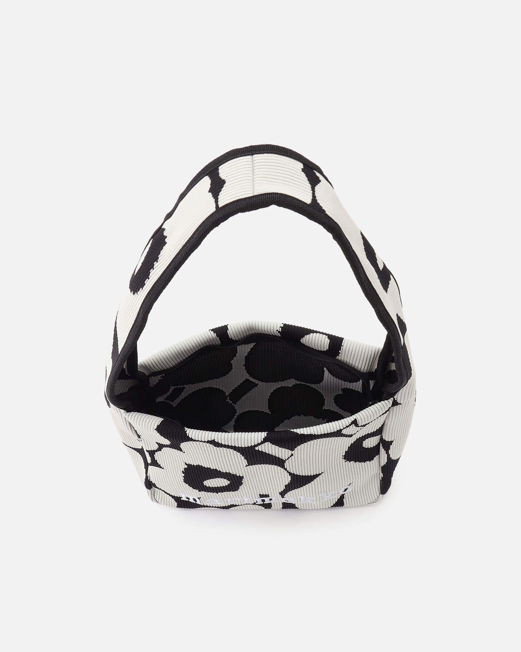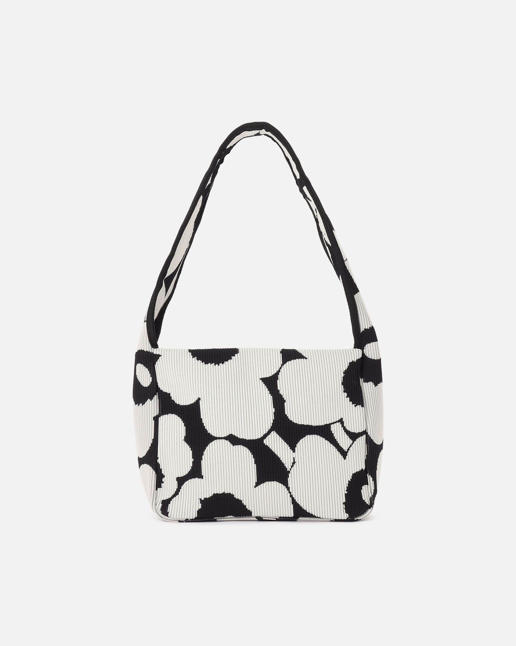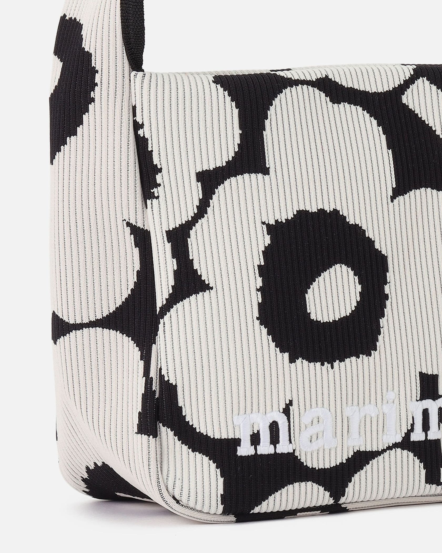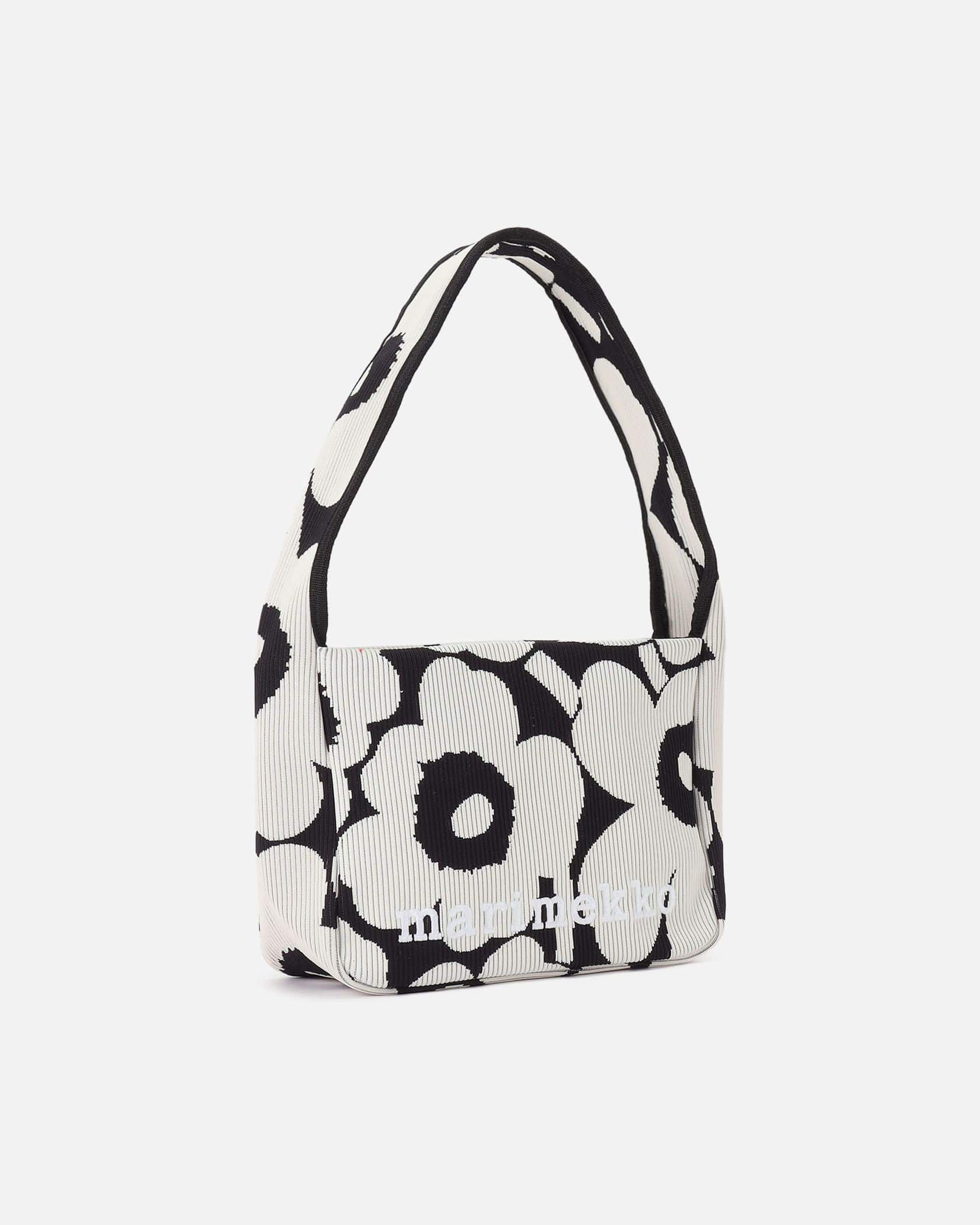 リブのような厚みと凹凸を持つニット素材を用いたショルダーバッグ。Unikko柄を用いることで、コーディネートに華やかなアクセントを加える1点です。肩に掛けると脇にぴったりと収まるサイズ感。マチのある四角いフォルムには、スマートフォンやお財布などの小物がすっきり収納できます。