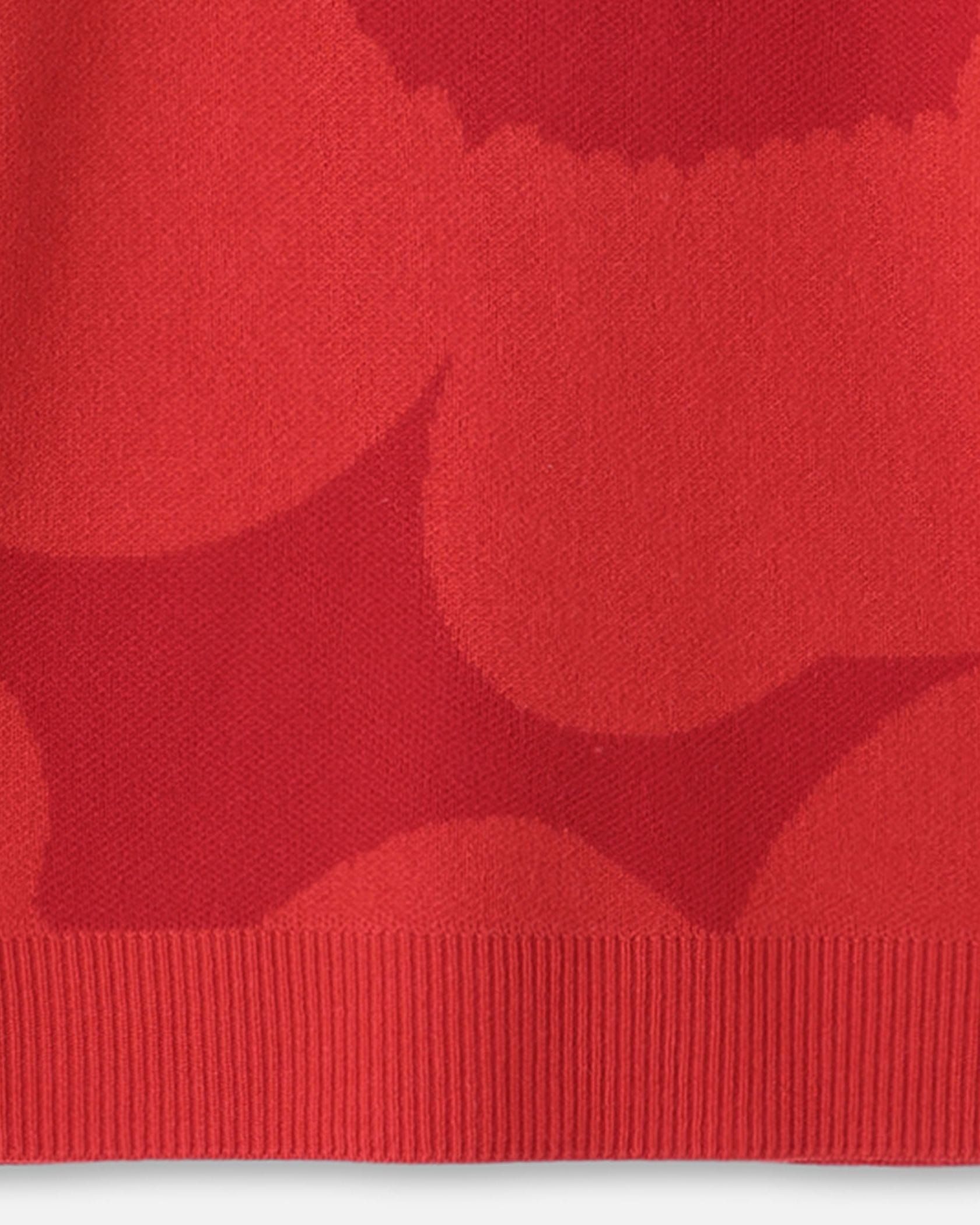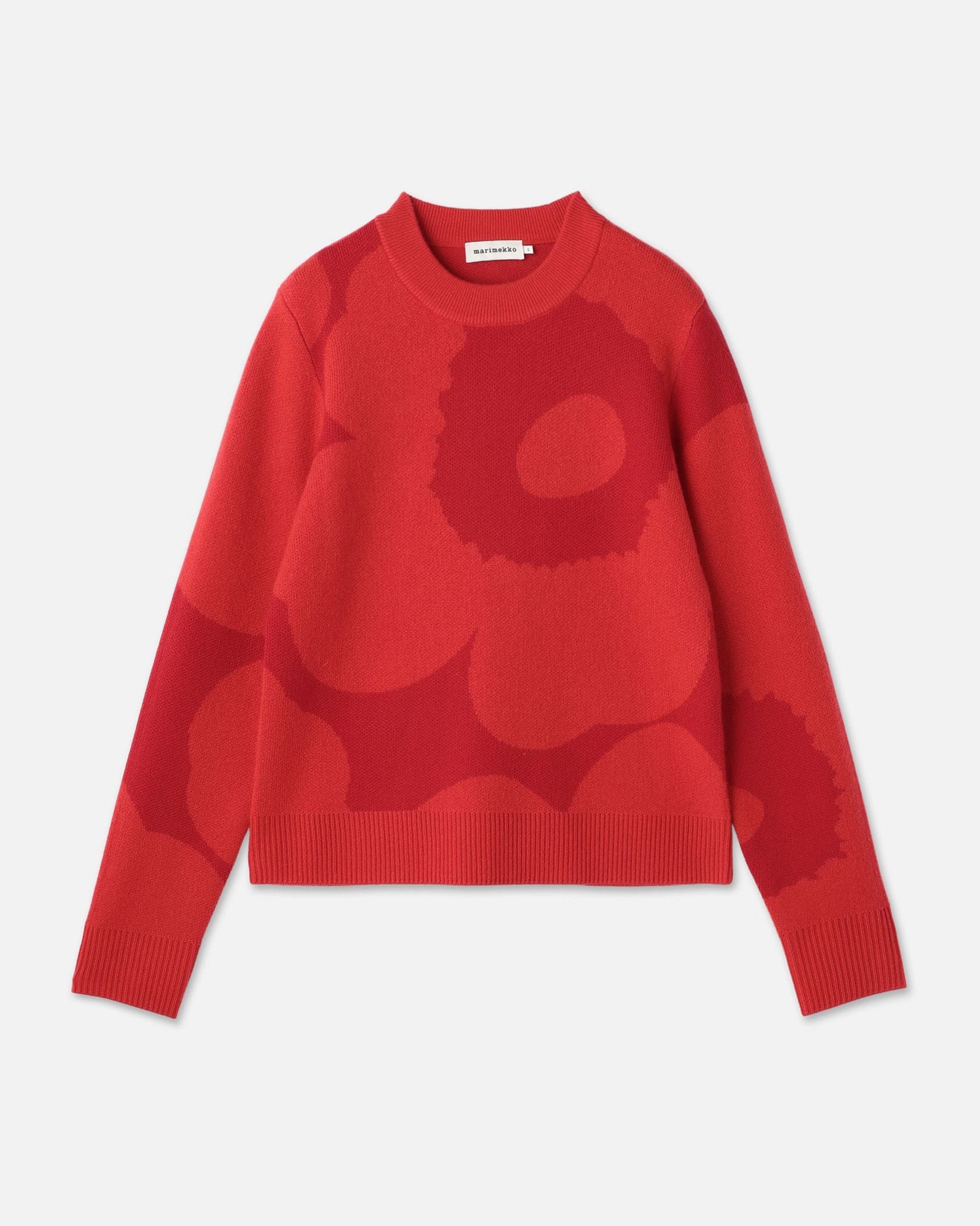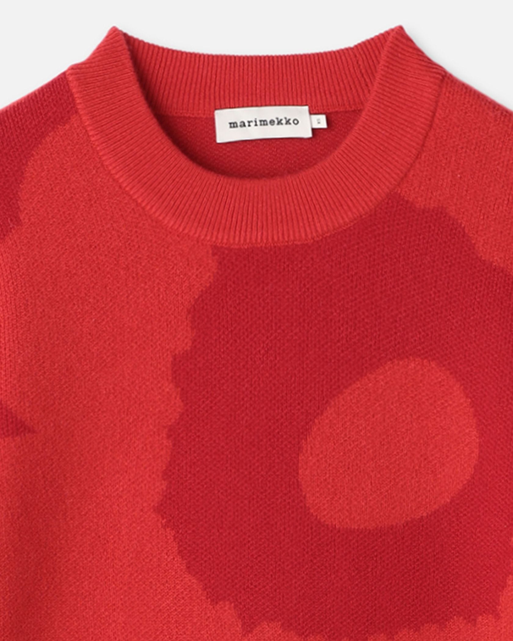 一見無地にも見えるクルーネックニット。Unikko柄をさりげなく配することで、小粋な一着に仕上げています。フォルムはベーシックでスタイリングしやすいのも魅力的。