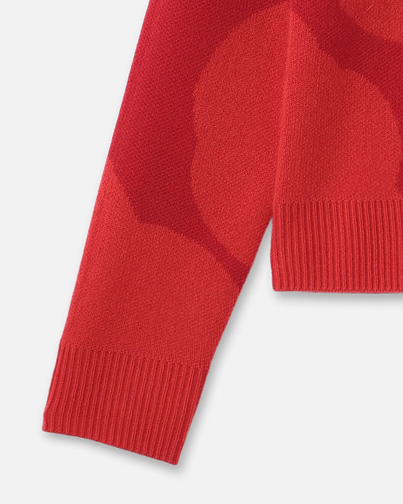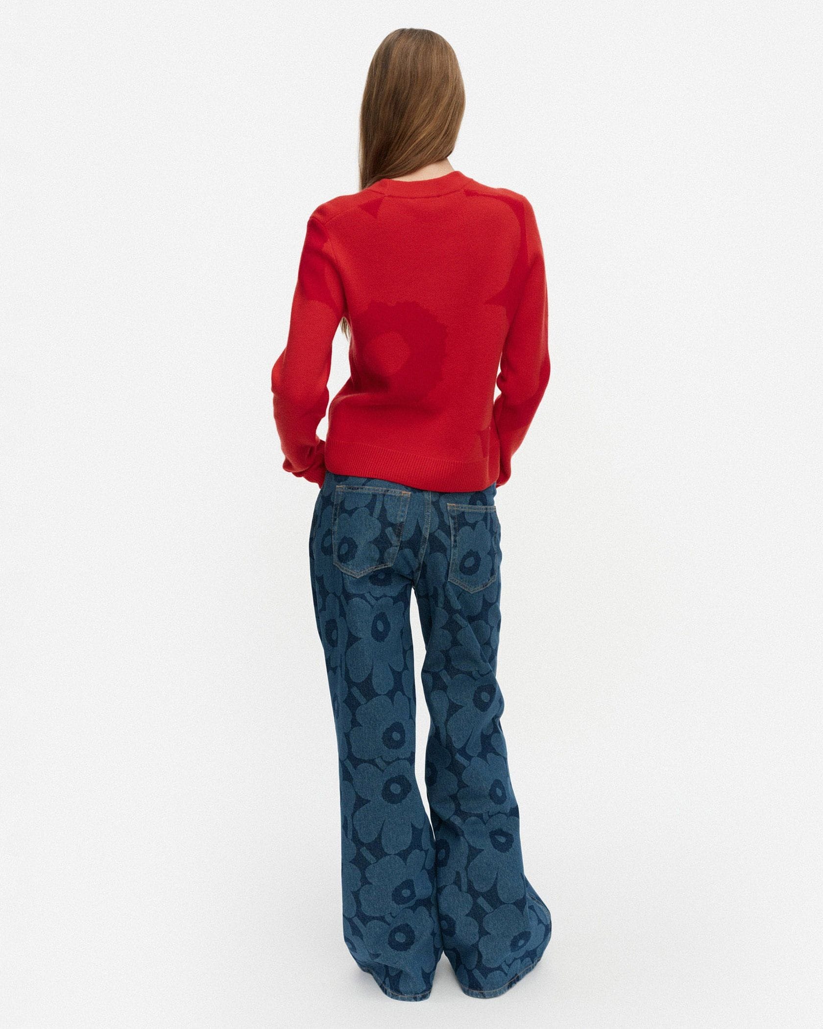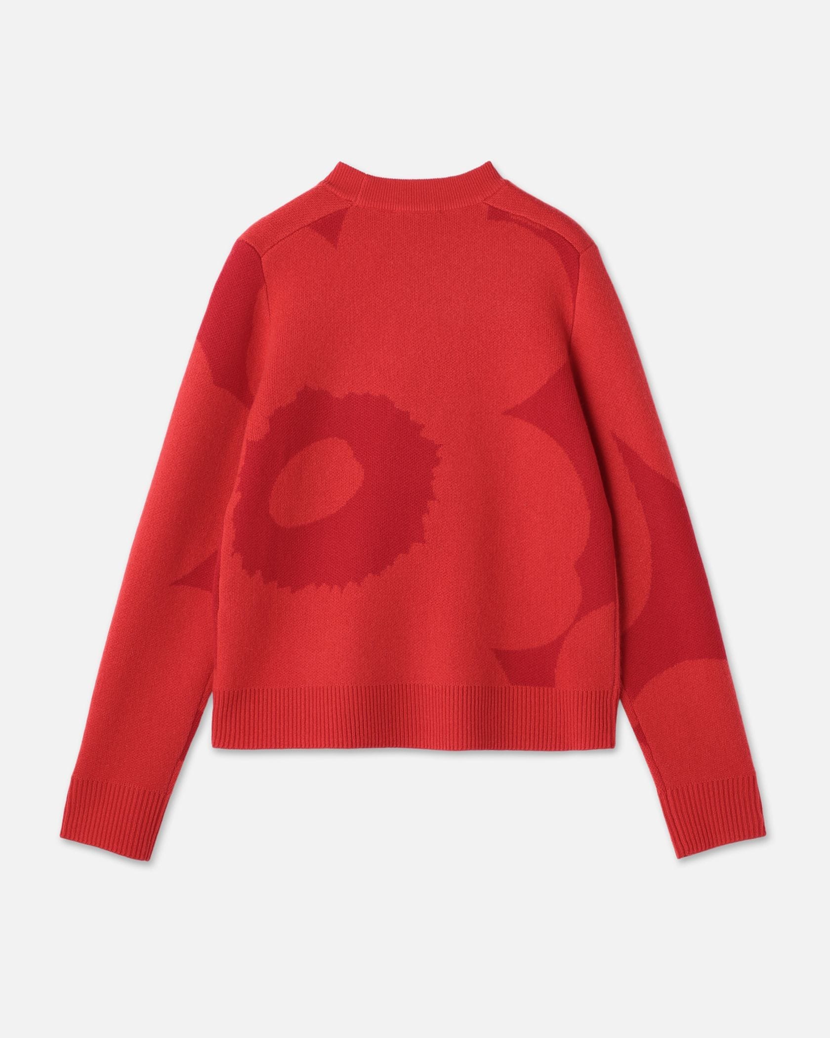 一見無地にも見えるクルーネックニット。Unikko柄をさりげなく配することで、小粋な一着に仕上げています。フォルムはベーシックでスタイリングしやすいのも魅力的。