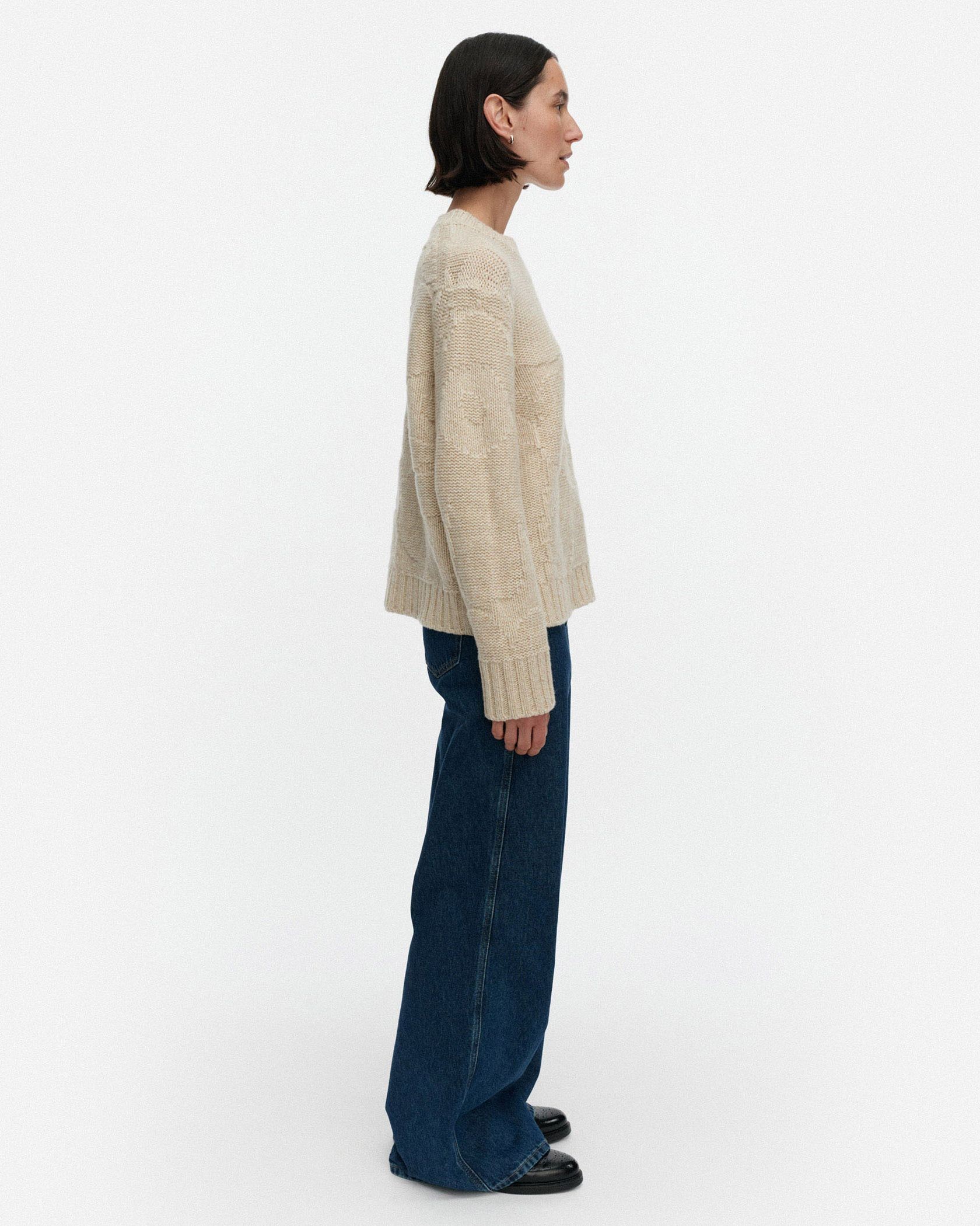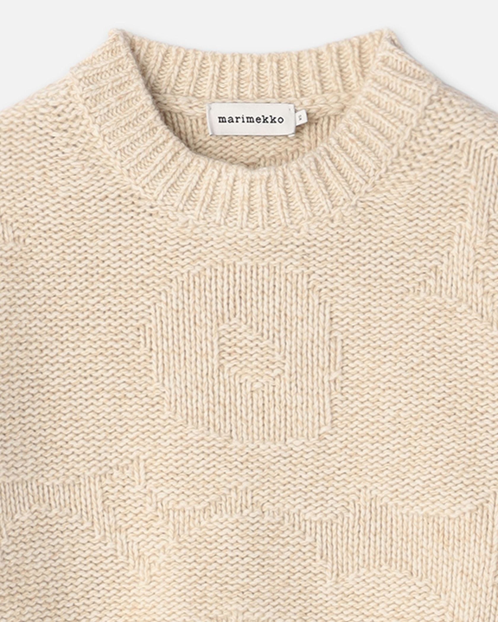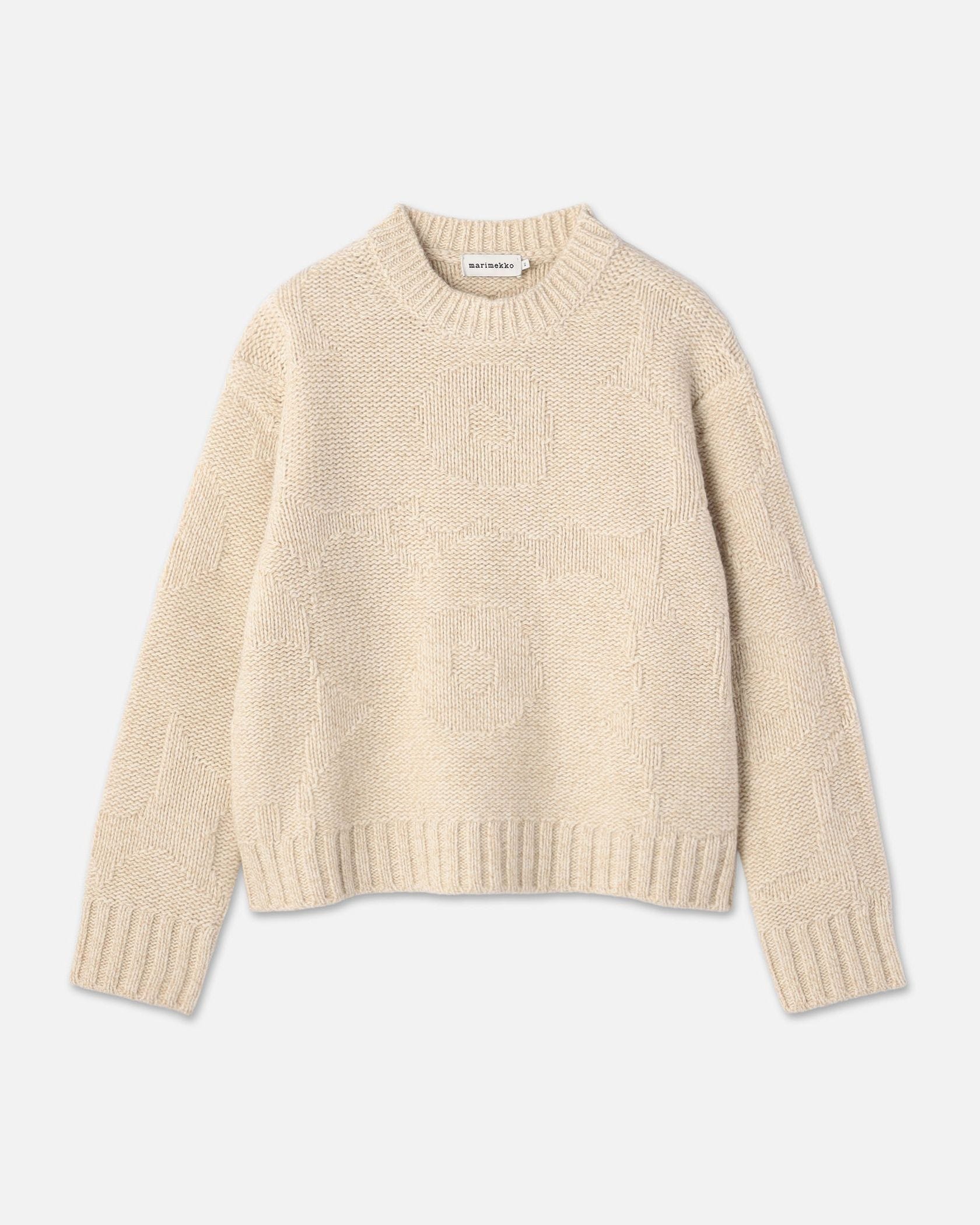 ゆったりとしたフィット感のモダンなシルエットの長袖ニット。Marimekkoを代表するUnikko柄モチーフの編み模様がさりげなく華やかなデザイン。袖口と裾には幅のあるリブのアクセント。毛混合のあたたかな生地感で秋冬の寒いシーズンにぴったり。毎日のコーディネートで活躍するアイテムです。