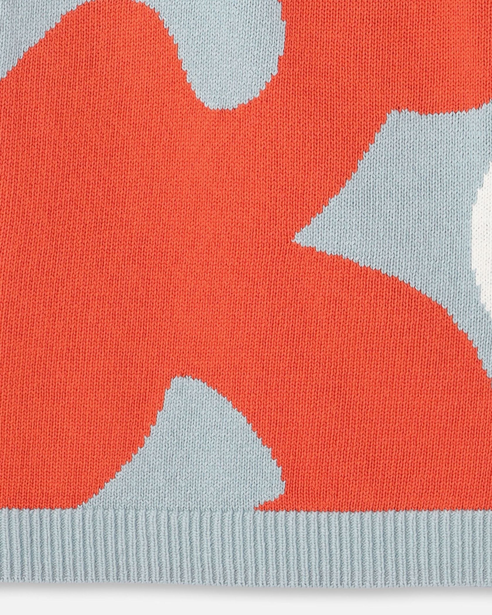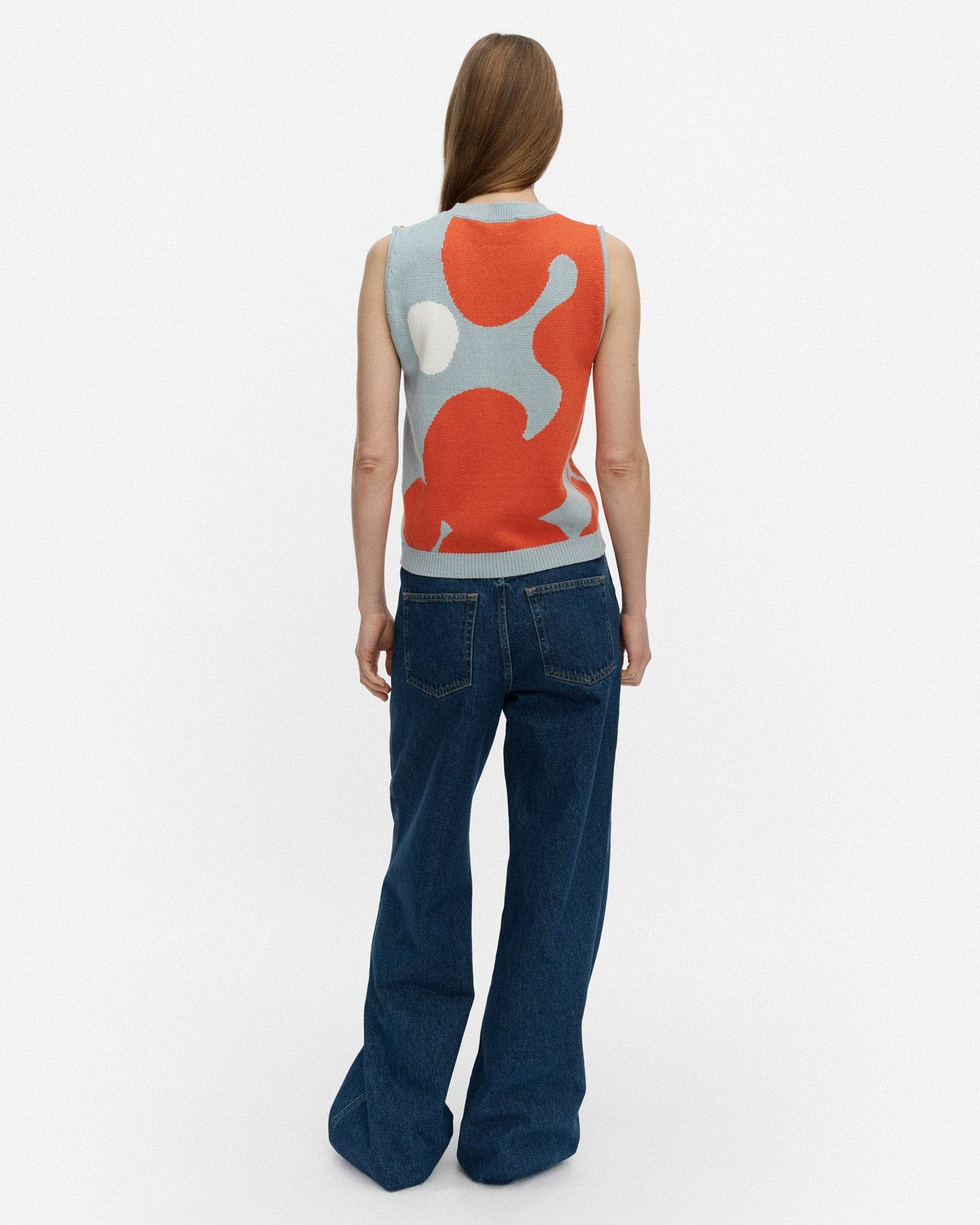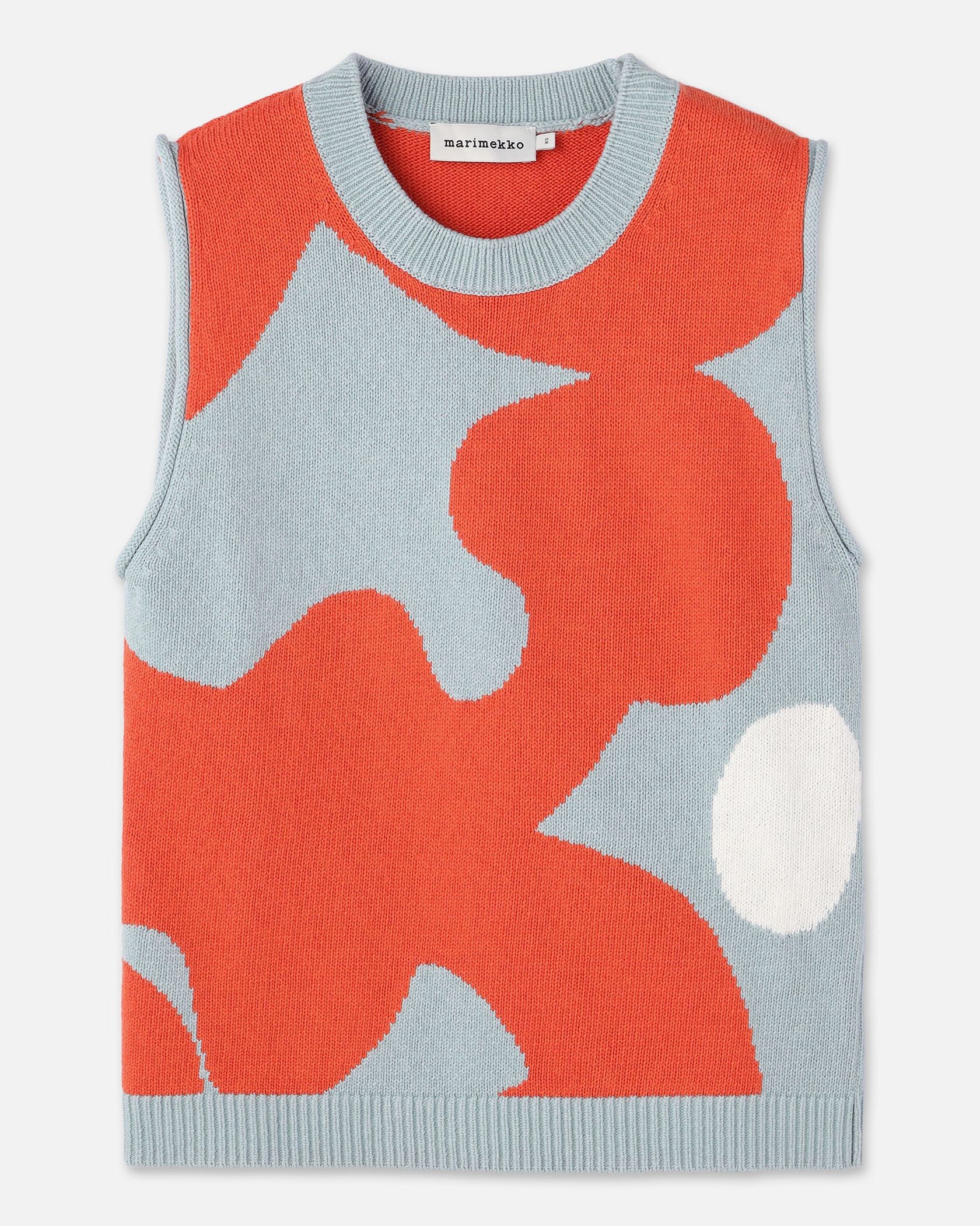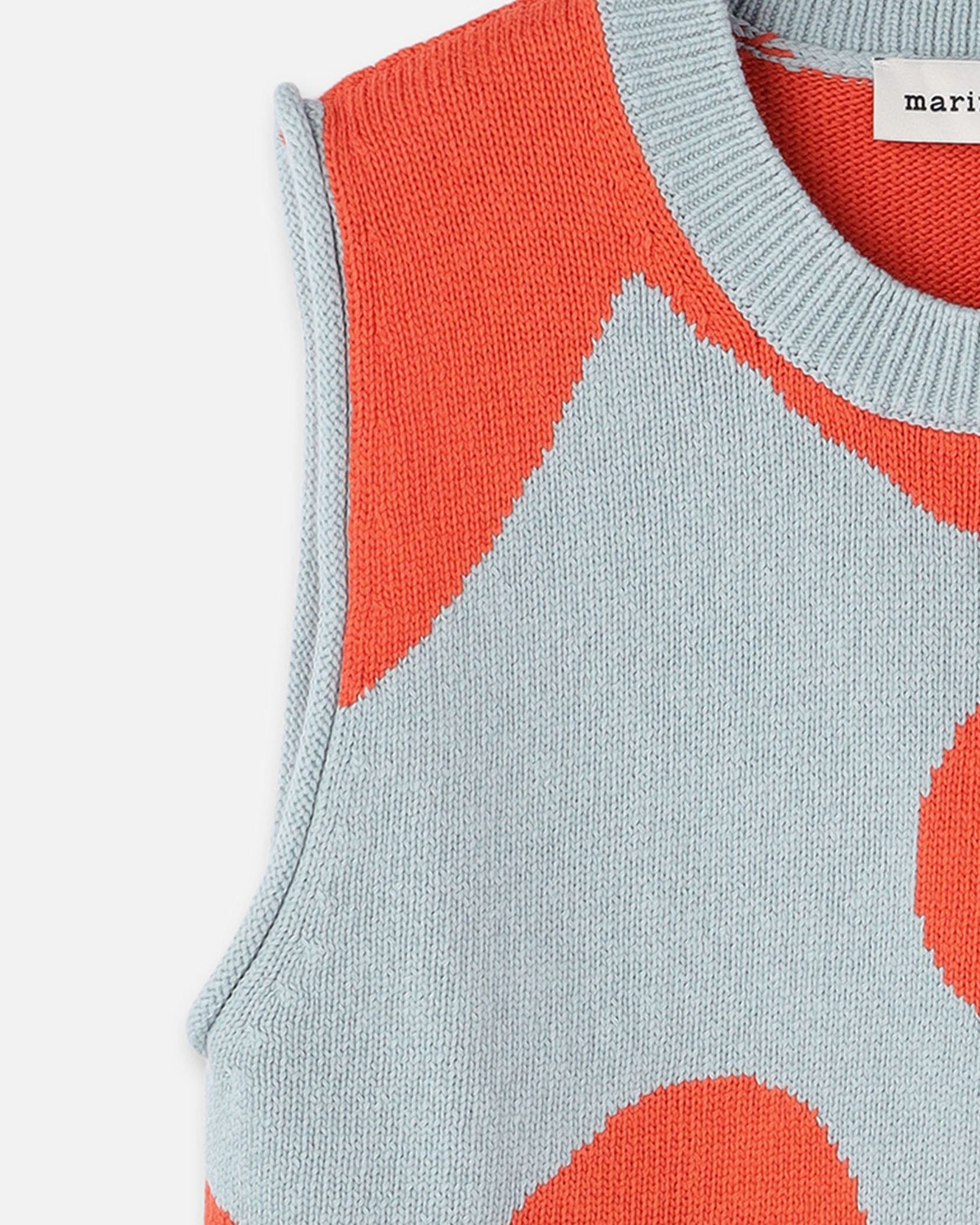 ダークオレンジとライトブルーのコンビで表現したKeidasパターンのノースリーブニットです。スリム&ストレートなシルエット。コットン100%素材を採用しており、Oネックと裾はリブ編みで切り替え、袖の端はくるっと巻いて仕上げています。