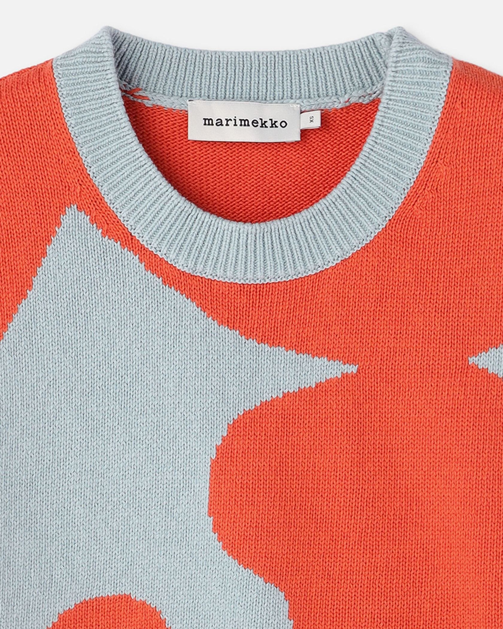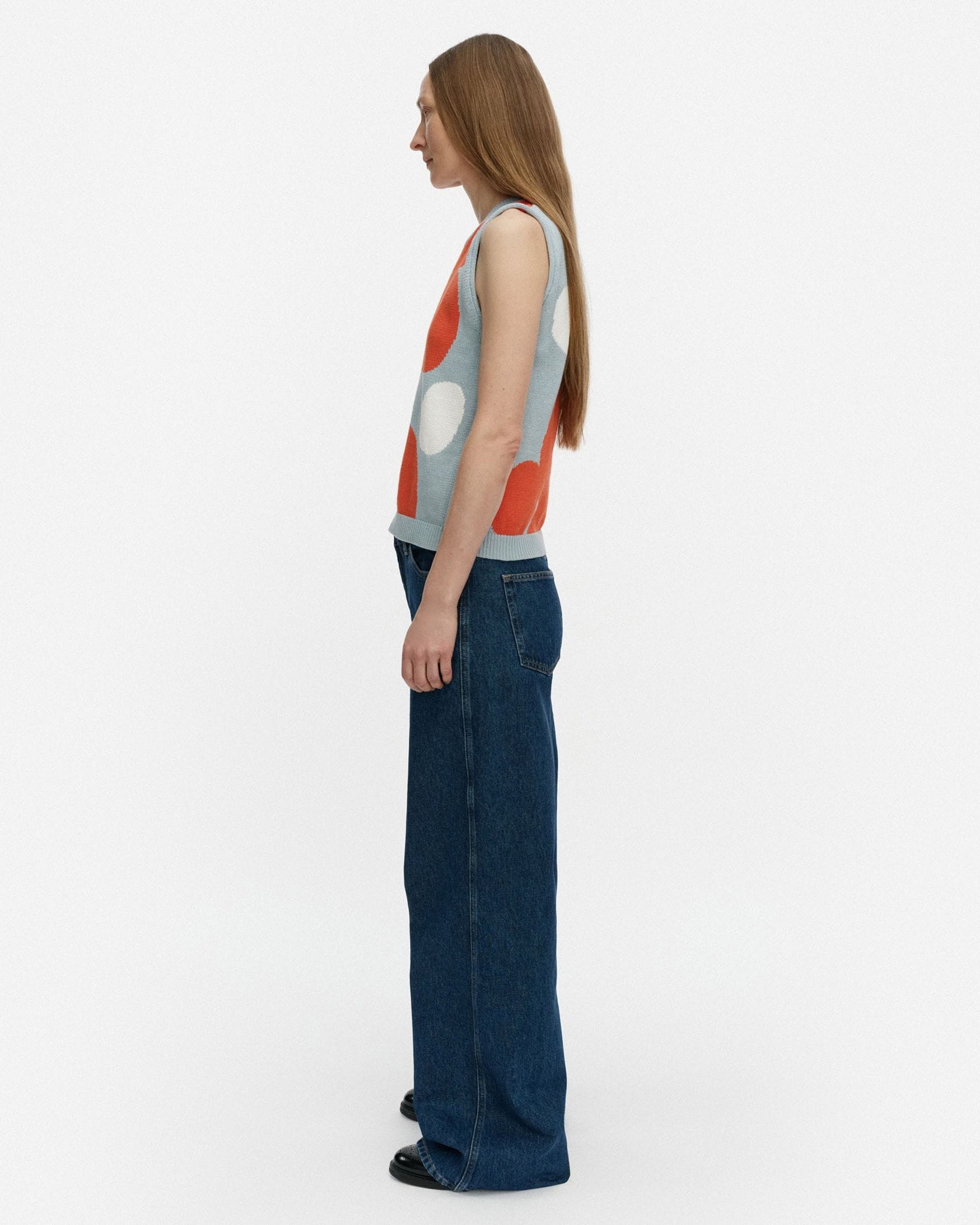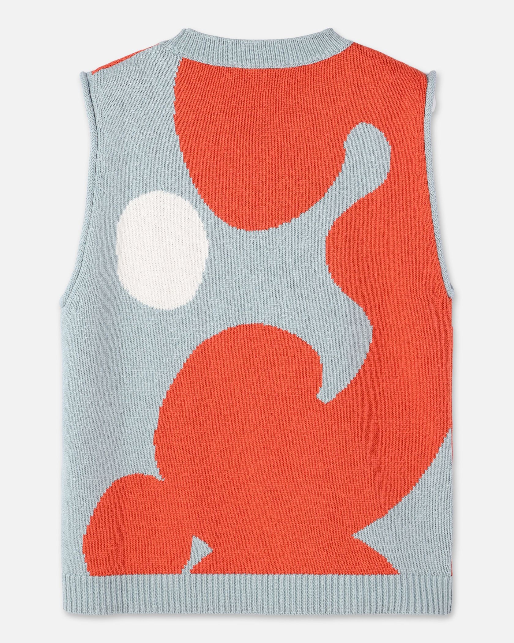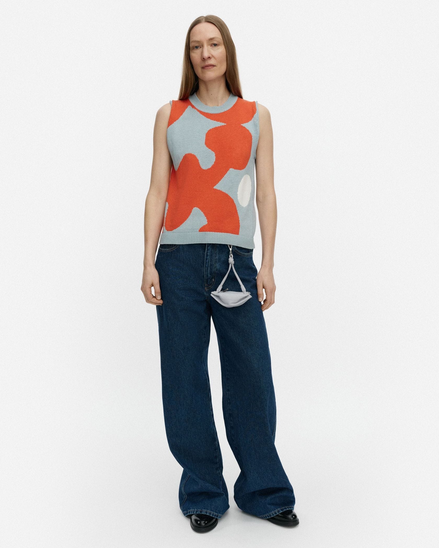 ダークオレンジとライトブルーのコンビで表現したKeidasパターンのノースリーブニットです。スリム&ストレートなシルエット。コットン100%素材を採用しており、Oネックと裾はリブ編みで切り替え、袖の端はくるっと巻いて仕上げています。