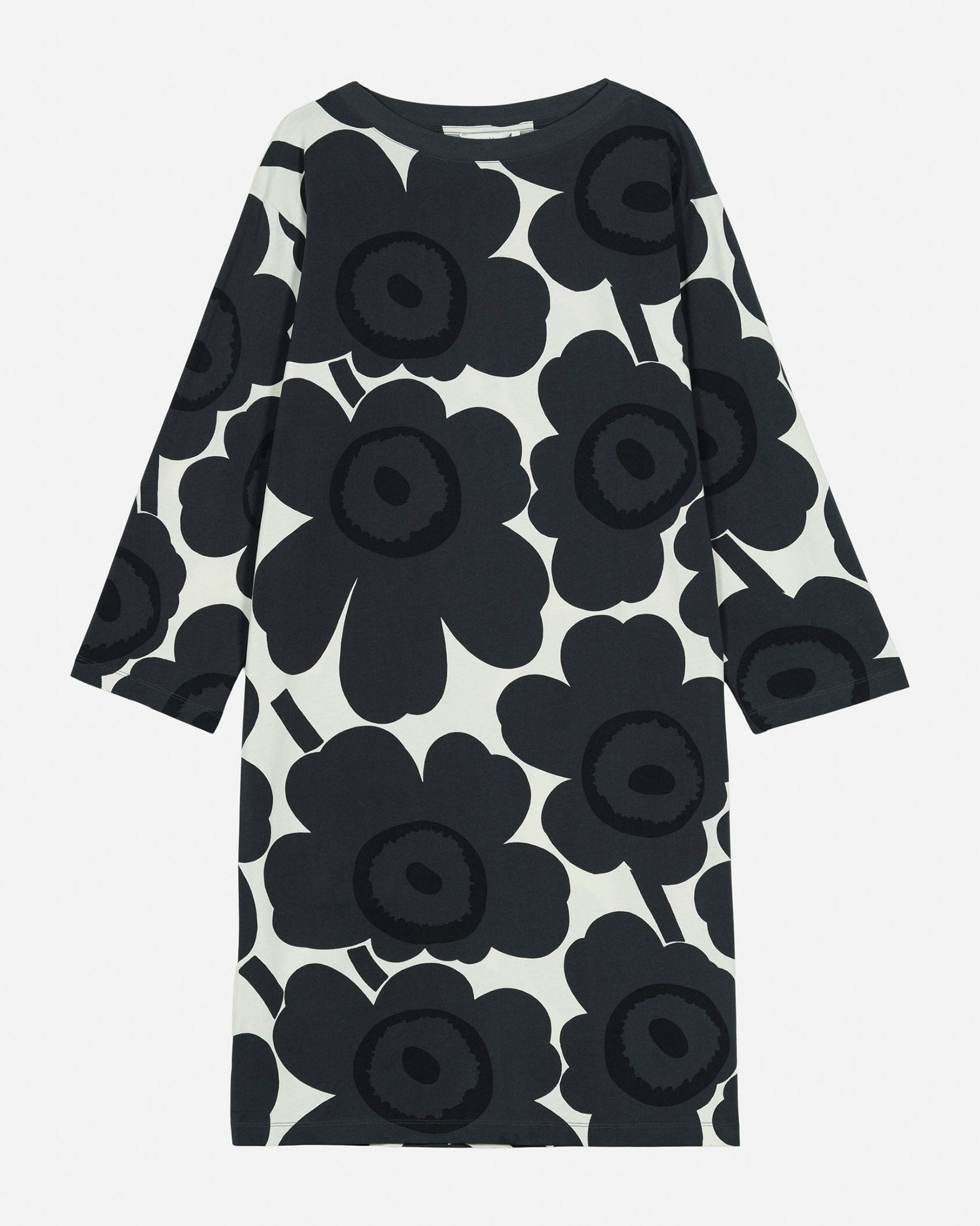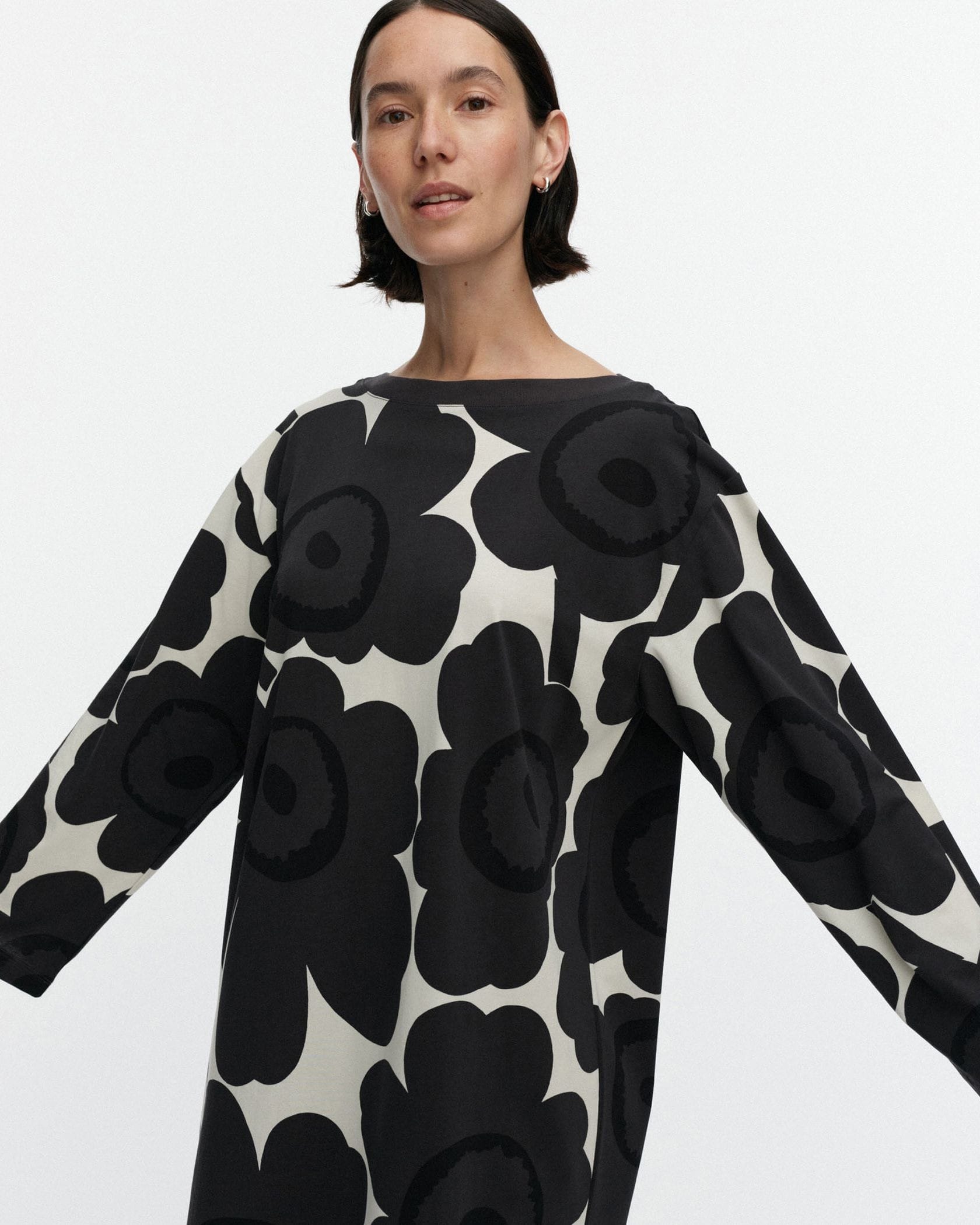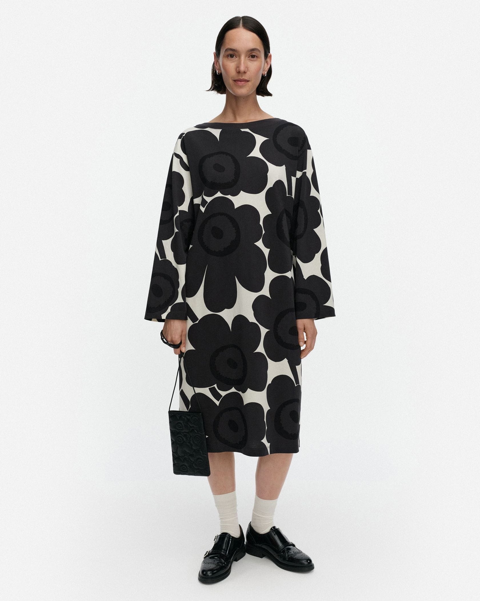 Marimekkoを代表するUnikko柄モチーフを大きくプリントしたインパクトのあるデザインのワンピース。ボートネック、ゆとりのあるストレートカットのシルエットと幅のある袖がモダンなムードを演出。フラワーモチーフが華やかなデザインで、スタイリッシュなお出かけコーディネートが完成するアイテムです。