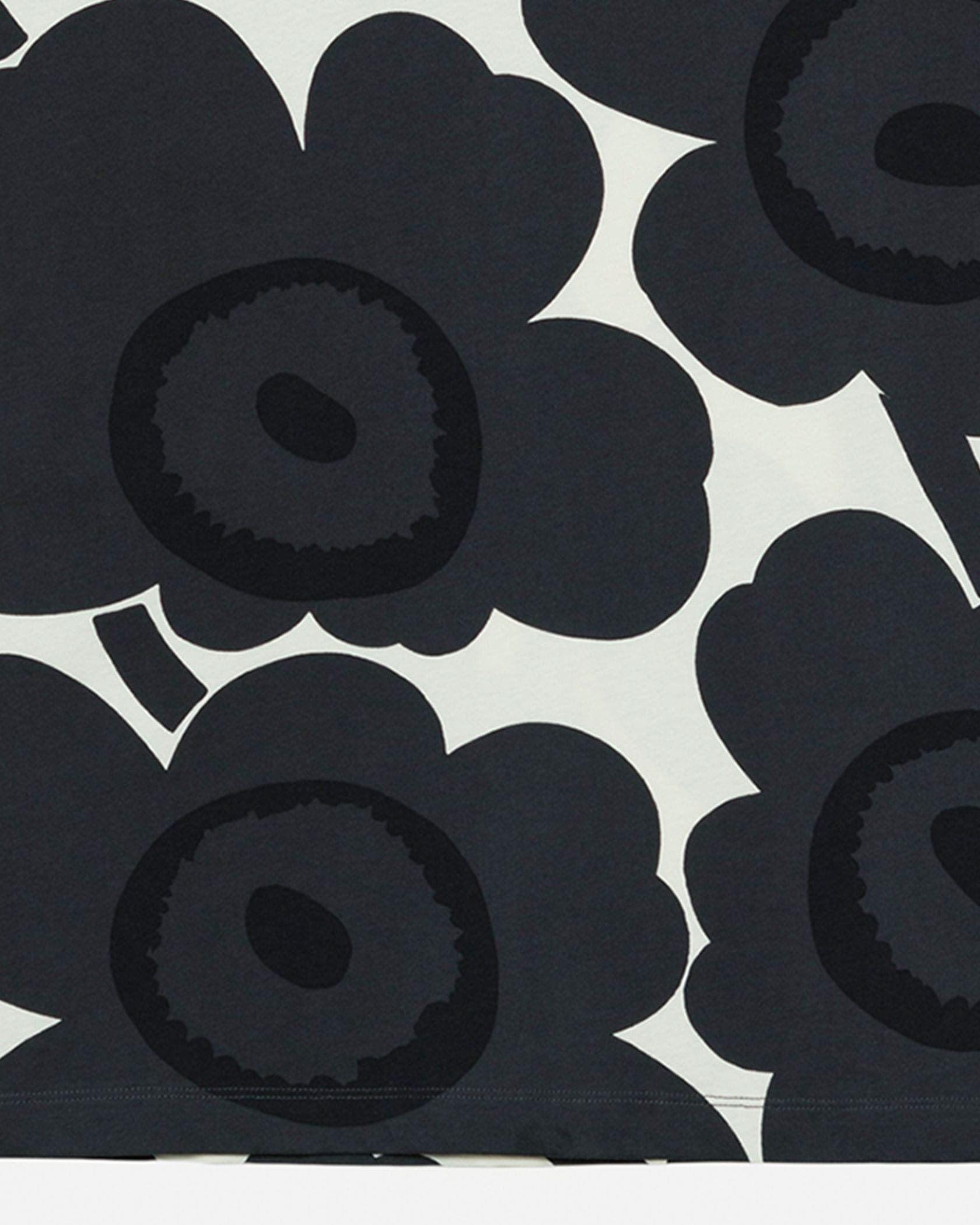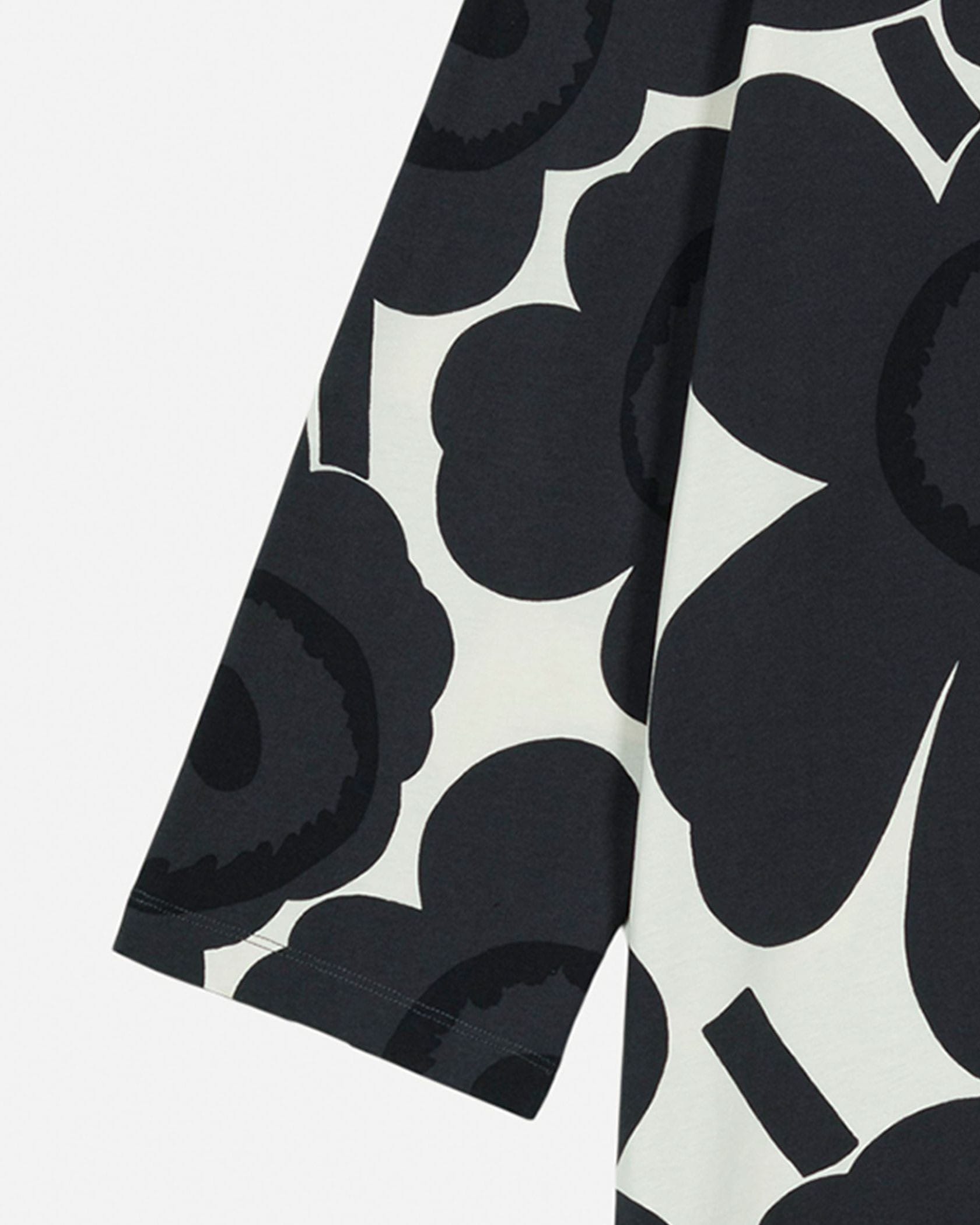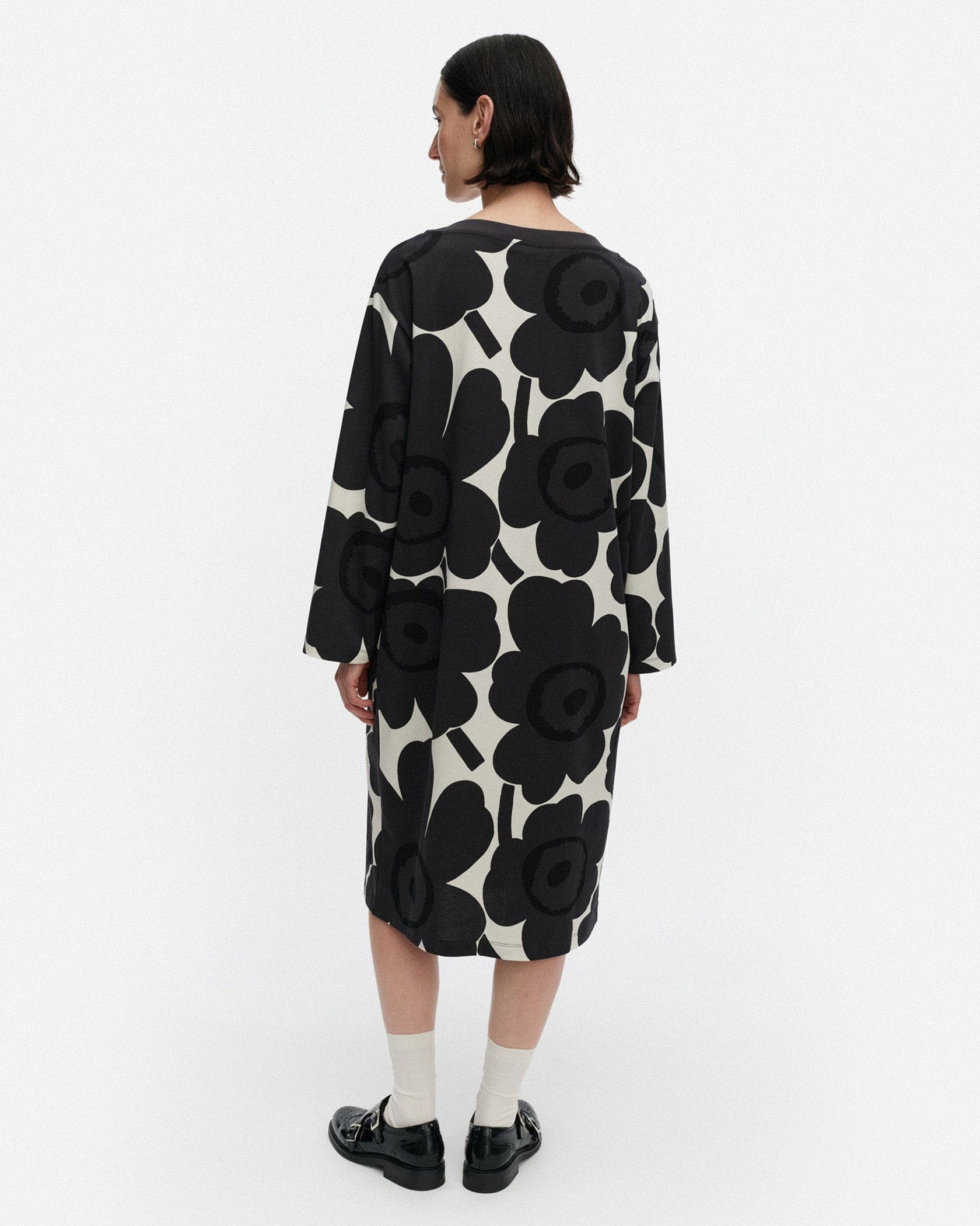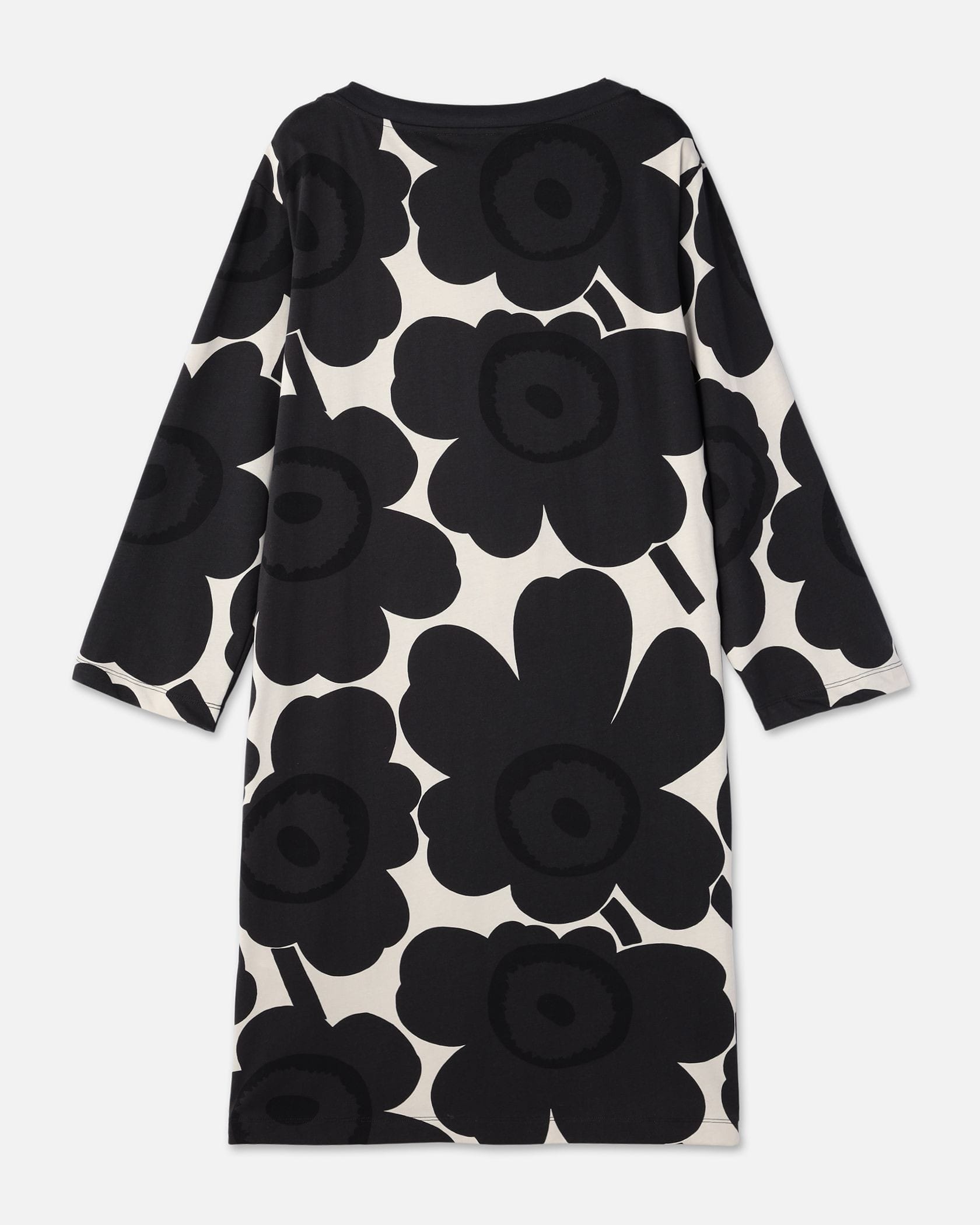Marimekkoを代表するUnikko柄モチーフを大きくプリントしたインパクトのあるデザインのワンピース。ボートネック、ゆとりのあるストレートカットのシルエットと幅のある袖がモダンなムードを演出。フラワーモチーフが華やかなデザインで、スタイリッシュなお出かけコーディネートが完成するアイテムです。