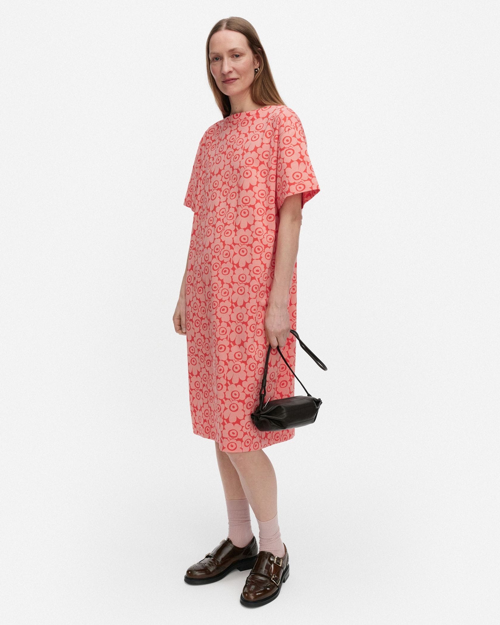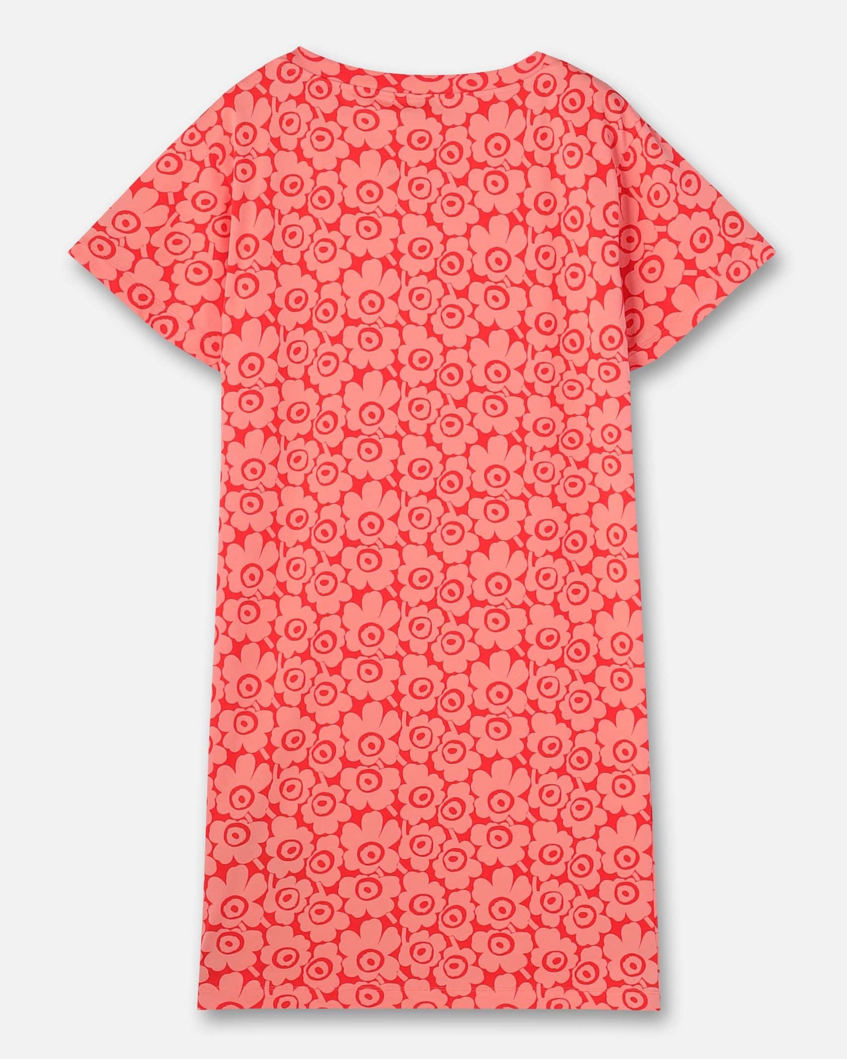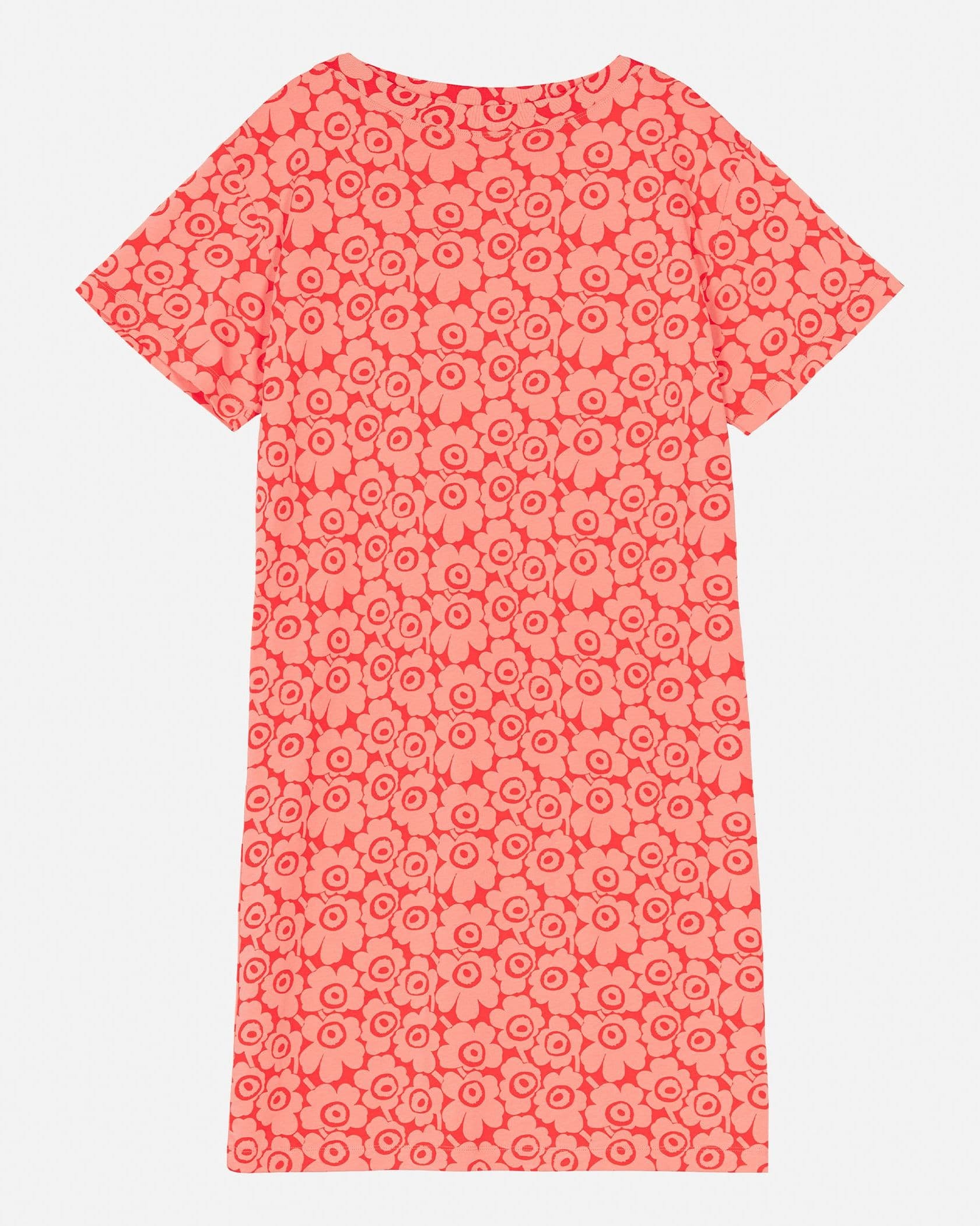 Marimekkoを代表するUnikko柄が目を惹く半袖ミディ丈ワンピース。全面にプリントされた細かなフラワープリントが華やかなデザイン。ボートネックの首元とゆとりのあるモダンなシルエットも魅力。さっと一枚着るだけで、スタイリッシュなお出かけコーディネートが完成する便利なアイテムです。