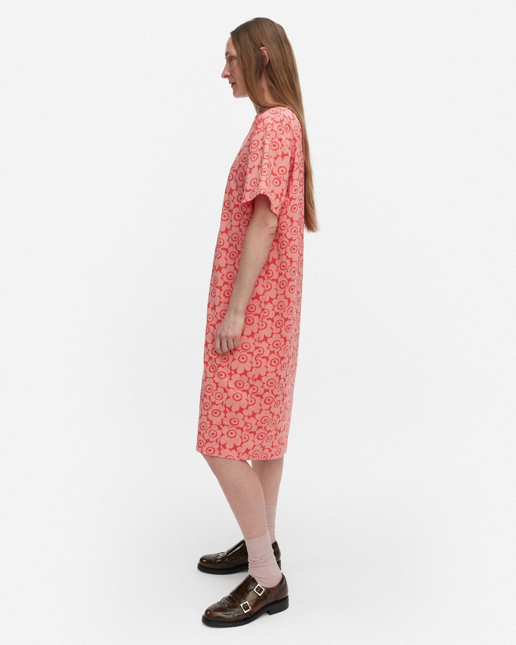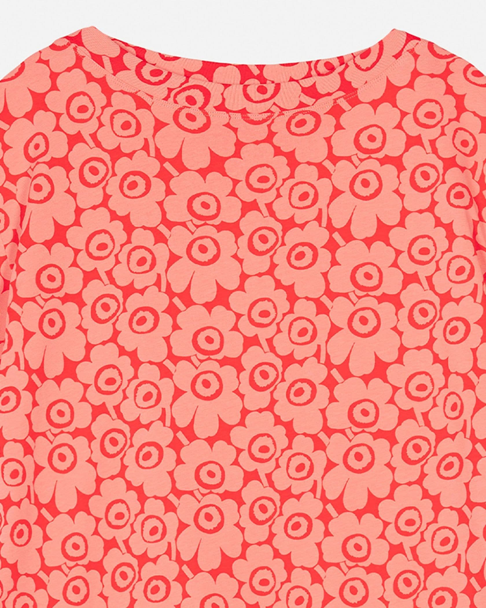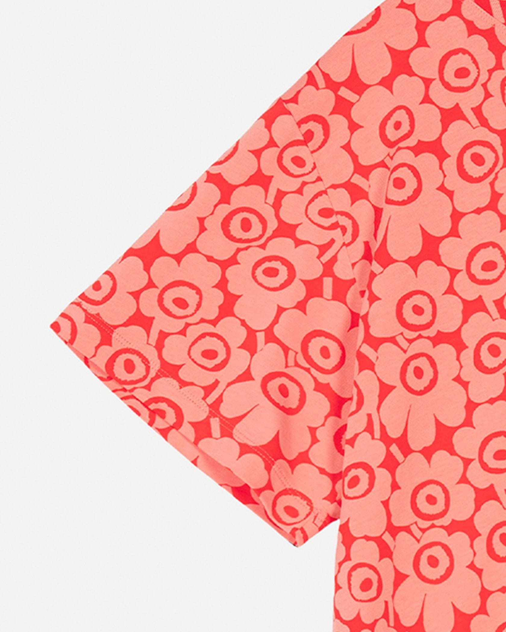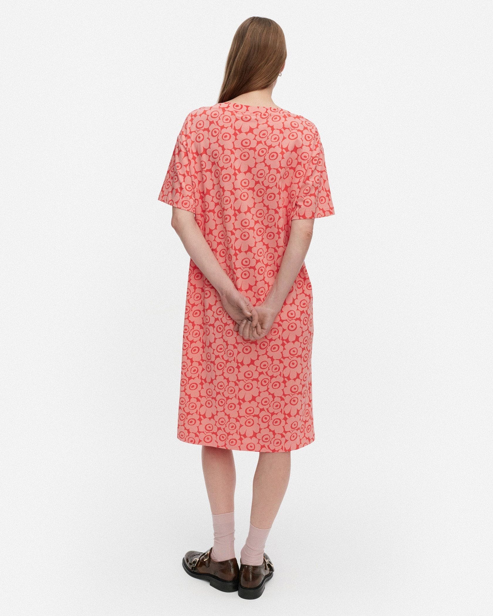 Marimekkoを代表するUnikko柄が目を惹く半袖ミディ丈ワンピース。全面にプリントされた細かなフラワープリントが華やかなデザイン。ボートネックの首元とゆとりのあるモダンなシルエットも魅力。さっと一枚着るだけで、スタイリッシュなお出かけコーディネートが完成する便利なアイテムです。