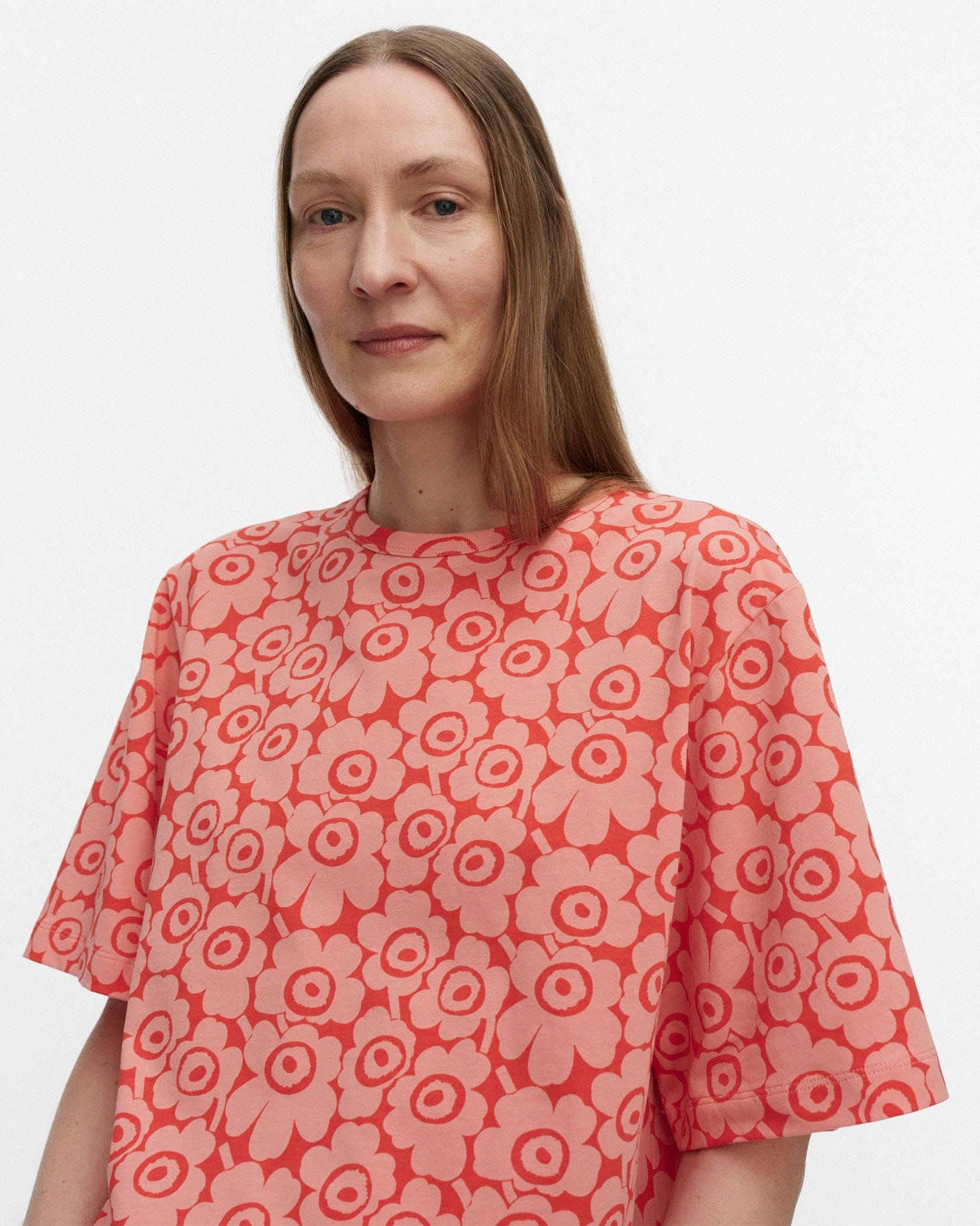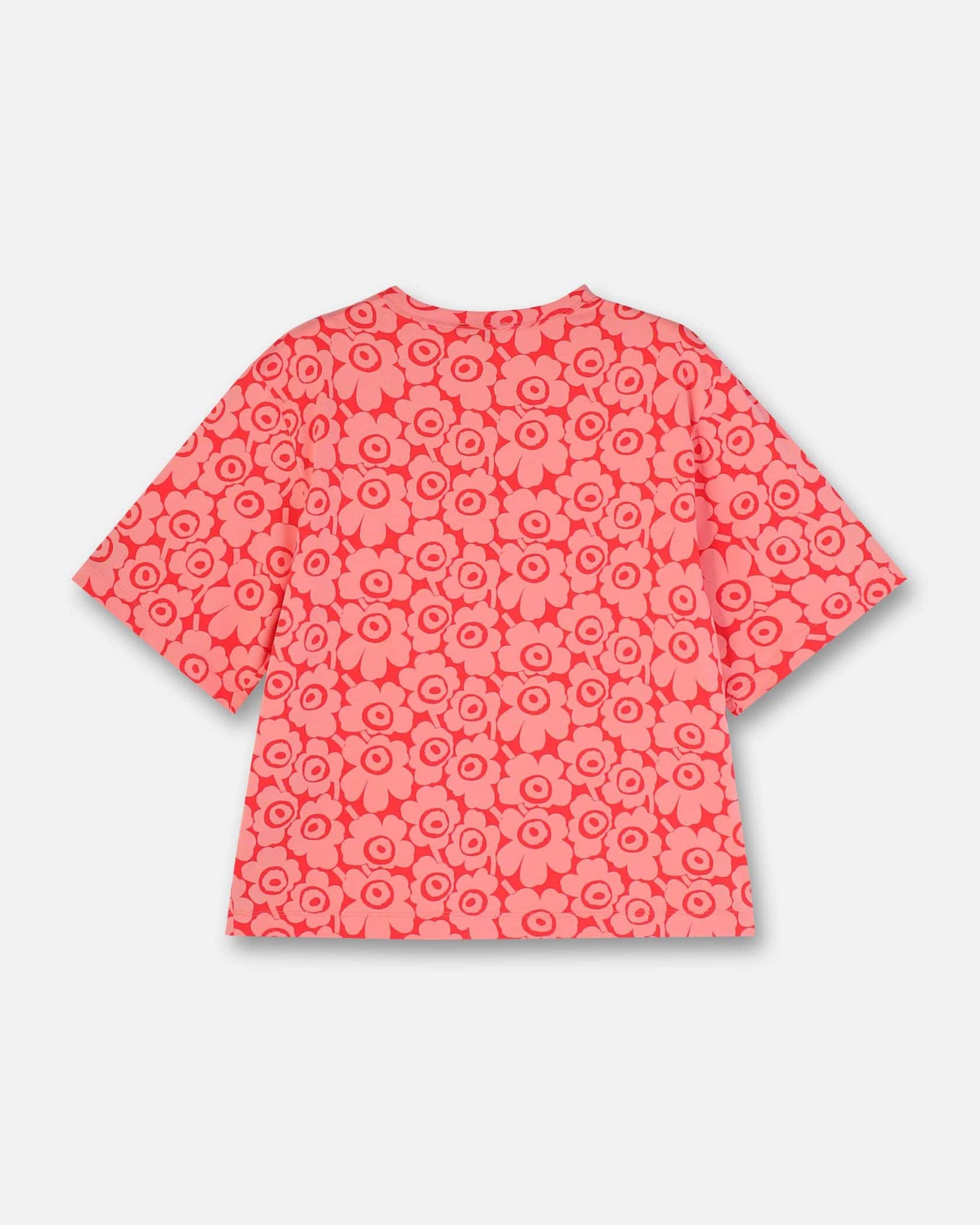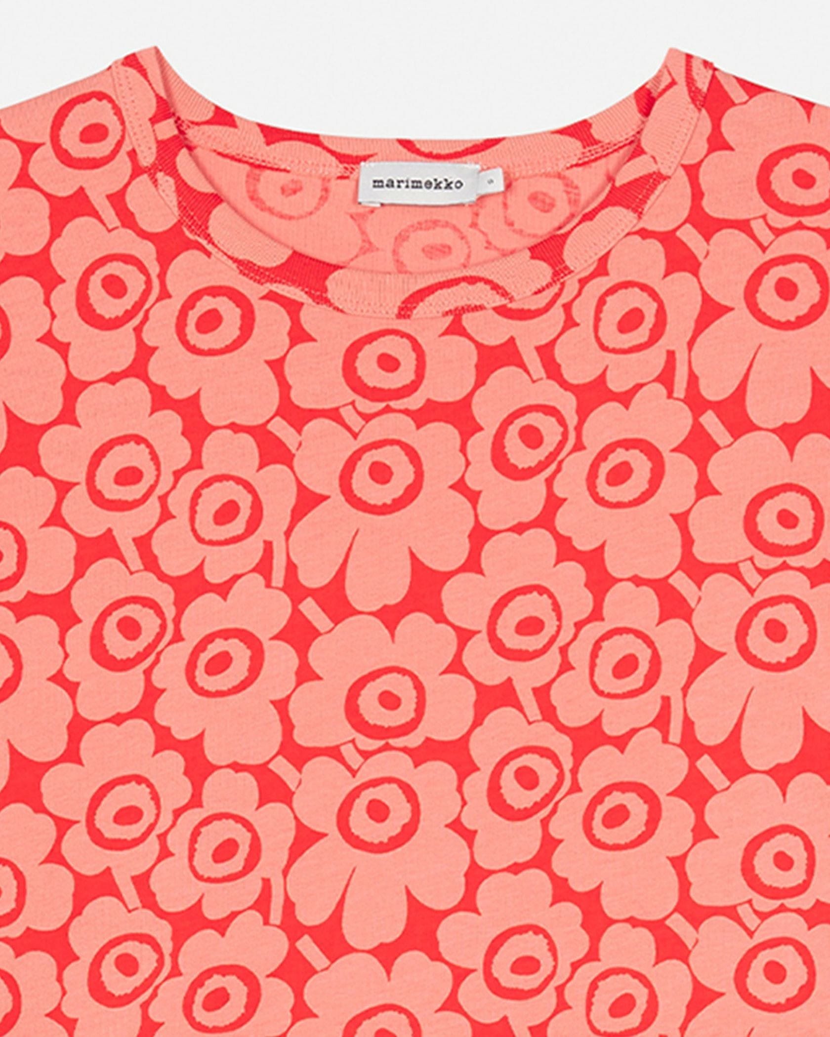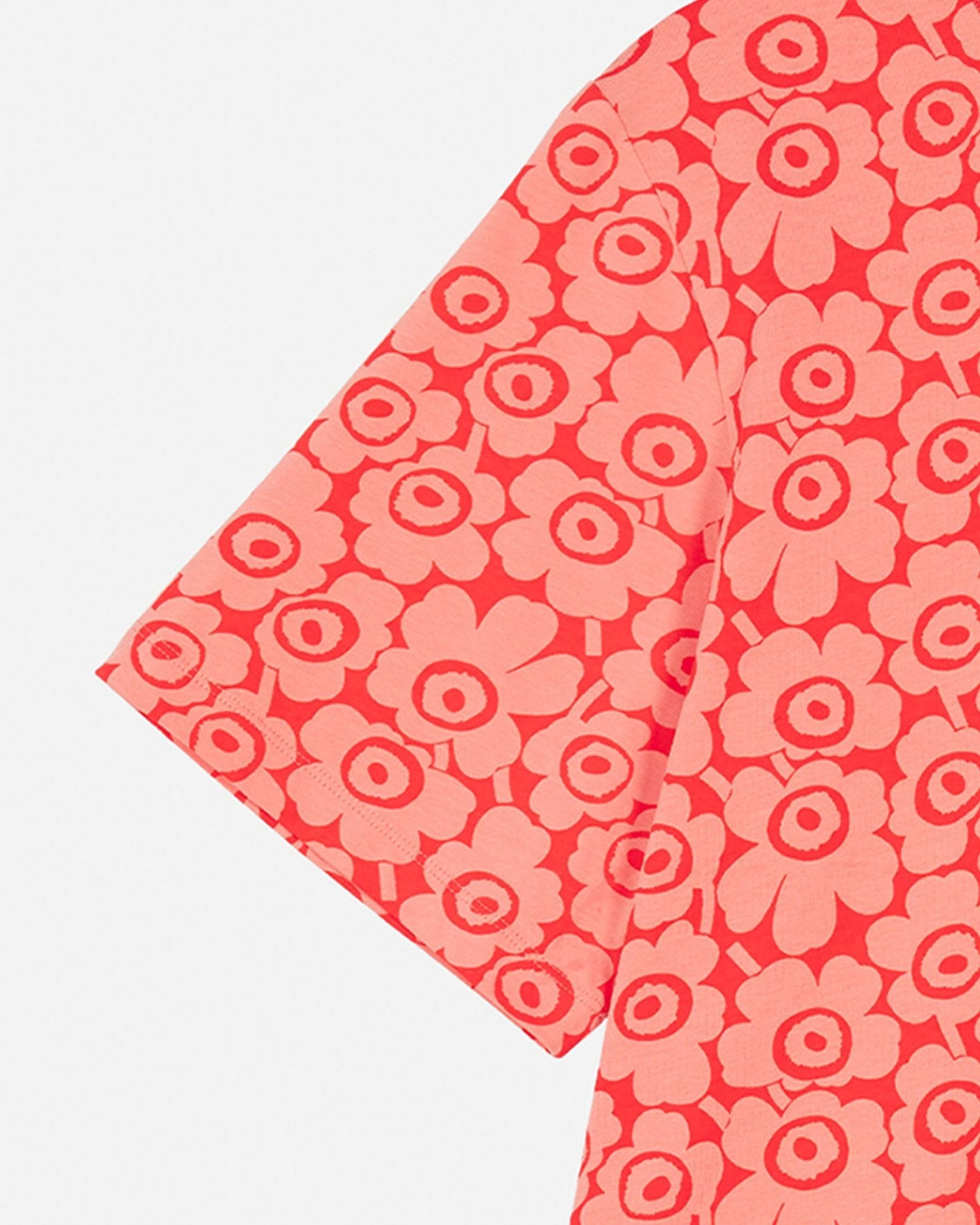 Marimekkoを代表するUnikko柄が目を惹く半袖Tシャツ。全面にプリントされた細かなフラワープリントが華やかなデザイン。モダンなムードのOネック、肩から落ちる幅のある袖、ゆとりのあるシルエットも魅力。お手持ちのボトムに合わせて、スタイリッシュなお出かけコーディネートが完成します。