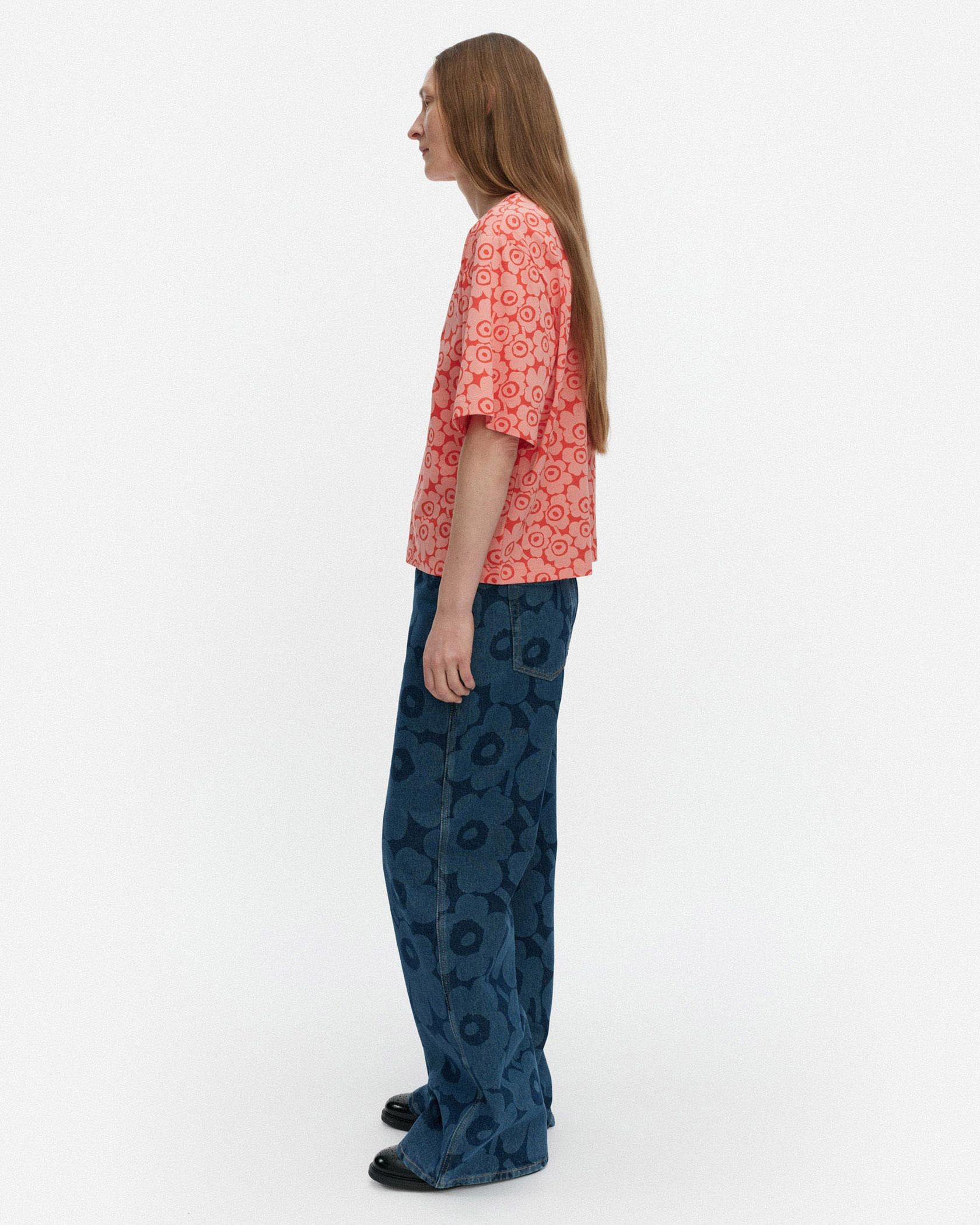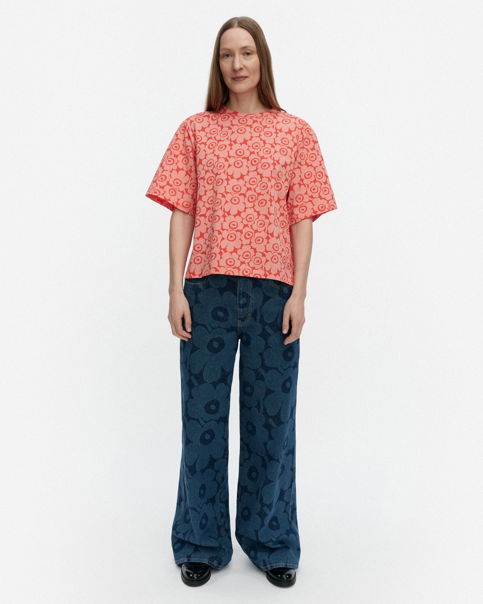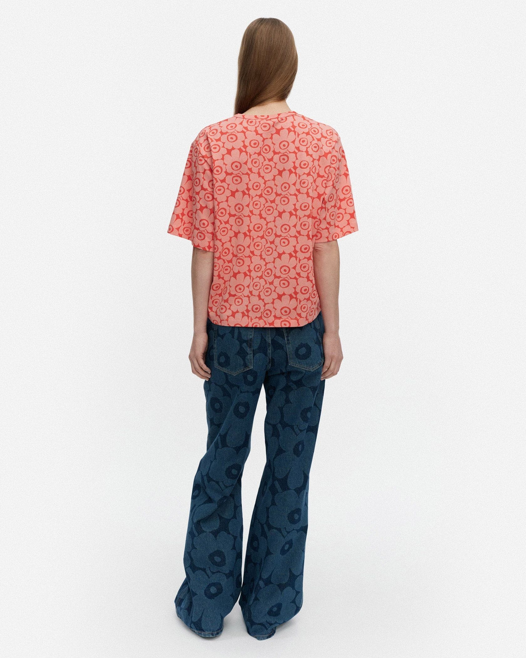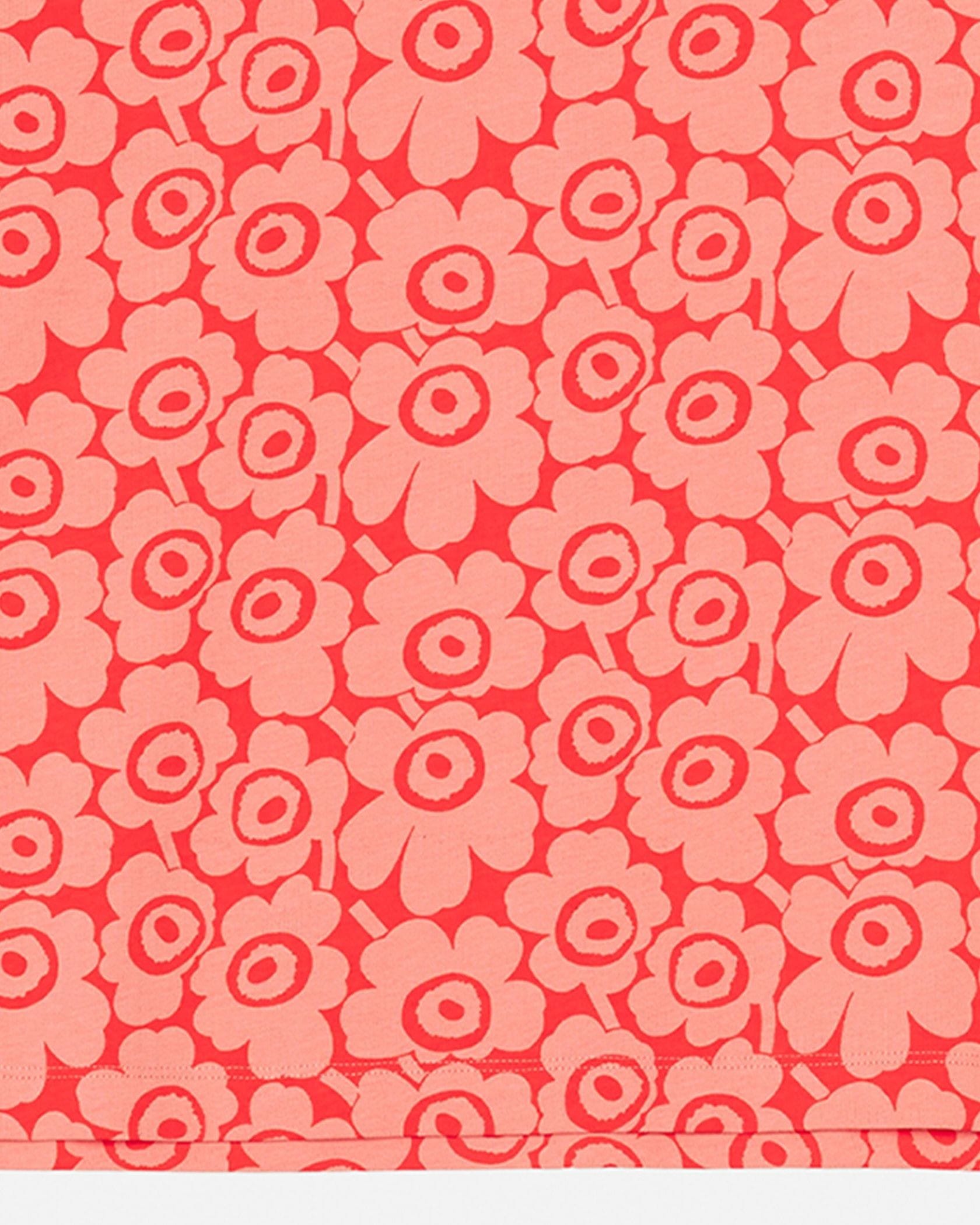 Marimekkoを代表するUnikko柄が目を惹く半袖Tシャツ。全面にプリントされた細かなフラワープリントが華やかなデザイン。モダンなムードのOネック、肩から落ちる幅のある袖、ゆとりのあるシルエットも魅力。お手持ちのボトムに合わせて、スタイリッシュなお出かけコーディネートが完成します。