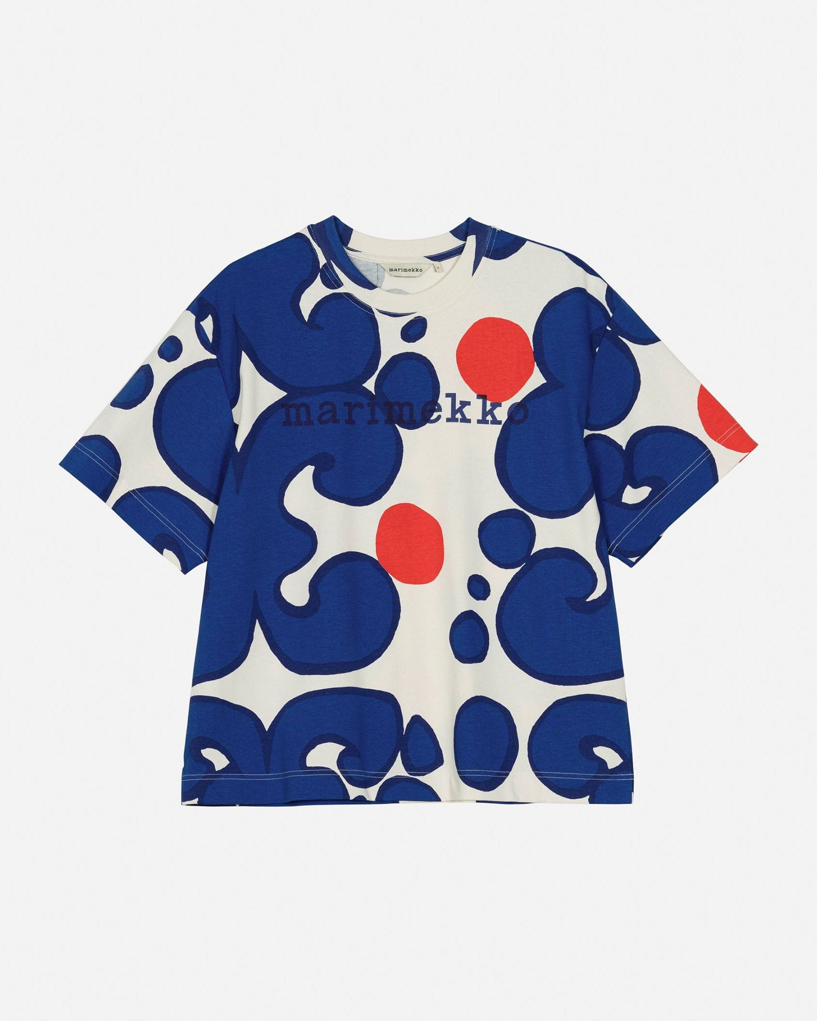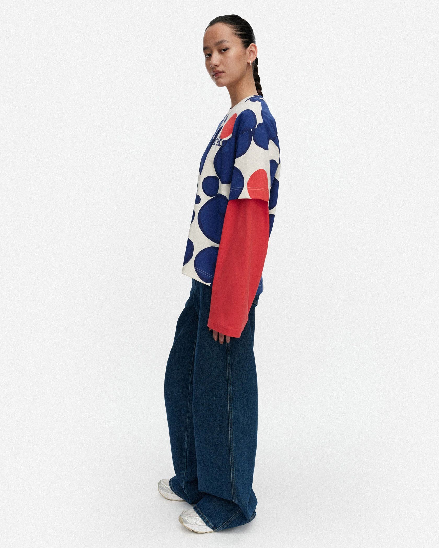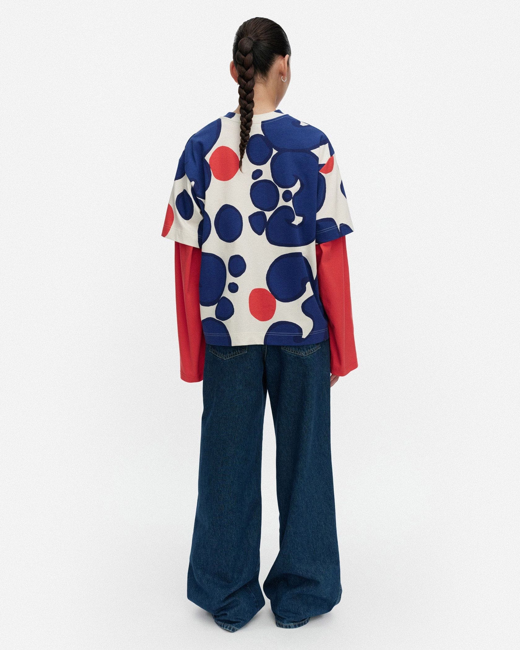 Marimekkoからオアシスを意味するKeidas(ケイダス)柄のTシャツが登場です。遠目にもインパクト抜群な配色プリント柄で、1枚着はもちろんインナーとしても存在感たっぷりにお使いいただけます。ゆったり着られるオーバーサイズのシルエットで、長袖をINしたレイヤードスタイルもおすすめです。