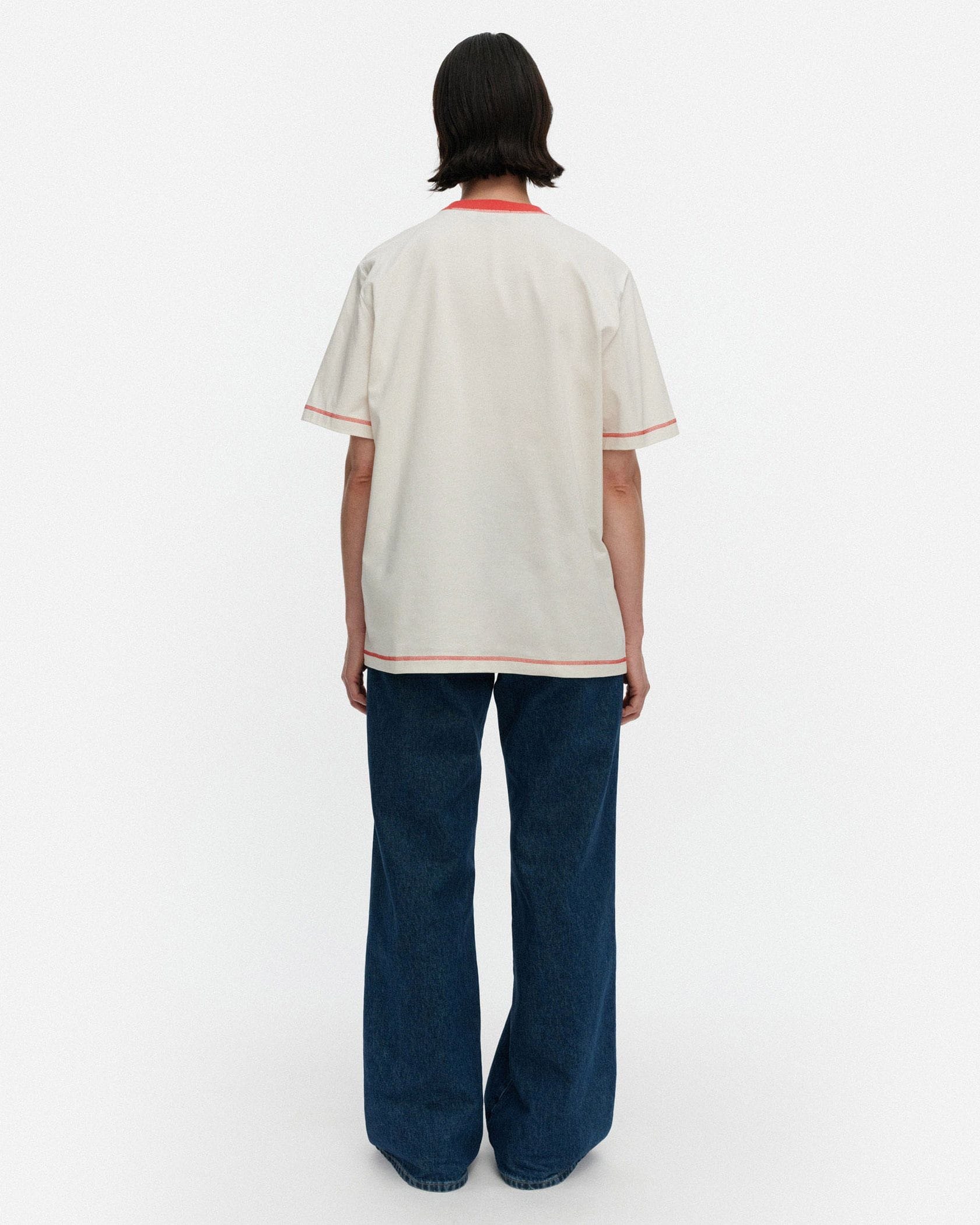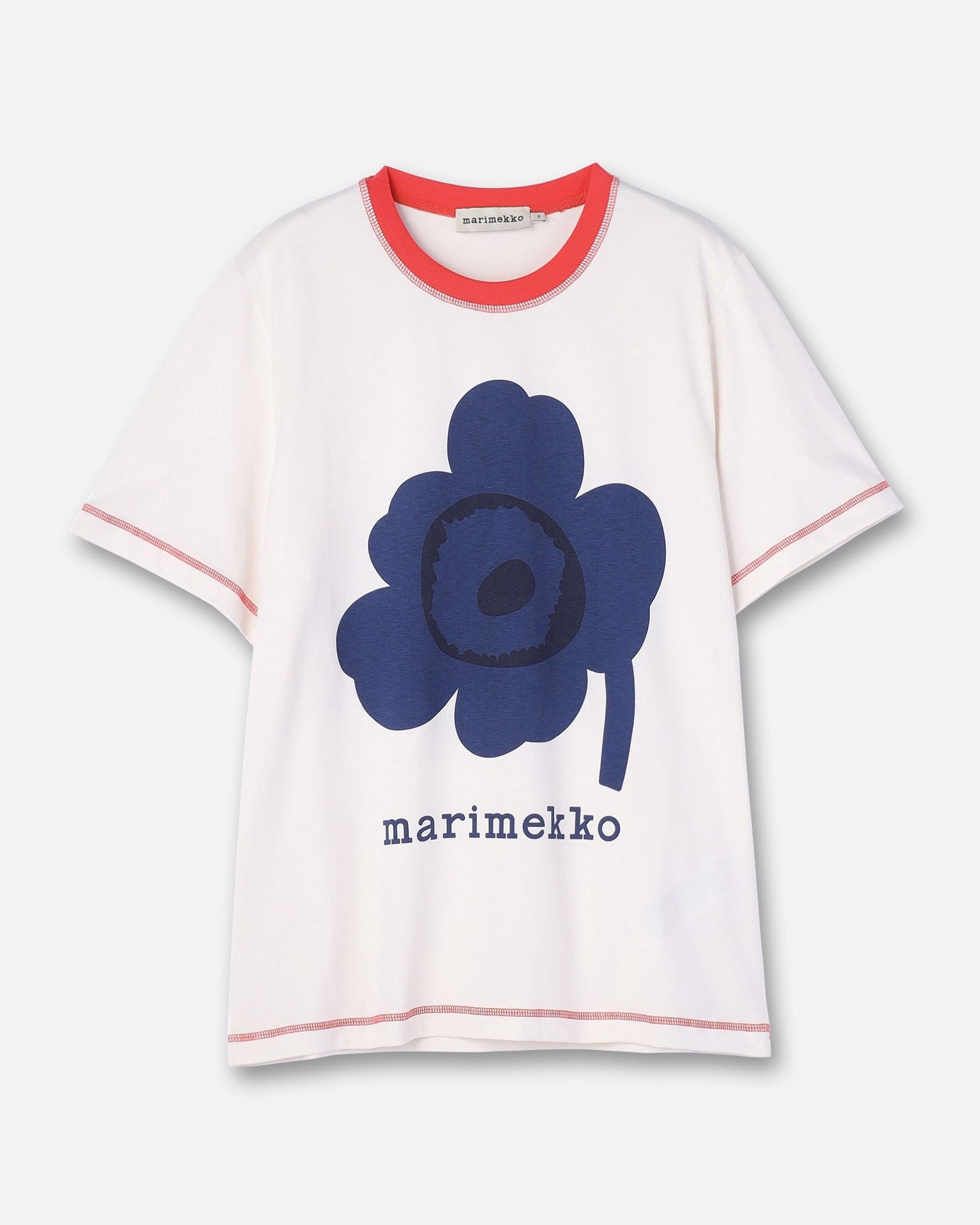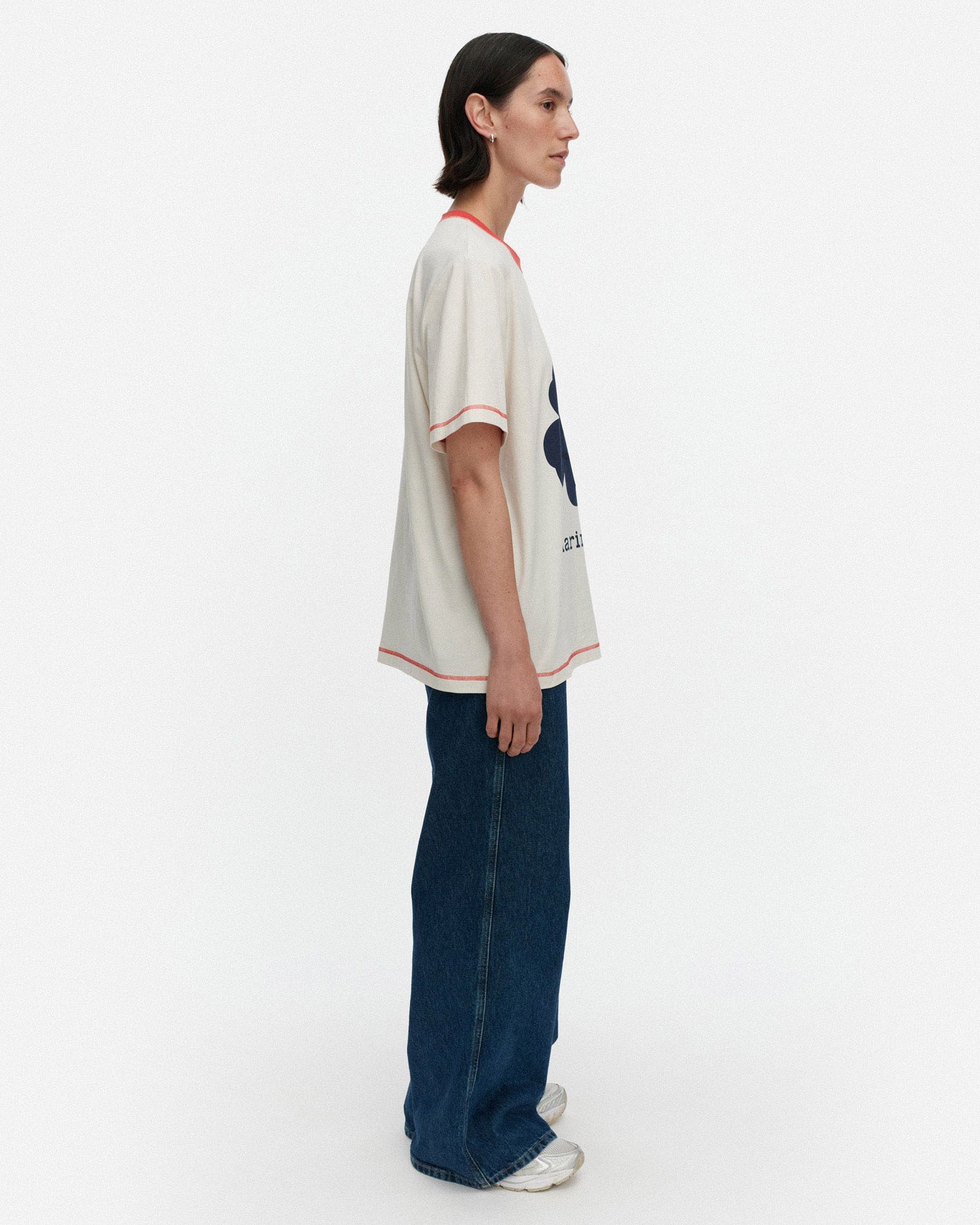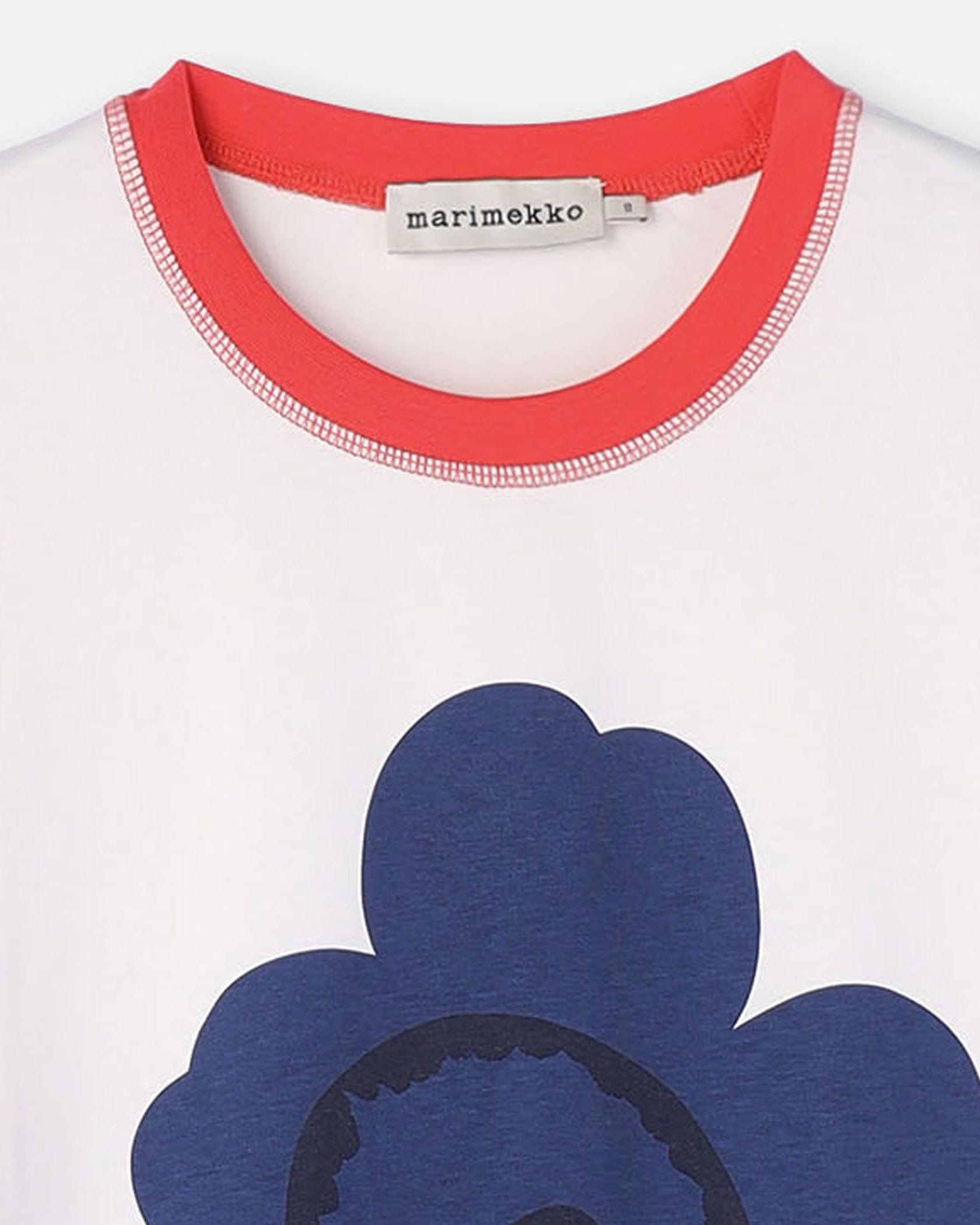 Marimekkoの人気シリーズ、Tarttua Unikko PlacementからTシャツが登場です。遠目にも存在感たっぷりなプリント柄、衿元や裾は配色ラインでアイテム全体に大人可愛いメリハリ感をプラスしました。オーバーサイズのシルエットでそのまま着流すのはもちろん、ボトムスINもおすすめです。