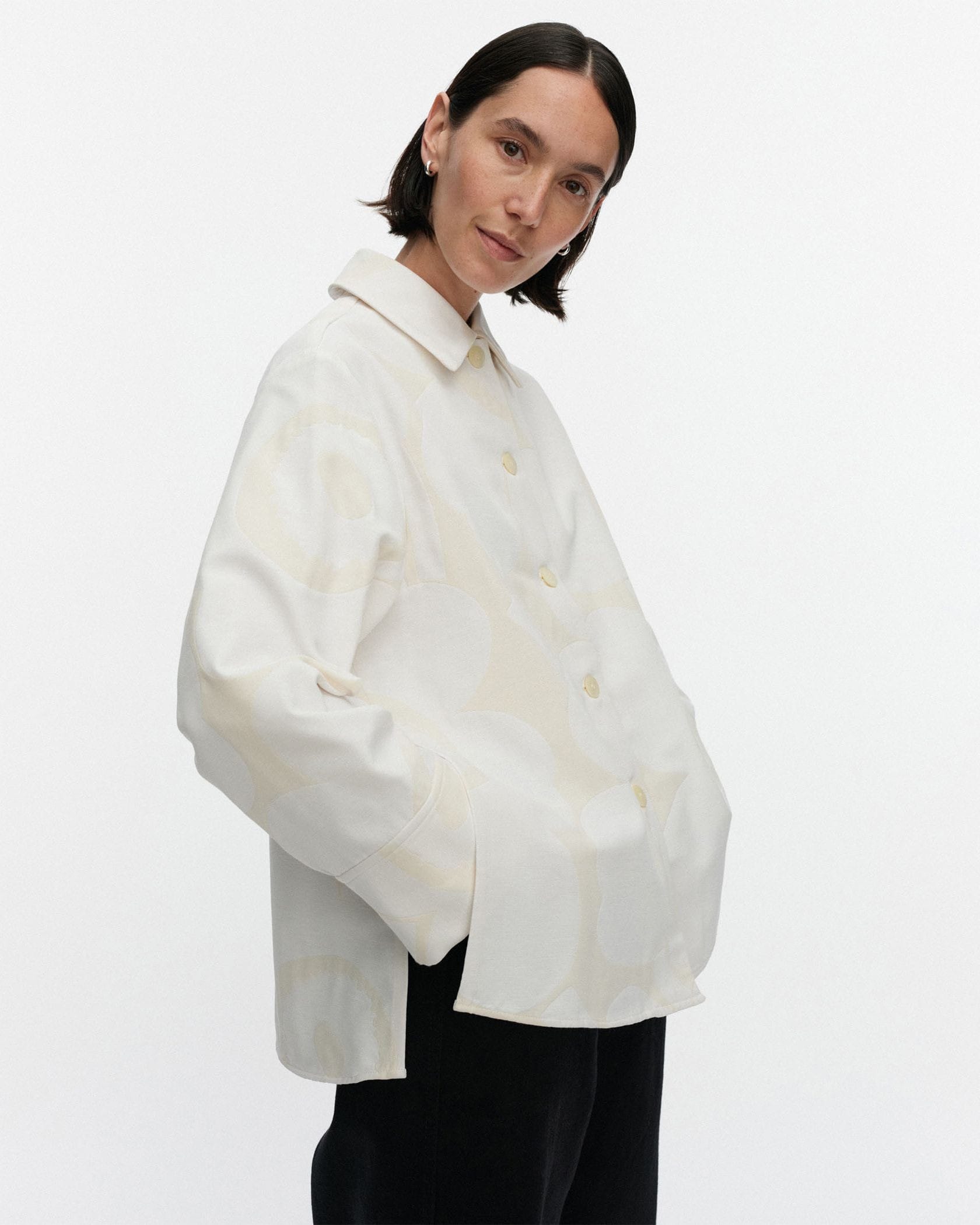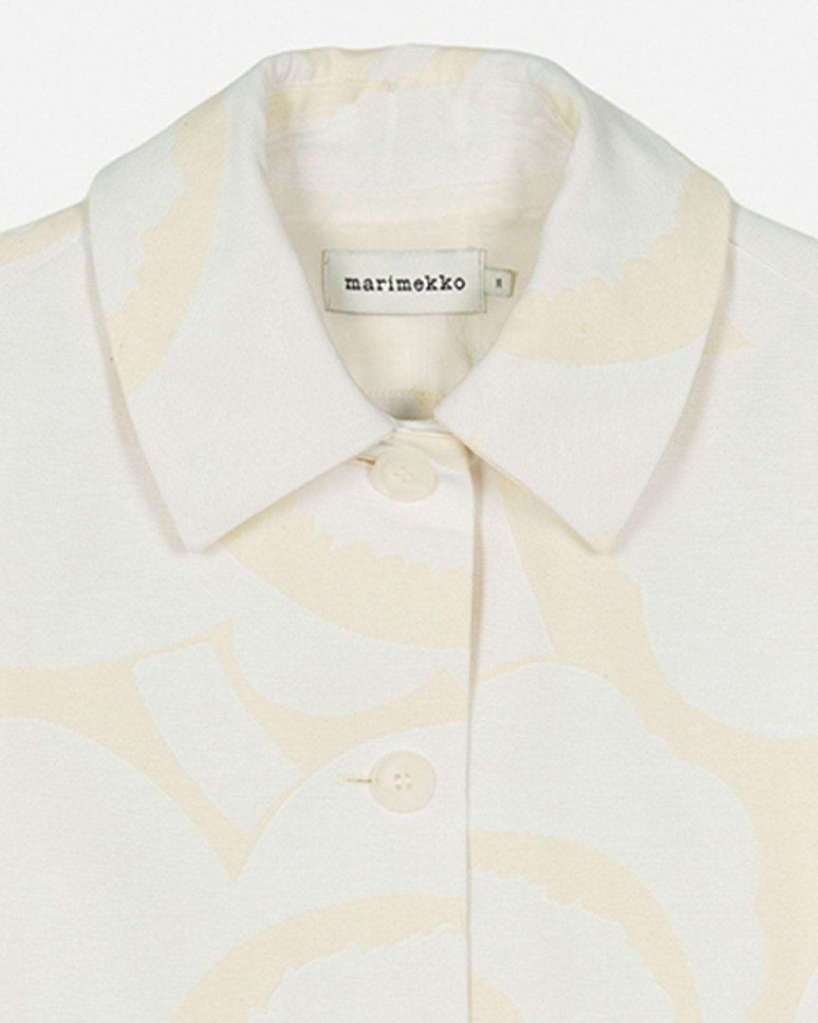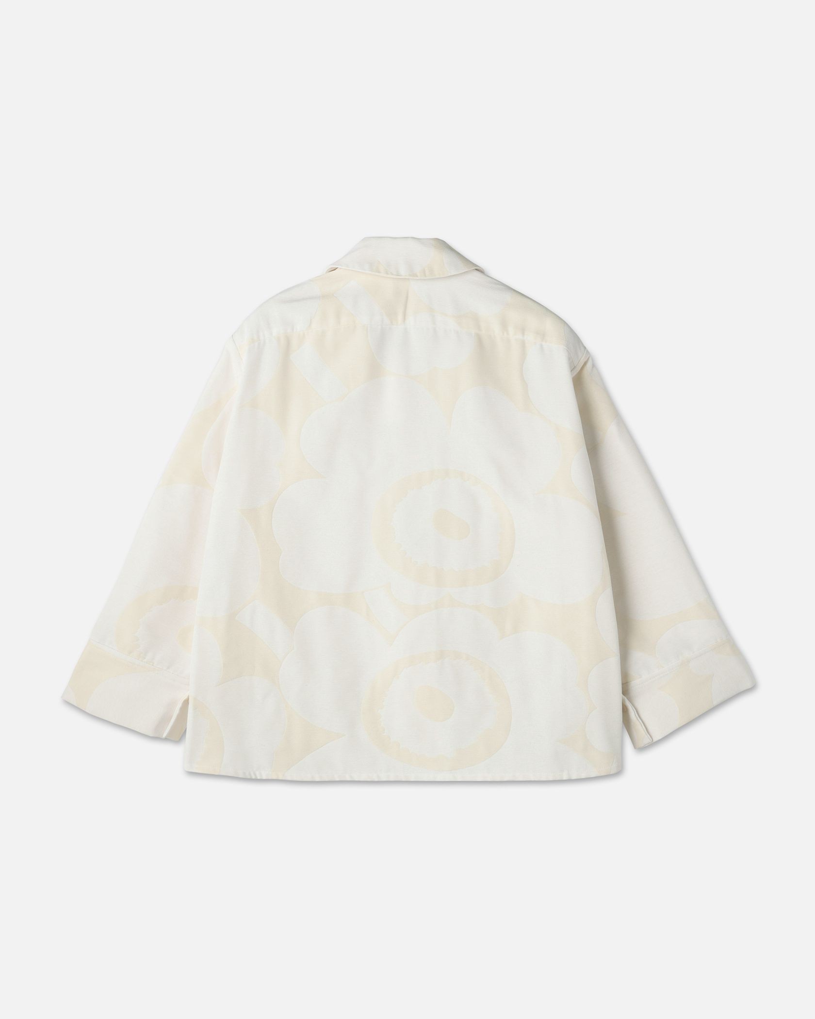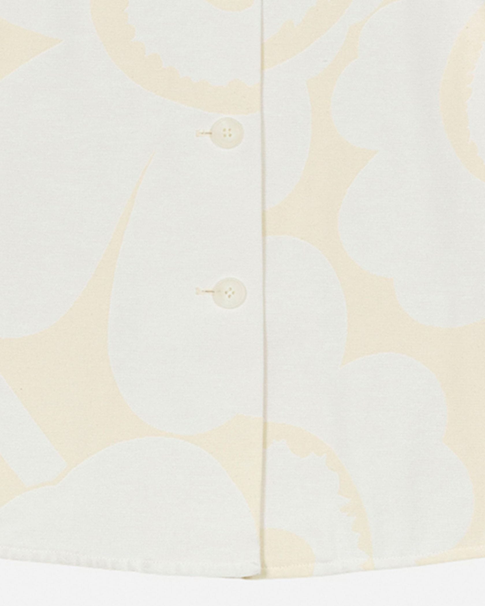 さりげないUnikko柄モチーフがシックなムードのボタンアップシャツ。オーバーサイズのストレートフィットがモダンなシルエット。大きなスリット入りのサイドシームの裾、大きな襟、バックヨークのシームがスタイリッシュなデザインポイント。いつもの着こなしにプラスして華やかなコーディネートが実現します。