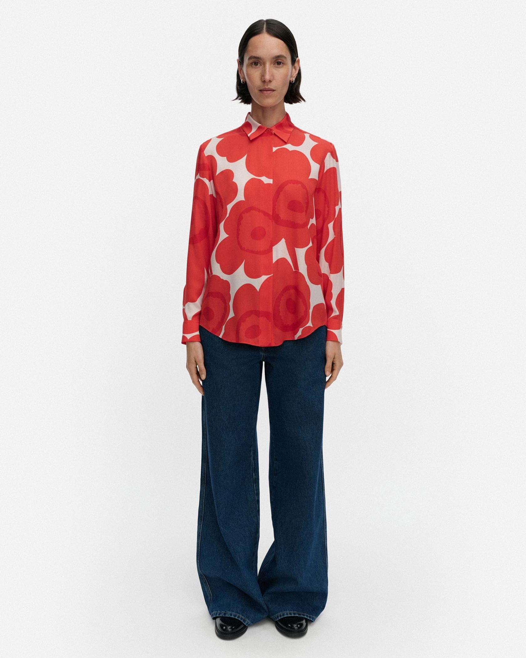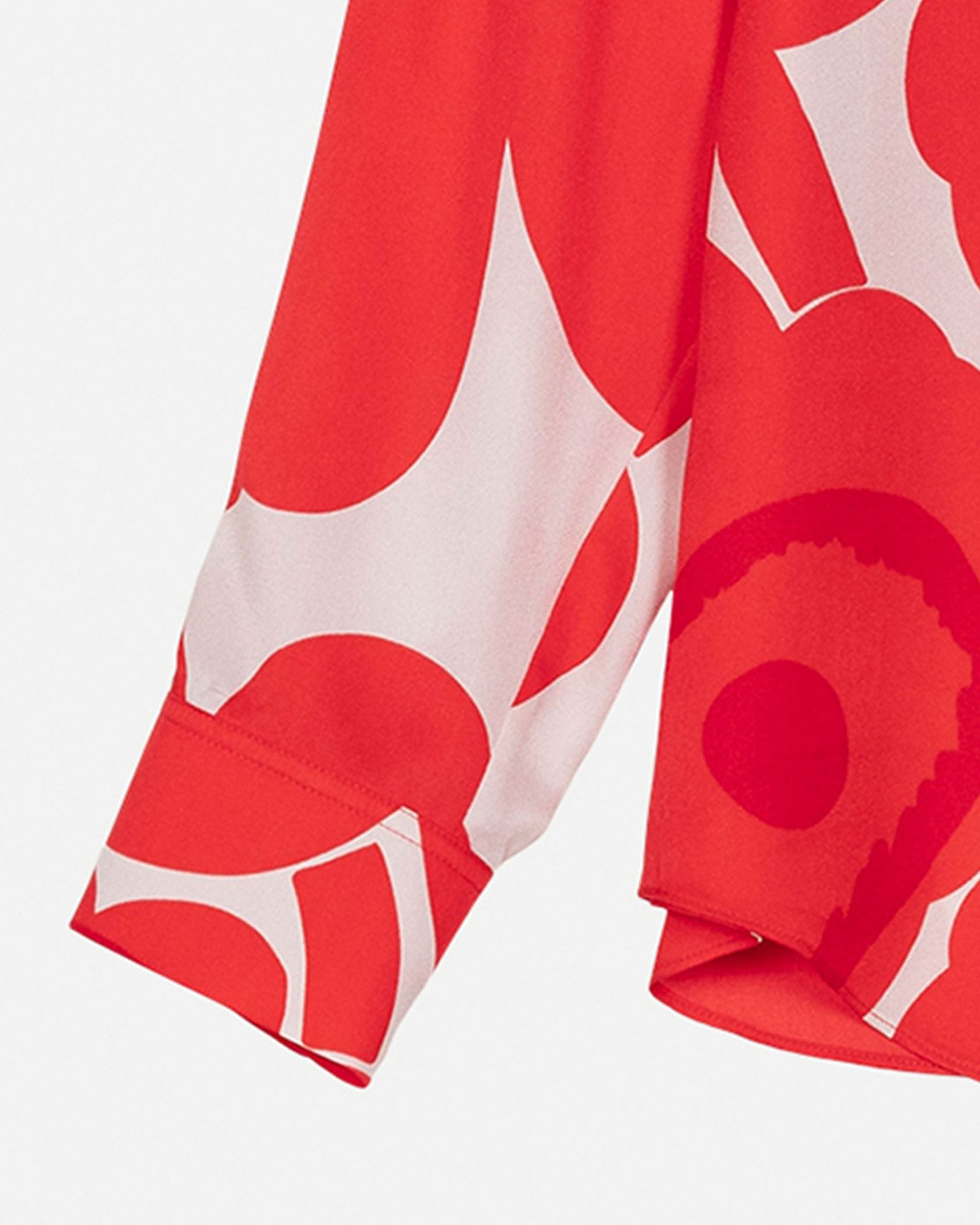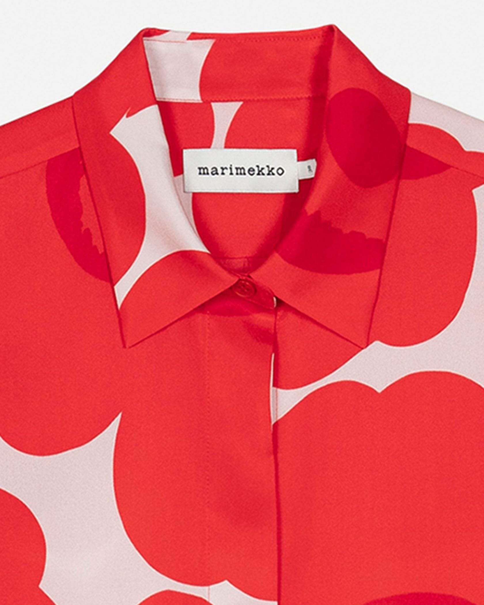 愛らしさと大人っぽさを兼ね備えたUnikko柄のシャツ。比翼仕立てになっており、スマートにスタイリングできるのがうれしい。着こなしのアクセントとしても活躍する一枚です。