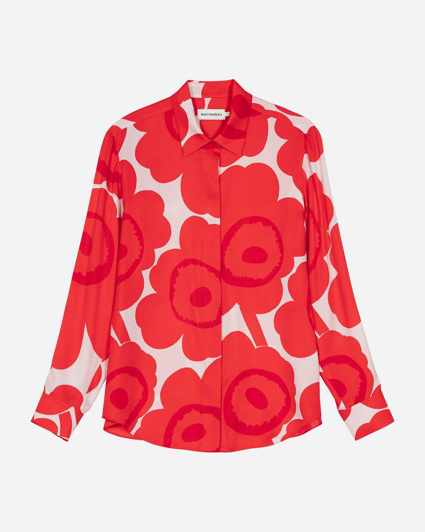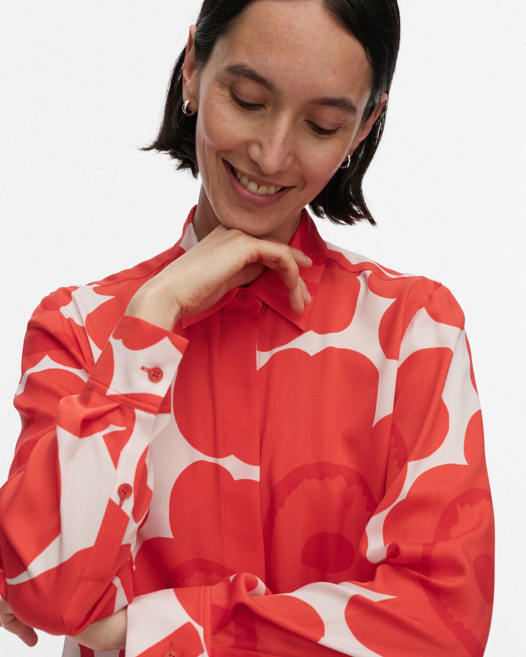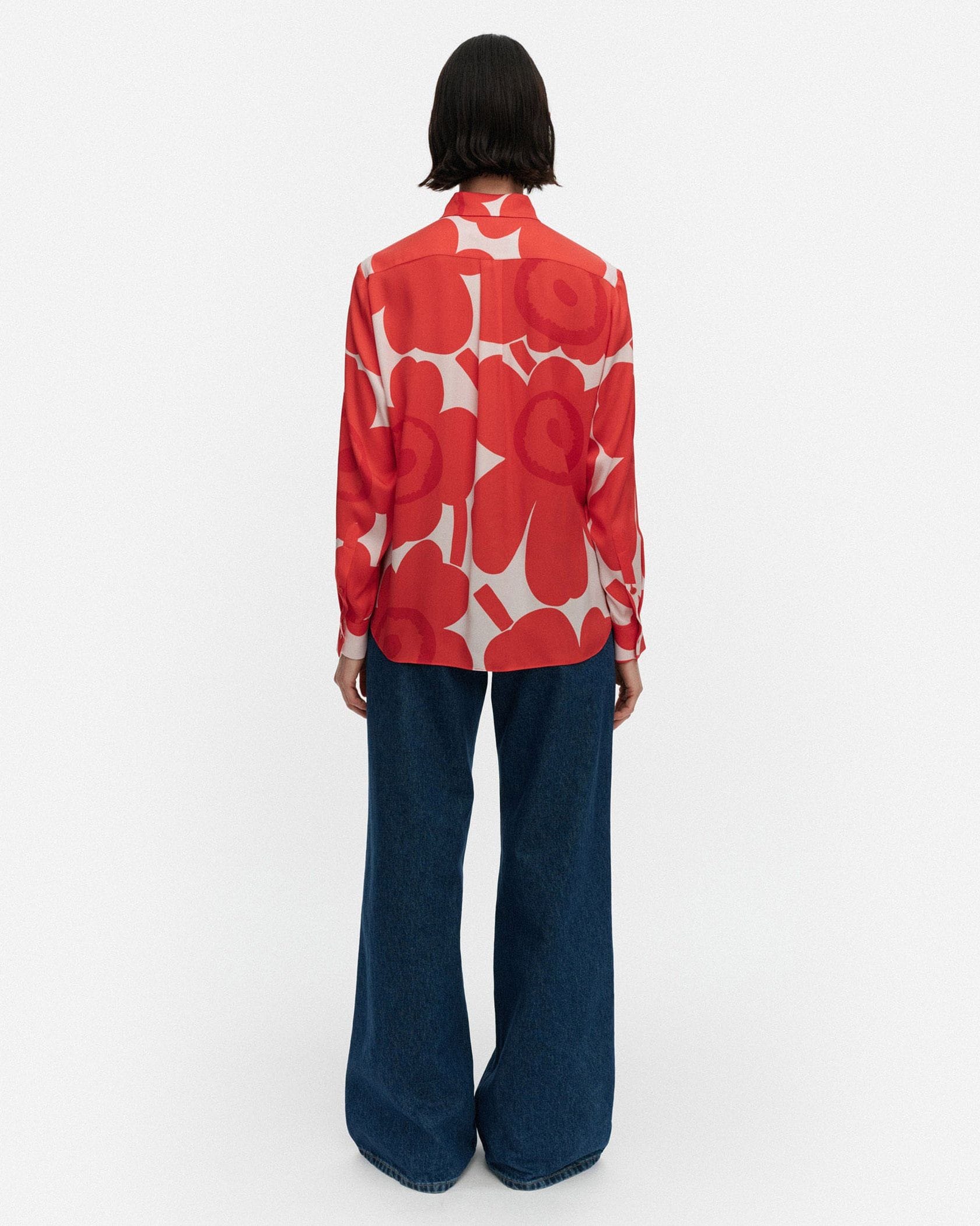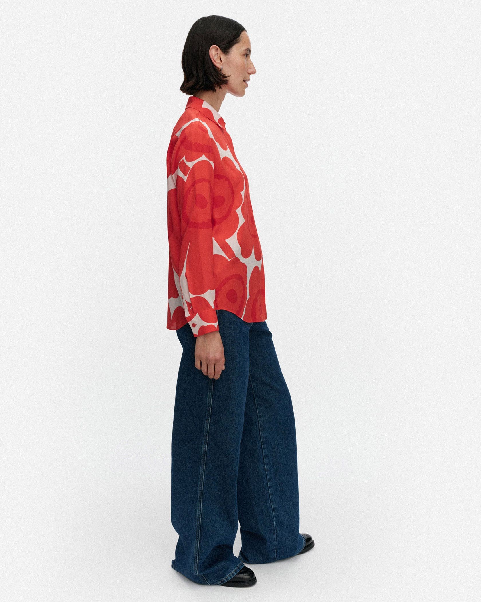 愛らしさと大人っぽさを兼ね備えたUnikko柄のシャツ。比翼仕立てになっており、スマートにスタイリングできるのがうれしい。着こなしのアクセントとしても活躍する一枚です。